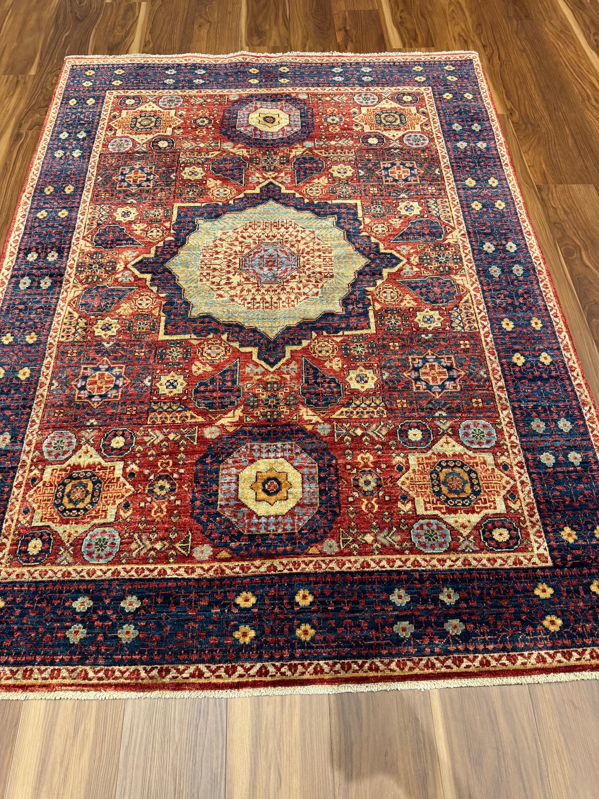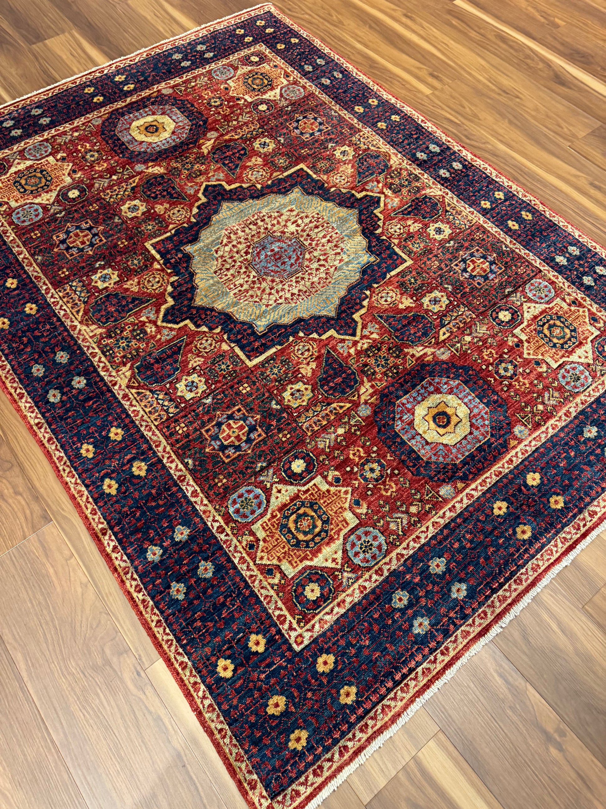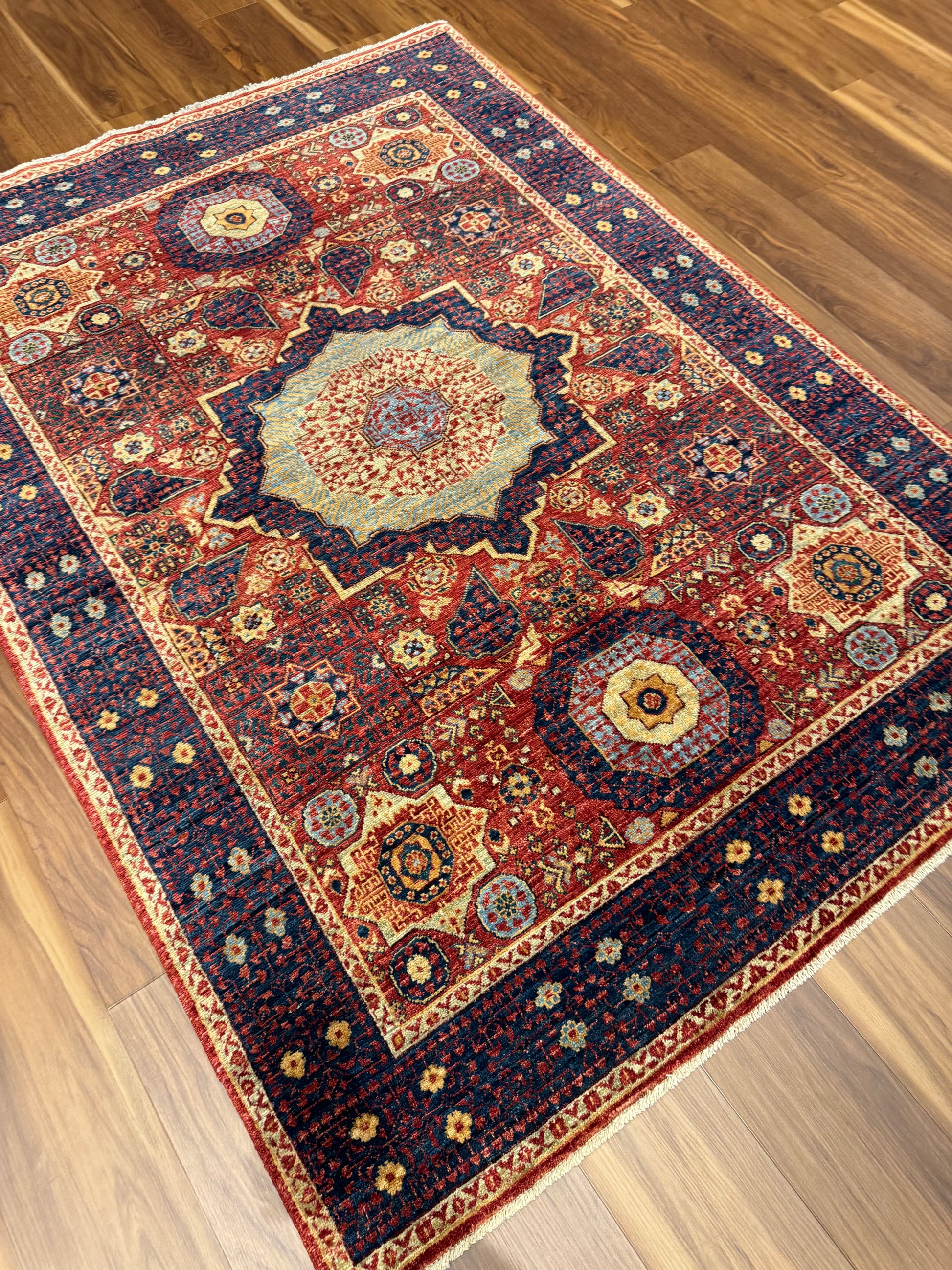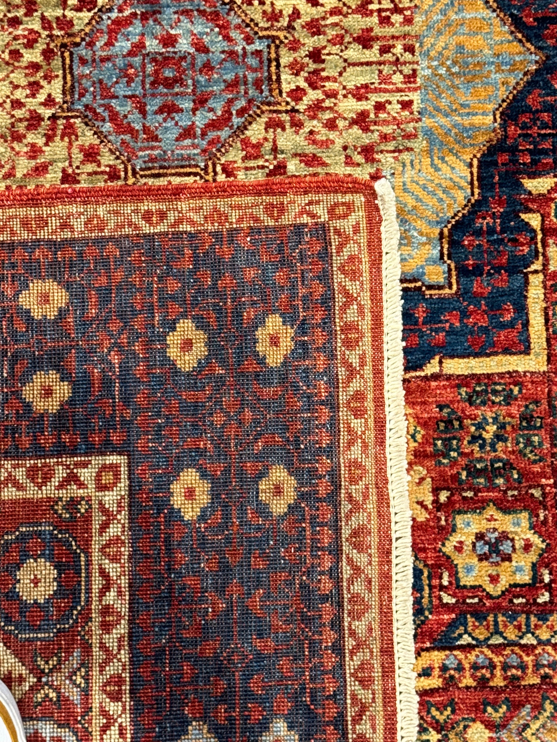 This exquisite Serapi rug boasts a traditional design with a grand central medallion accompanied by ornate corner pieces and an intricate border. Handwoven from the finest wool, the rug's rich reds and deep navy blues are accented with ivory highlights, creating a warm and inviting palette. This piece reflects the heritage craftsmanship of the Serapi region, making it an heirloom addition to any space.
