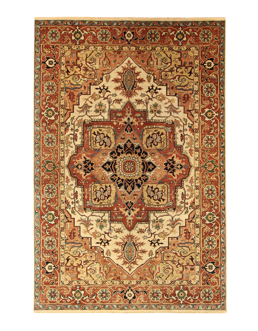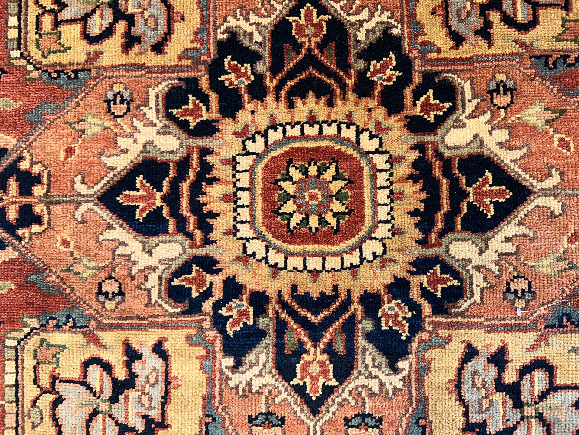 Stately and warm, this hand-knotted rug features a commanding central medallion framed by stepped spandrels and classic floral motifs in soft rust, beige, and navy. The angular design and structured composition are balanced by an ornate border that introduces touches of sage and blue for contrast. A timeless piece with rich texture and architectural beauty.