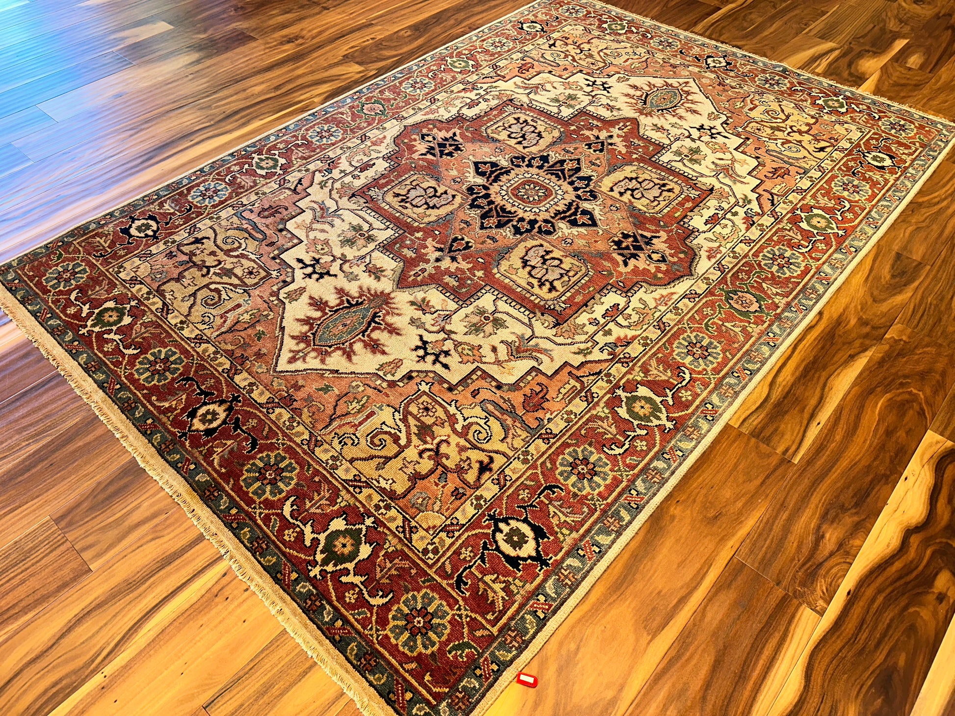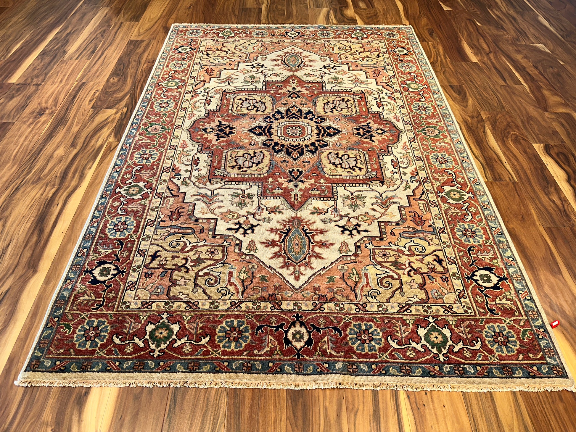 - Design: Central medallion with stepped corners and floral border