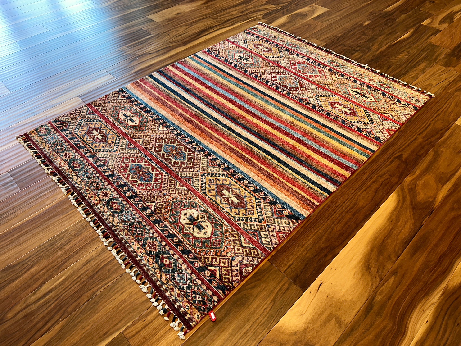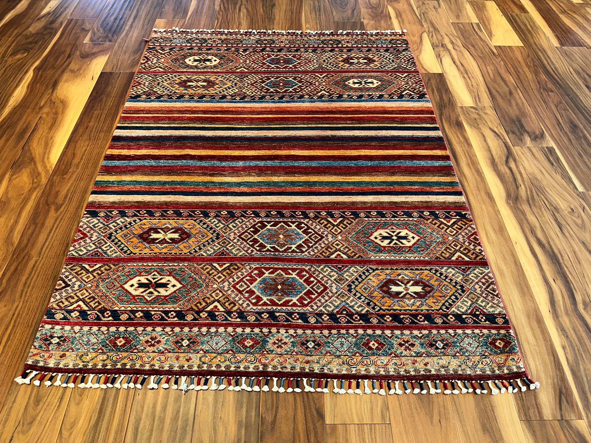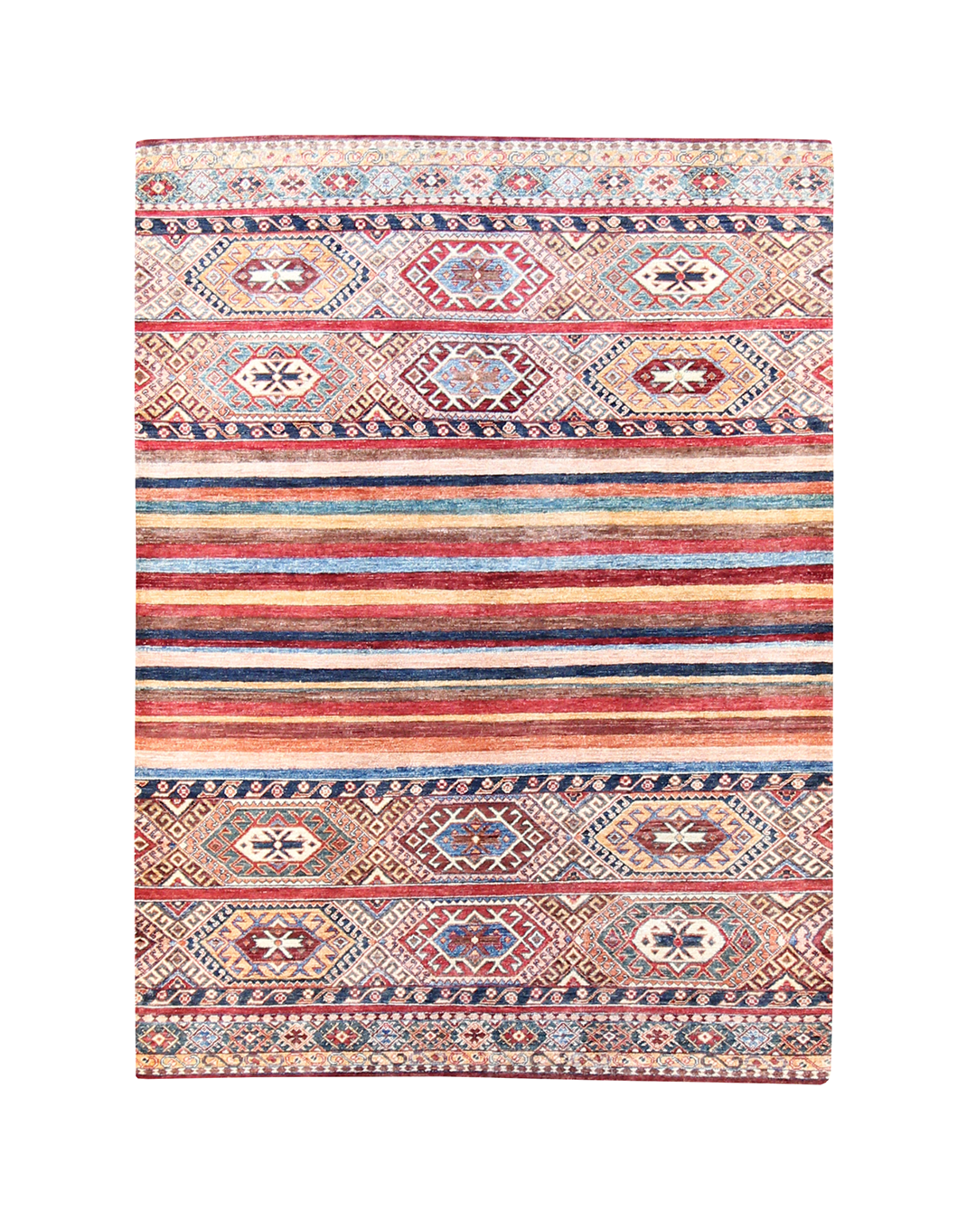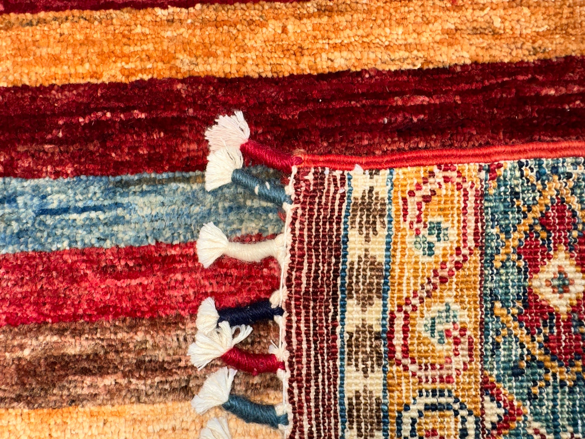 Vibrant and eclectic, this handmade rug blends colorful horizontal stripes with bands of traditional tribal motifs, creating a dynamic interplay between pattern and color. The lively palette of reds, blues, golds, and neutrals gives the piece a joyful energy, while the geometric details add a grounding sense of cultural tradition.