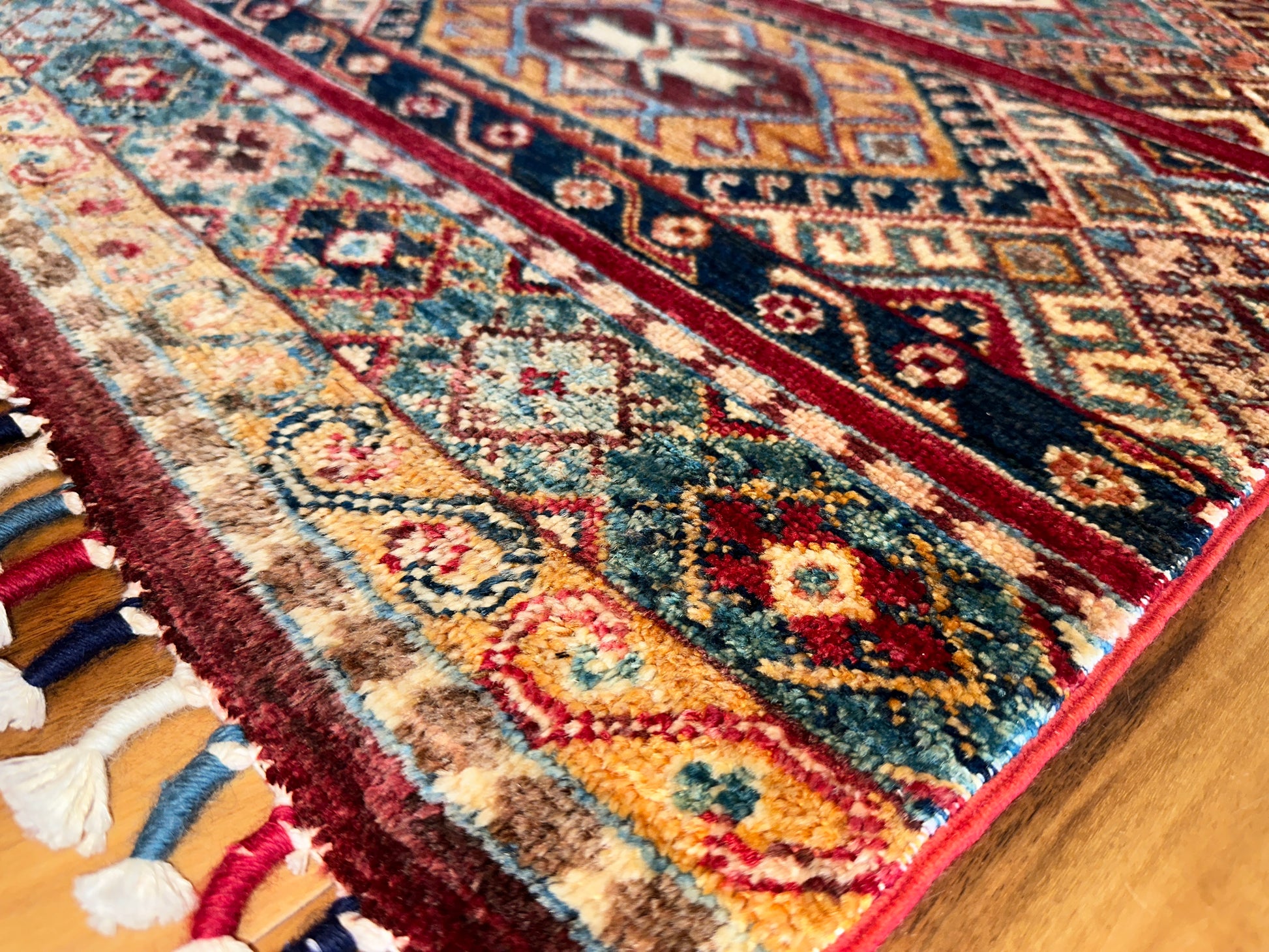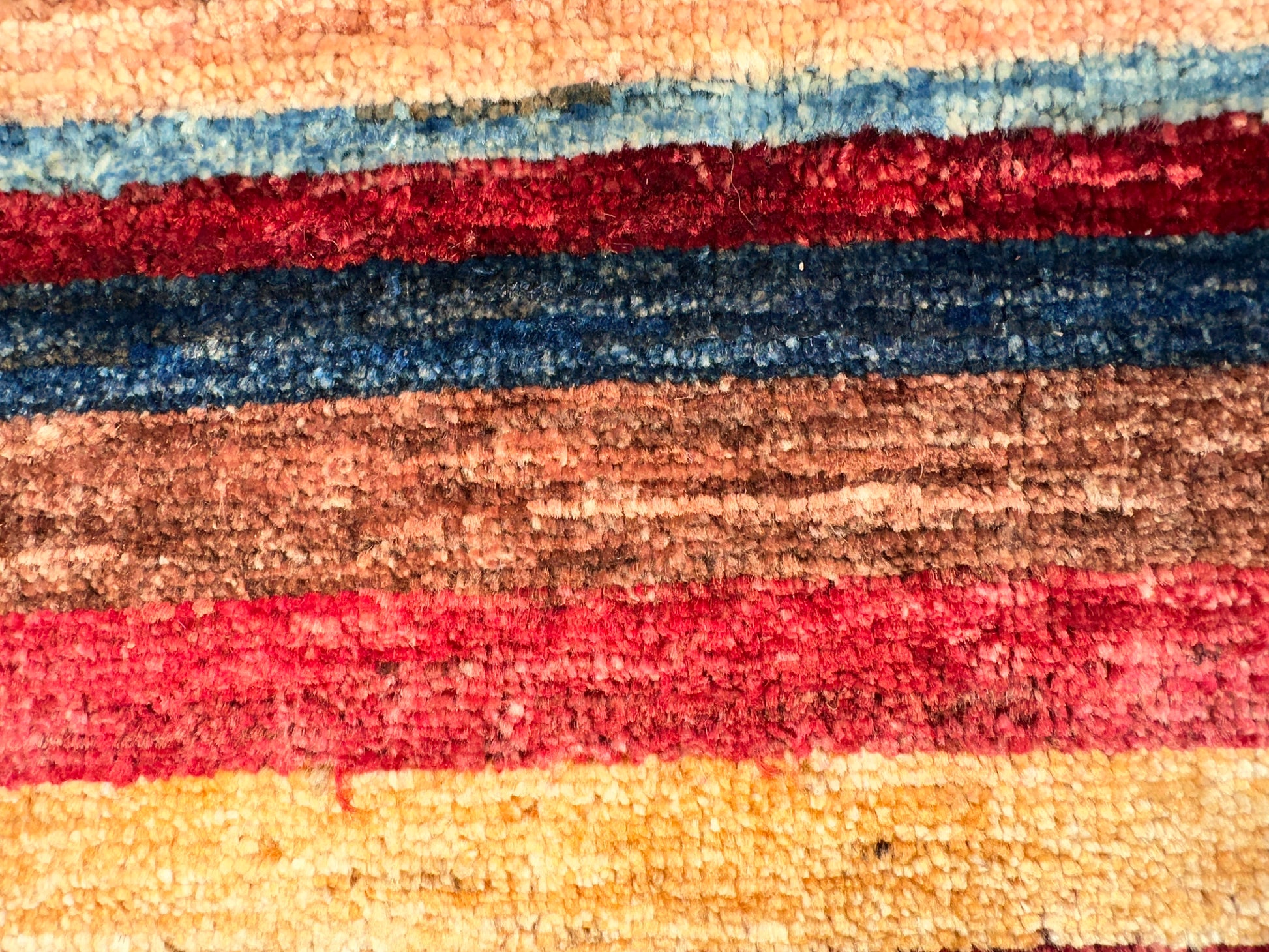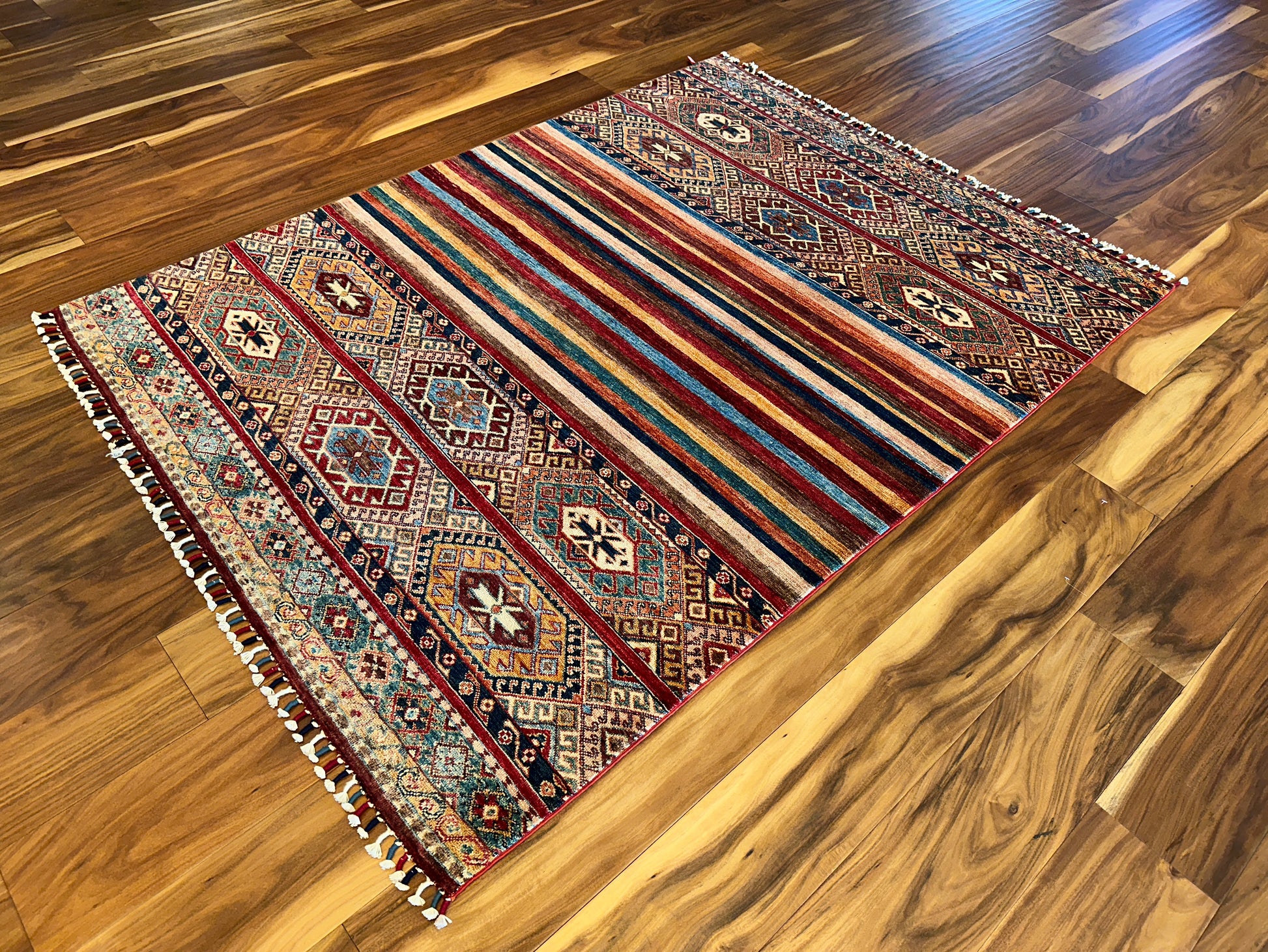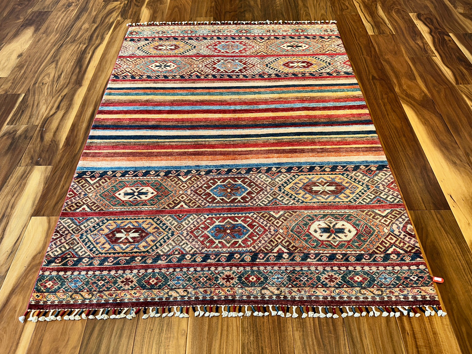 Vibrant and eclectic, this handmade rug blends colorful horizontal stripes with bands of traditional tribal motifs, creating a dynamic interplay between pattern and color. The lively palette of reds, blues, golds, and neutrals gives the piece a joyful energy, while the geometric details add a grounding sense of cultural tradition.