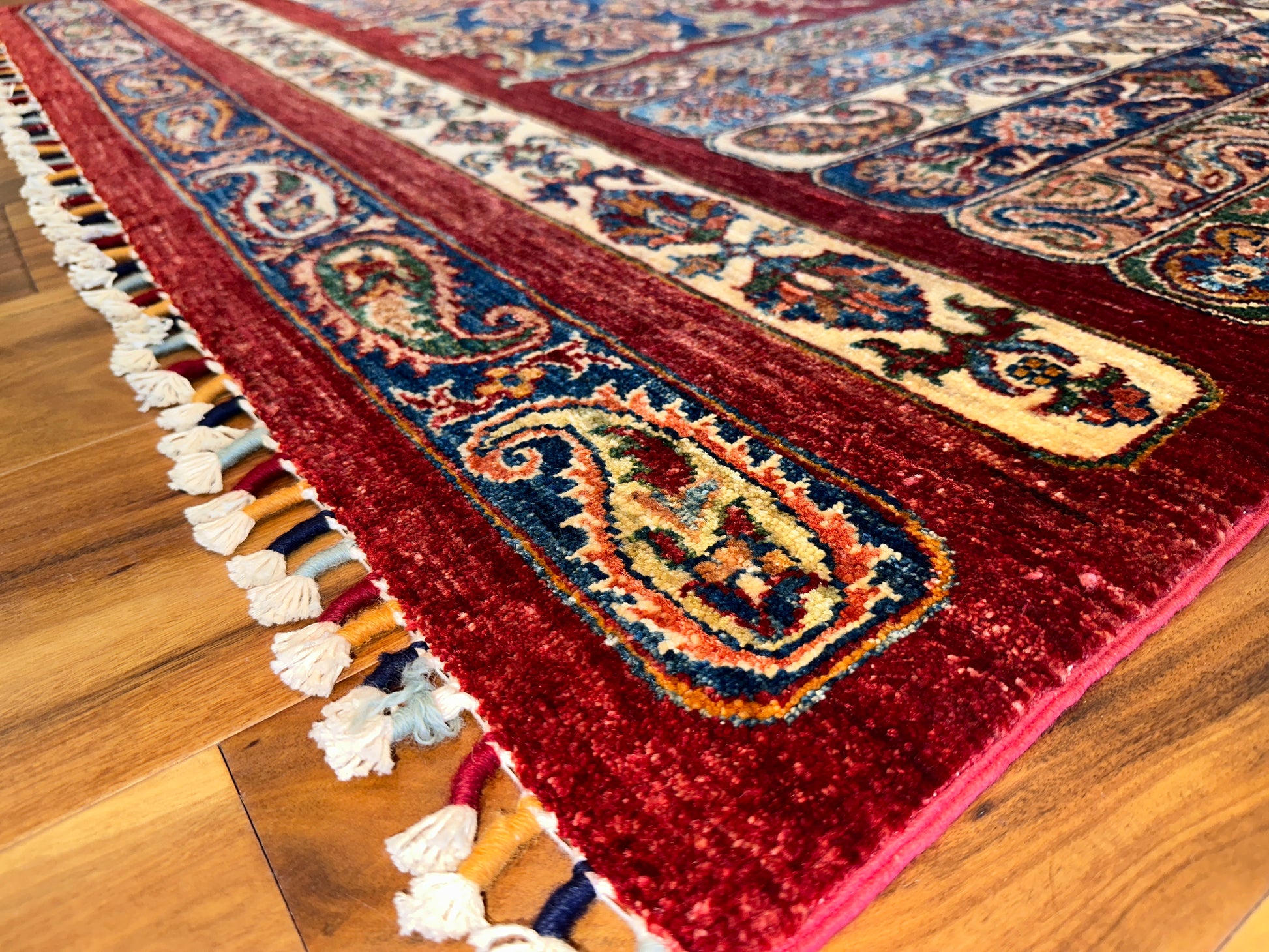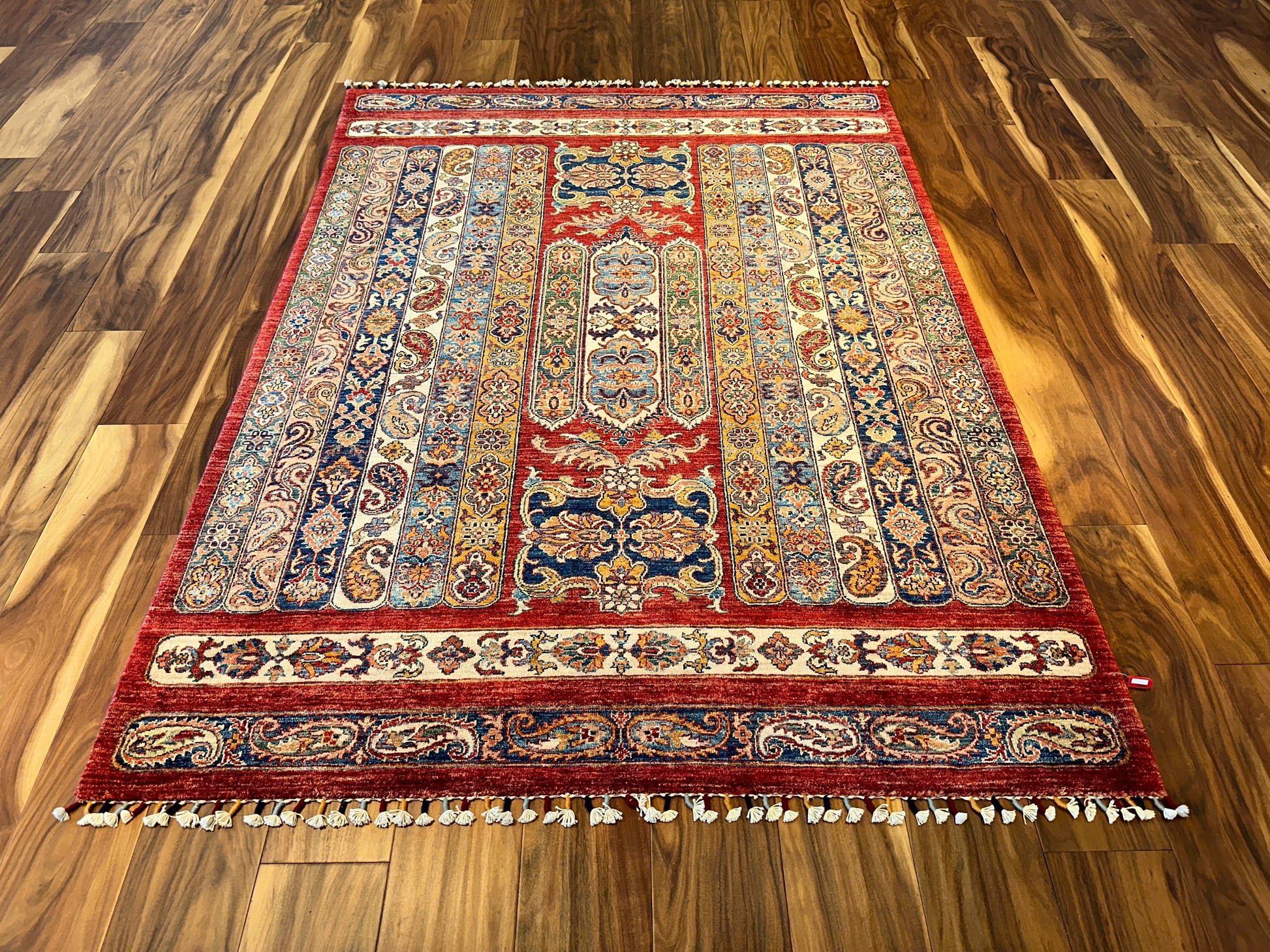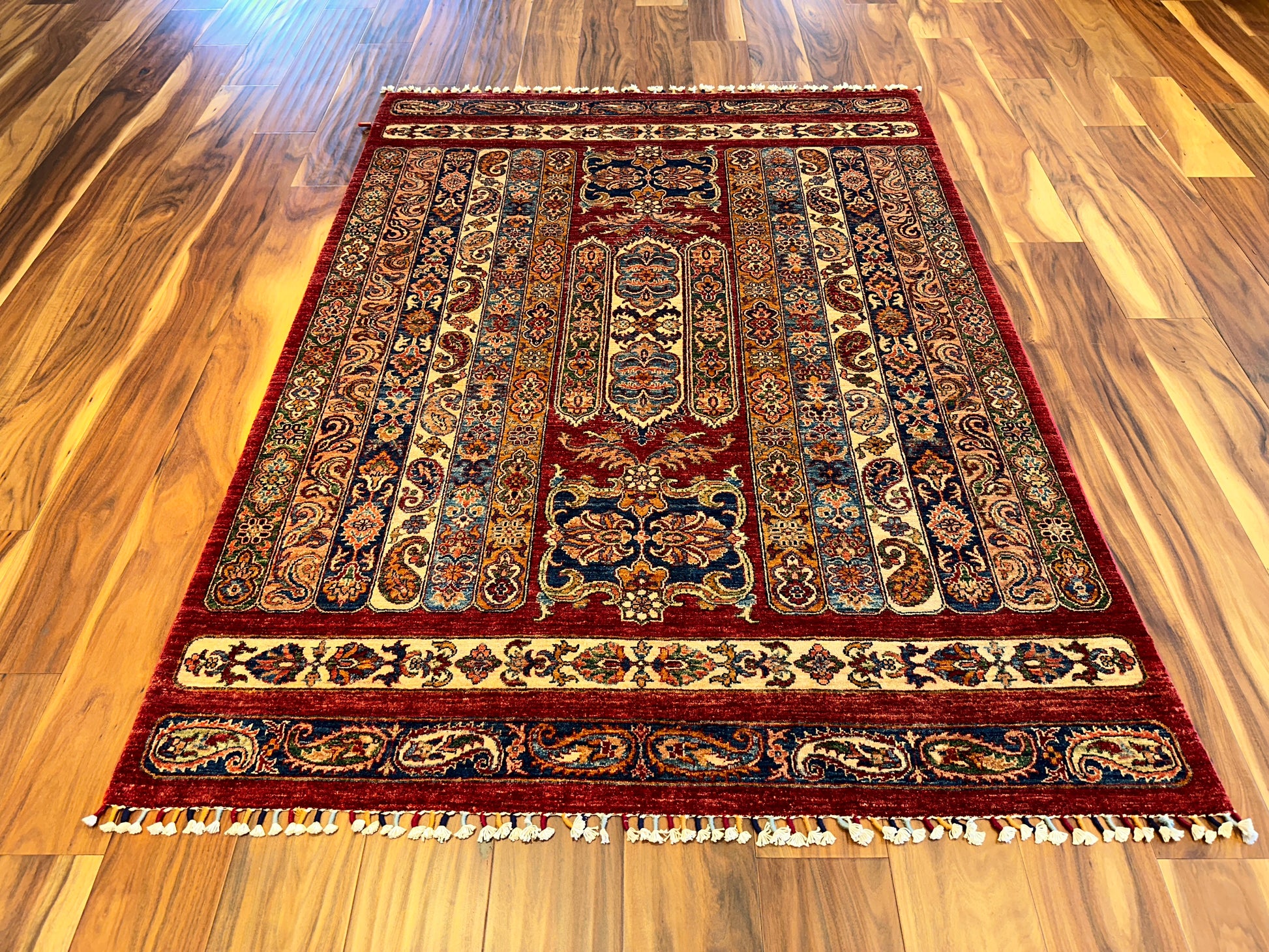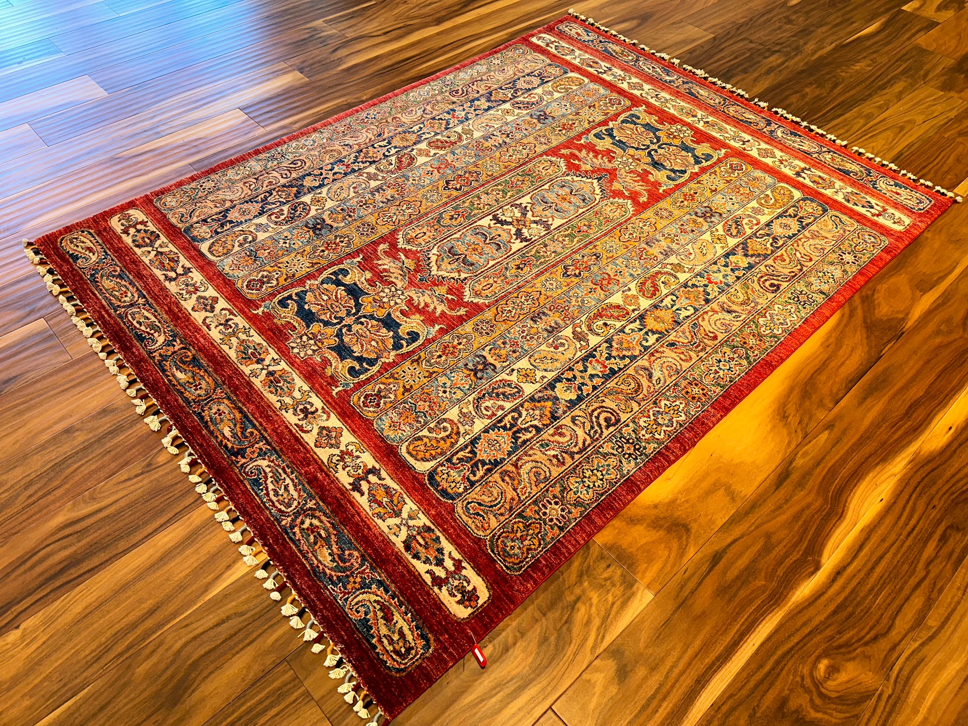 A striking and intricate rug that showcases vibrant color contrasts and precise symmetry, this hand-knotted piece is rich in visual depth. Delicate vertical panels filled with detailed floral motifs span the body, framed by ornate red borders with fine vine and scrollwork accents. The central medallion anchors the design with balance, making this rug ideal as a statement piece in any refined setting.