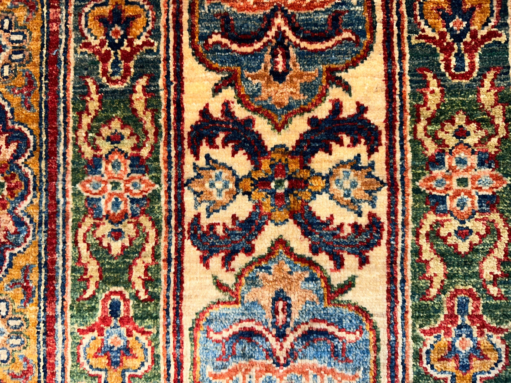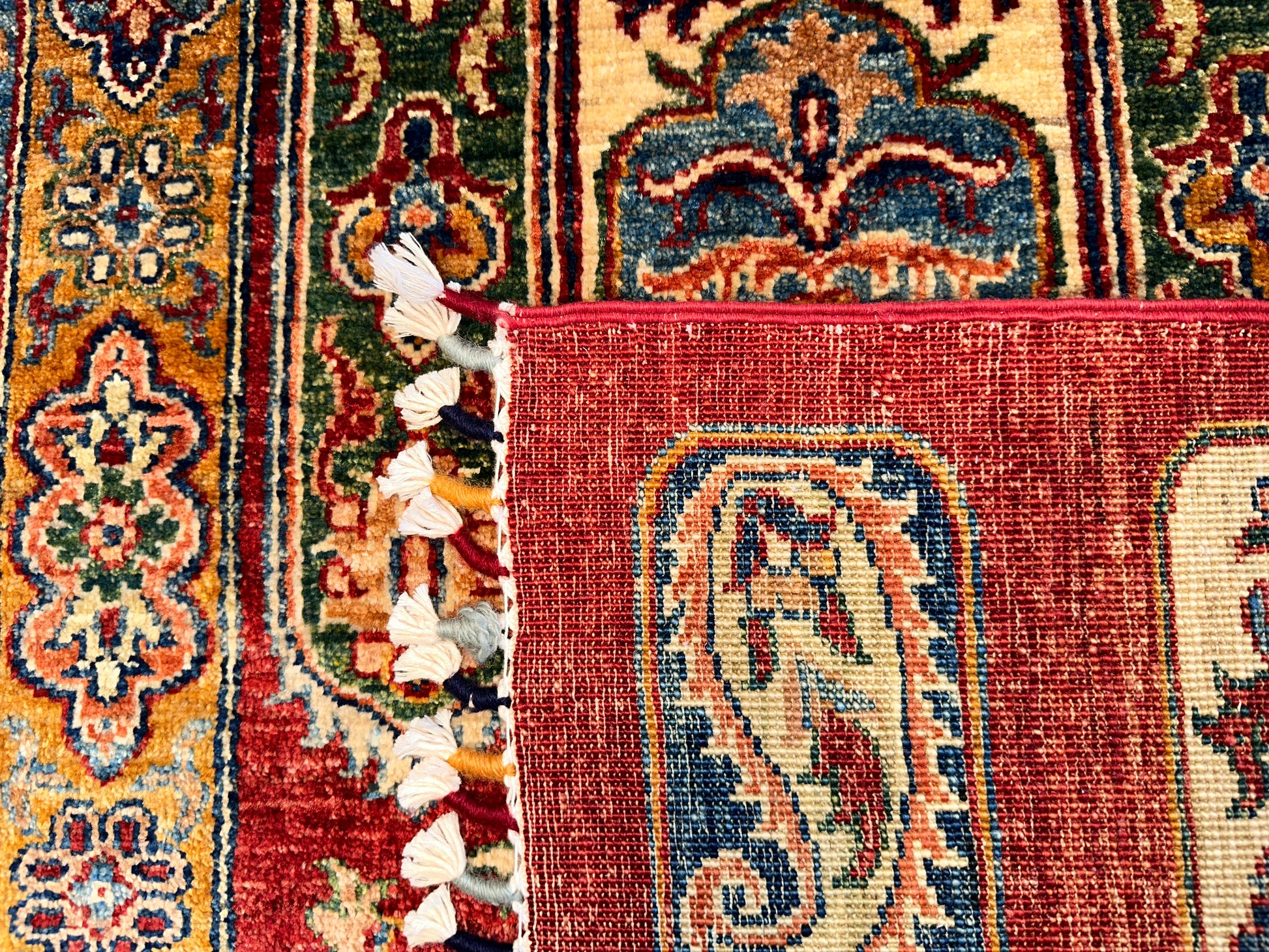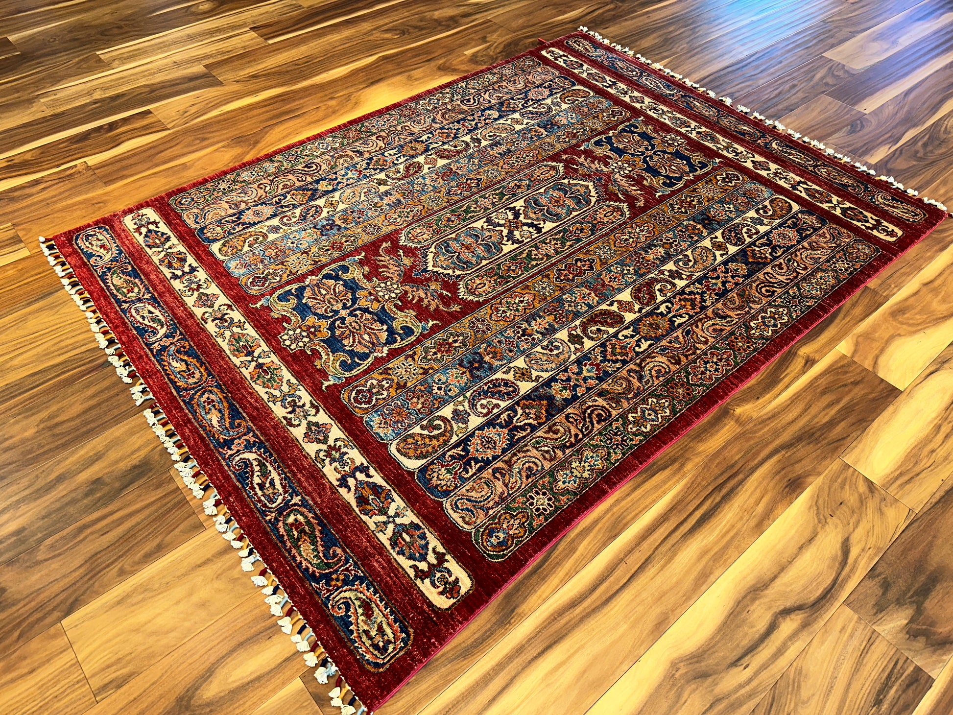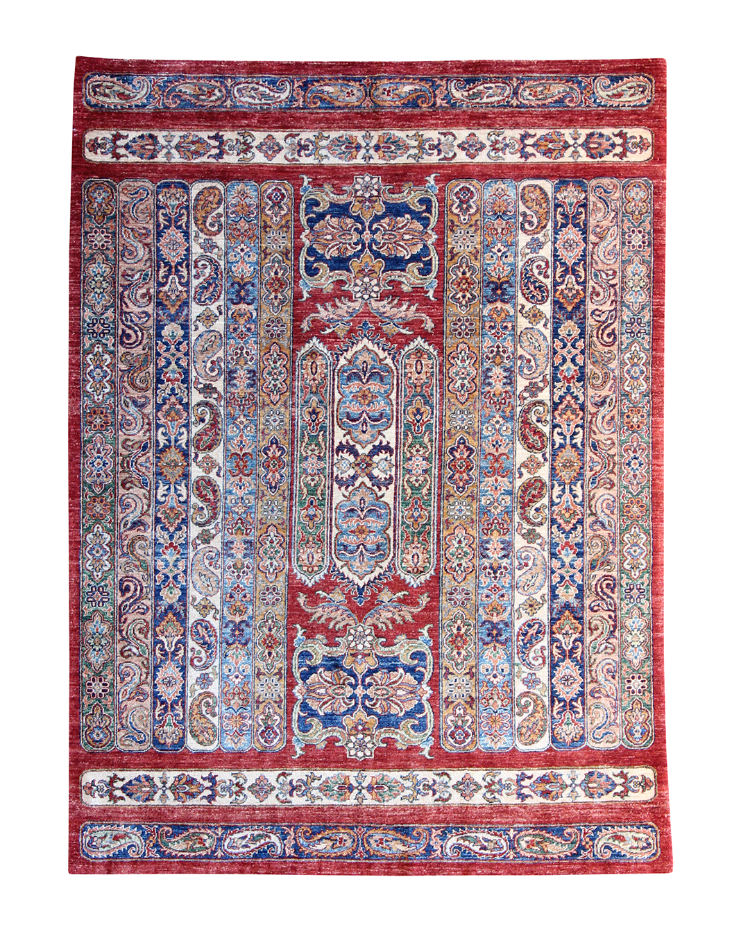 A striking and intricate rug that showcases vibrant color contrasts and precise symmetry, this hand-knotted piece is rich in visual depth. Delicate vertical panels filled with detailed floral motifs span the body, framed by ornate red borders with fine vine and scrollwork accents. The central medallion anchors the design with balance, making this rug ideal as a statement piece in any refined setting.