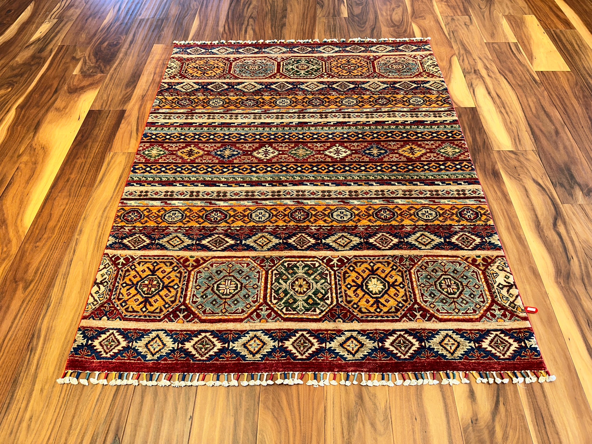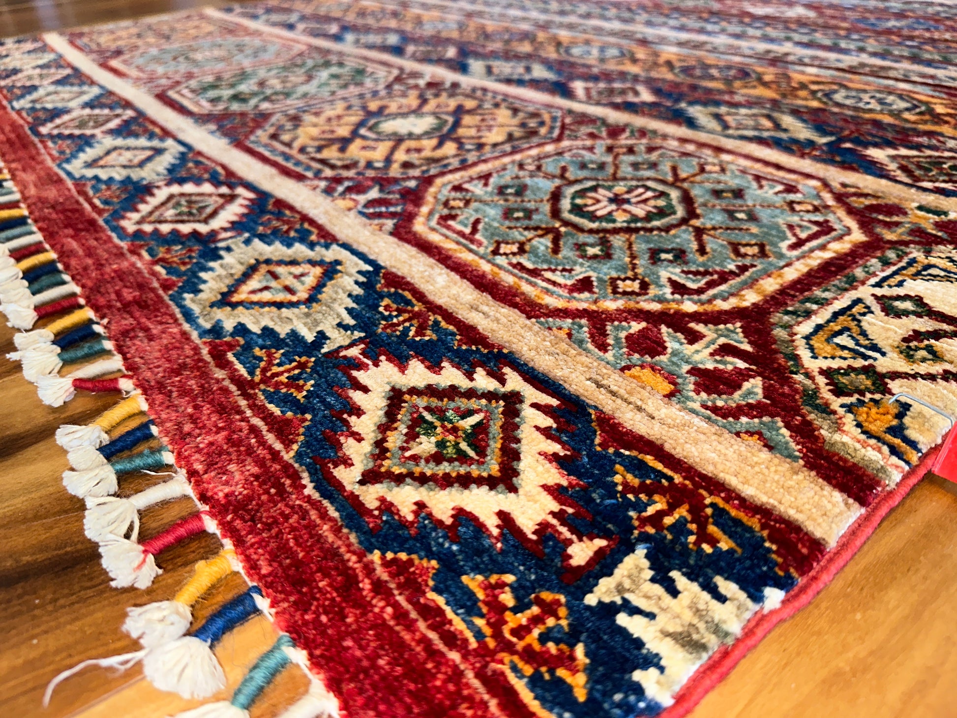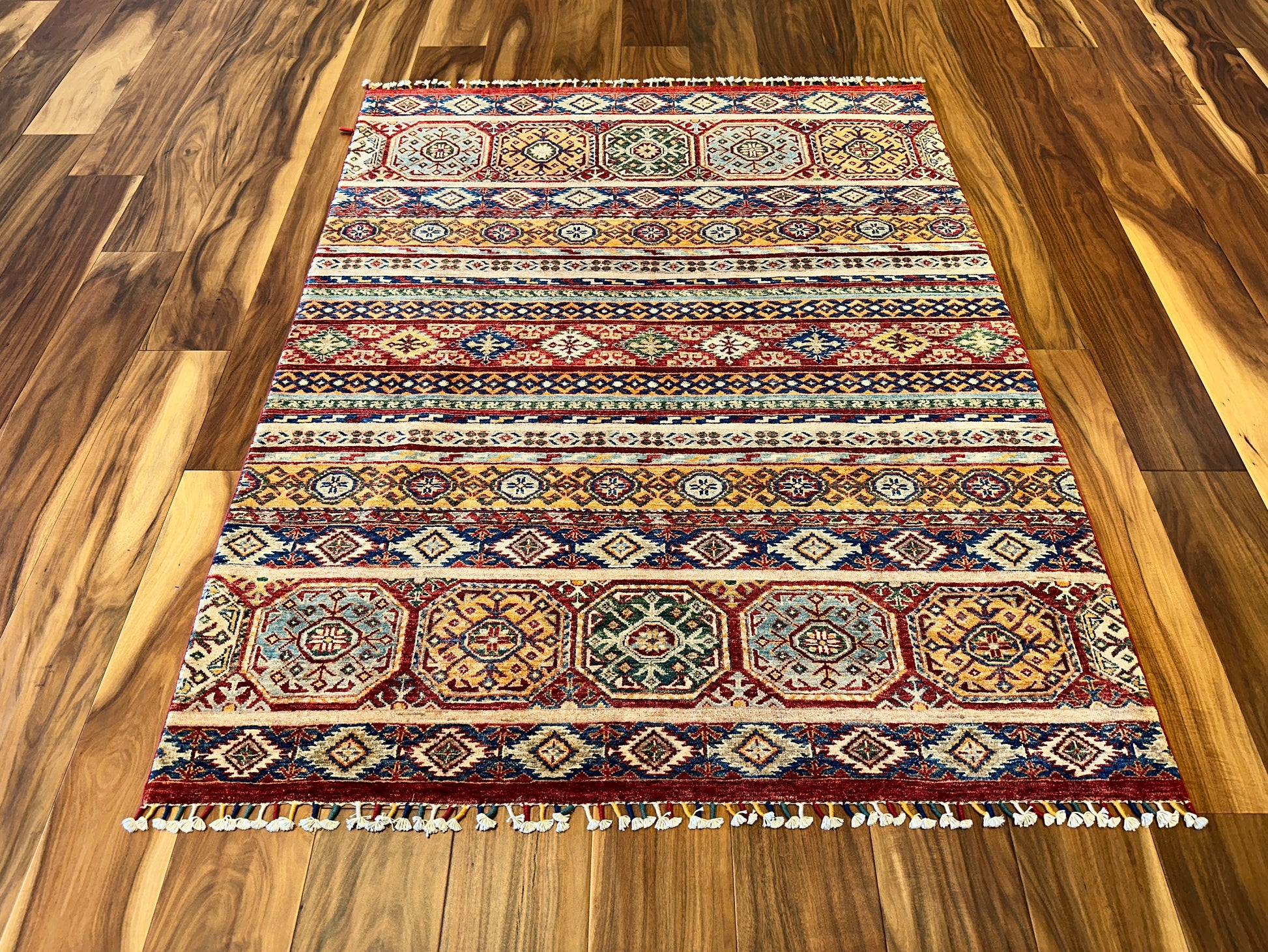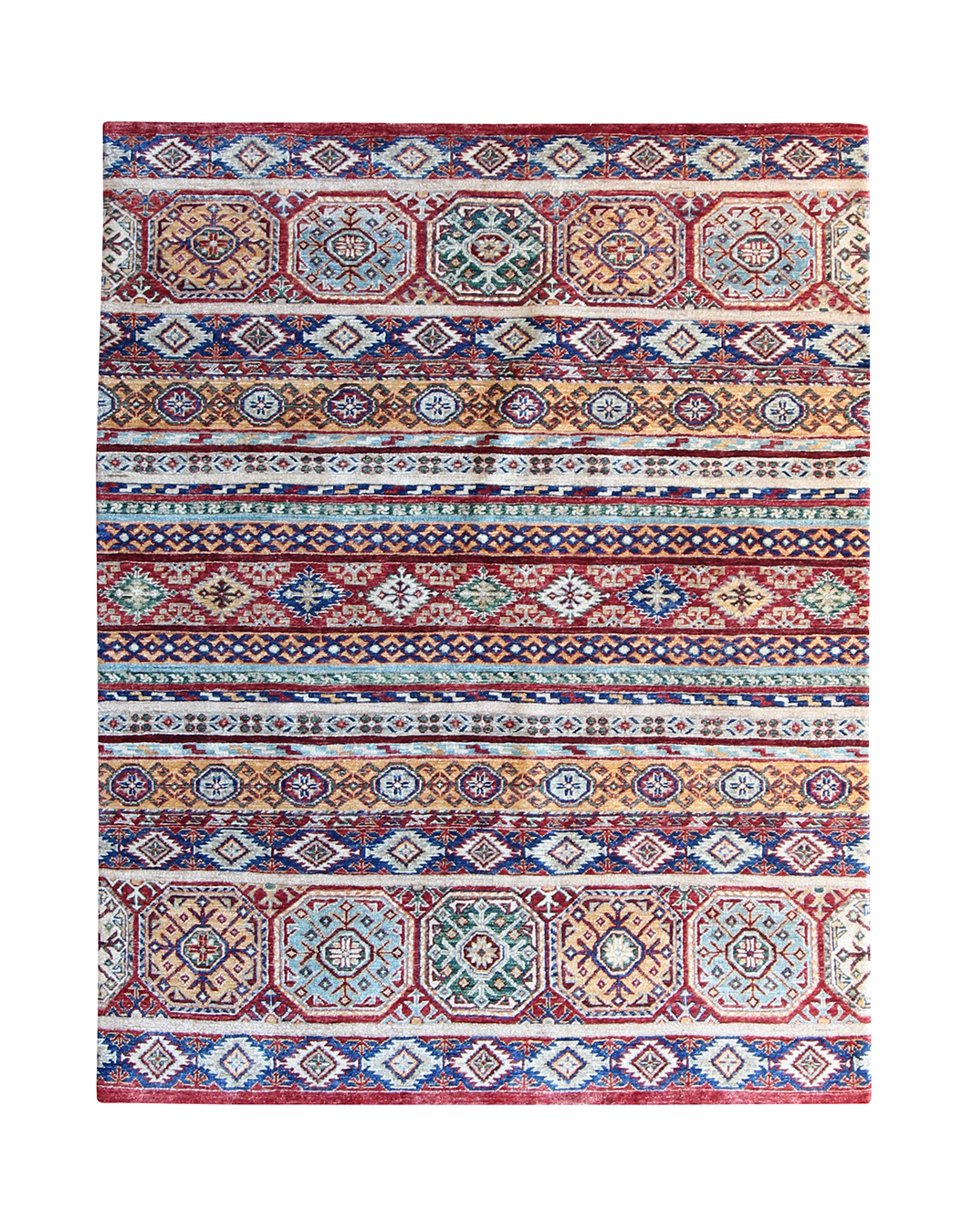 Vibrant and richly ornamented, this tribal-inspired rug features a series of horizontal bands filled with stylized octagons, geometric rosettes, and intricate latticework motifs. The palette moves fluidly across bold reds, golden ochres, soft blues, and forest greens, creating a lively, textural rhythm. A spirited balance of structure and movement gives this piece a strong decorative presence.