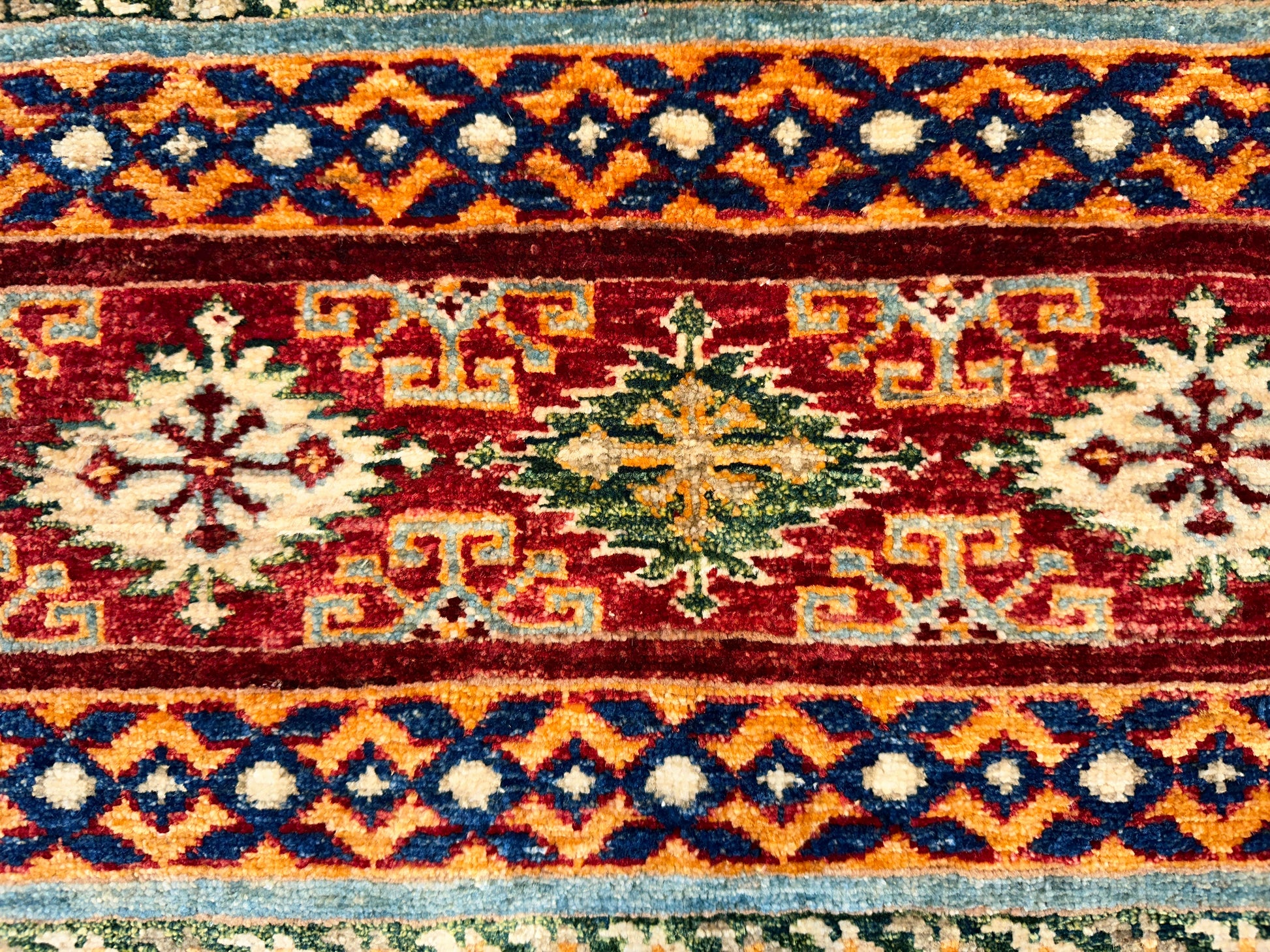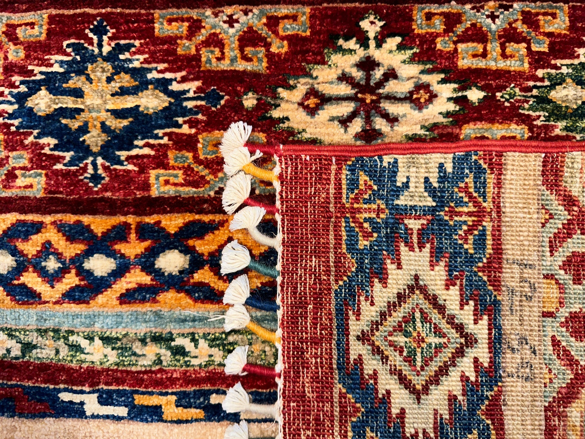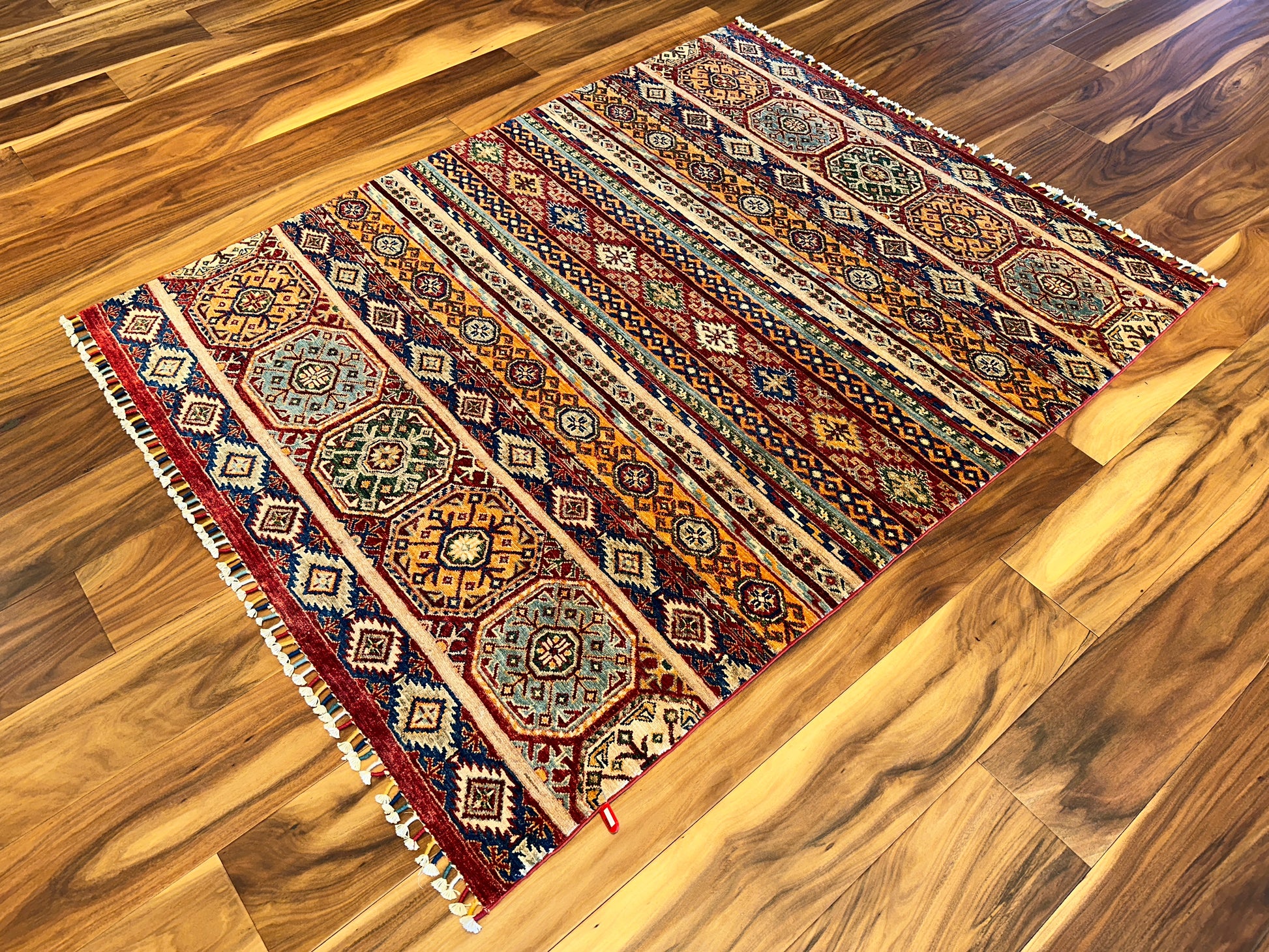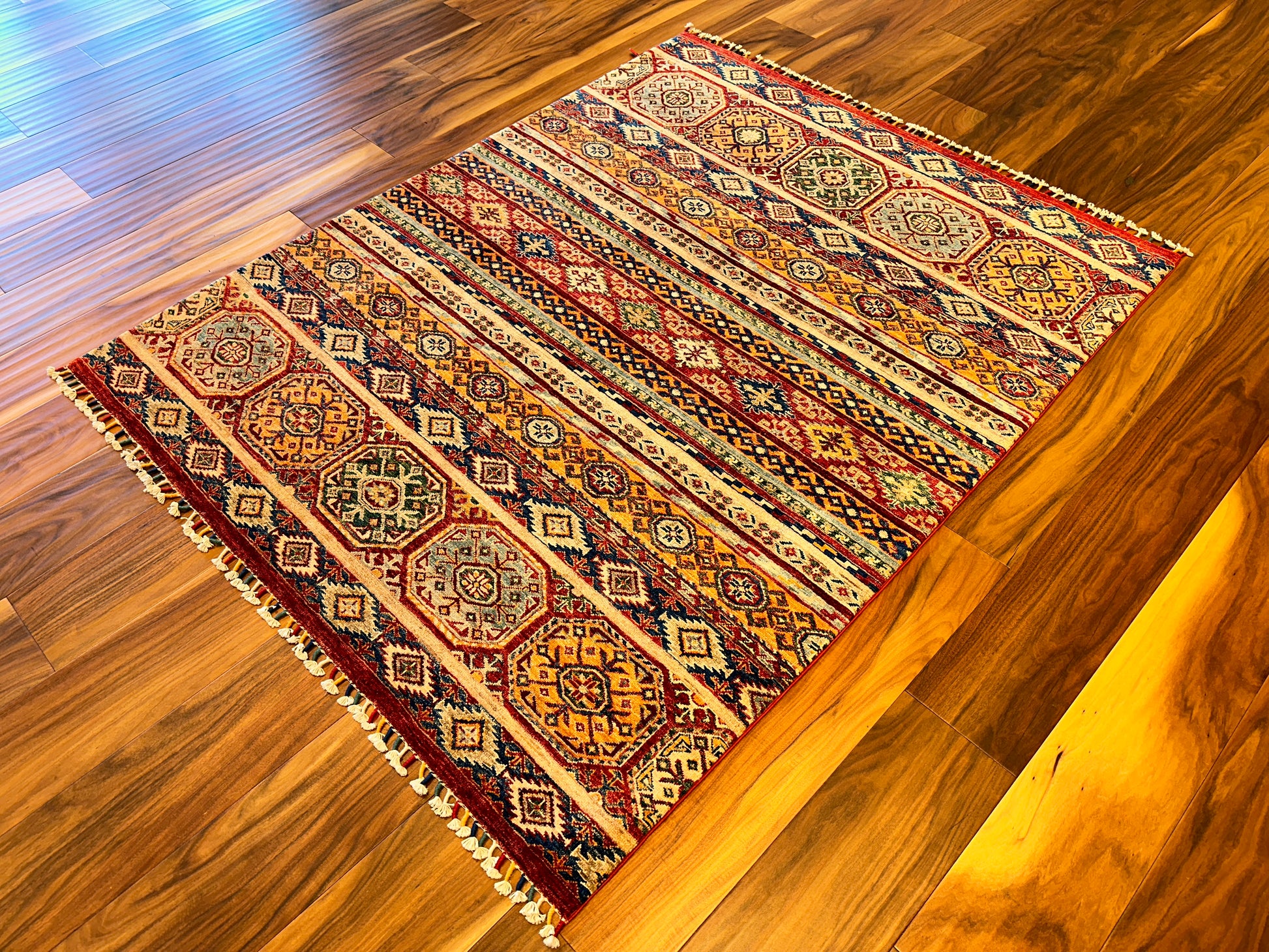 Vibrant and richly ornamented, this tribal-inspired rug features a series of horizontal bands filled with stylized octagons, geometric rosettes, and intricate latticework motifs. The palette moves fluidly across bold reds, golden ochres, soft blues, and forest greens, creating a lively, textural rhythm. A spirited balance of structure and movement gives this piece a strong decorative presence.