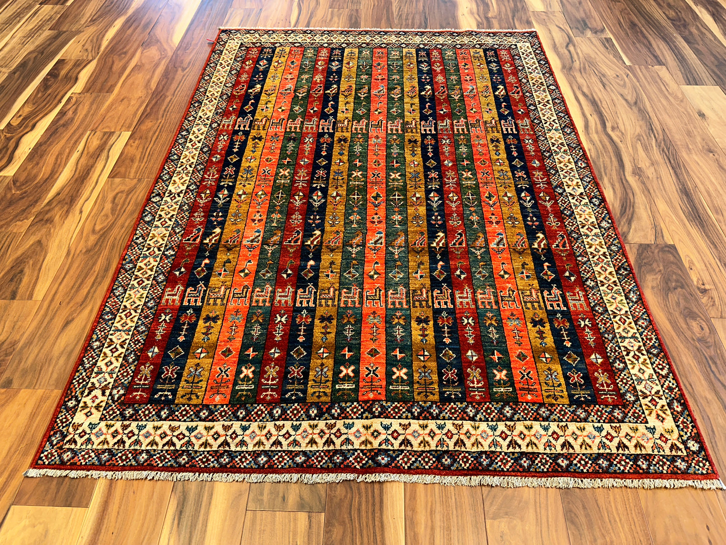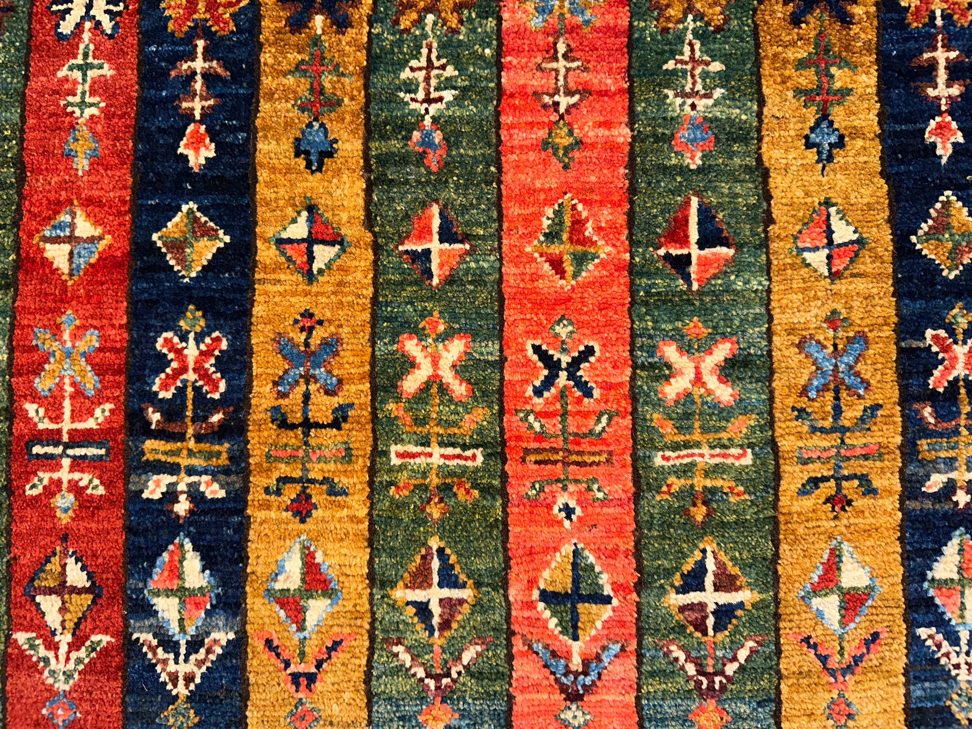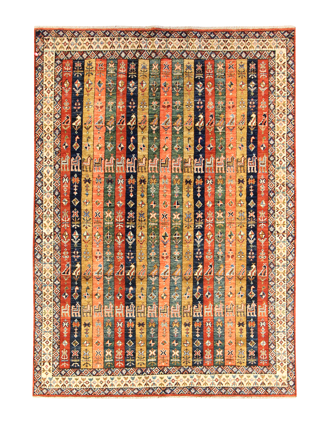 This vibrant handmade rug features a striking columned layout of narrow vertical bands filled with tribal motifs, stylized animals, and symbolic patterns. Rendered in rich tones of red, gold, green, and navy, each stripe adds its own rhythm to the composition, while the diamond-patterned border provides a crisp geometric frame. The design draws from Caucasian influences and carries a bold folkloric charm.