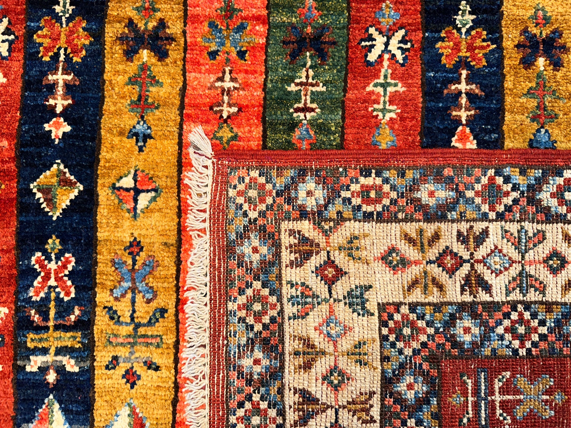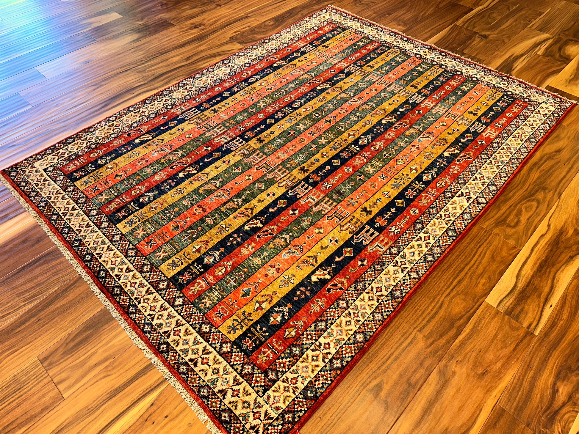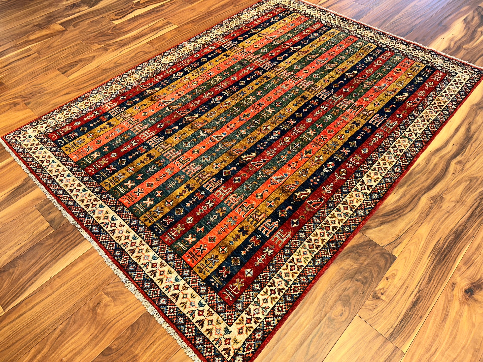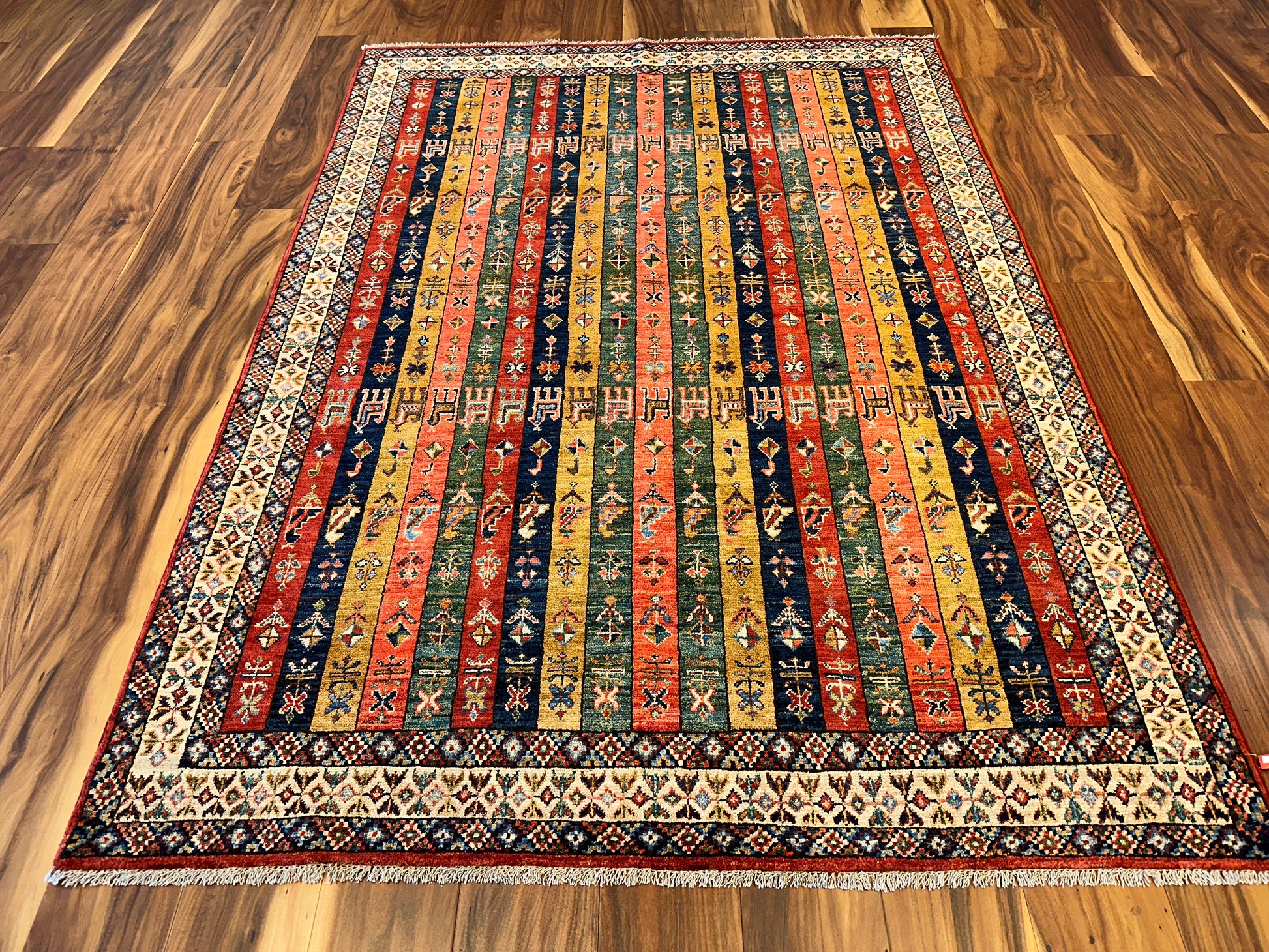 This vibrant handmade rug features a striking columned layout of narrow vertical bands filled with tribal motifs, stylized animals, and symbolic patterns. Rendered in rich tones of red, gold, green, and navy, each stripe adds its own rhythm to the composition, while the diamond-patterned border provides a crisp geometric frame. The design draws from Caucasian influences and carries a bold folkloric charm.