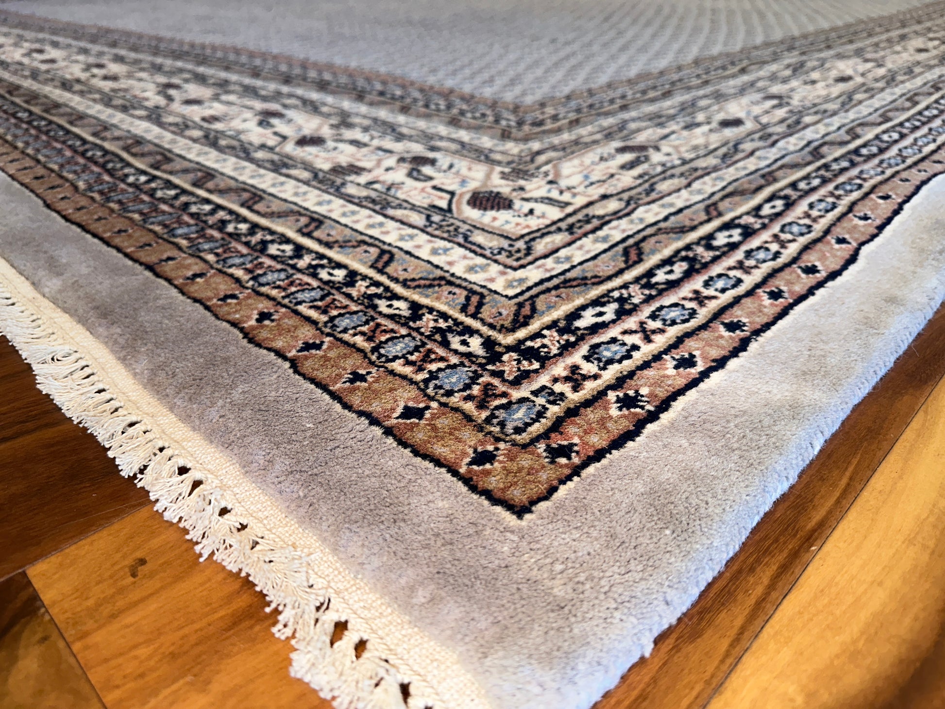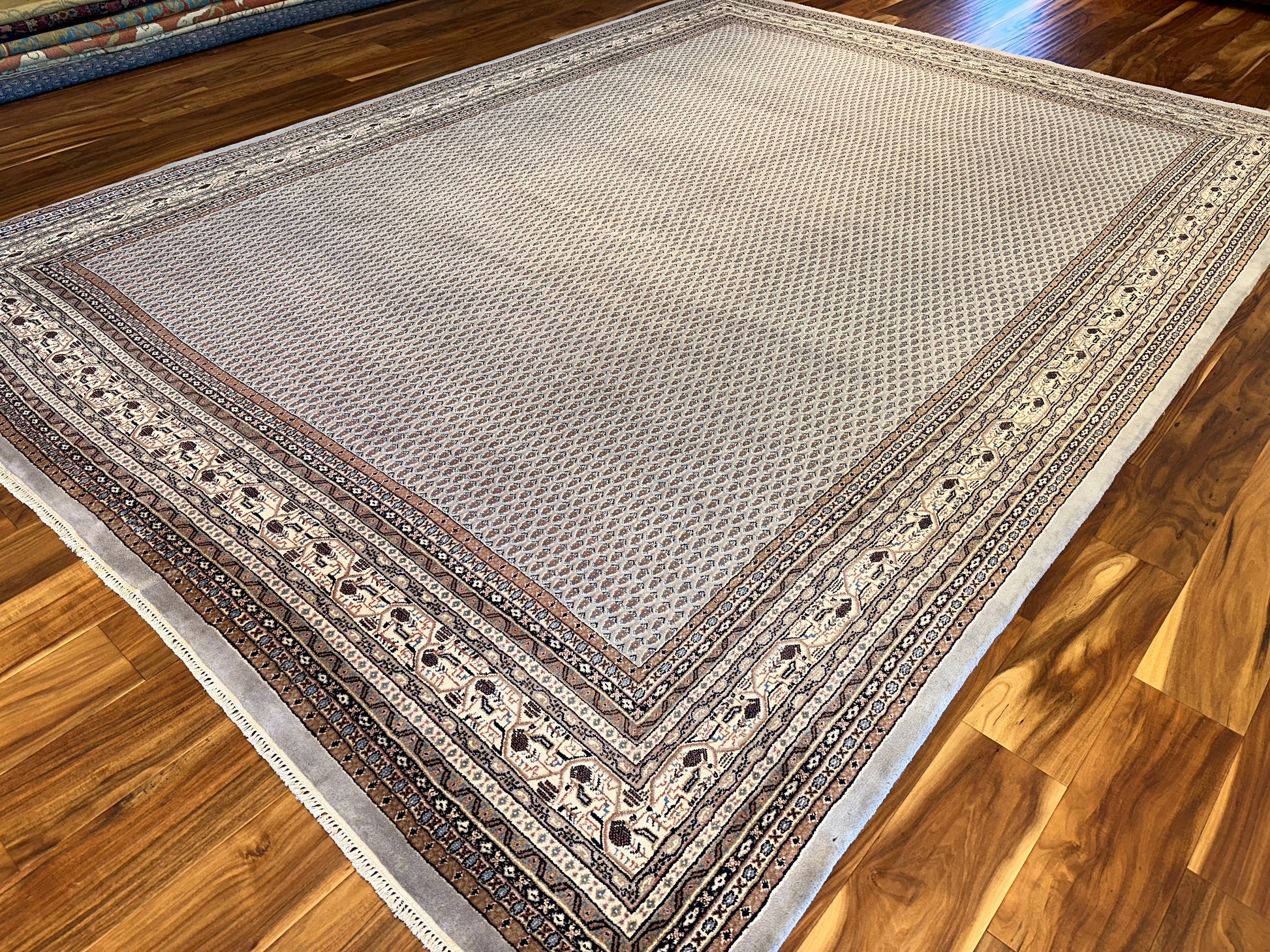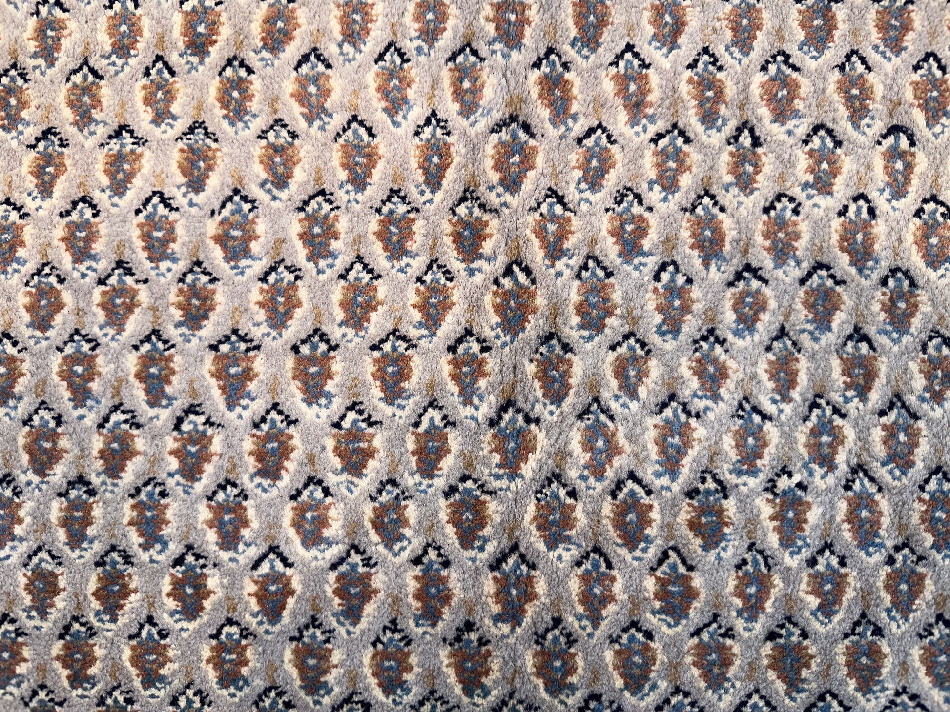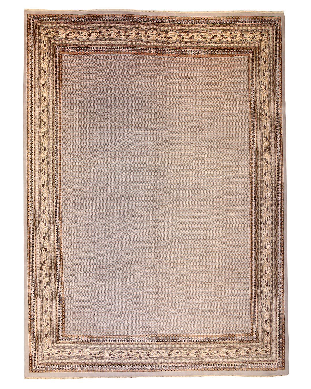 With its finely detailed lattice field and softly luminous palette, this hand-knotted rug offers a sense of understated grandeur. The delicate boteh motifs—an ancient symbol of life and eternity—repeat in rhythmic precision across the field, framed by classic Persian borders adorned with scrolling vines and floral elements. Its timeless balance of intricacy and restraint makes it an elegant foundation for formal spaces.