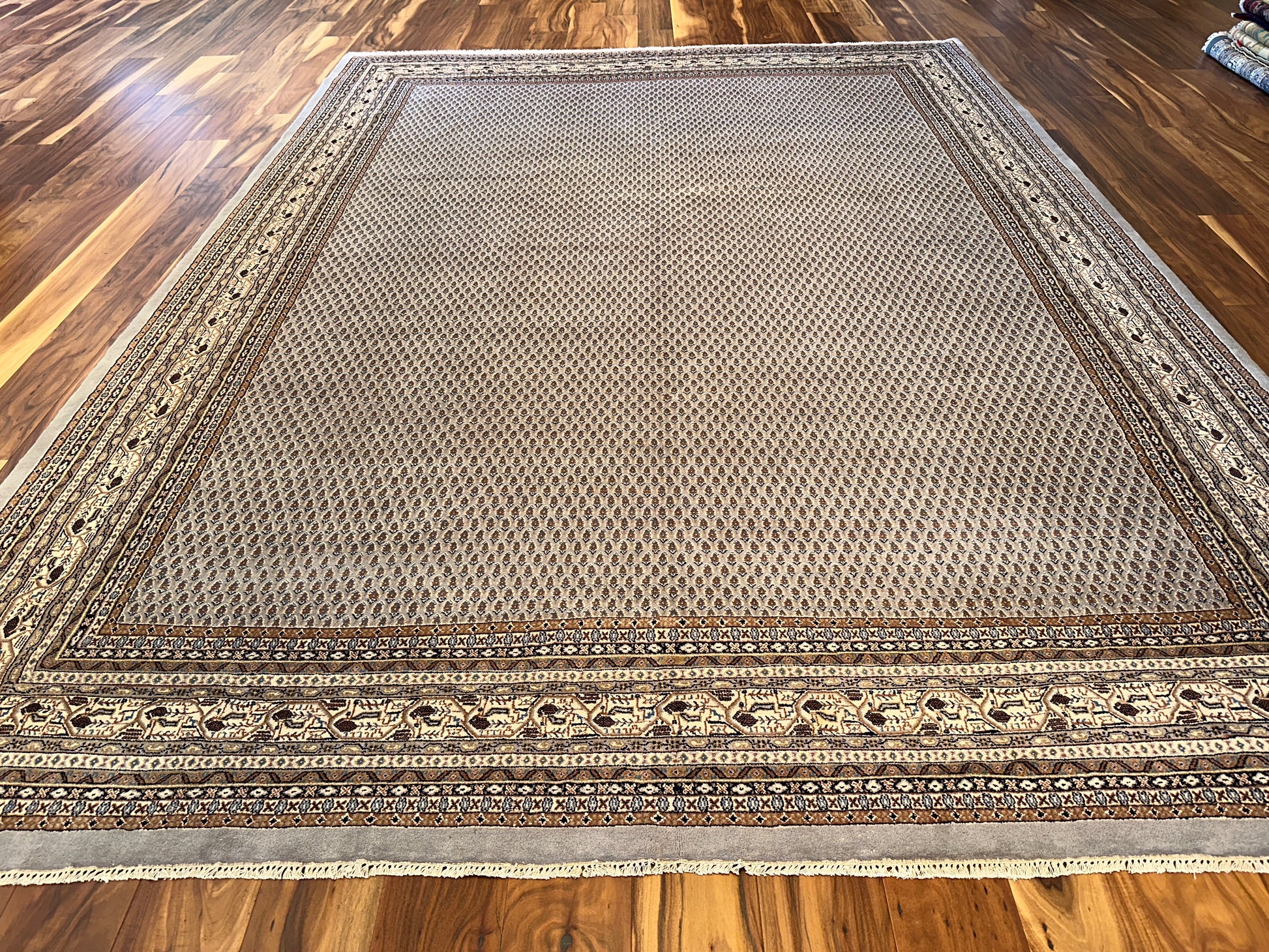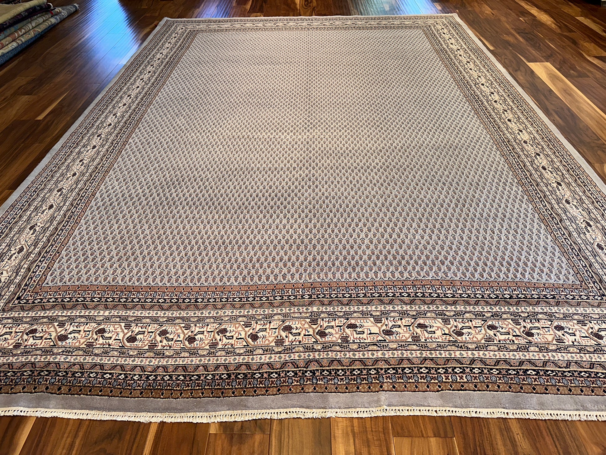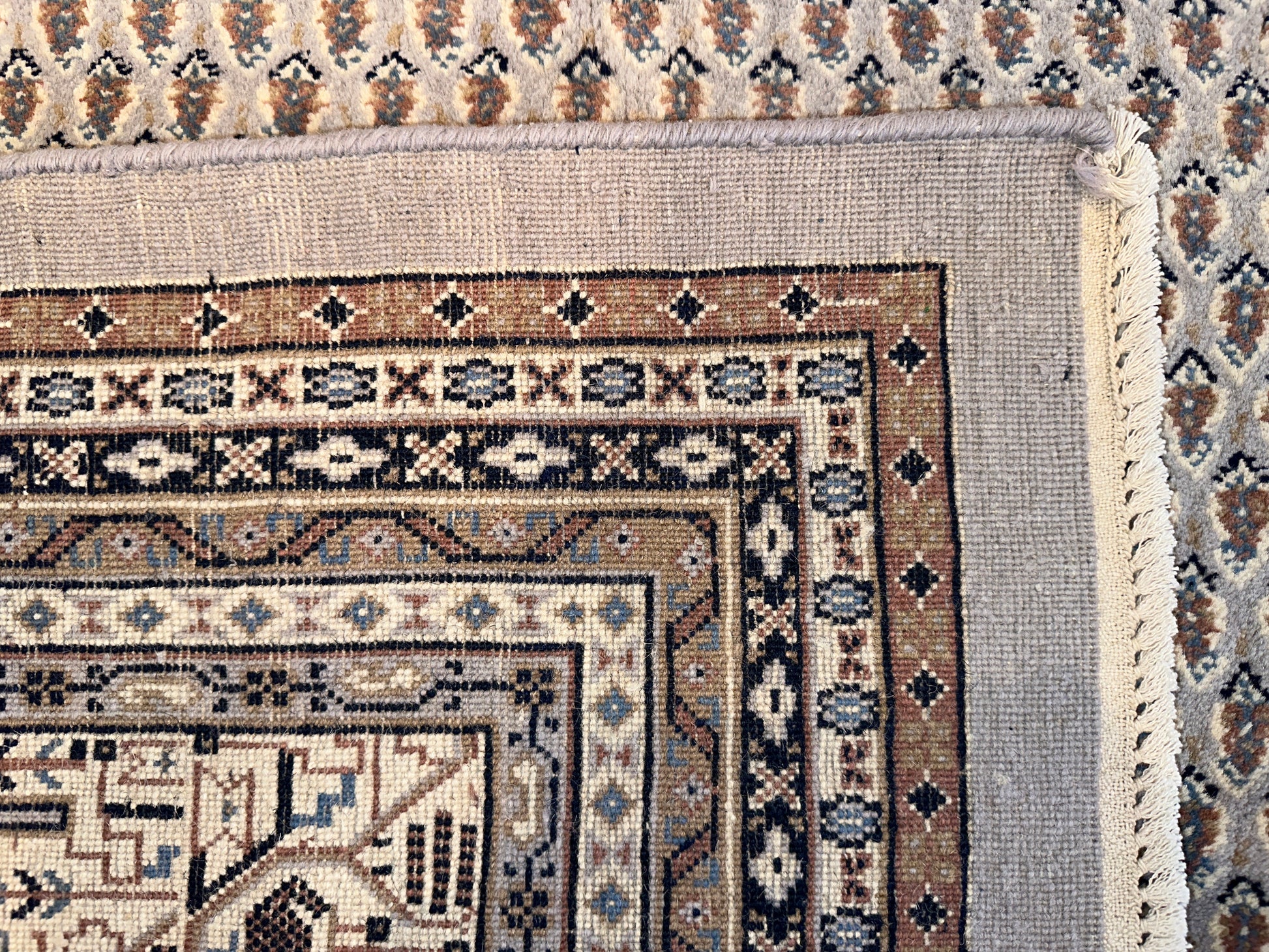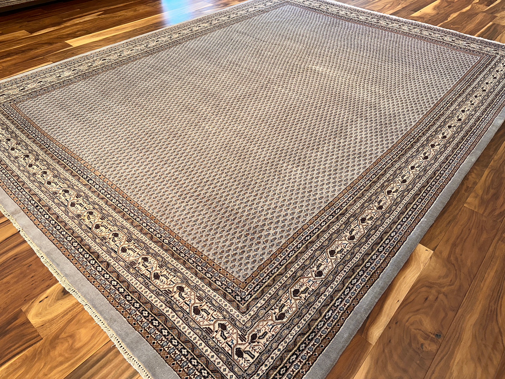With its finely detailed lattice field and softly luminous palette, this hand-knotted rug offers a sense of understated grandeur. The delicate boteh motifs—an ancient symbol of life and eternity—repeat in rhythmic precision across the field, framed by classic Persian borders adorned with scrolling vines and floral elements. Its timeless balance of intricacy and restraint makes it an elegant foundation for formal spaces.