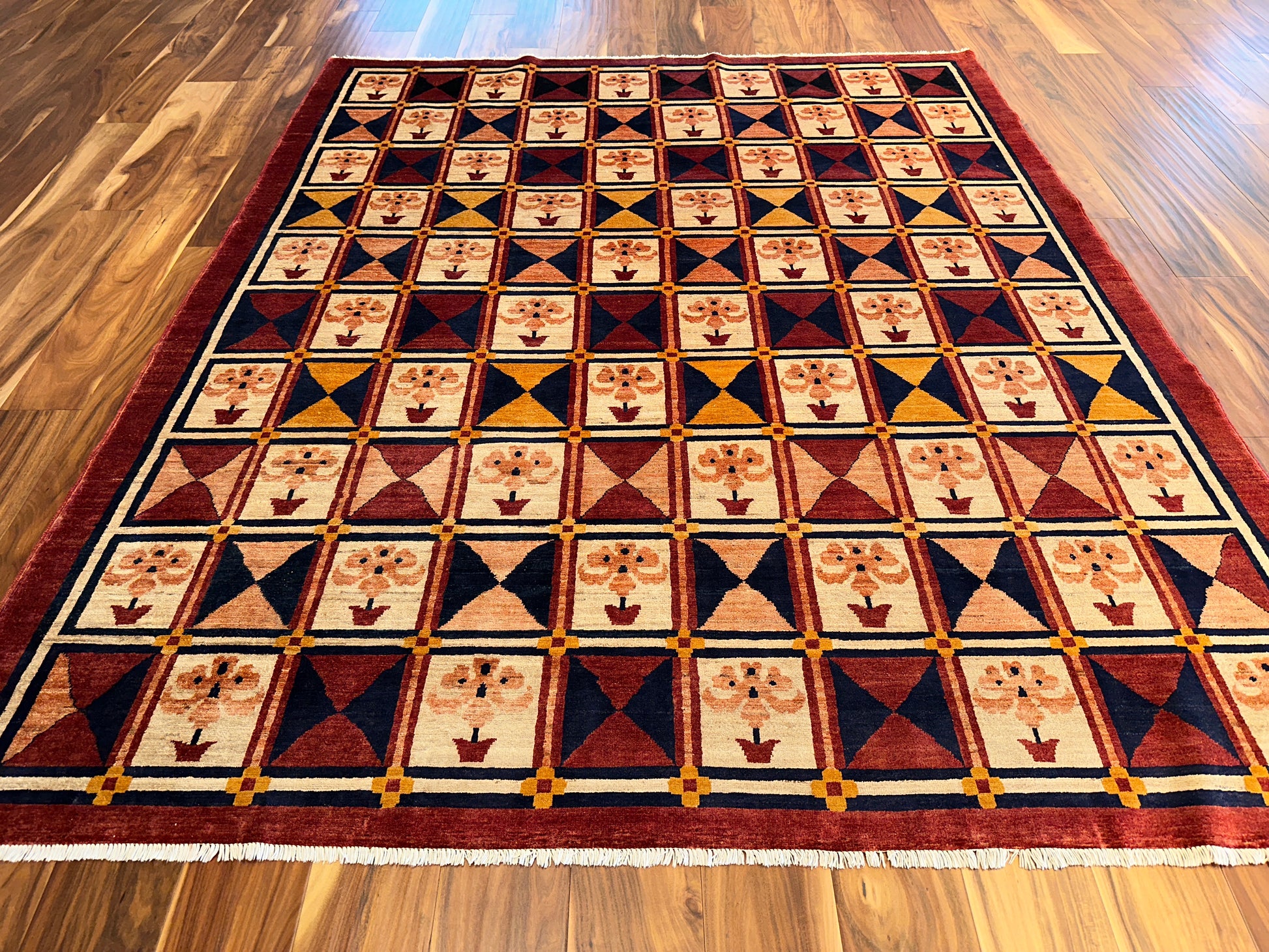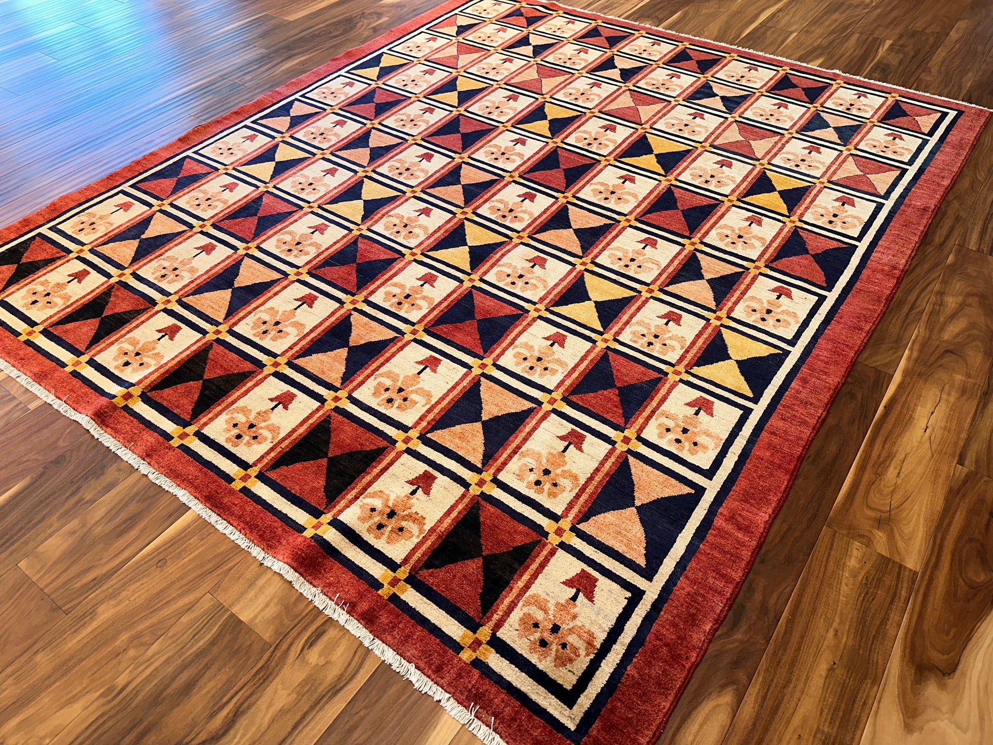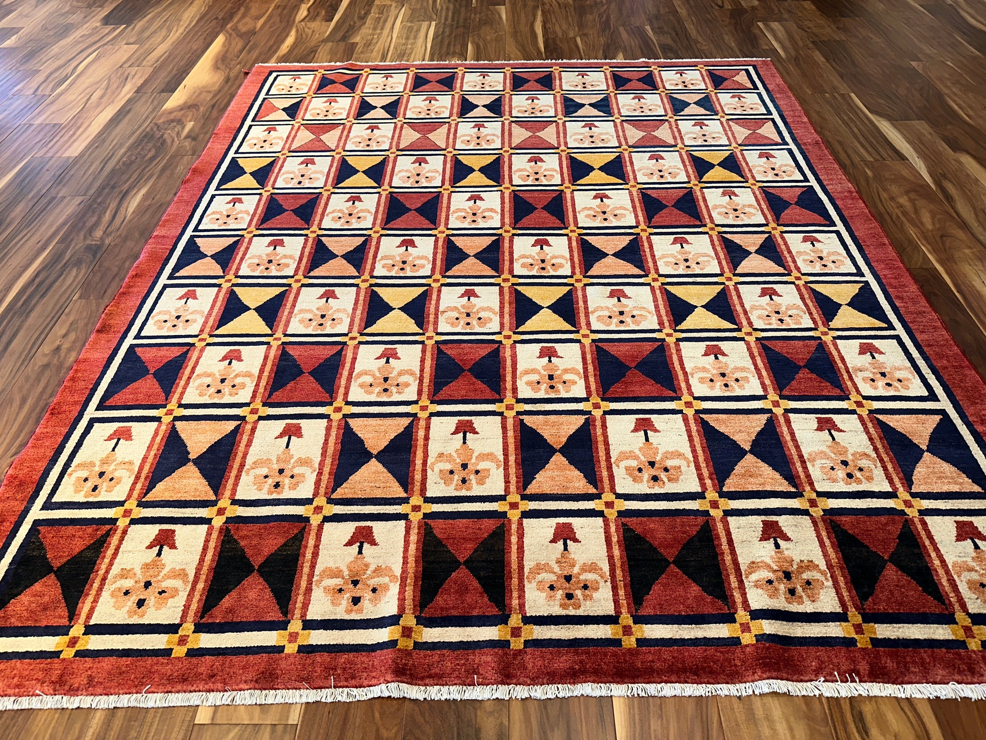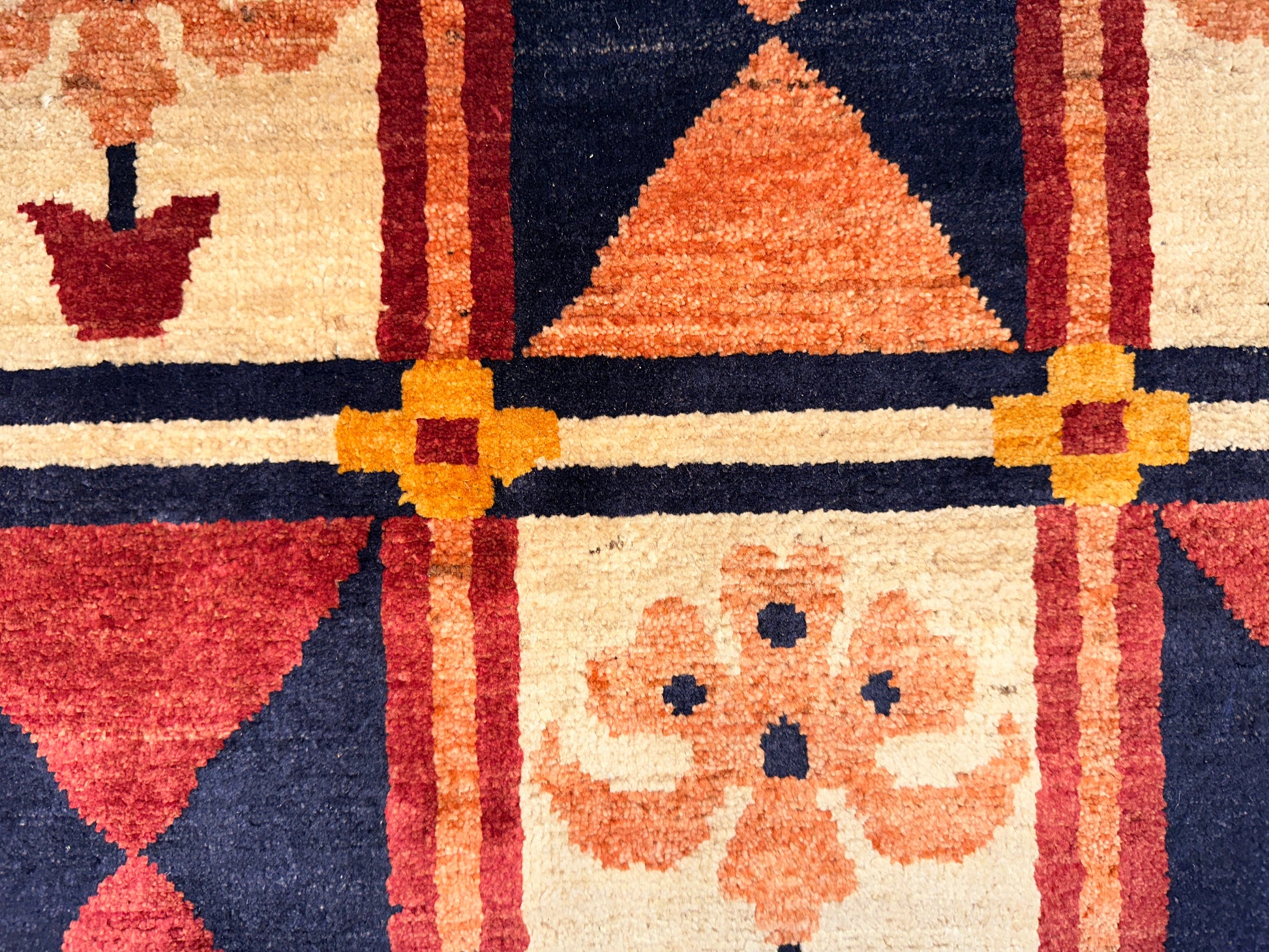 Playful and boldly graphic, this hand-knotted rug features a grid of alternating geometric and floral blocks, each framed in a striking lattice of deep navy and golden accents. The vibrant palette—featuring shades of rust, cream, saffron, and peach—brings an energetic, contemporary twist to a structured layout reminiscent of mid-century design.