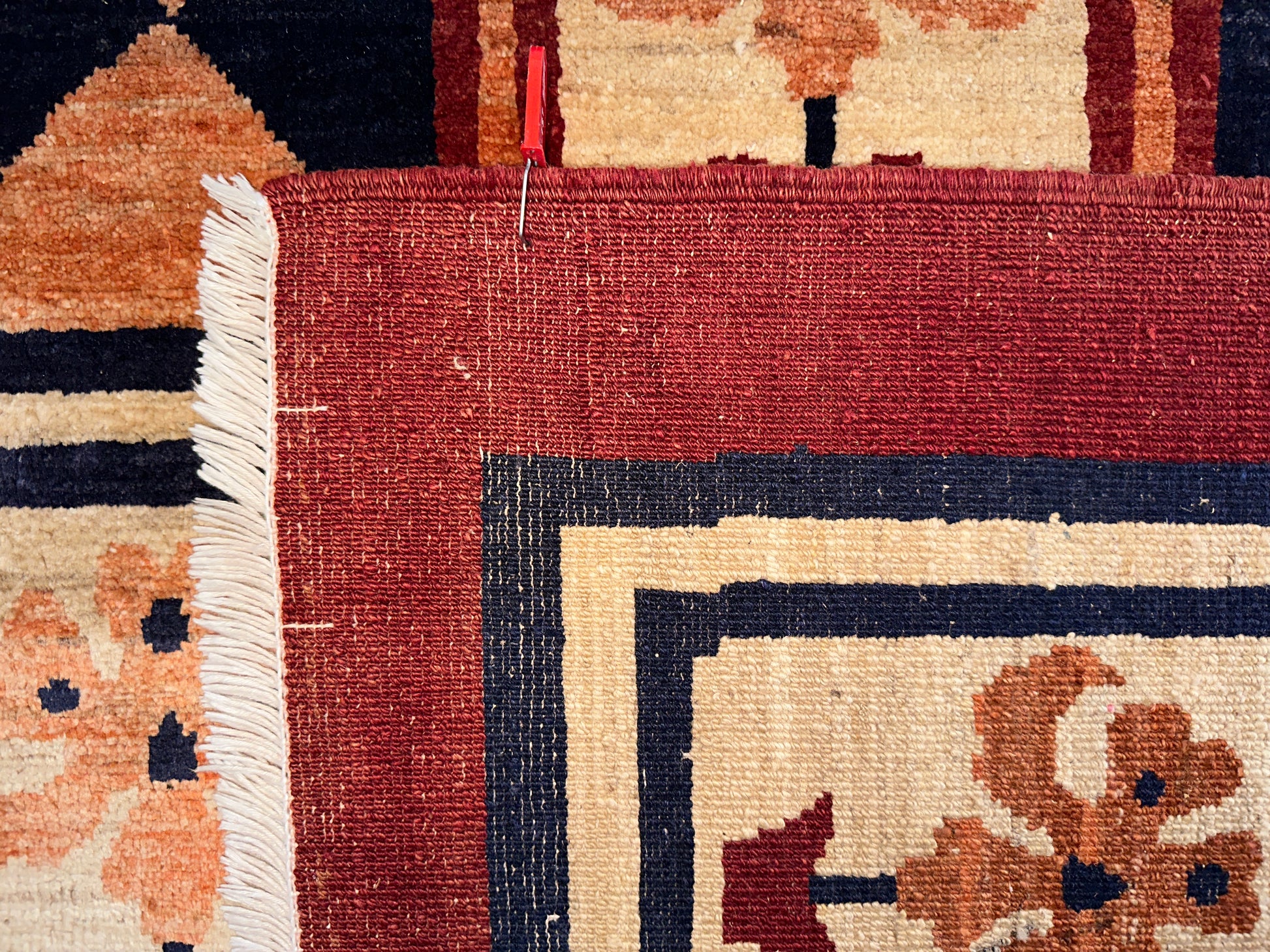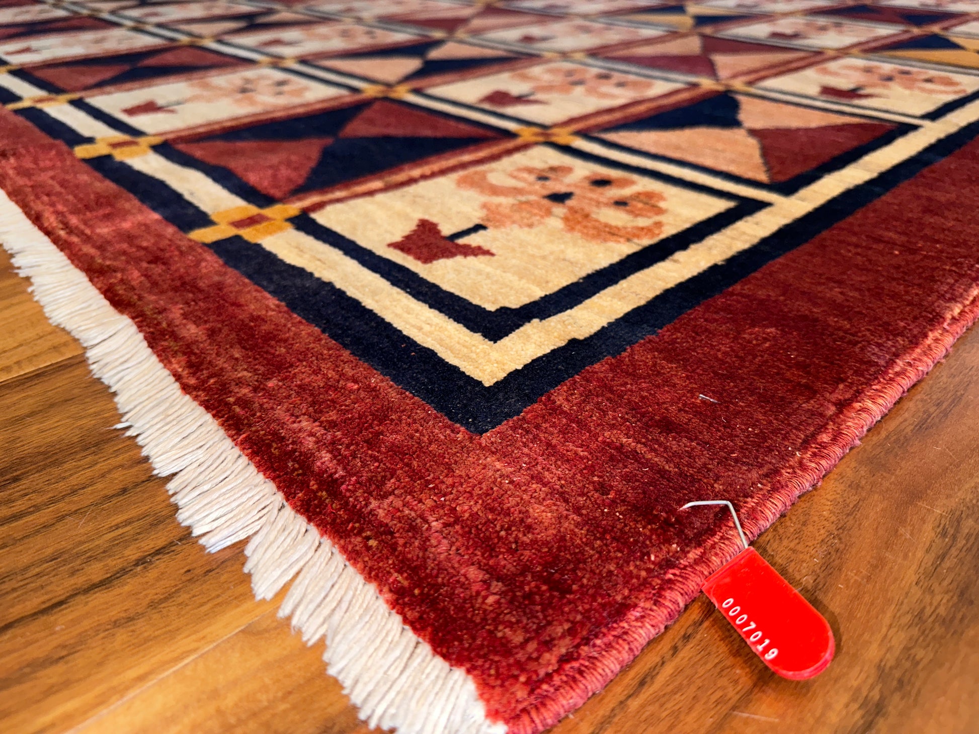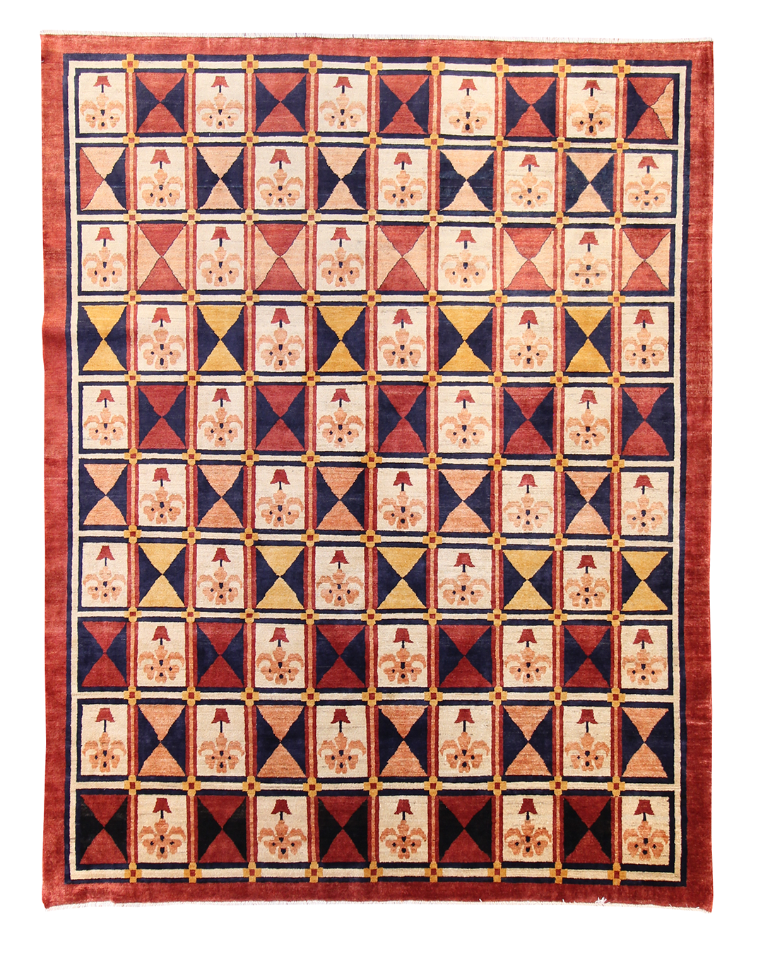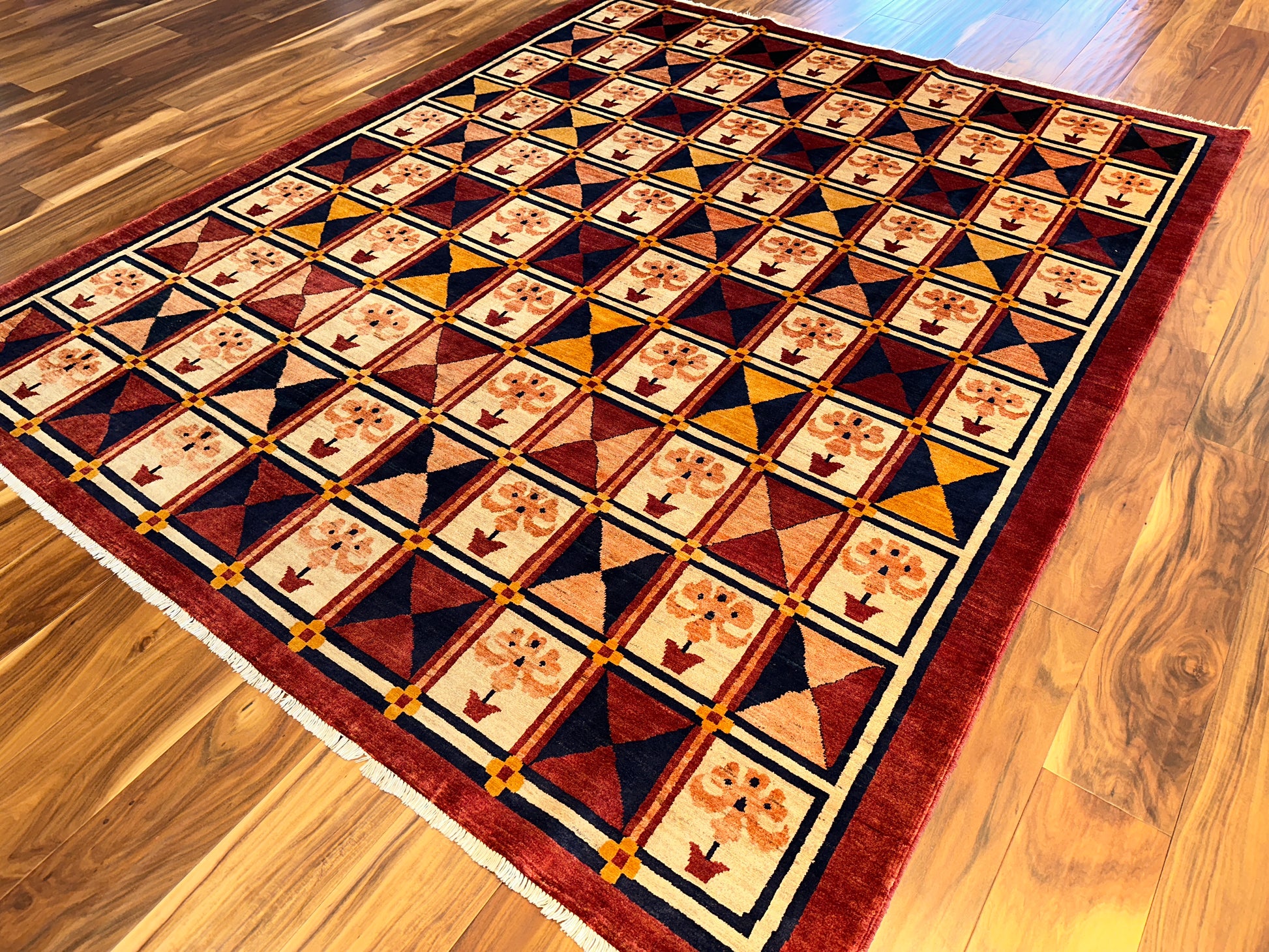 Playful and boldly graphic, this hand-knotted rug features a grid of alternating geometric and floral blocks, each framed in a striking lattice of deep navy and golden accents. The vibrant palette—featuring shades of rust, cream, saffron, and peach—brings an energetic, contemporary twist to a structured layout reminiscent of mid-century design.