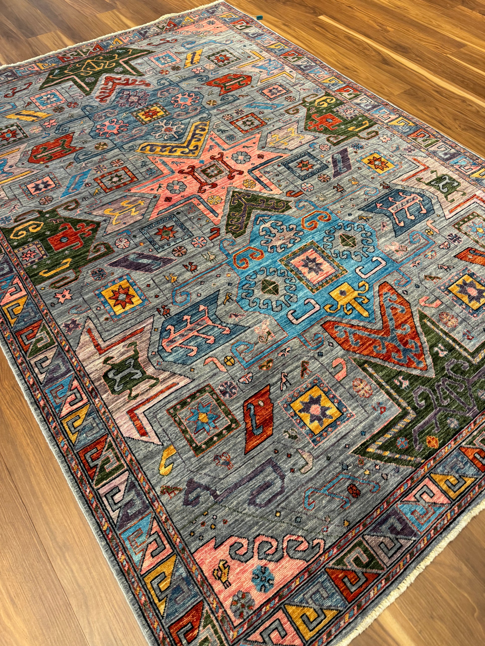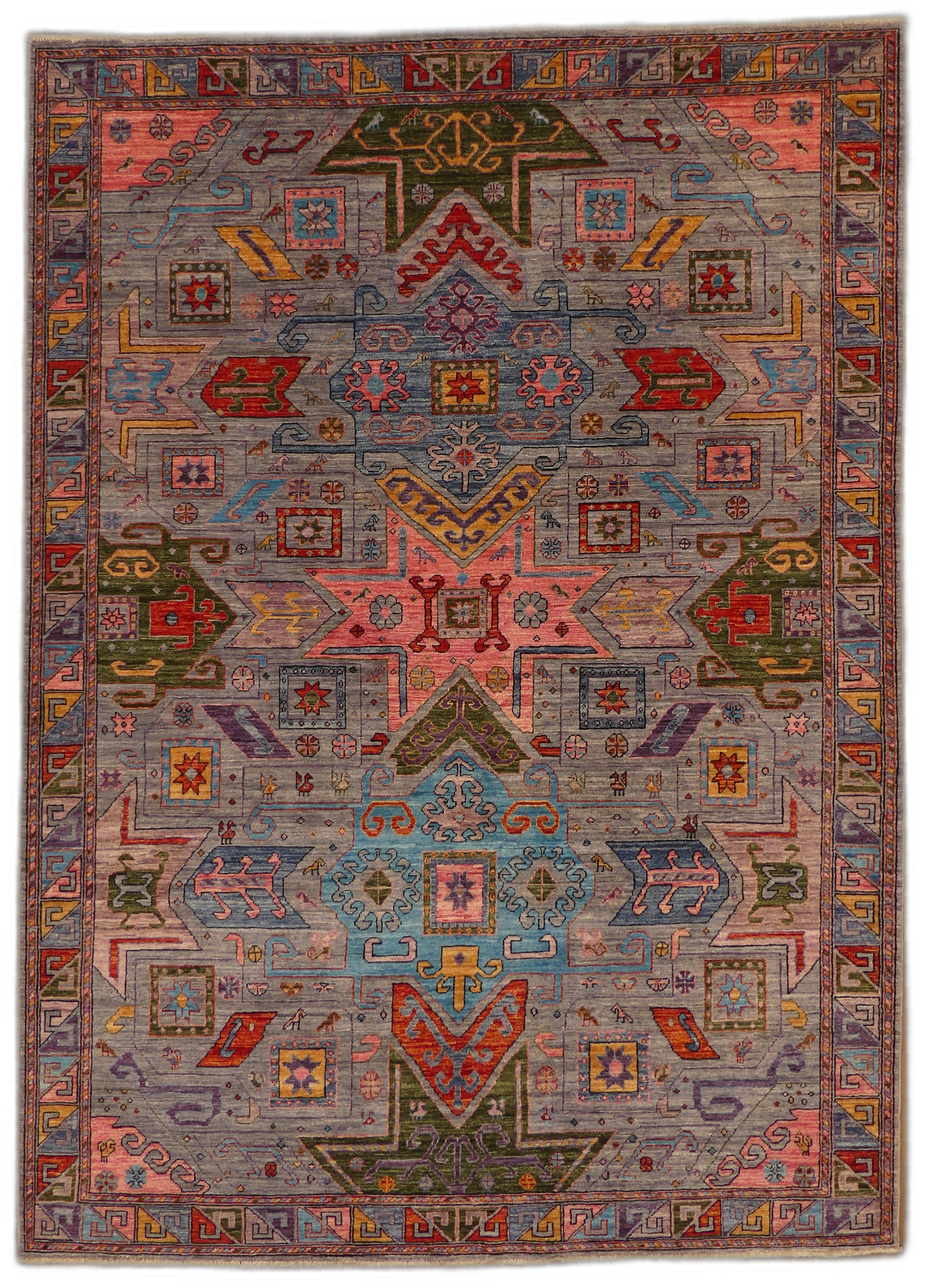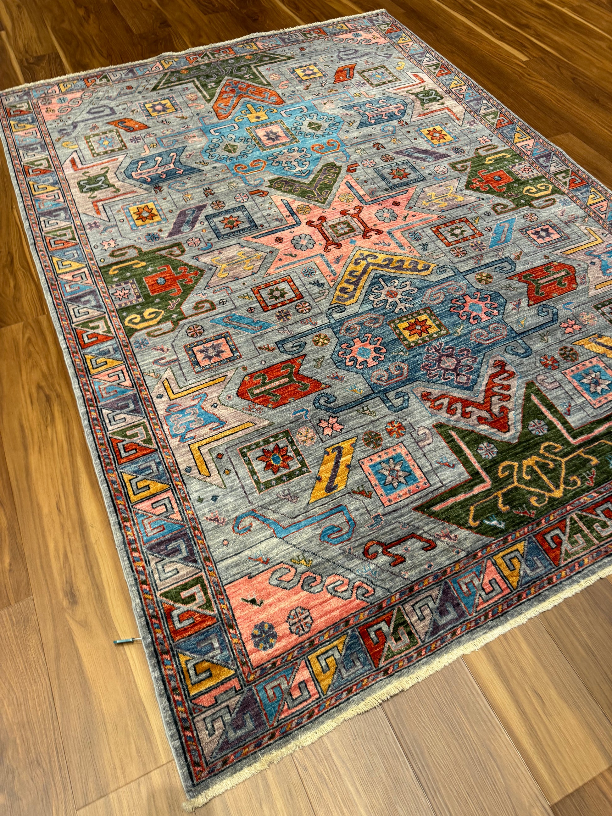 The Star Kazak rug presents a rich tapestry of color and intricate designs. Crafted from high-quality wool, it features a series of geometric patterns and star motifs that are emblematic of the traditional Kazak style. The central medallions are complemented by a detailed border, adding a sense of symmetry and balance. Its vibrant palette and exquisite craftsmanship are sure to enhance the aesthetic appeal of any room.