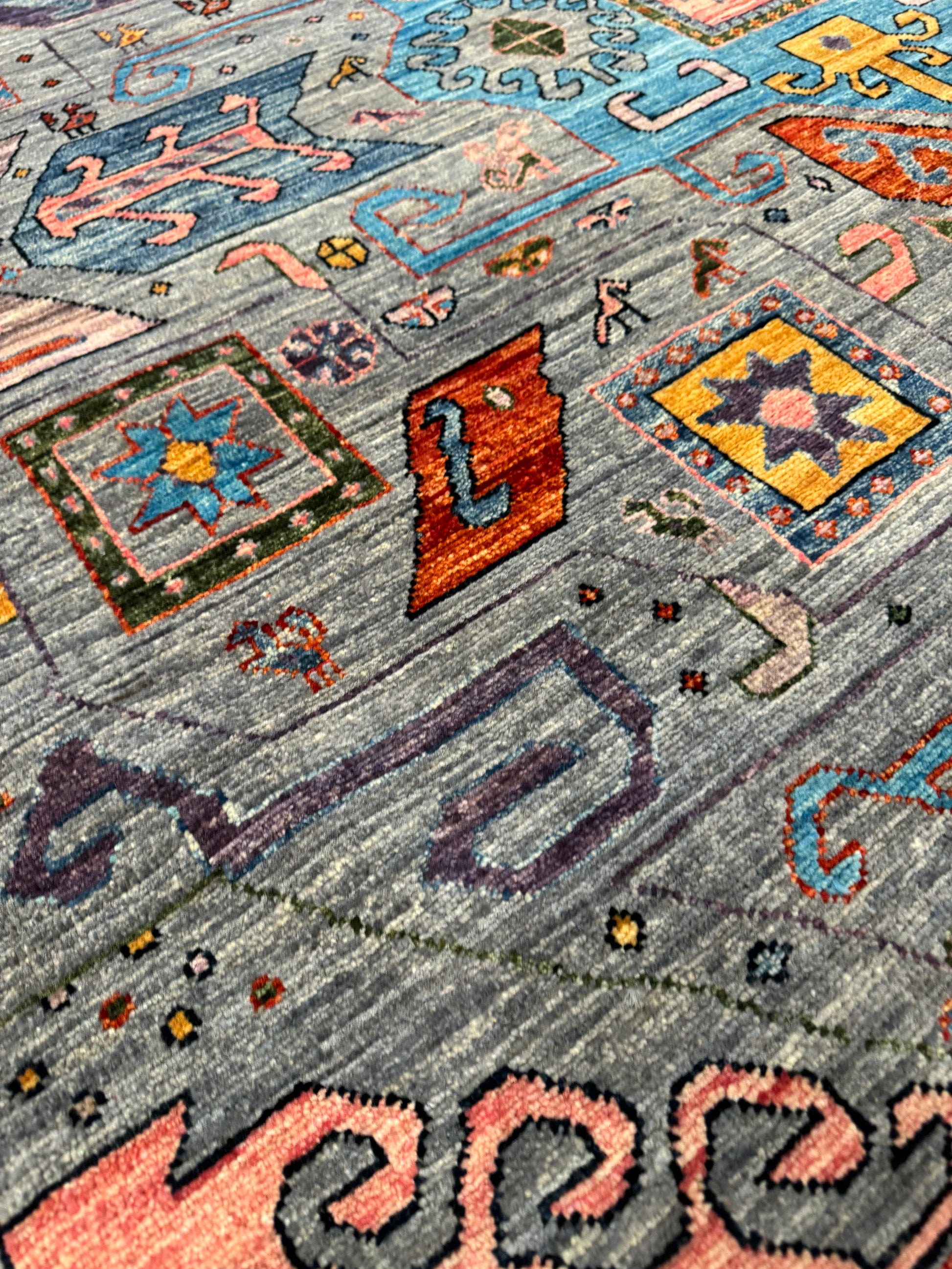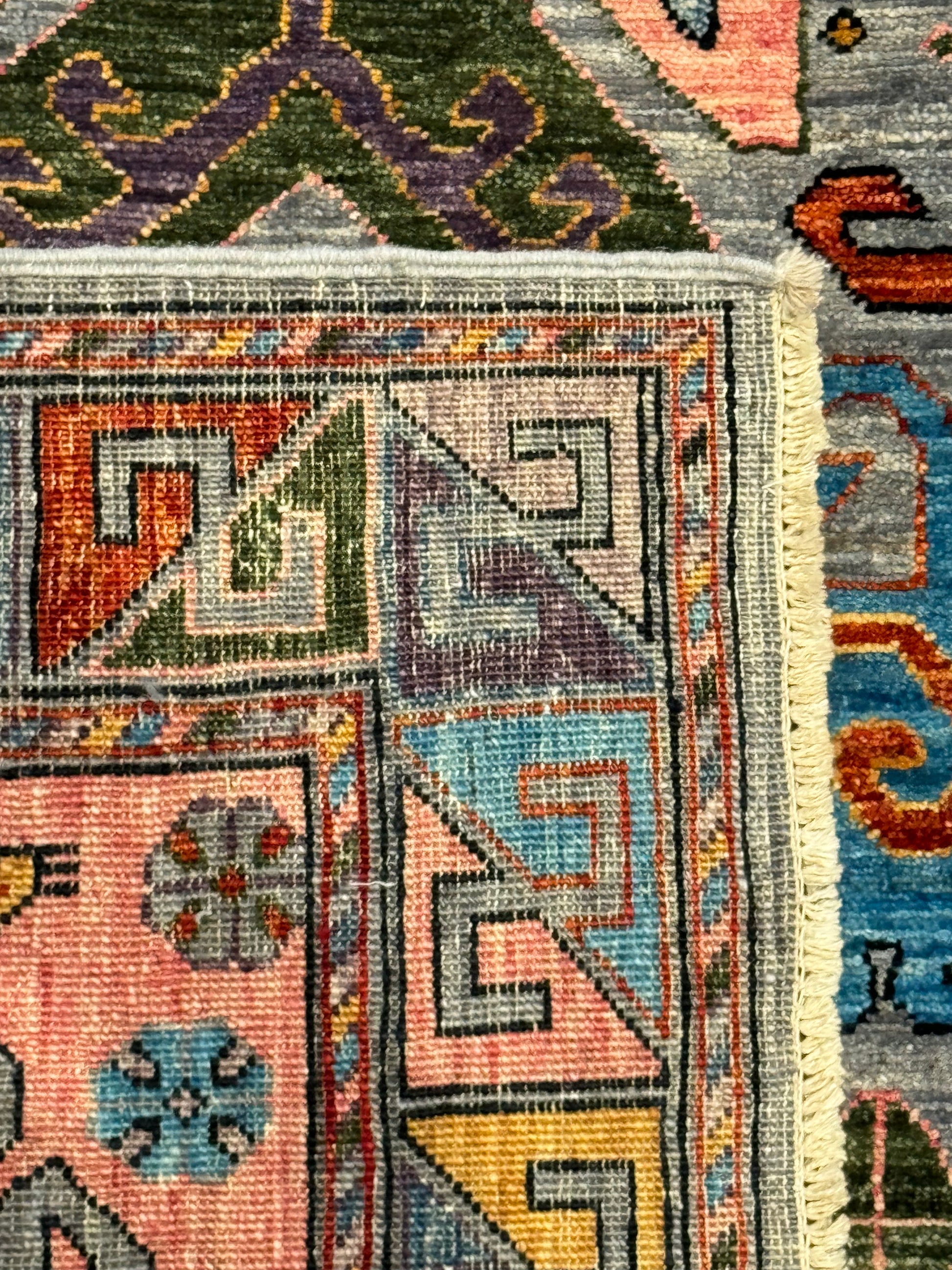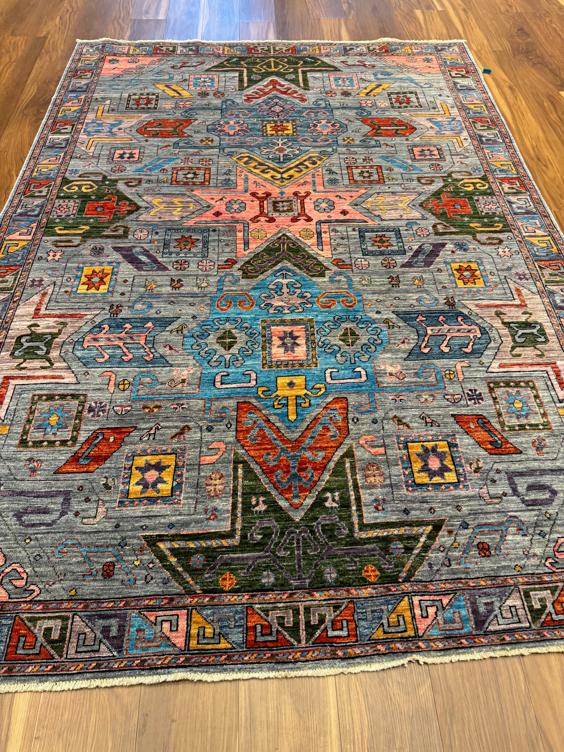 The Star Kazak rug presents a rich tapestry of color and intricate designs. Crafted from high-quality wool, it features a series of geometric patterns and star motifs that are emblematic of the traditional Kazak style. The central medallions are complemented by a detailed border, adding a sense of symmetry and balance. Its vibrant palette and exquisite craftsmanship are sure to enhance the aesthetic appeal of any room.