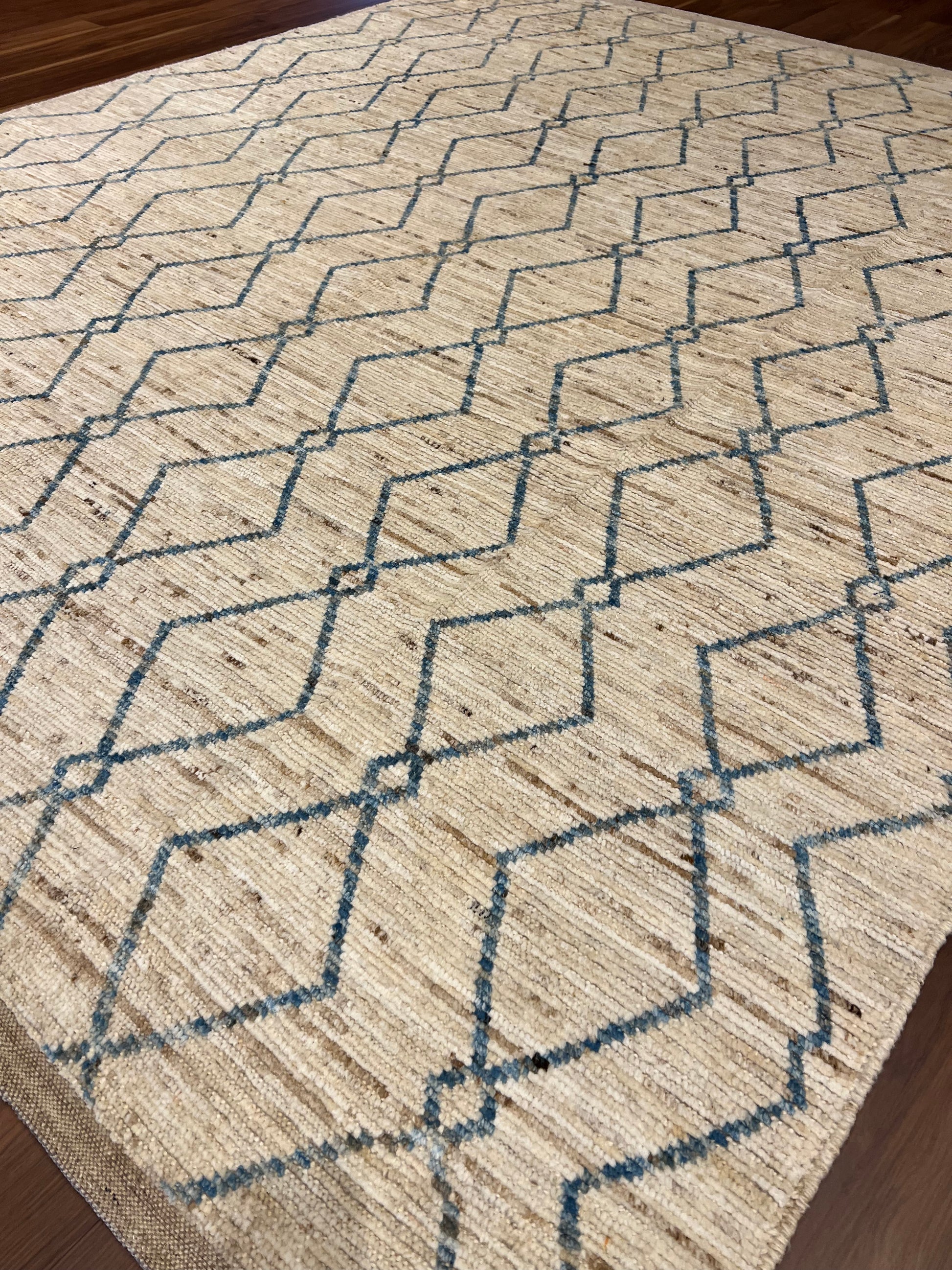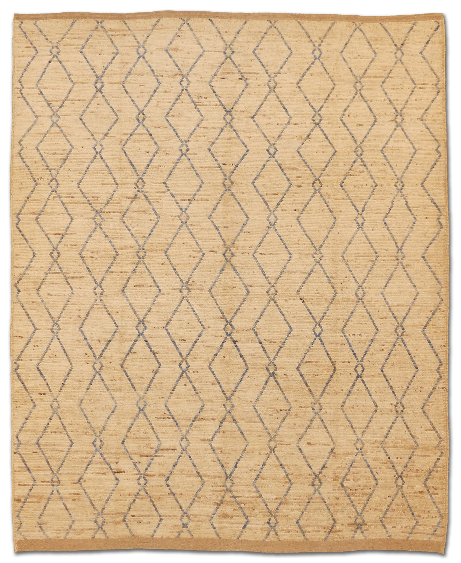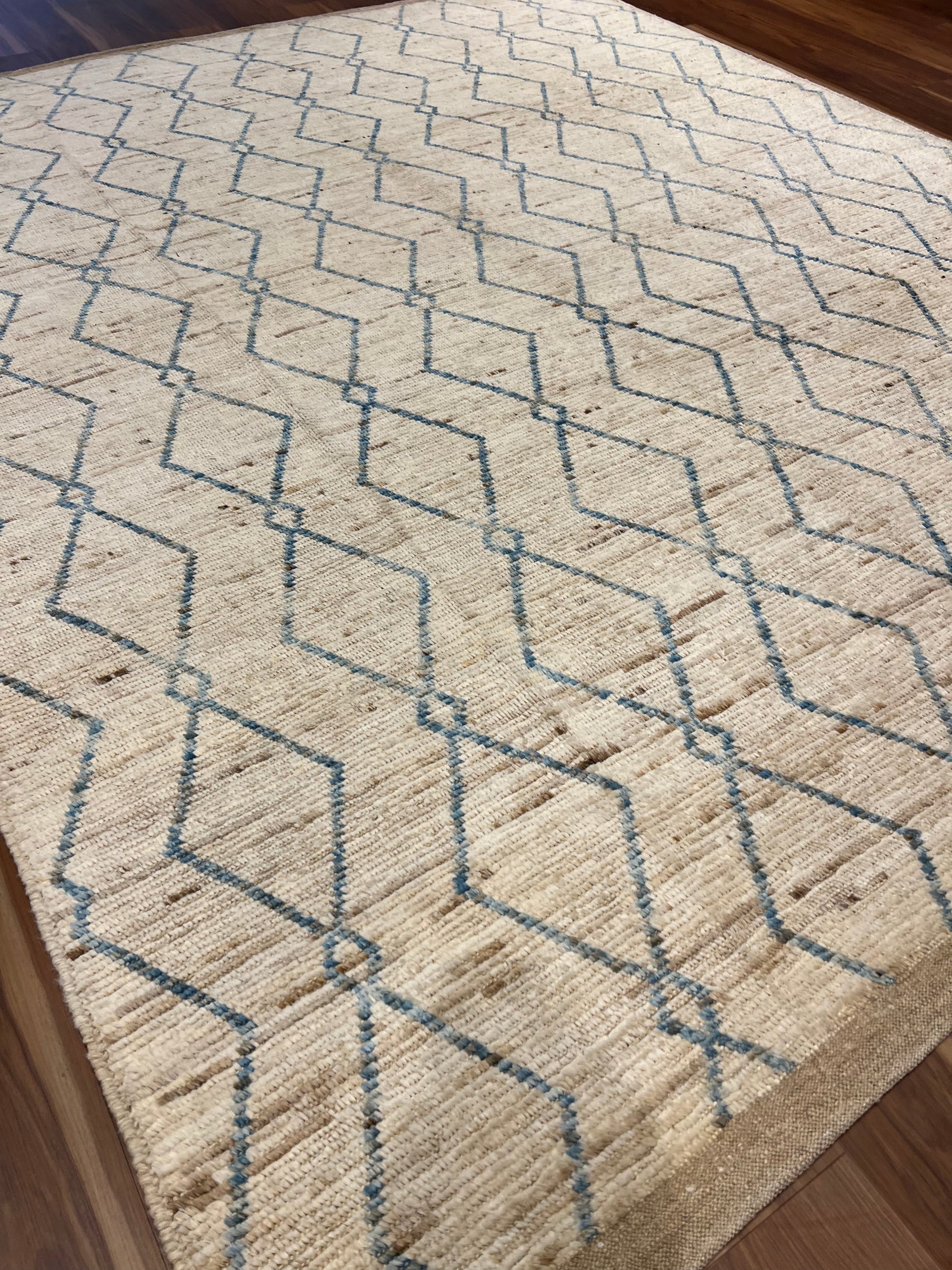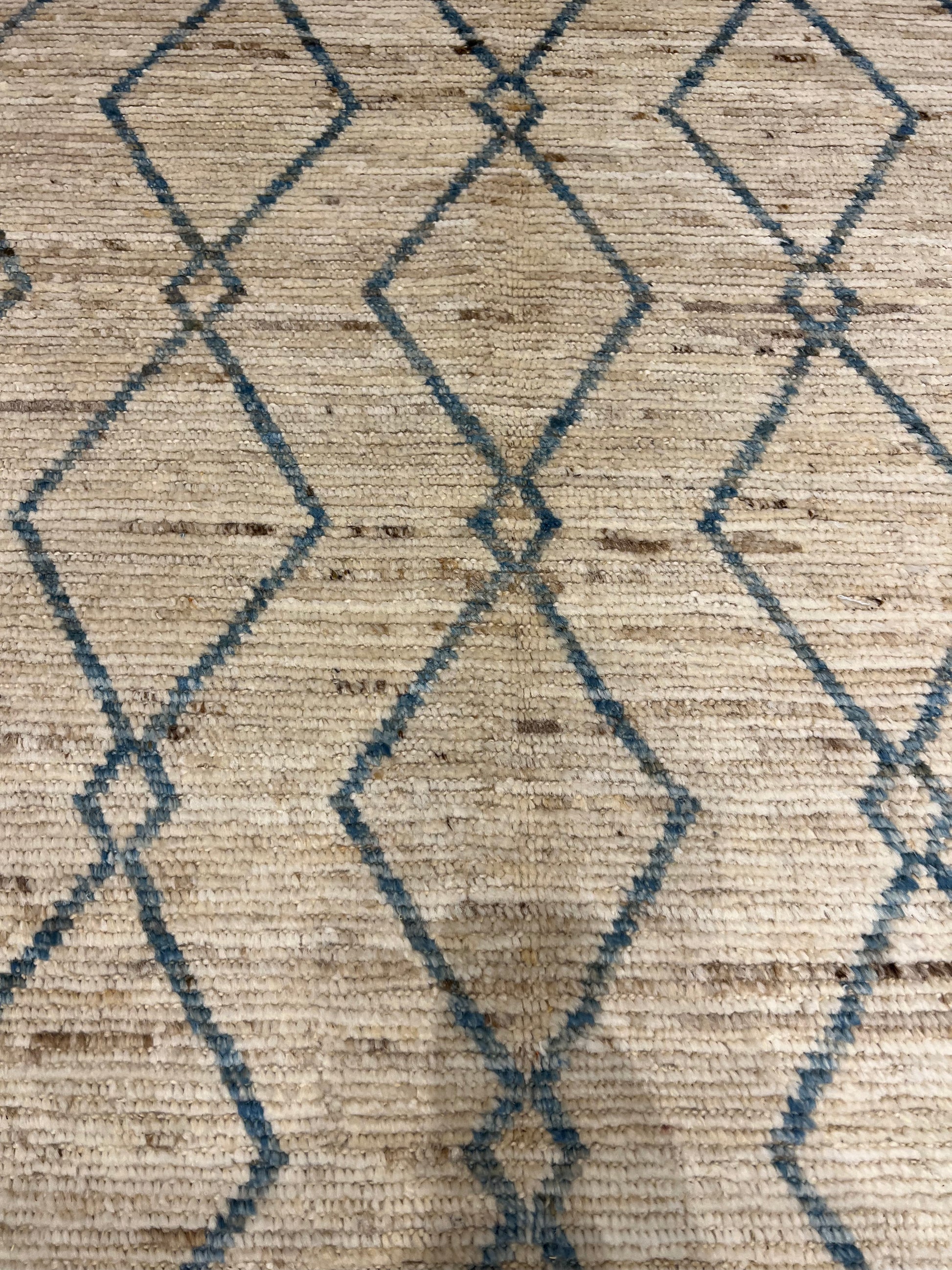 This elegantly simple Moroccan Wool Rug boasts a minimalist design, featuring a beige backdrop with a subtle, brown diamond lattice pattern. Handwoven by skilled artisans, it's made with high-quality wool, offering both durability and comfort. Perfect for adding a touch of understated sophistication to your space, this rug seamlessly blends with various interior decors, from traditional to contemporary.