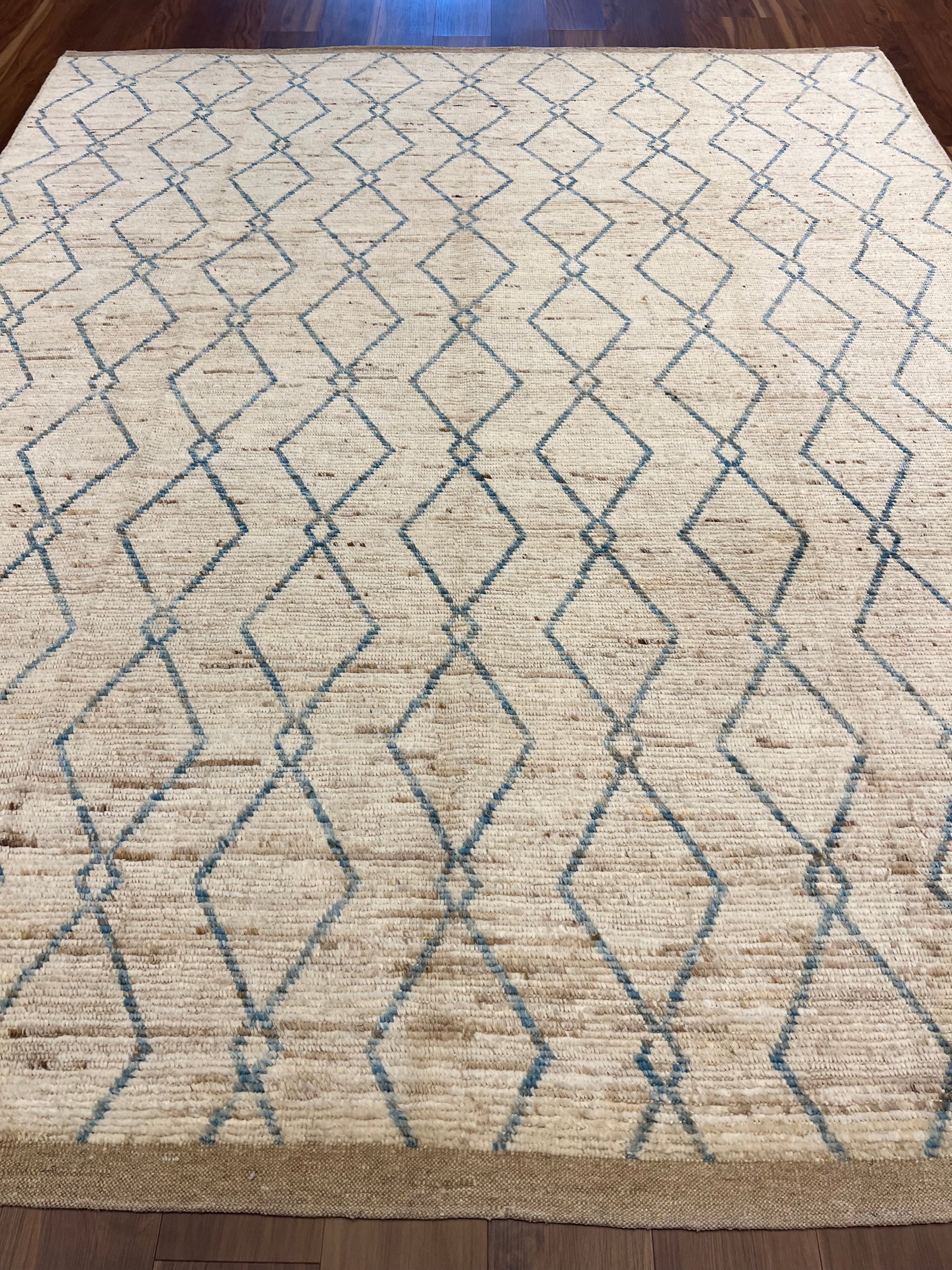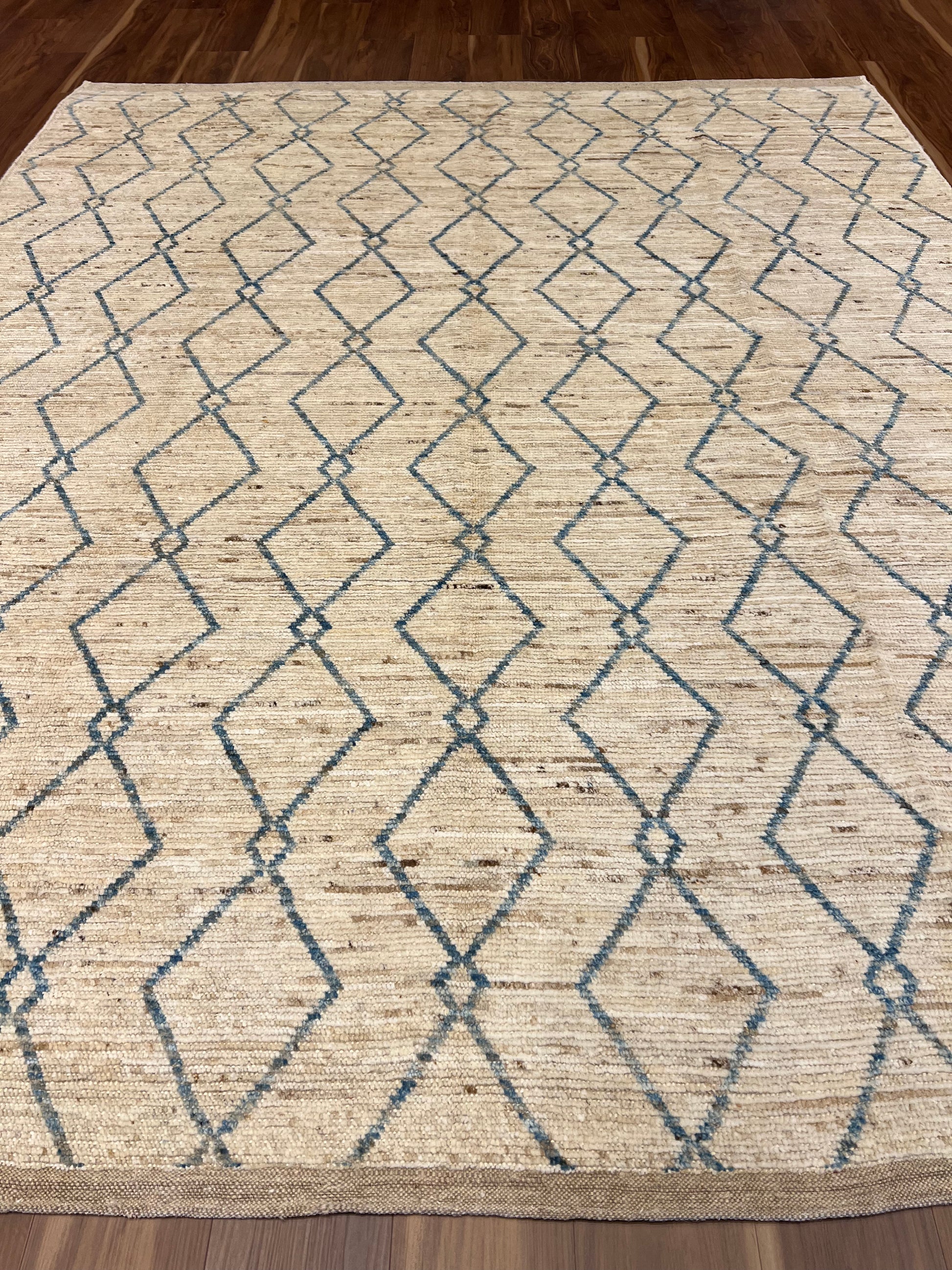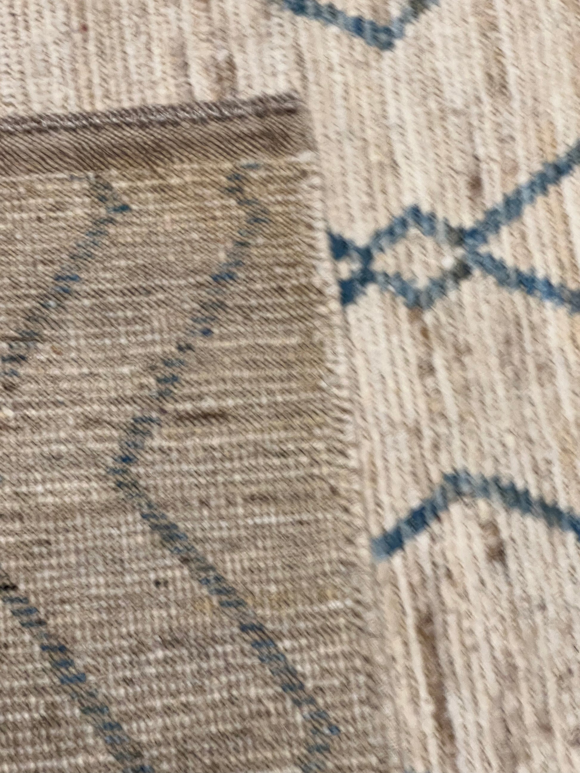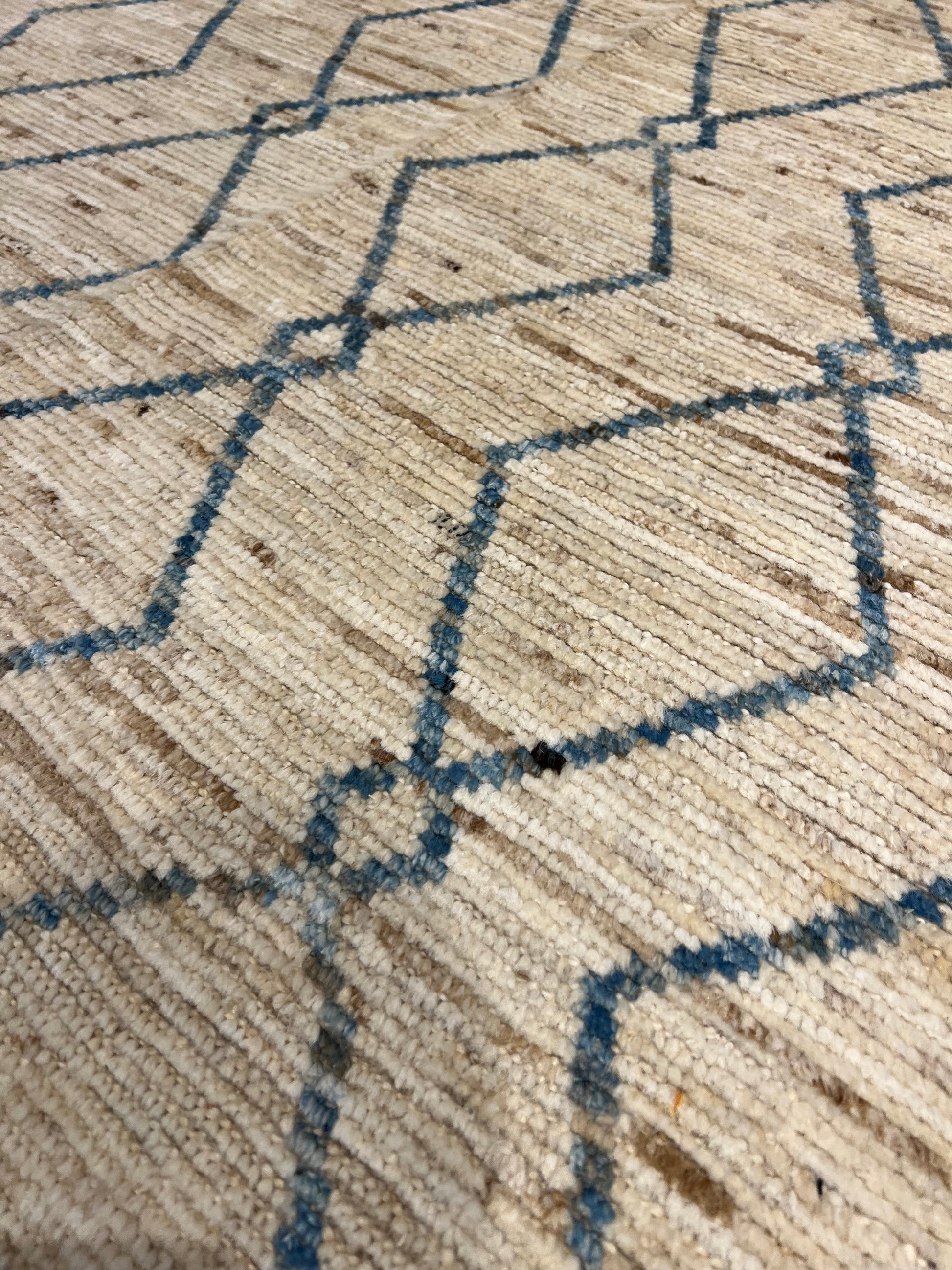 This elegantly simple Moroccan Wool Rug boasts a minimalist design, featuring a beige backdrop with a subtle, brown diamond lattice pattern. Handwoven by skilled artisans, it's made with high-quality wool, offering both durability and comfort. Perfect for adding a touch of understated sophistication to your space, this rug seamlessly blends with various interior decors, from traditional to contemporary.