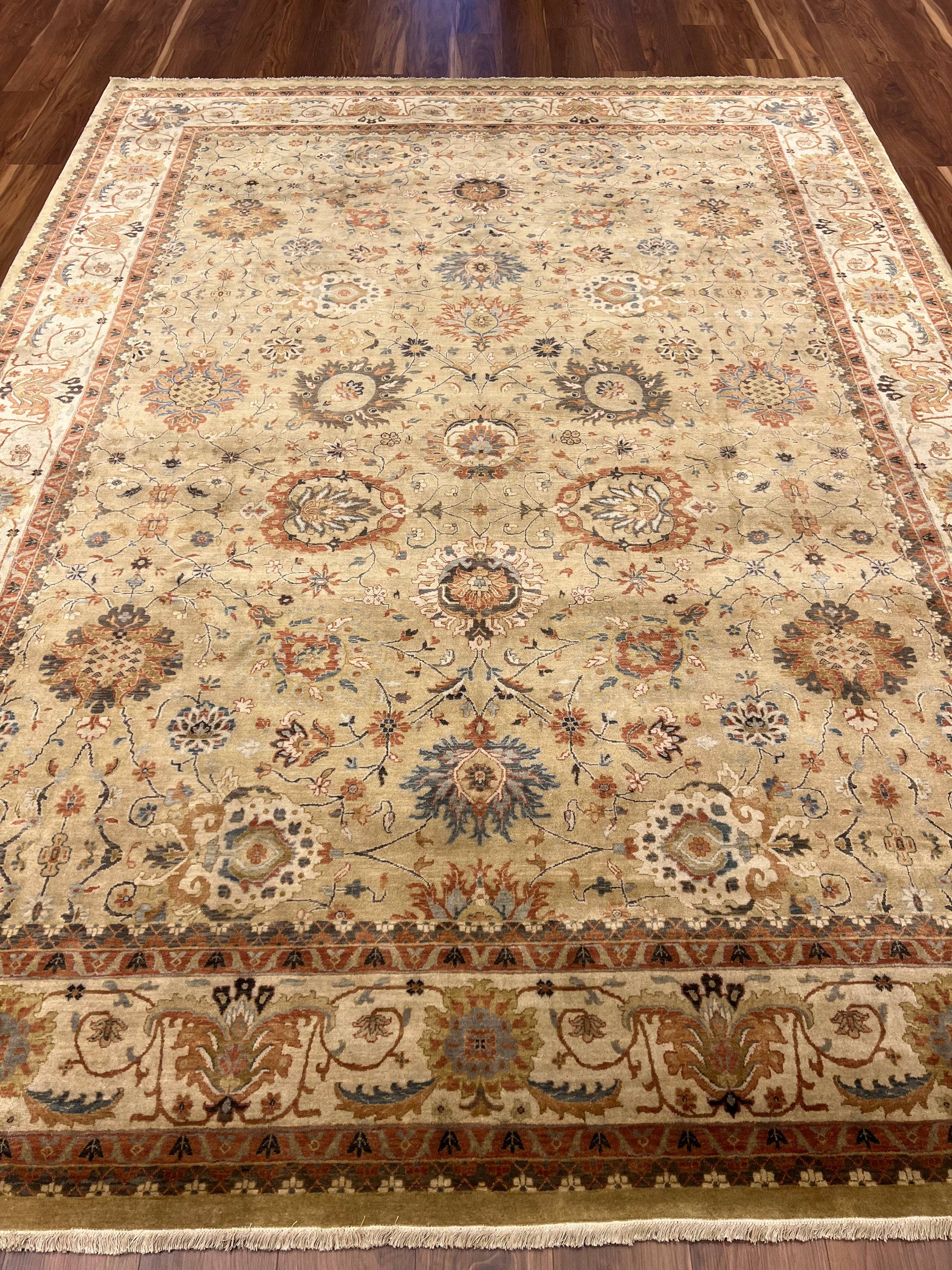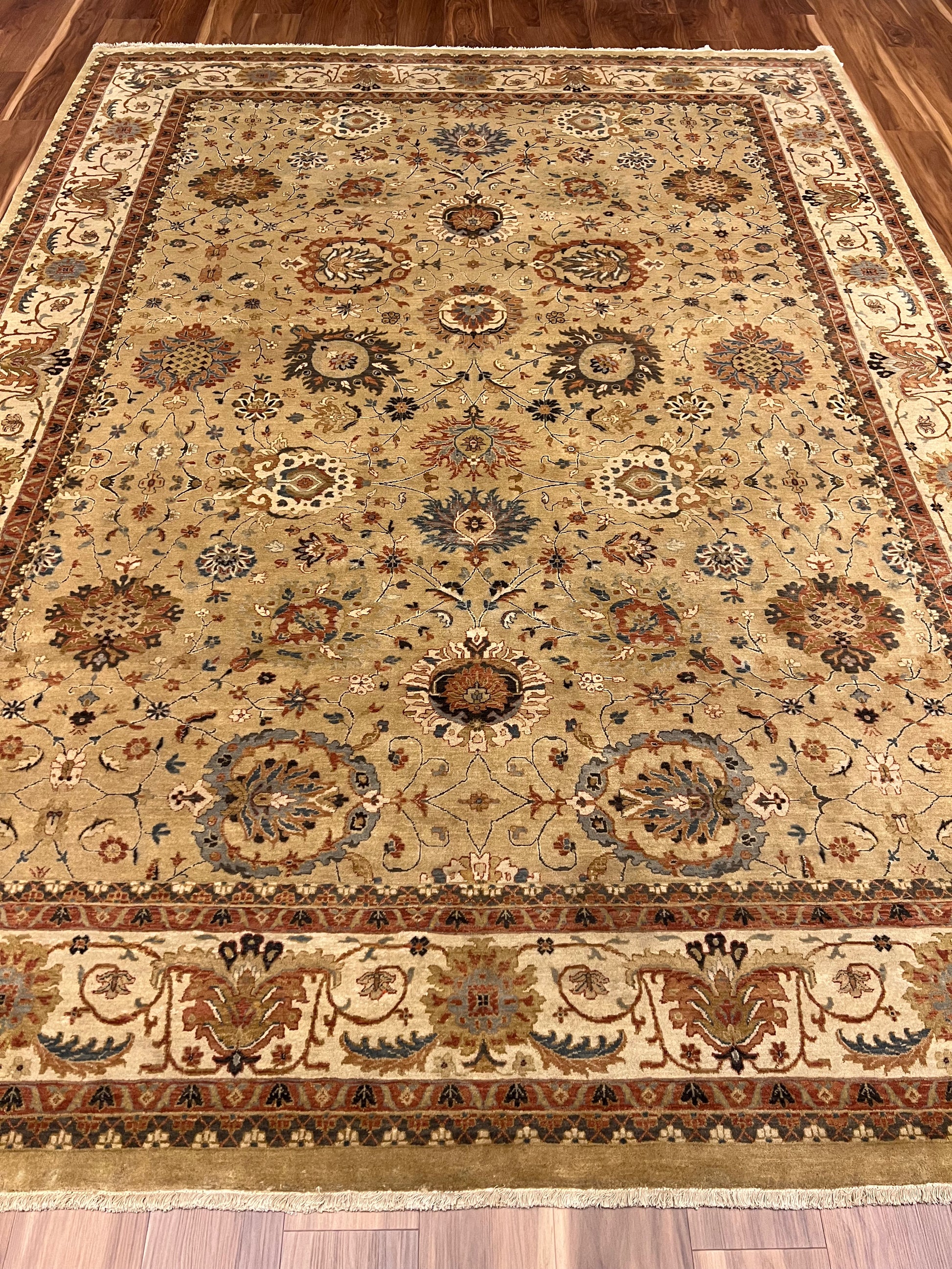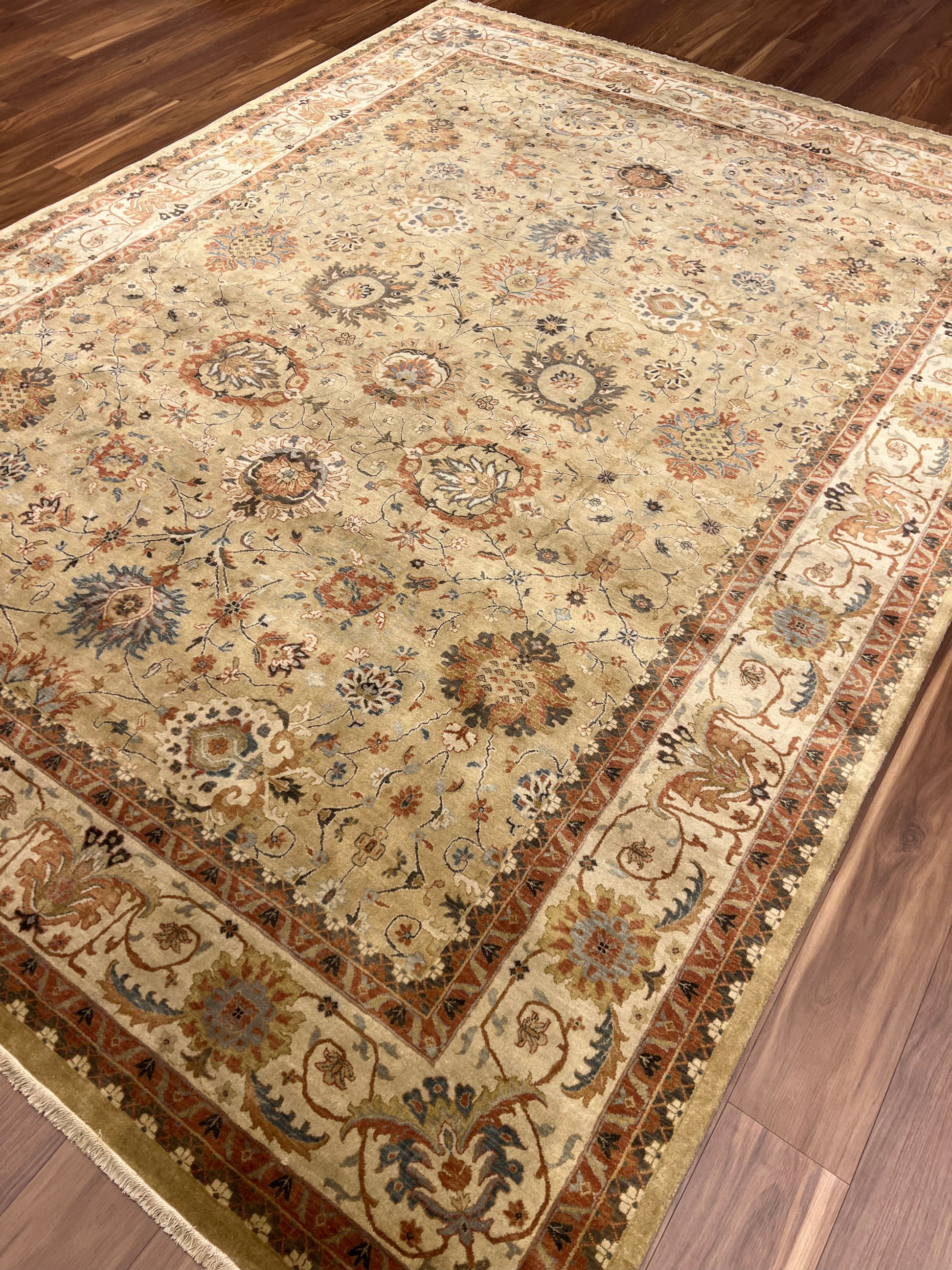 Exemplifying a classic charm with its intricate floral patterns and a rich color palette, this Sultanabad rug is handwoven from the finest wool. The all-over design features an array of palmettes, vine scrolls, and floral motifs, harmoniously blended to create a stunning piece that pays homage to the historical weaving traditions of Sultanabad. The beige background is thoughtfully contrasted with brown and orange details, encapsulating a sense of warmth and elegance. Ideal for adding a touch of timeless sophistication to any living space.