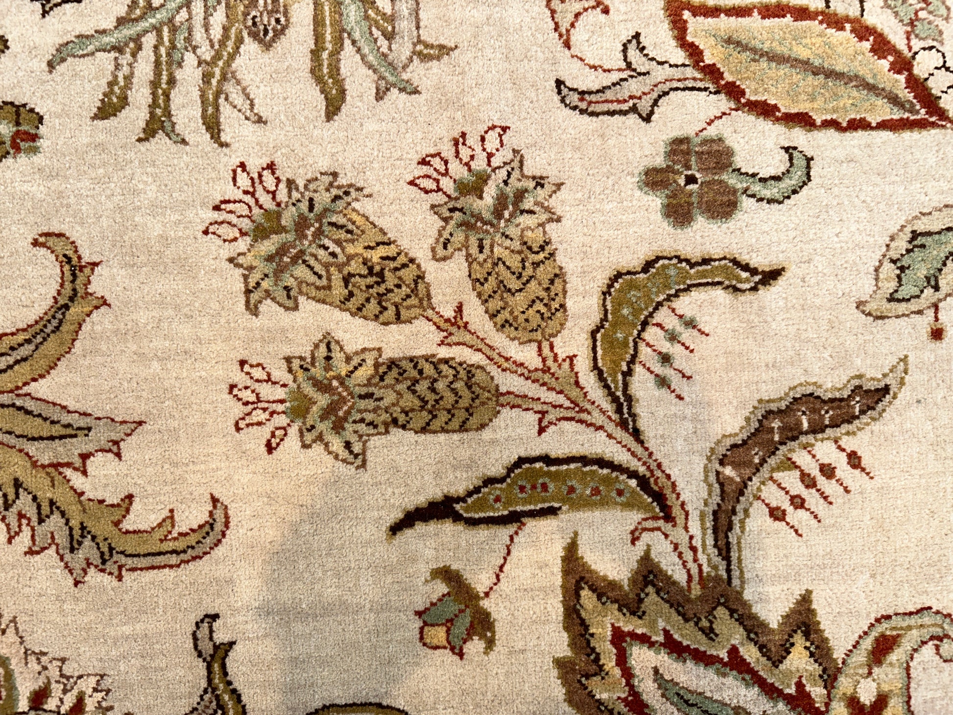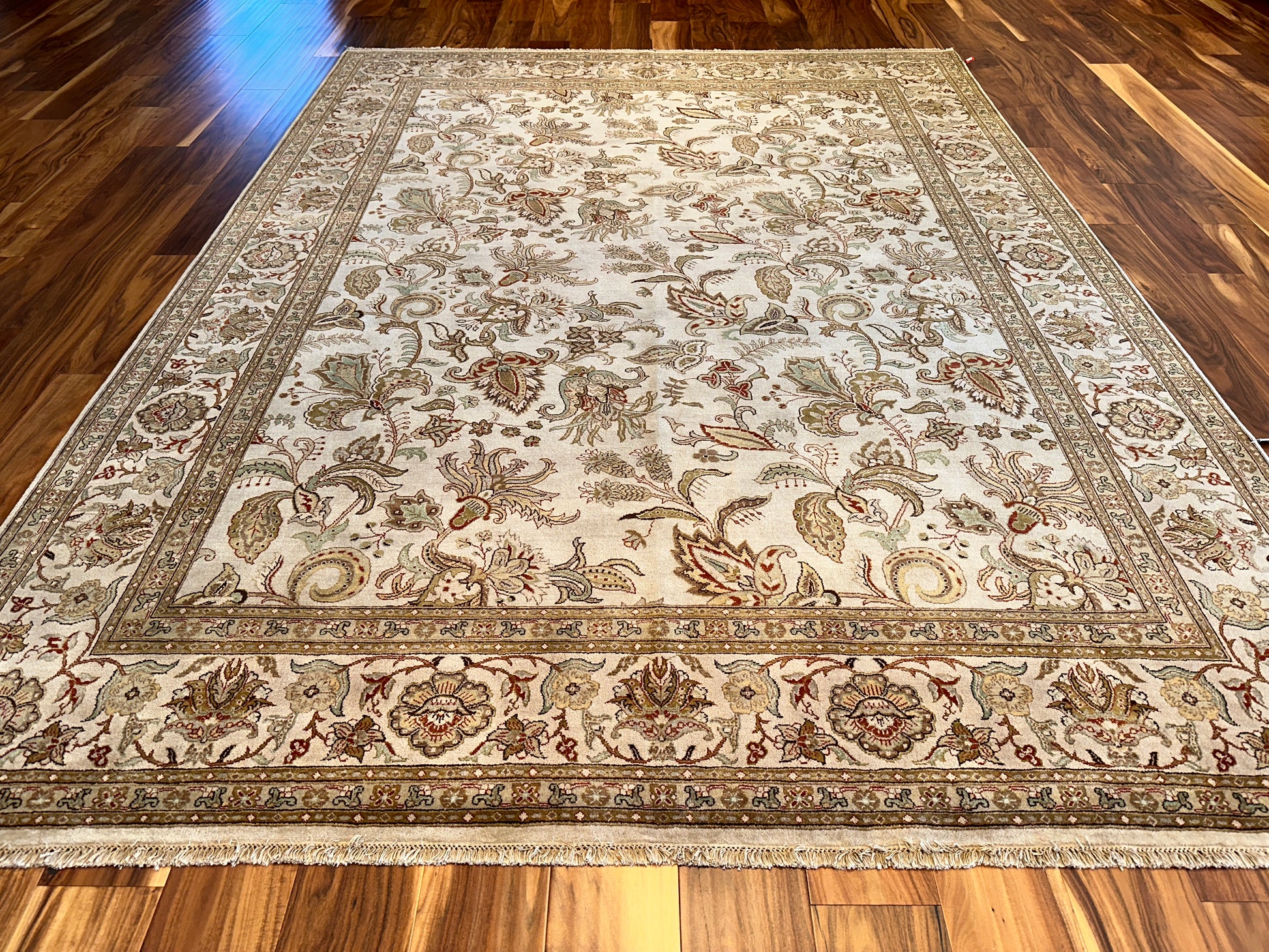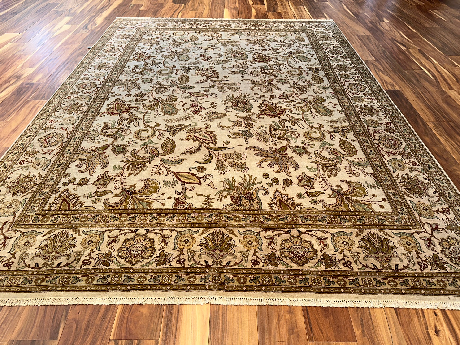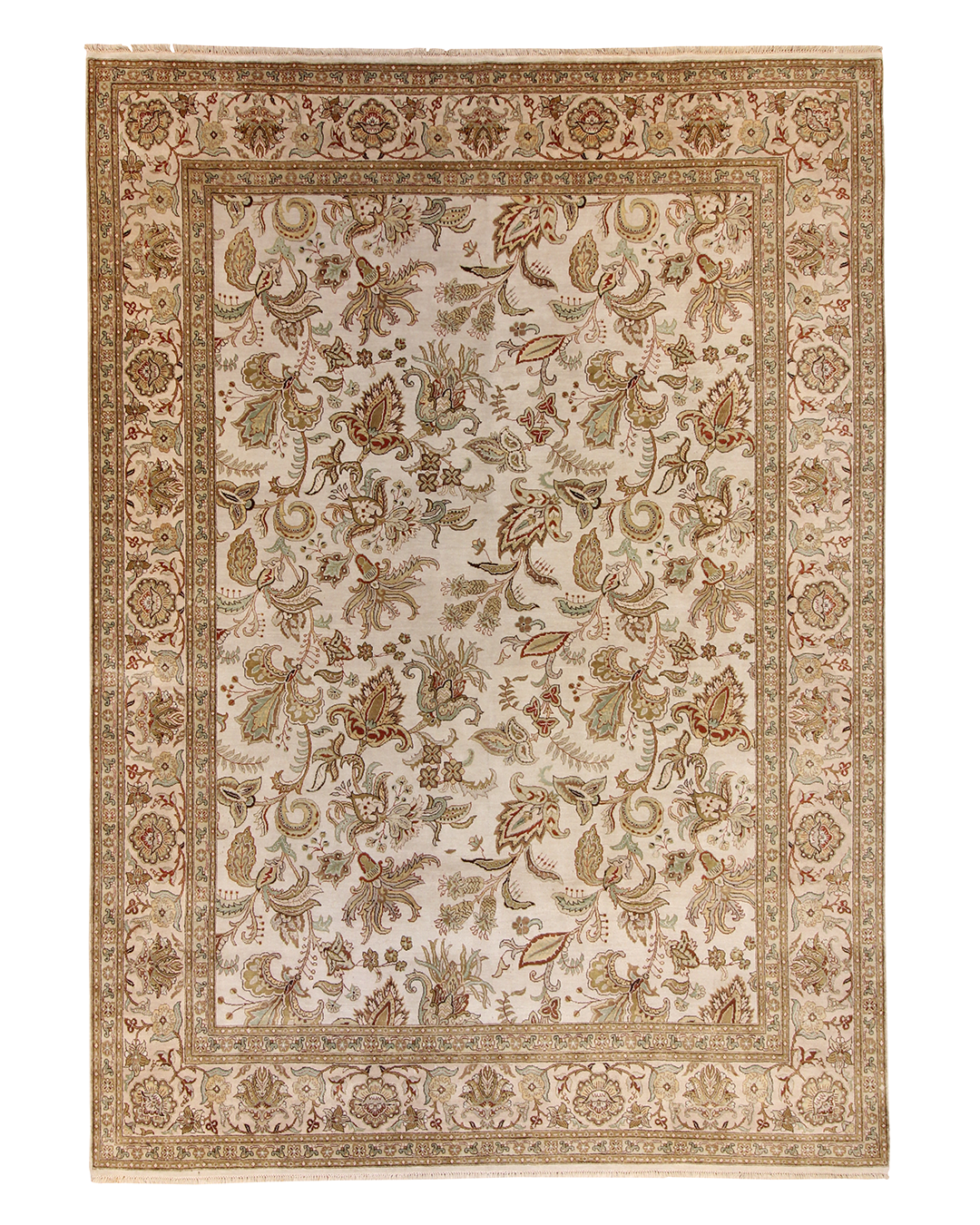 Delicate and refined, this hand-knotted rug features a soft ivory field woven with an intricate garden of scrolling leaves and floral motifs in gentle hues of sage, muted gold, and soft rust. The balanced border echoes the palette and movement of the field, creating a harmonious and serene composition. This rug brings an understated elegance to bedrooms, living rooms, or quiet sitting areas.