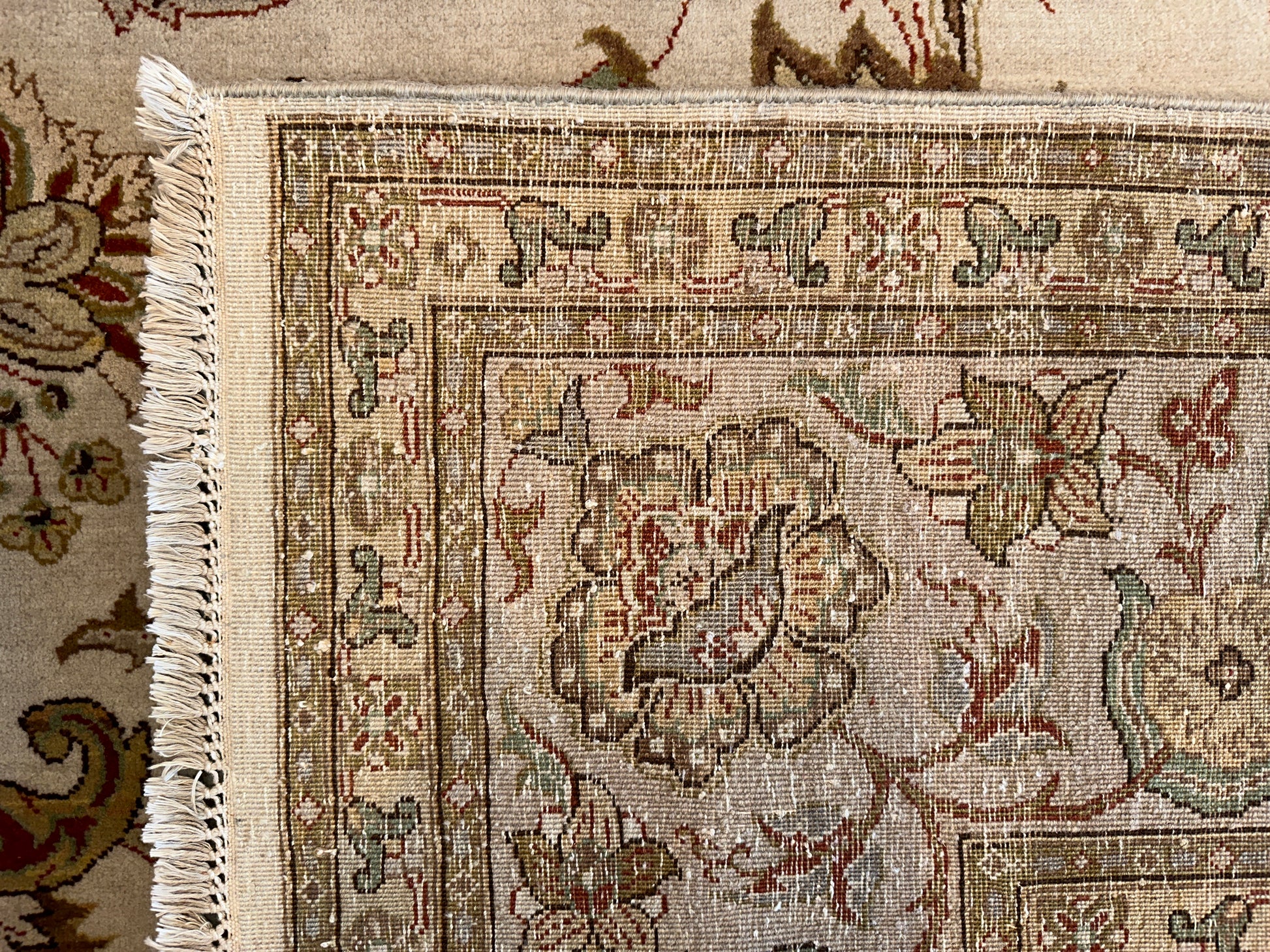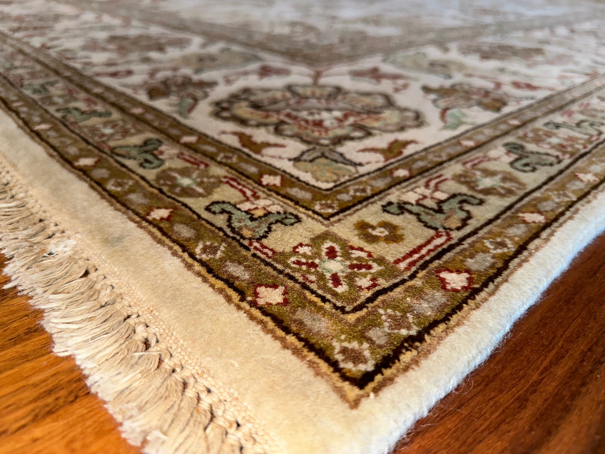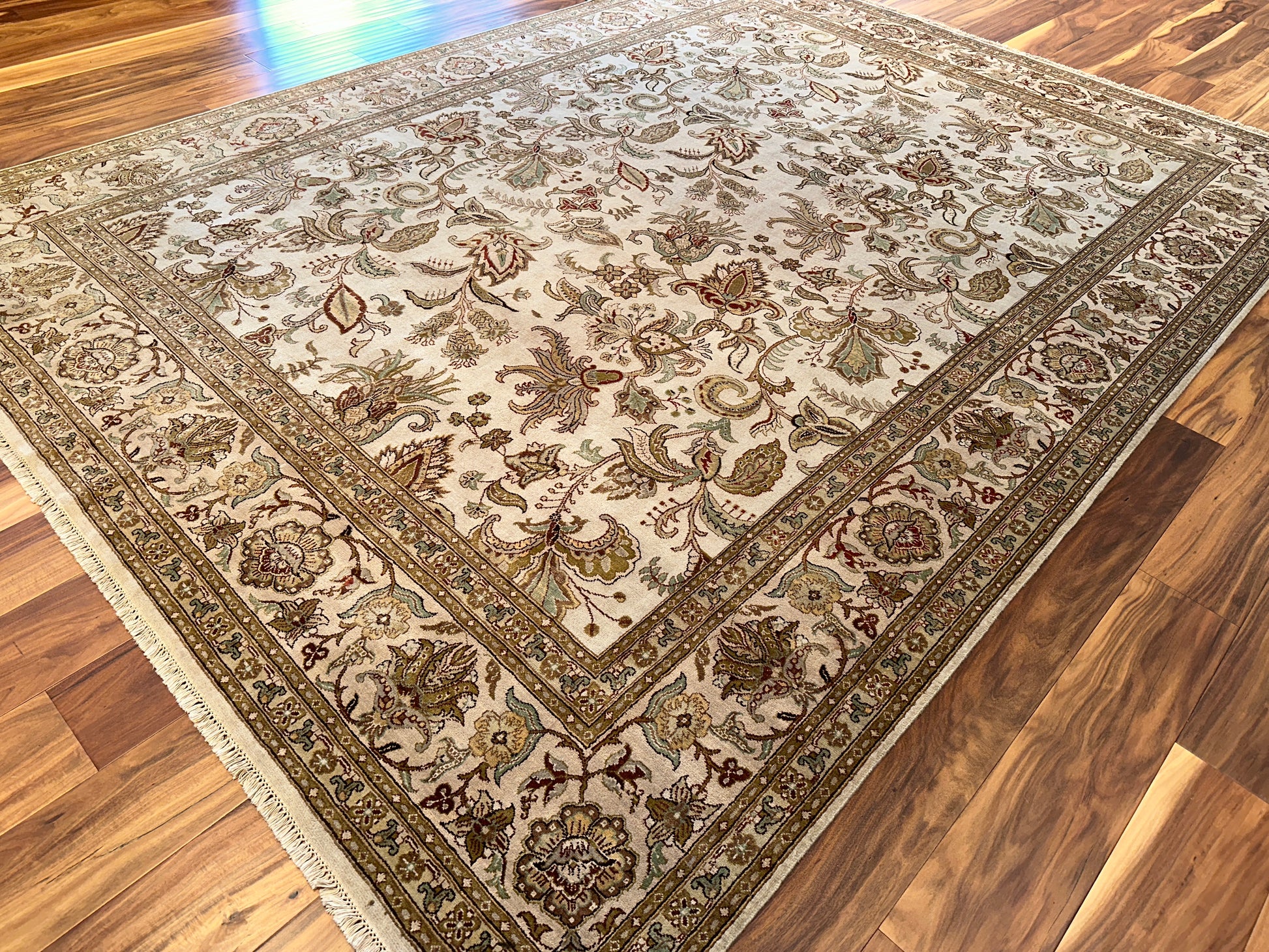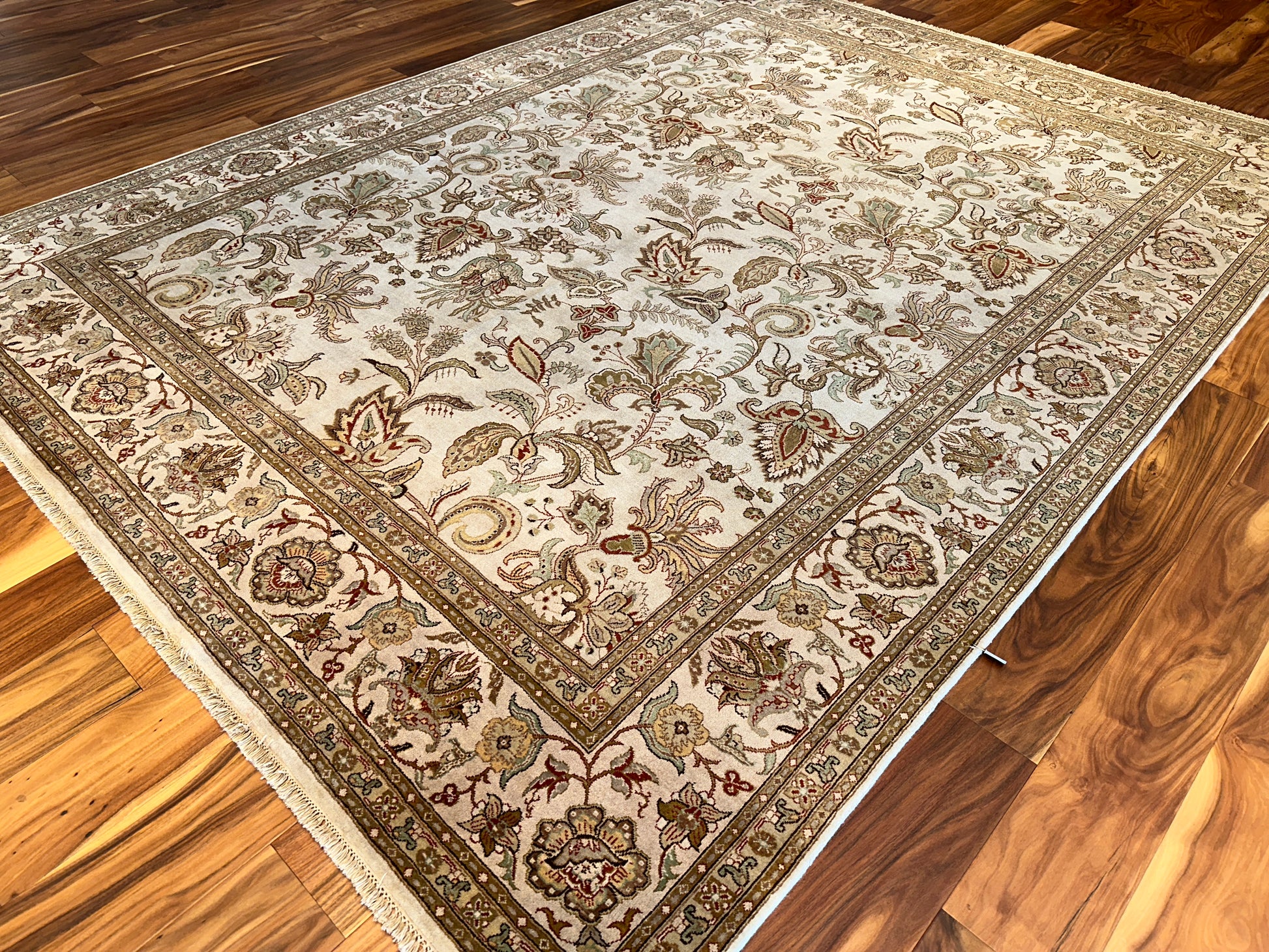 Delicate and refined, this hand-knotted rug features a soft ivory field woven with an intricate garden of scrolling leaves and floral motifs in gentle hues of sage, muted gold, and soft rust. The balanced border echoes the palette and movement of the field, creating a harmonious and serene composition. This rug brings an understated elegance to bedrooms, living rooms, or quiet sitting areas.