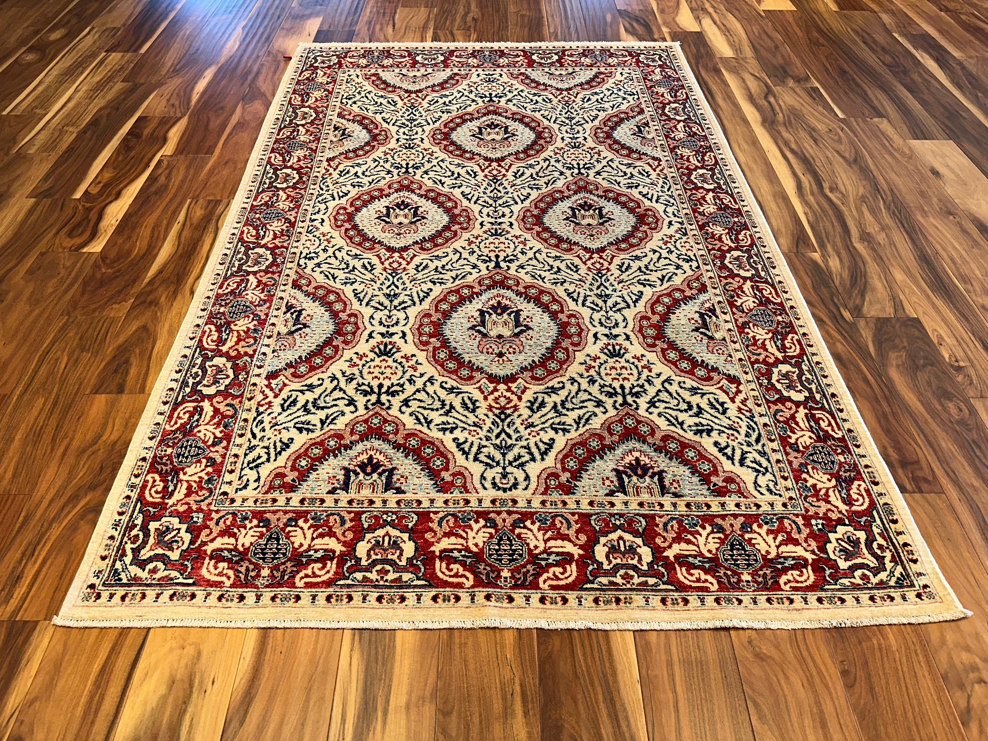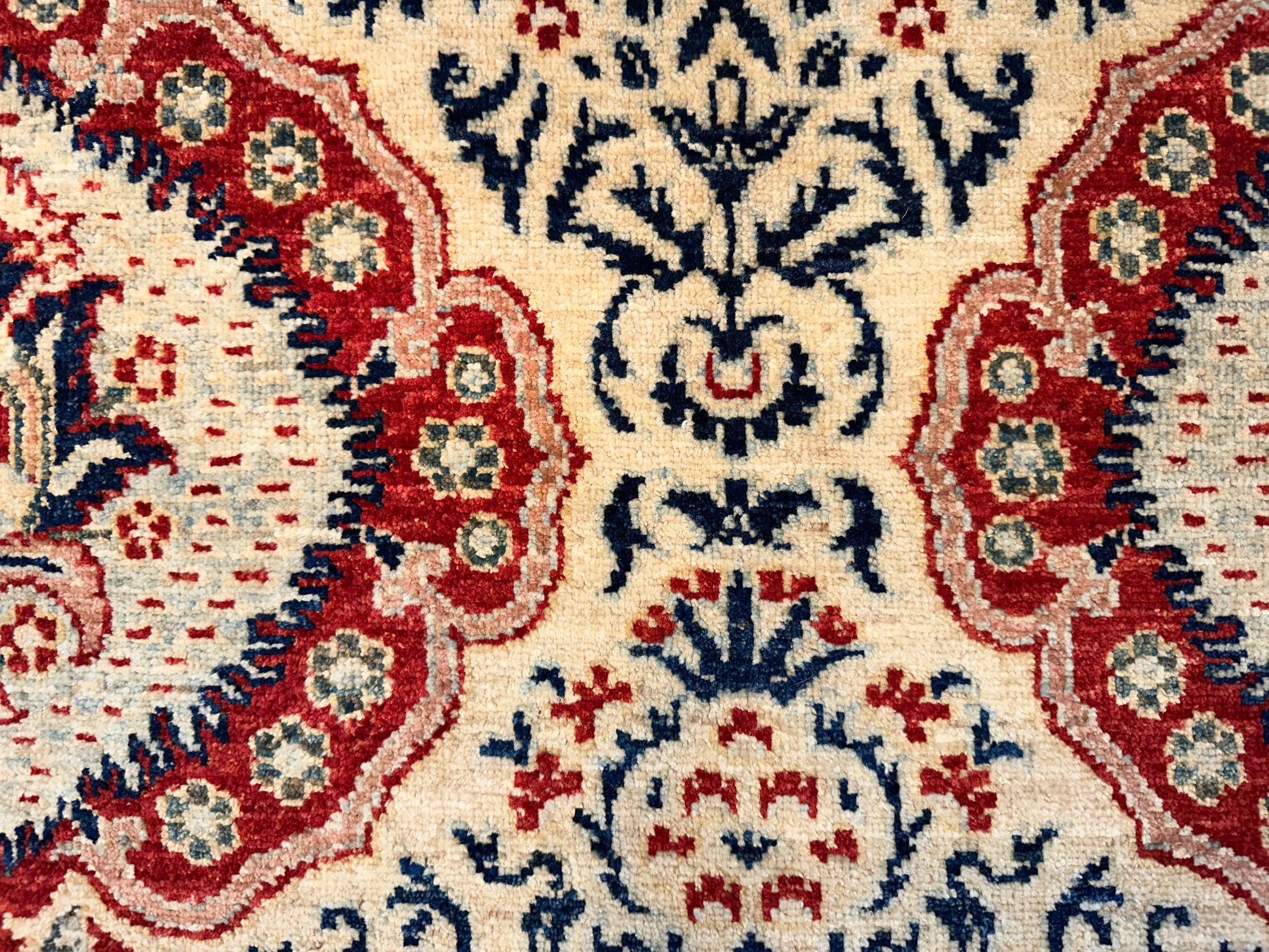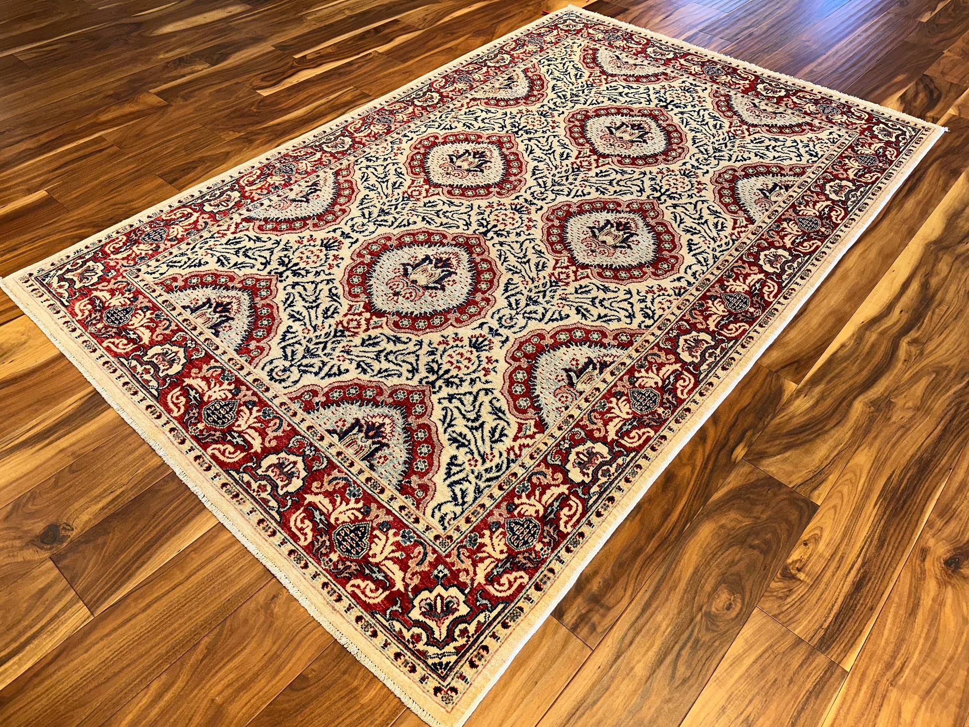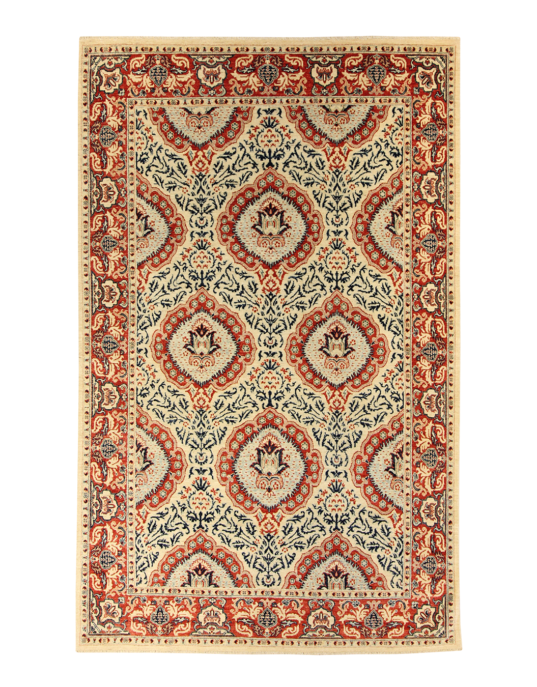 This elegant handmade rug showcases a refined allover medallion design with tulip-like floral motifs arranged in a repeating lattice pattern. The beige field is delicately balanced by warm terracotta medallions and detailed navy-blue vinework, all framed by a rich border of scrolling palmettes. Traditional yet lively, it brings a timeless sense of beauty and poise to any space.