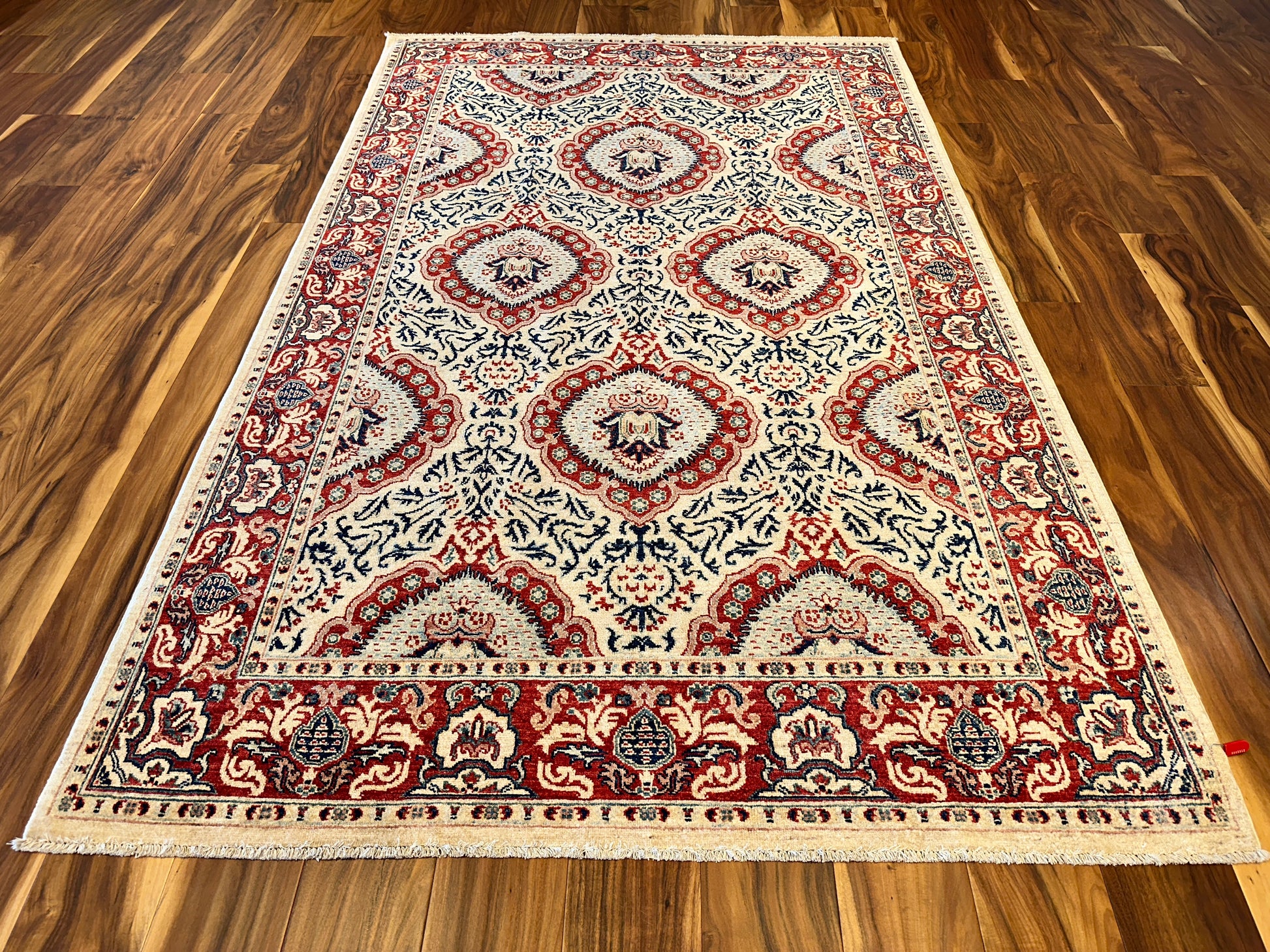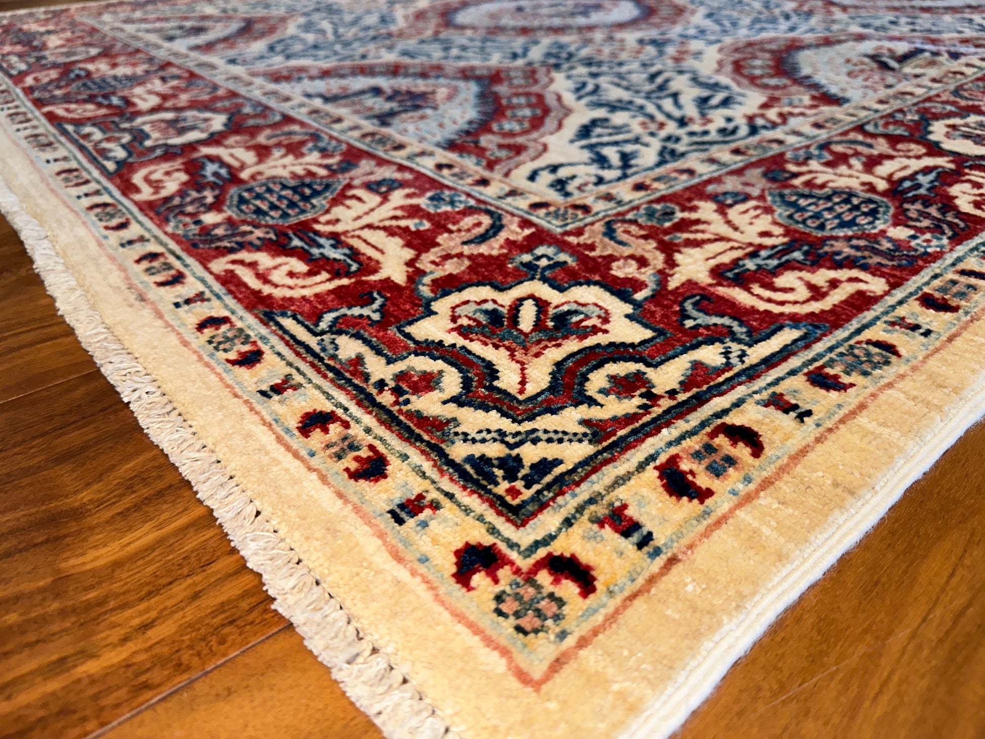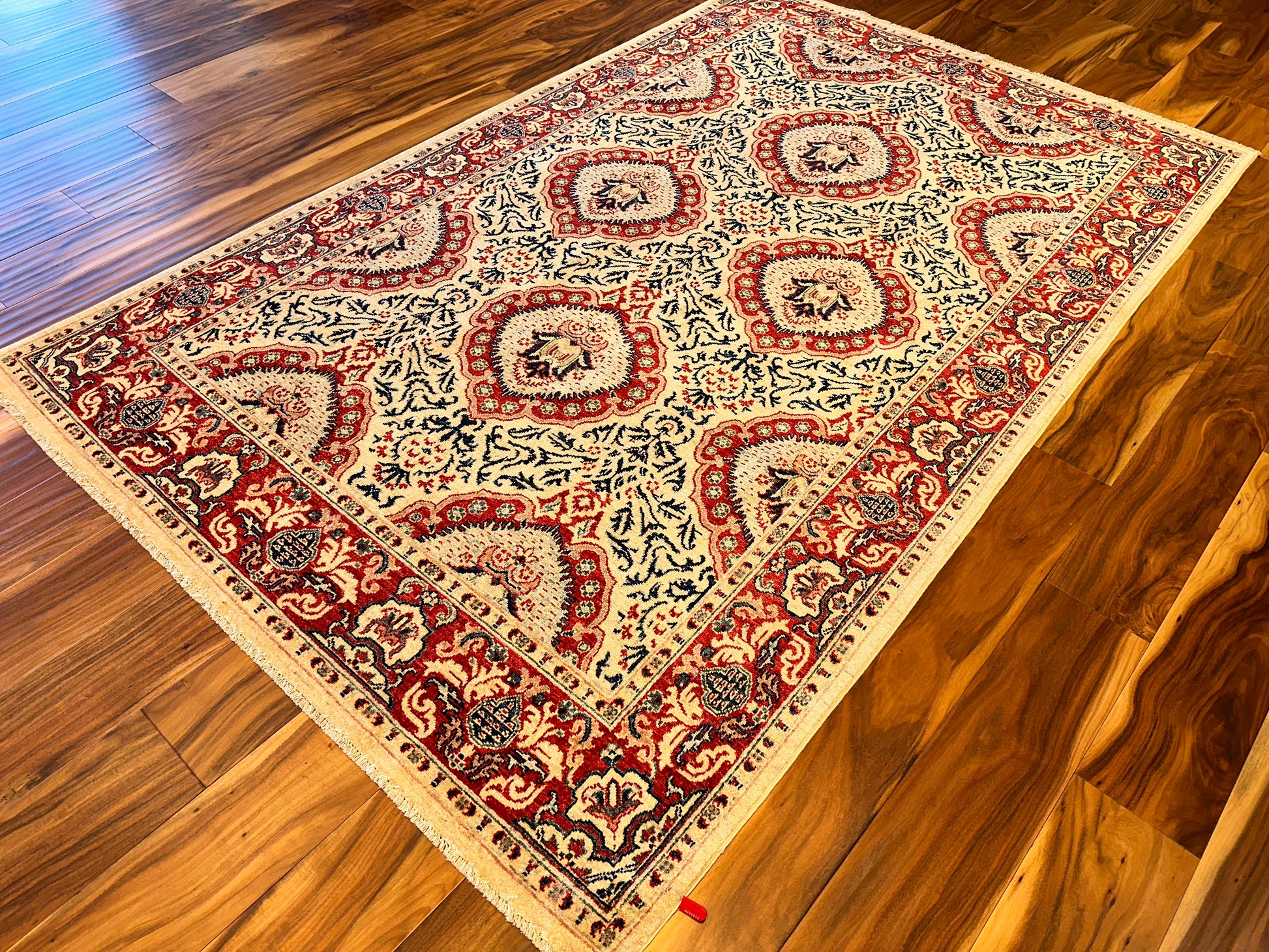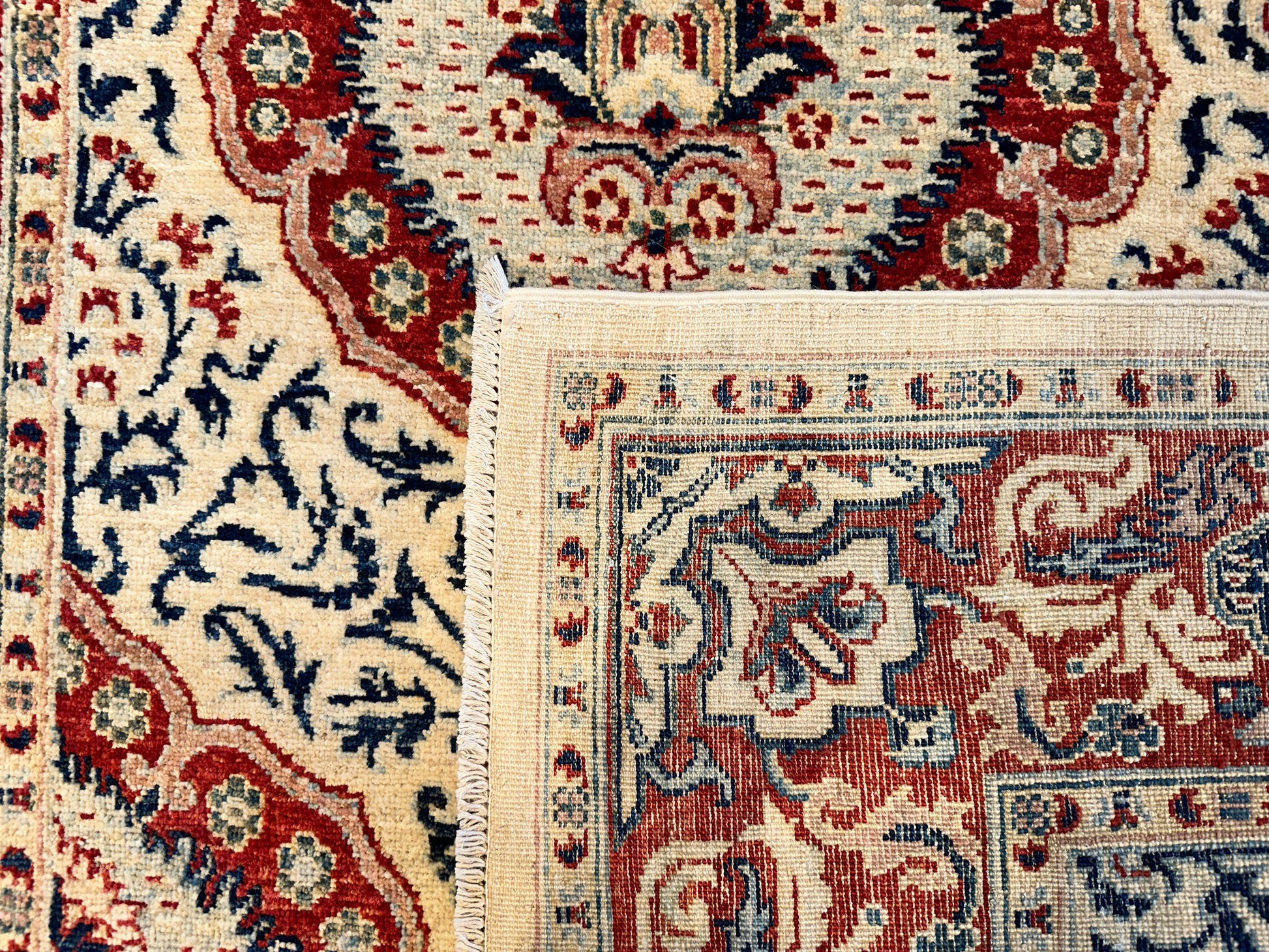 This elegant handmade rug showcases a refined allover medallion design with tulip-like floral motifs arranged in a repeating lattice pattern. The beige field is delicately balanced by warm terracotta medallions and detailed navy-blue vinework, all framed by a rich border of scrolling palmettes. Traditional yet lively, it brings a timeless sense of beauty and poise to any space.
