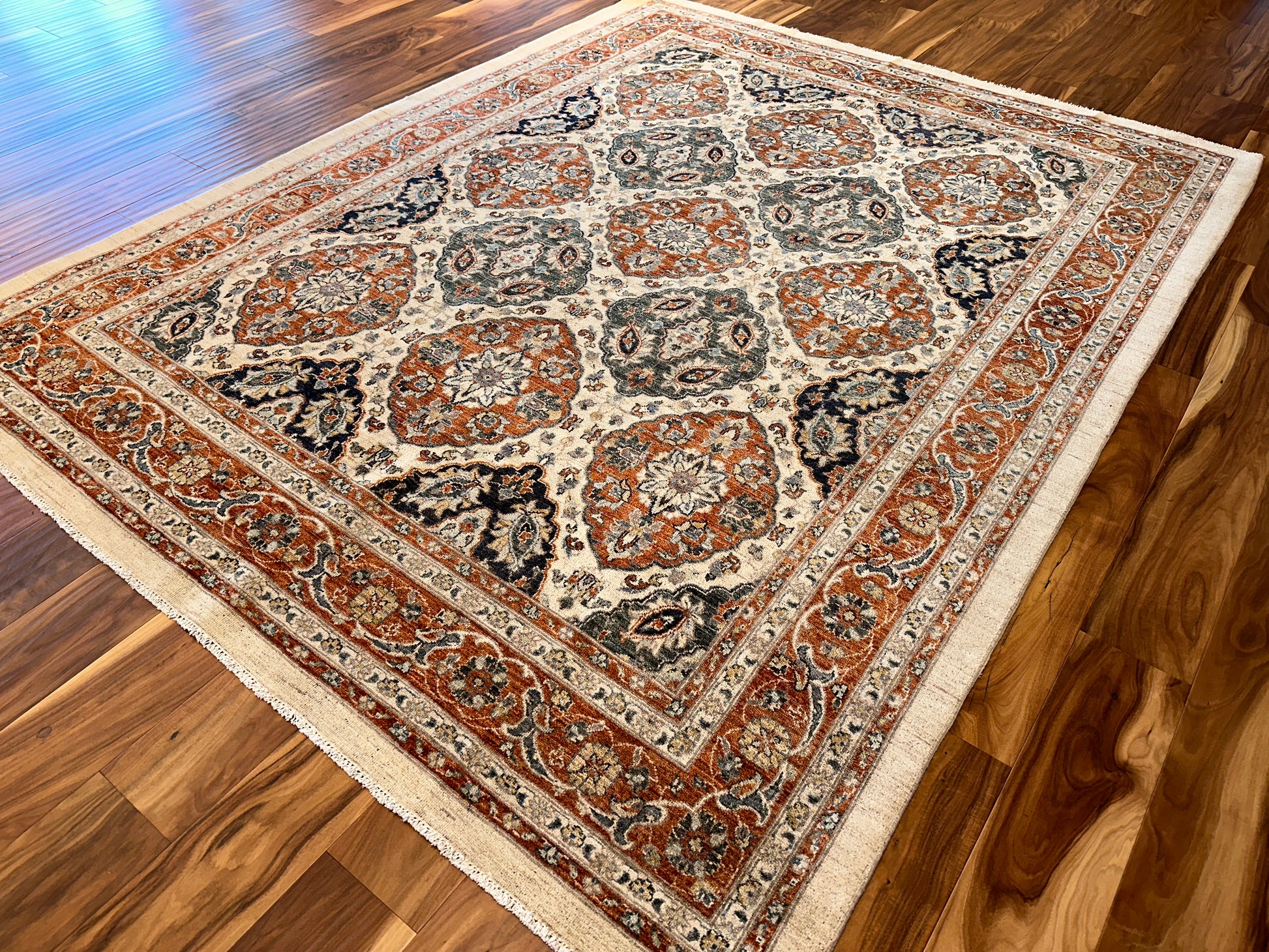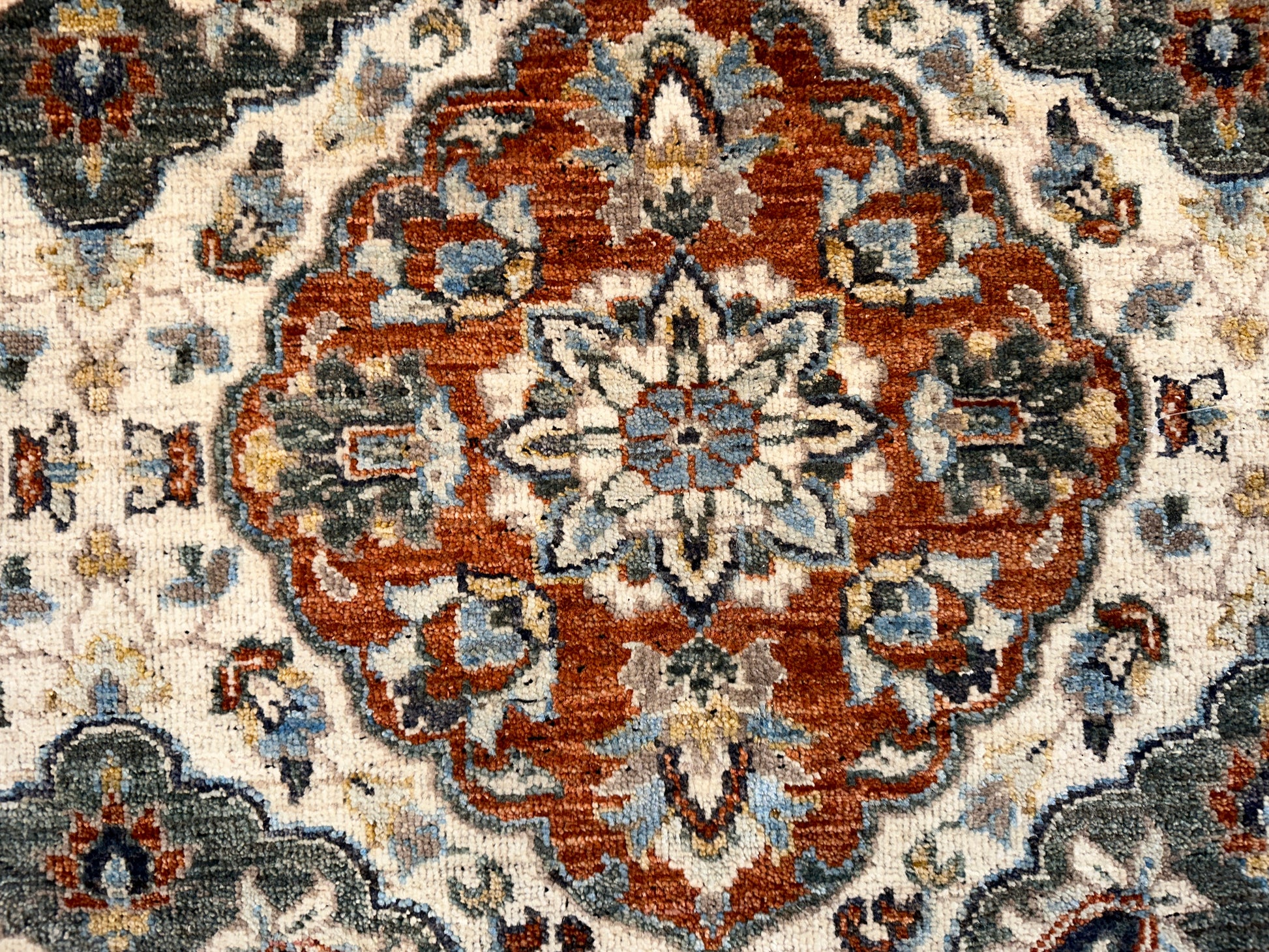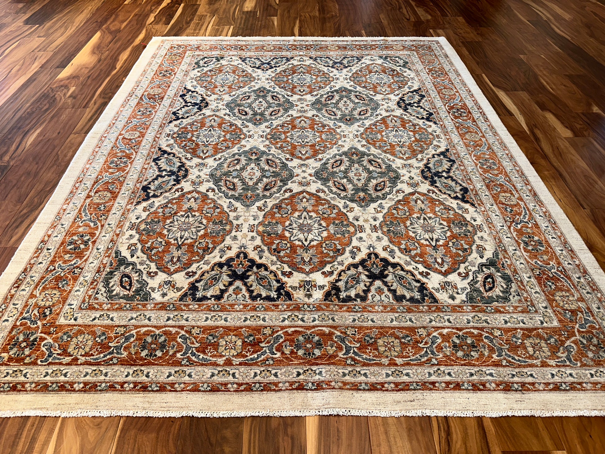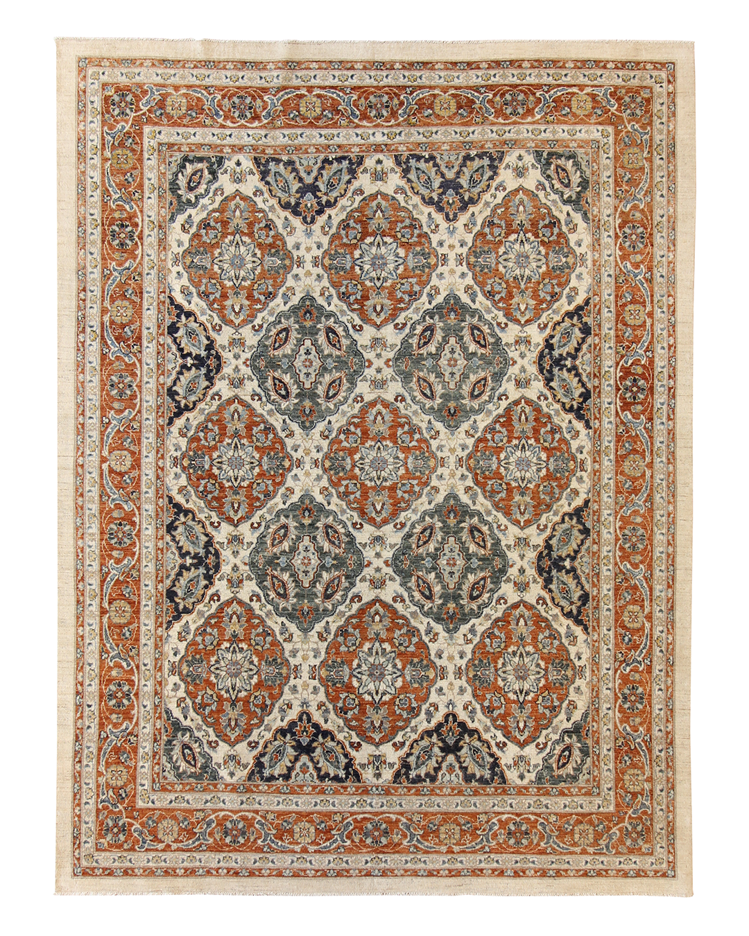 This striking rug features a dramatic medallion repeat pattern composed of soft slate blue, terracotta, and charcoal elements set against a luminous beige ground. The careful balance of tone and motif gives the rug a dignified yet welcoming appearance, with crisp floral outlines and layered borders adding richness without excess. It’s an elegant, well-proportioned piece that anchors a room with quiet depth and confidence.
