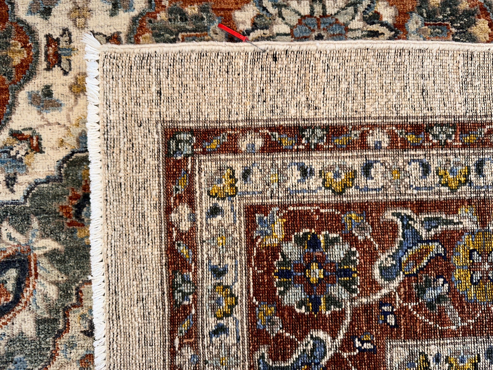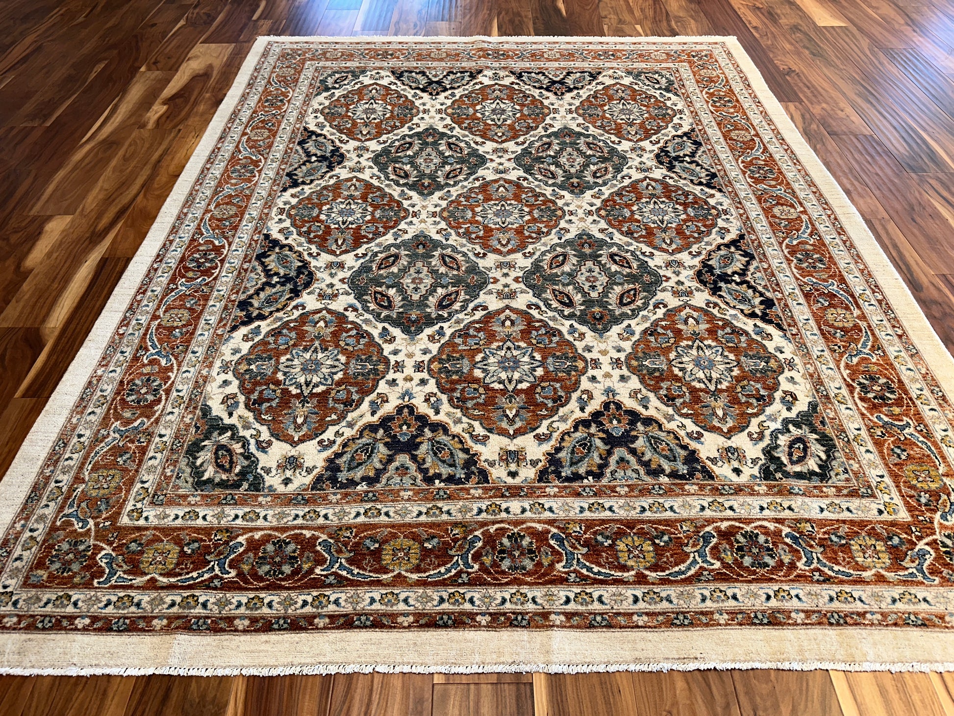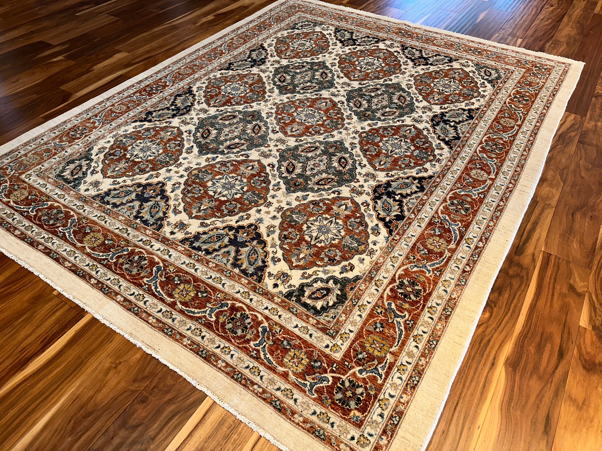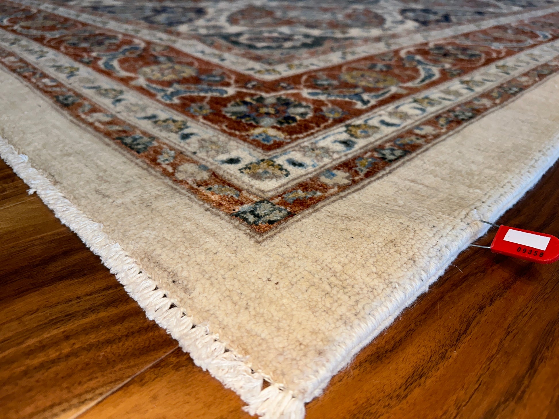 This striking rug features a dramatic medallion repeat pattern composed of soft slate blue, terracotta, and charcoal elements set against a luminous beige ground. The careful balance of tone and motif gives the rug a dignified yet welcoming appearance, with crisp floral outlines and layered borders adding richness without excess. It’s an elegant, well-proportioned piece that anchors a room with quiet depth and confidence.