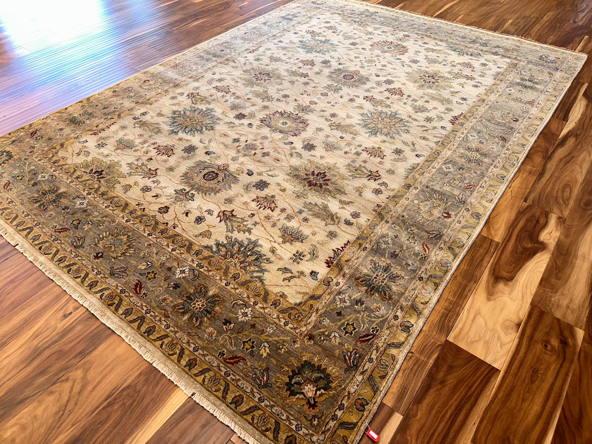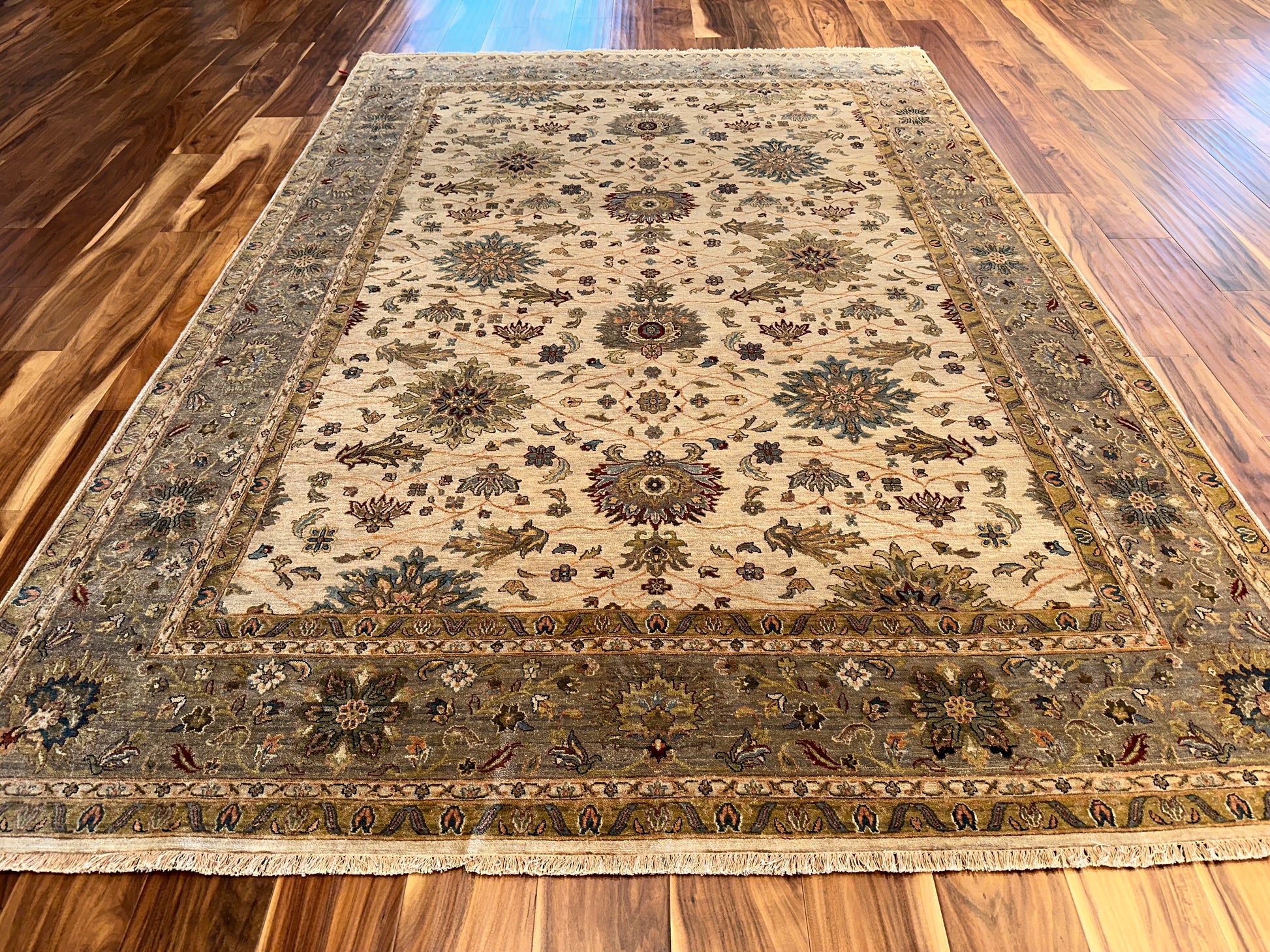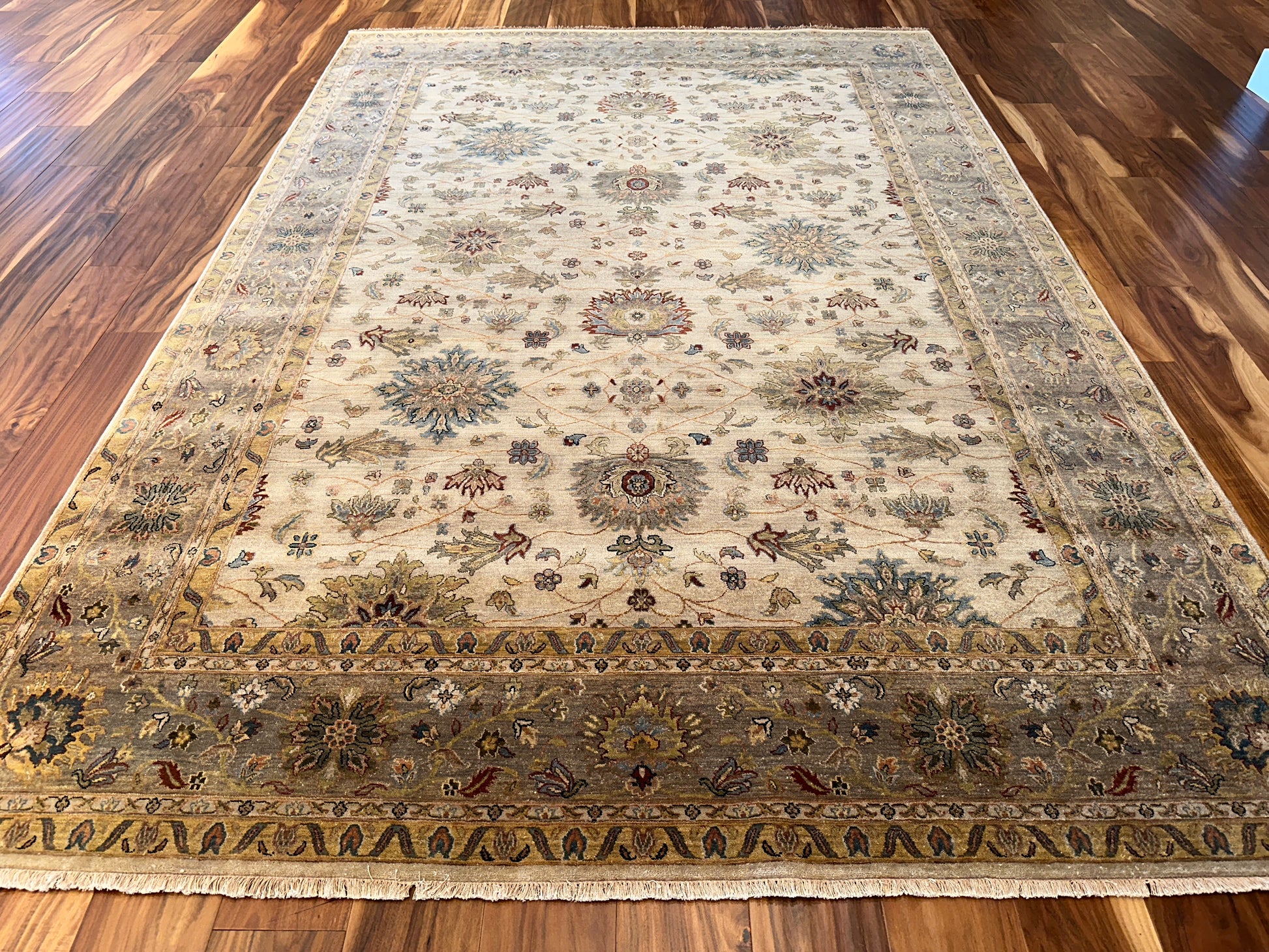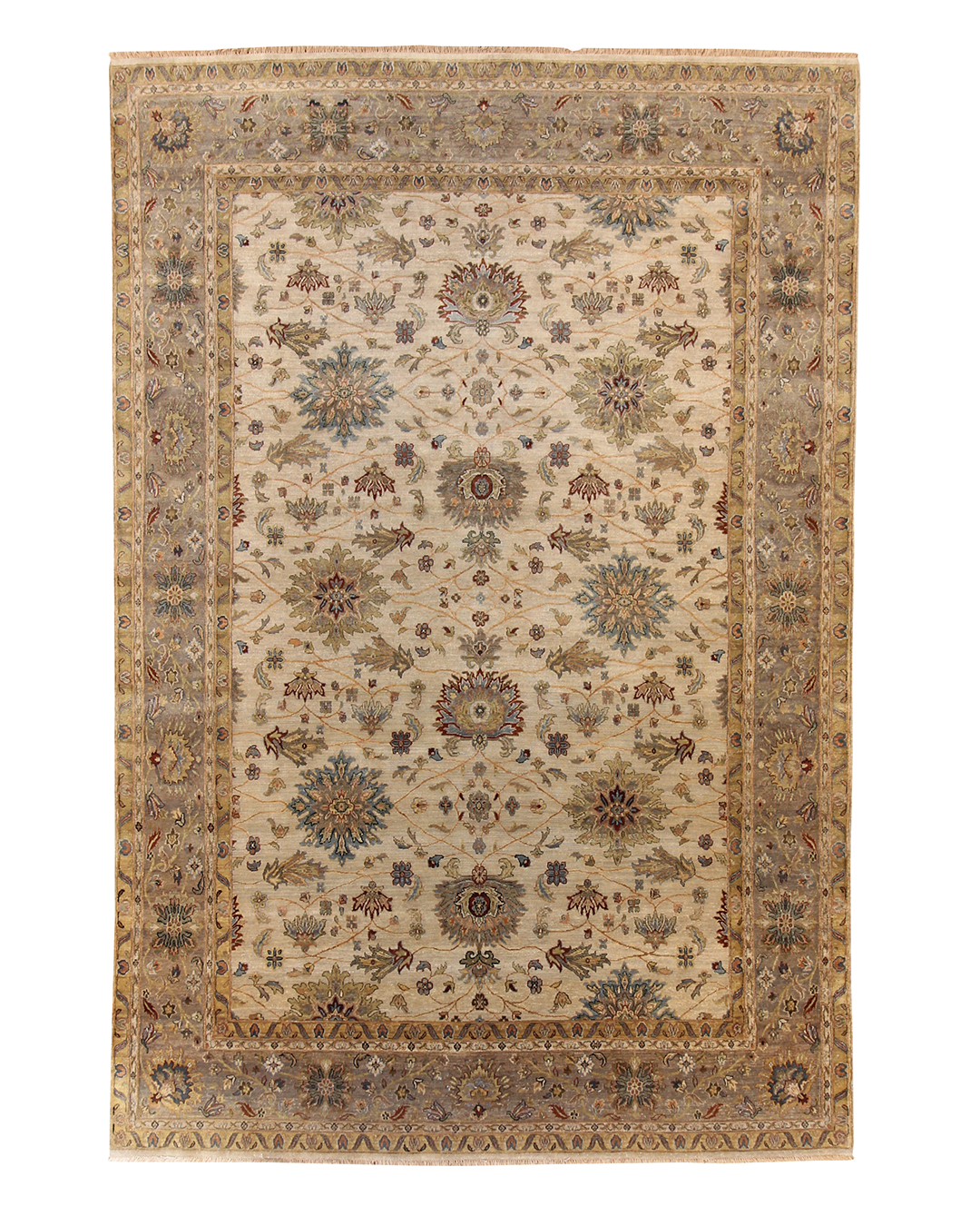 This elegant rug features a graceful allover floral design set against a soft beige field, with delicate vines, palmettes, and rosettes unfolding in a muted blend of sage, taupe, gold, and dusty blue. The intricate border, rendered in soft gray with warm golden undertones, frames the composition in a refined and harmonious palette. The overall effect is subtle yet richly detailed, ideal for creating a serene and timeless foundation in classic interiors.