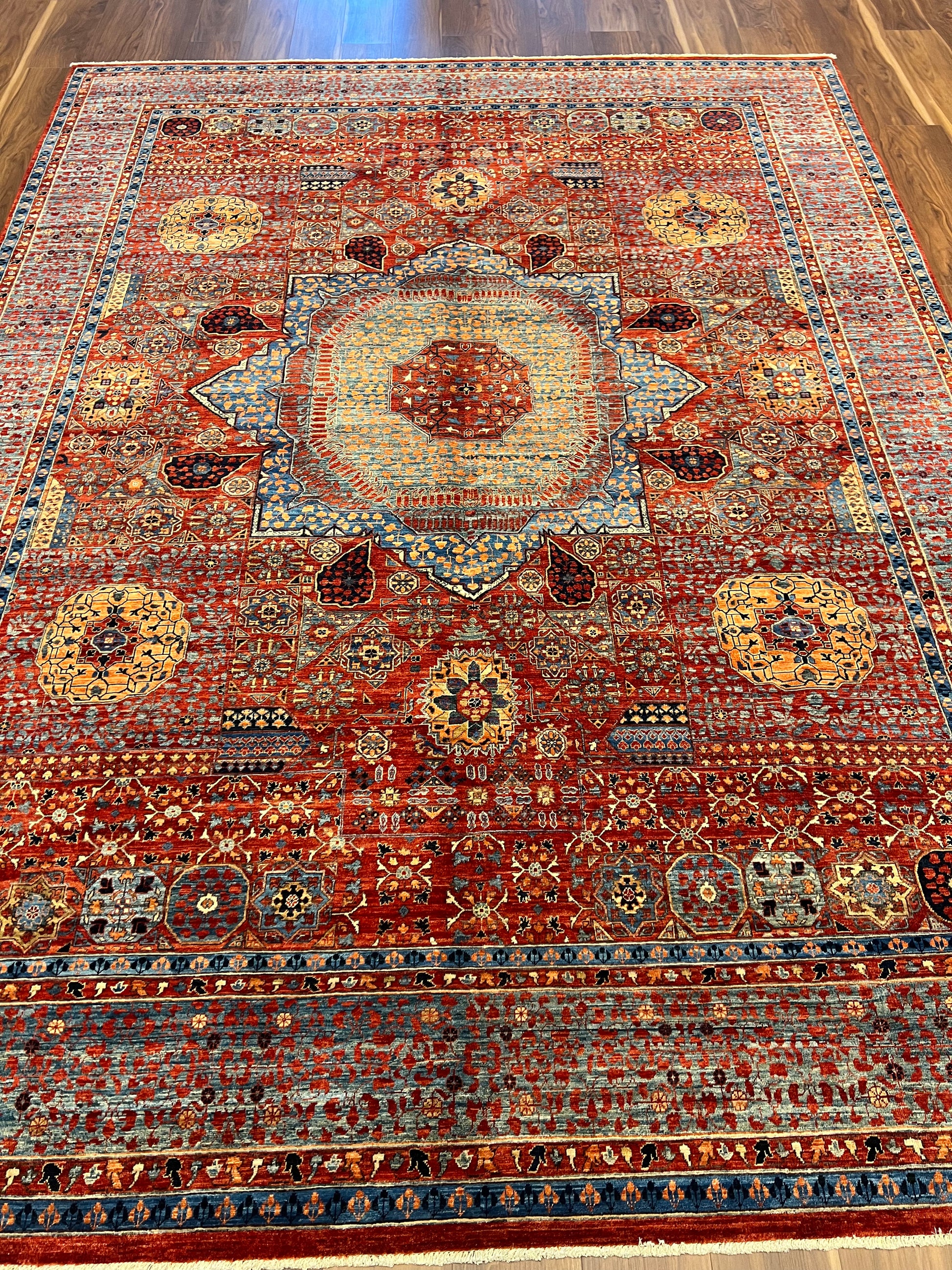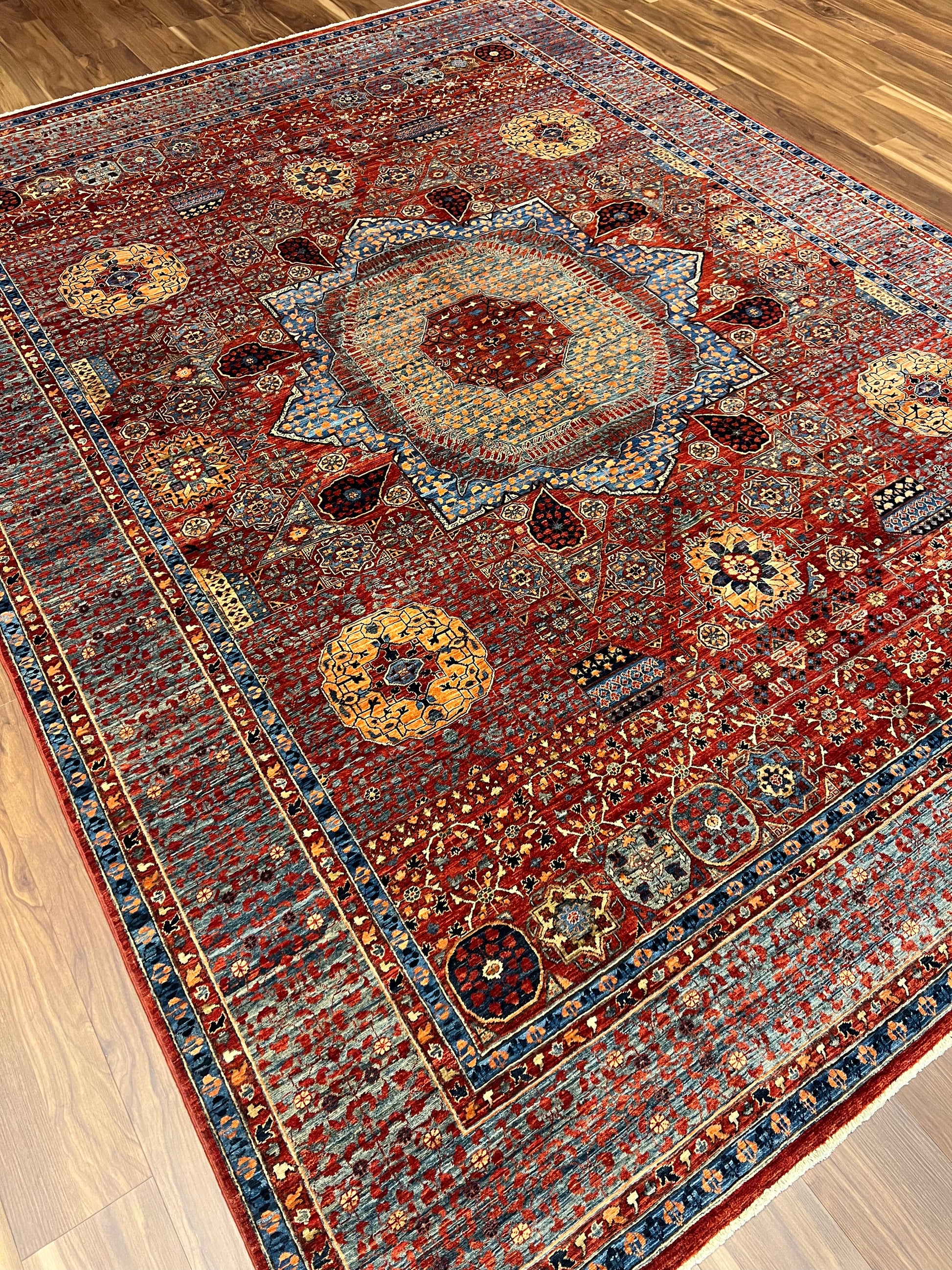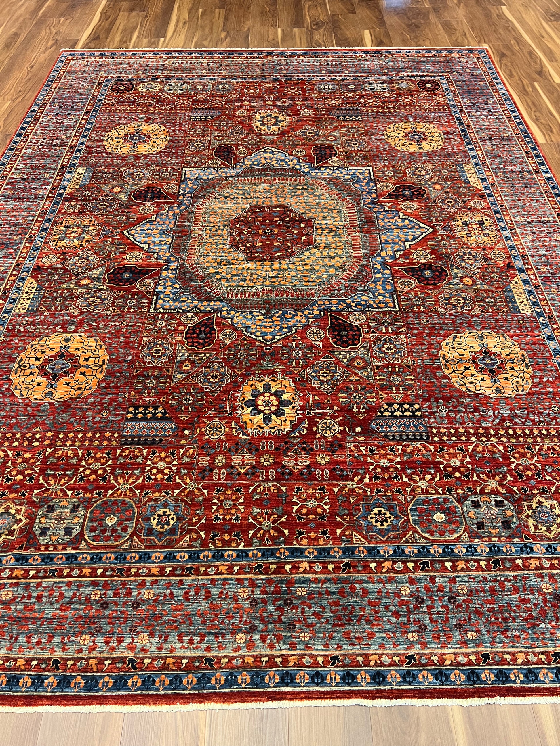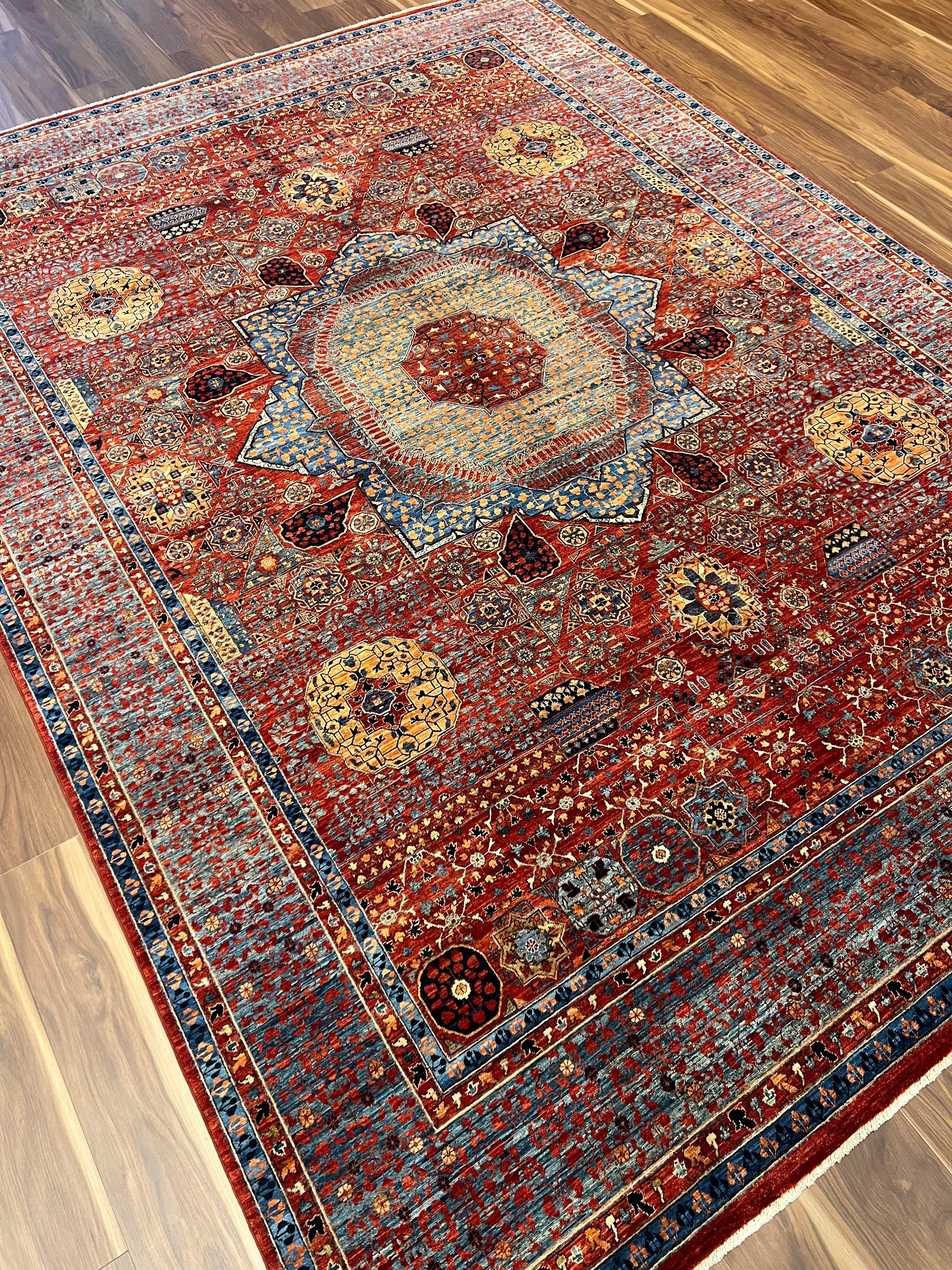This exquisite Sultanate Mamluk rug, crafted from the finest wool, displays a mesmerizing blend of rich red and blue hues, complemented by orange, beige, and gold accents. Its opulent design features intricate geometric and floral patterns that together form a harmonious symmetrical layout, evoking the grandeur of the Mamluk era. The detailed borders frame the central medallion, creating a captivating focal point. This rug is a testament to the skilled artisans' dedication to traditional weaving methods, offering both durability and timeless beauty.