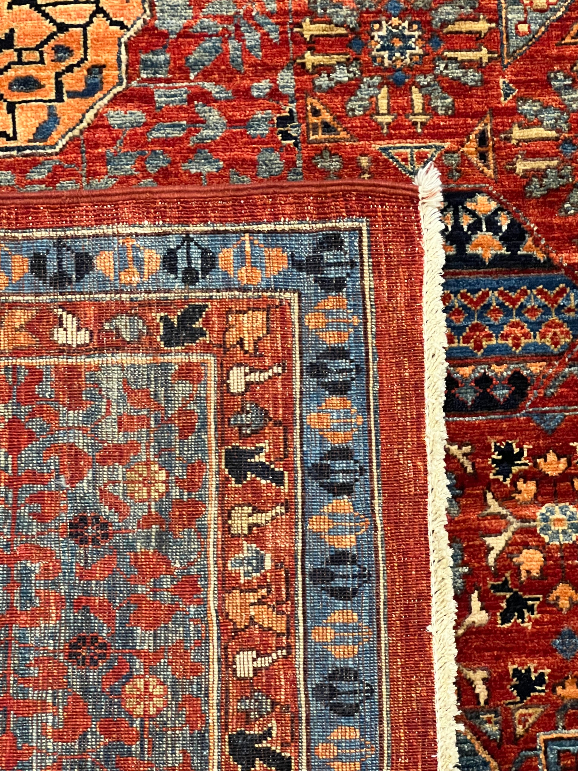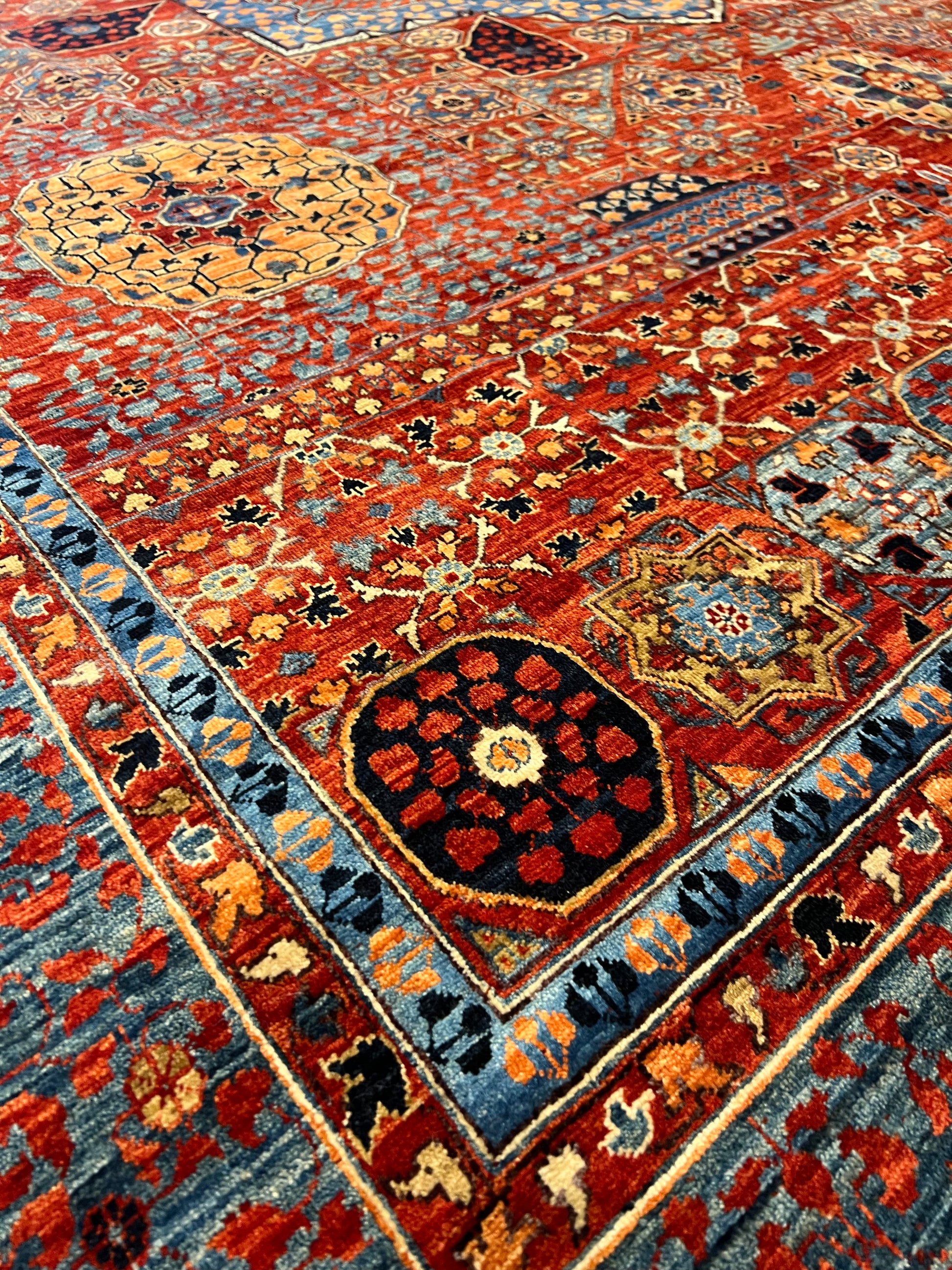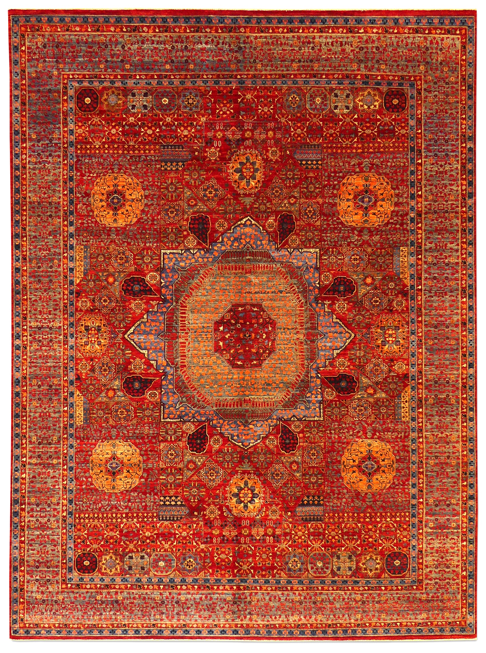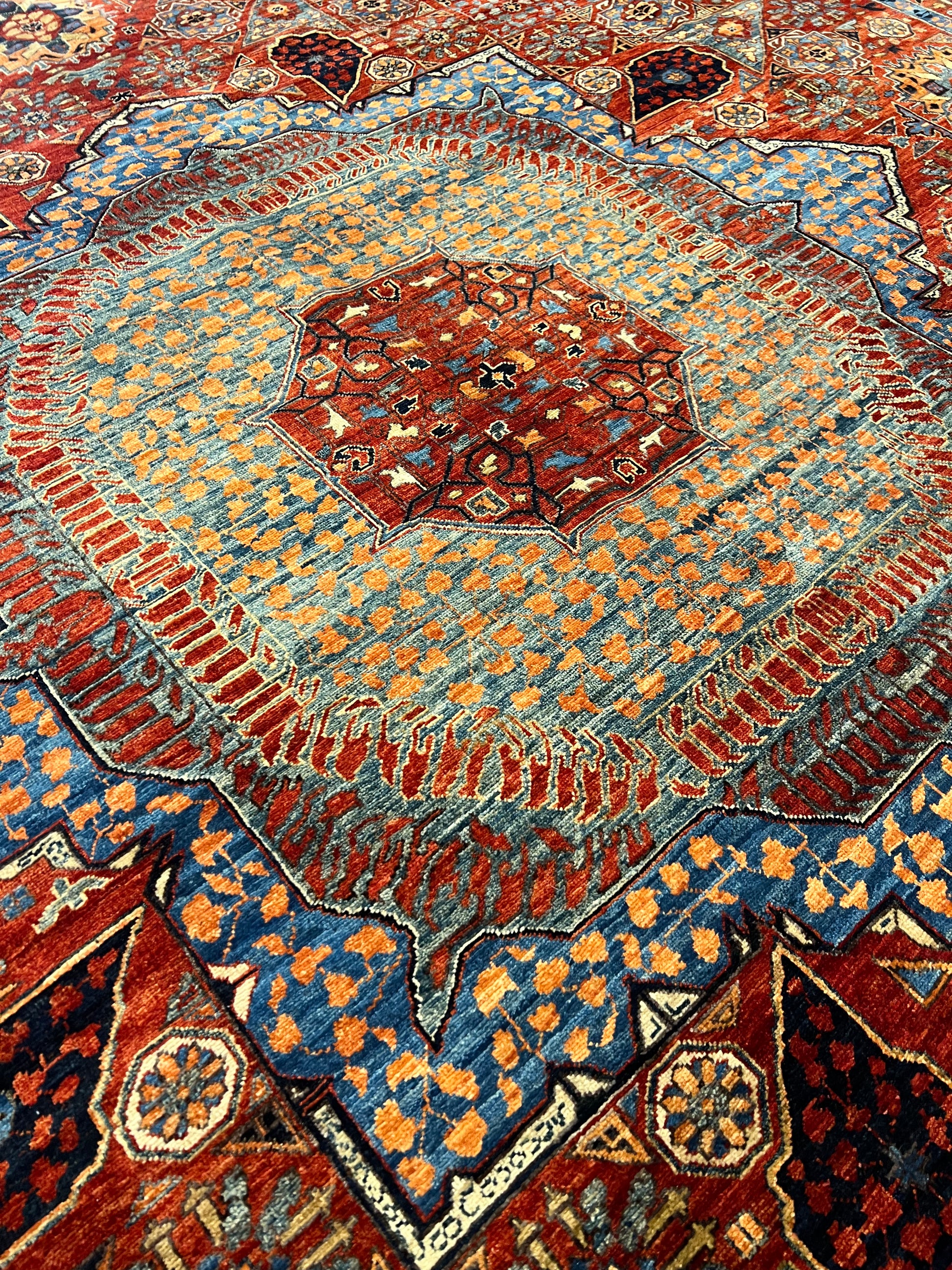 This exquisite Sultanate Mamluk rug, crafted from the finest wool, displays a mesmerizing blend of rich red and blue hues, complemented by orange, beige, and gold accents. Its opulent design features intricate geometric and floral patterns that together form a harmonious symmetrical layout, evoking the grandeur of the Mamluk era. The detailed borders frame the central medallion, creating a captivating focal point. This rug is a testament to the skilled artisans' dedication to traditional weaving methods, offering both durability and timeless beauty.