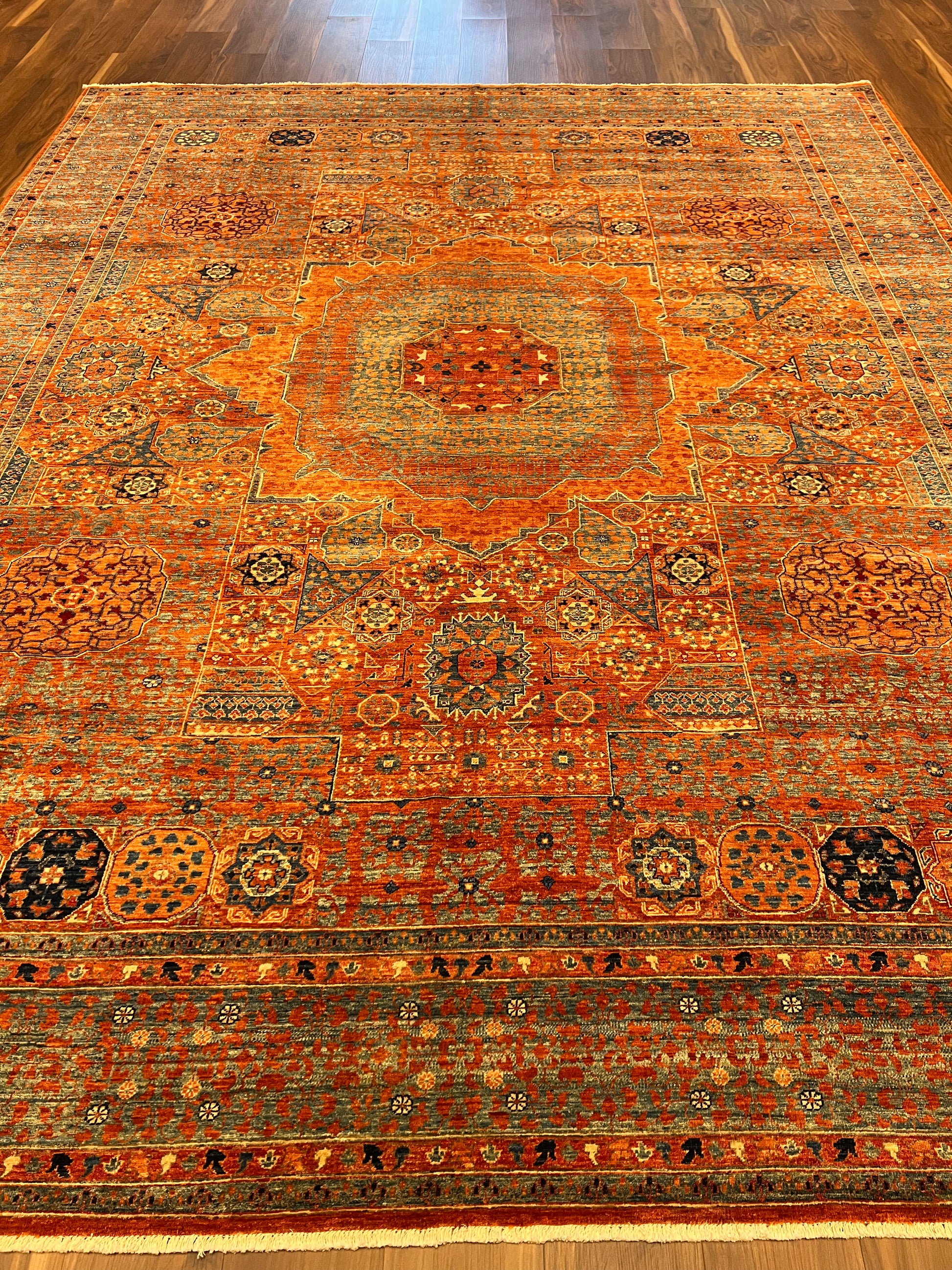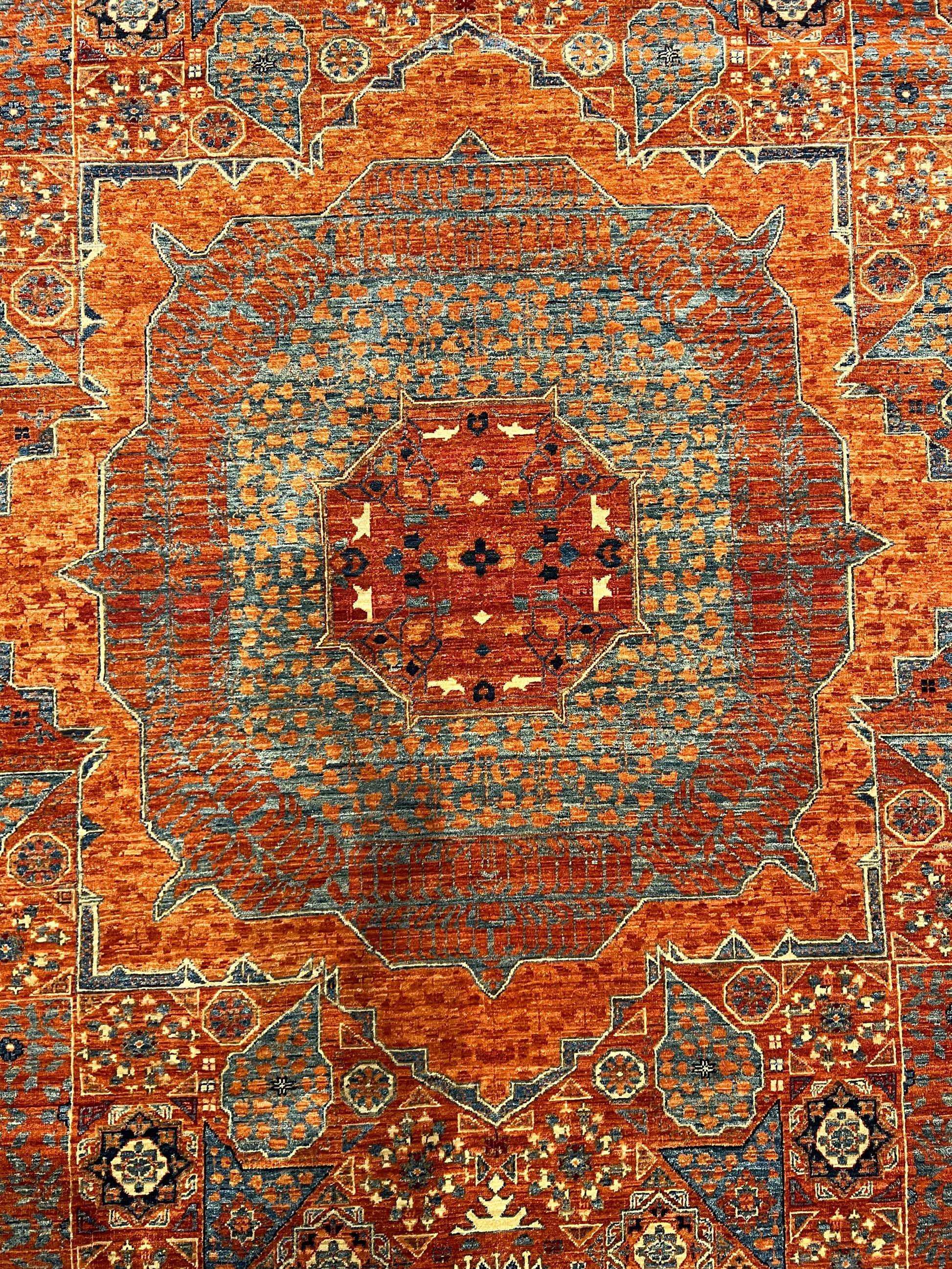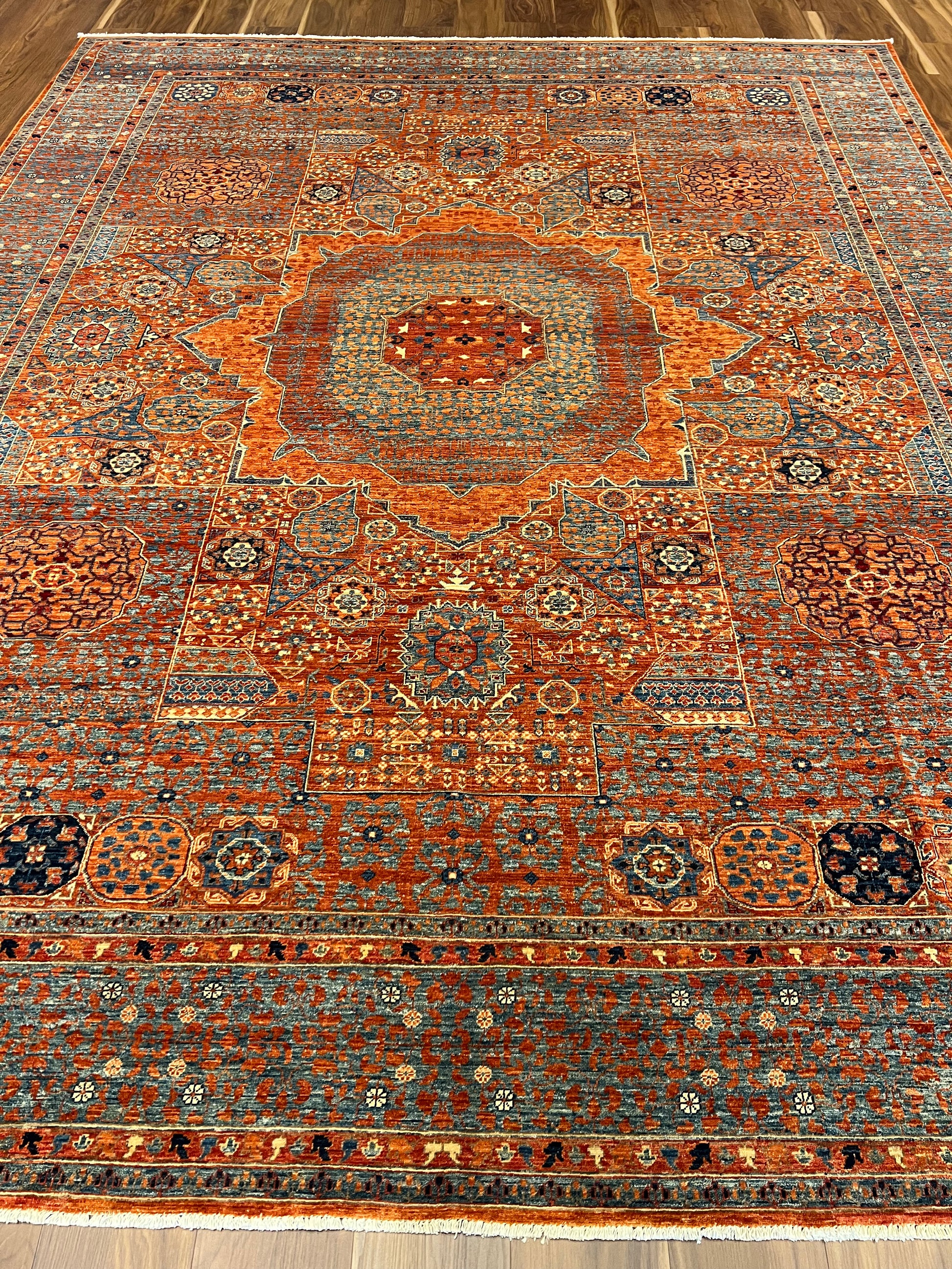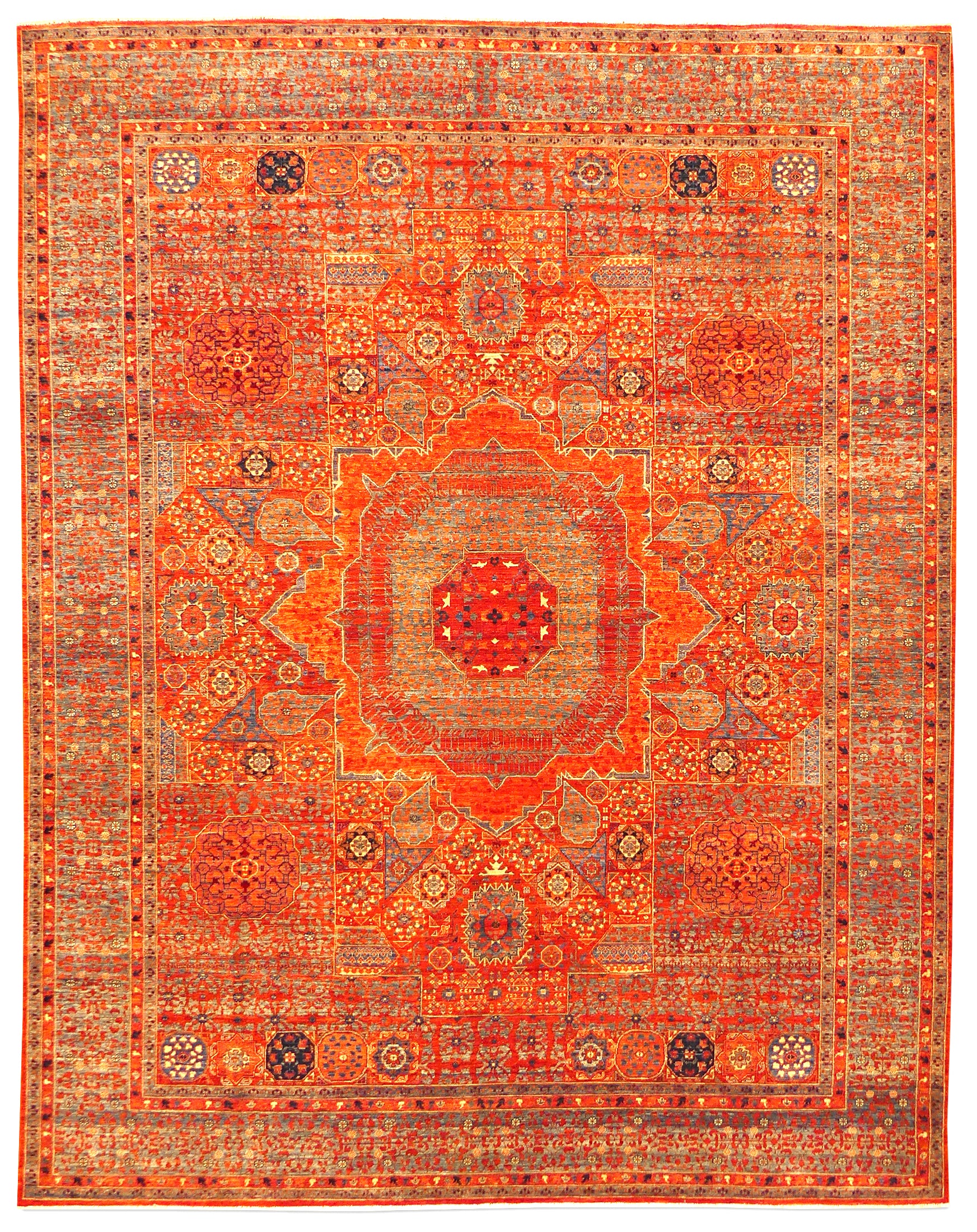 The Sultanate Mamluk wool rug is a masterful creation imbued with history, featuring a complex interplay of intricate geometric patterns and medallions. The artisanship exemplifies traditional weaving techniques, resulting in a tapestry of rich, warm tones that command attention and exude a regal presence. Its robust construction promises enduring beauty and cultural reverence, suitable for both contemporary and classic interiors.