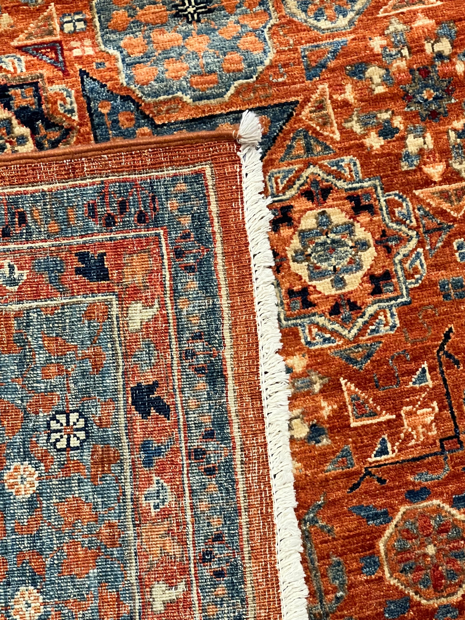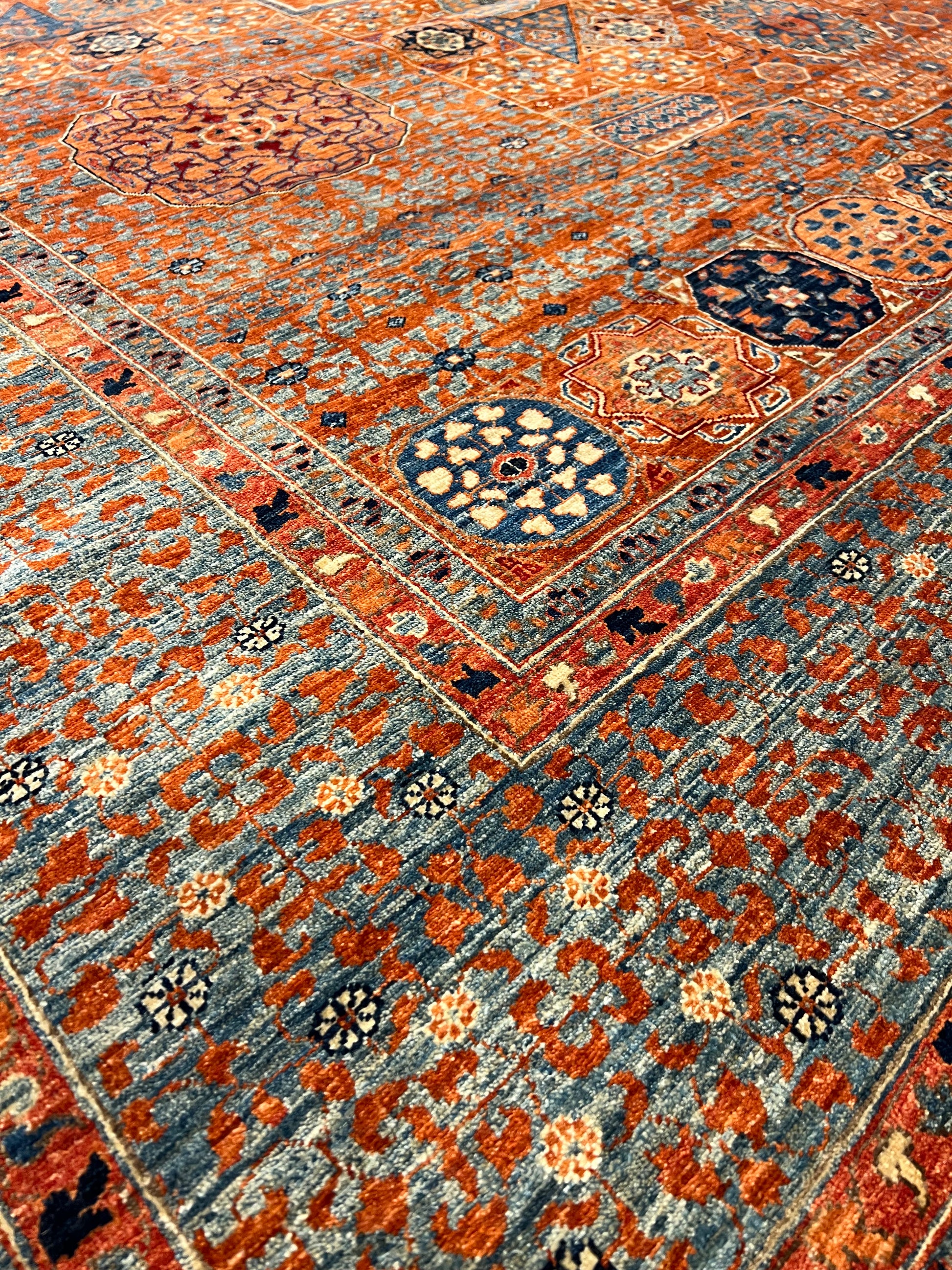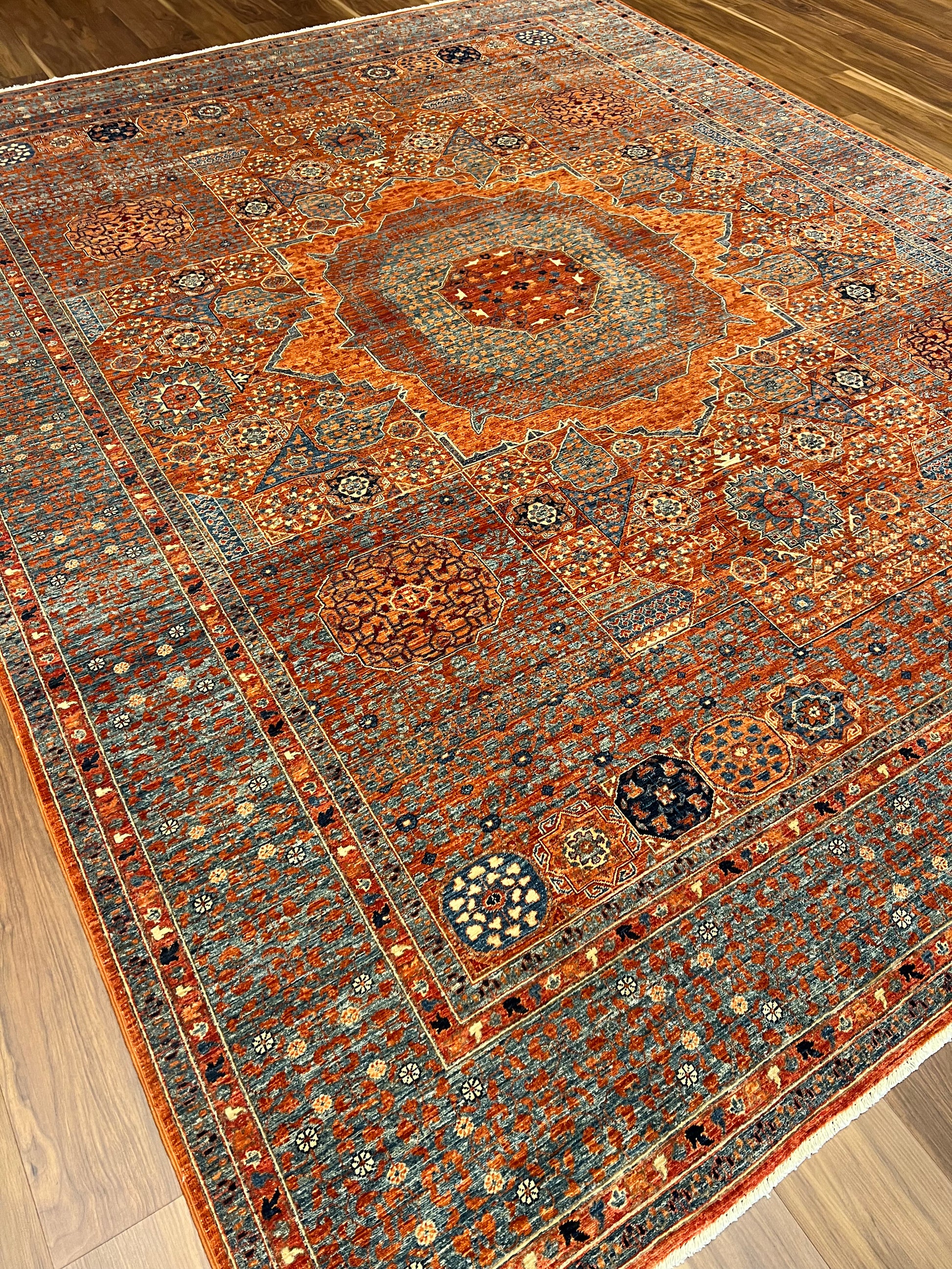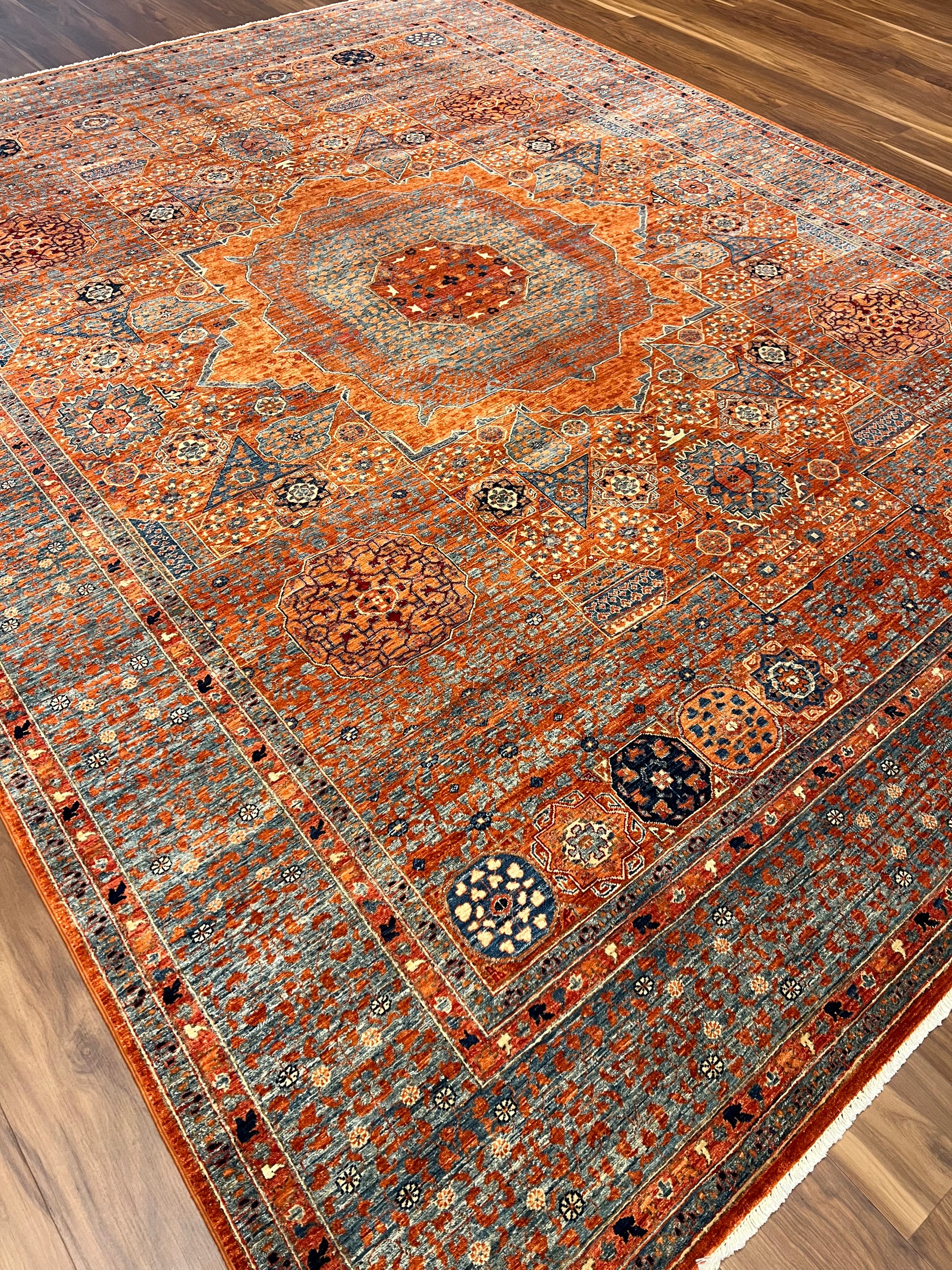 The Sultanate Mamluk wool rug is a masterful creation imbued with history, featuring a complex interplay of intricate geometric patterns and medallions. The artisanship exemplifies traditional weaving techniques, resulting in a tapestry of rich, warm tones that command attention and exude a regal presence. Its robust construction promises enduring beauty and cultural reverence, suitable for both contemporary and classic interiors.