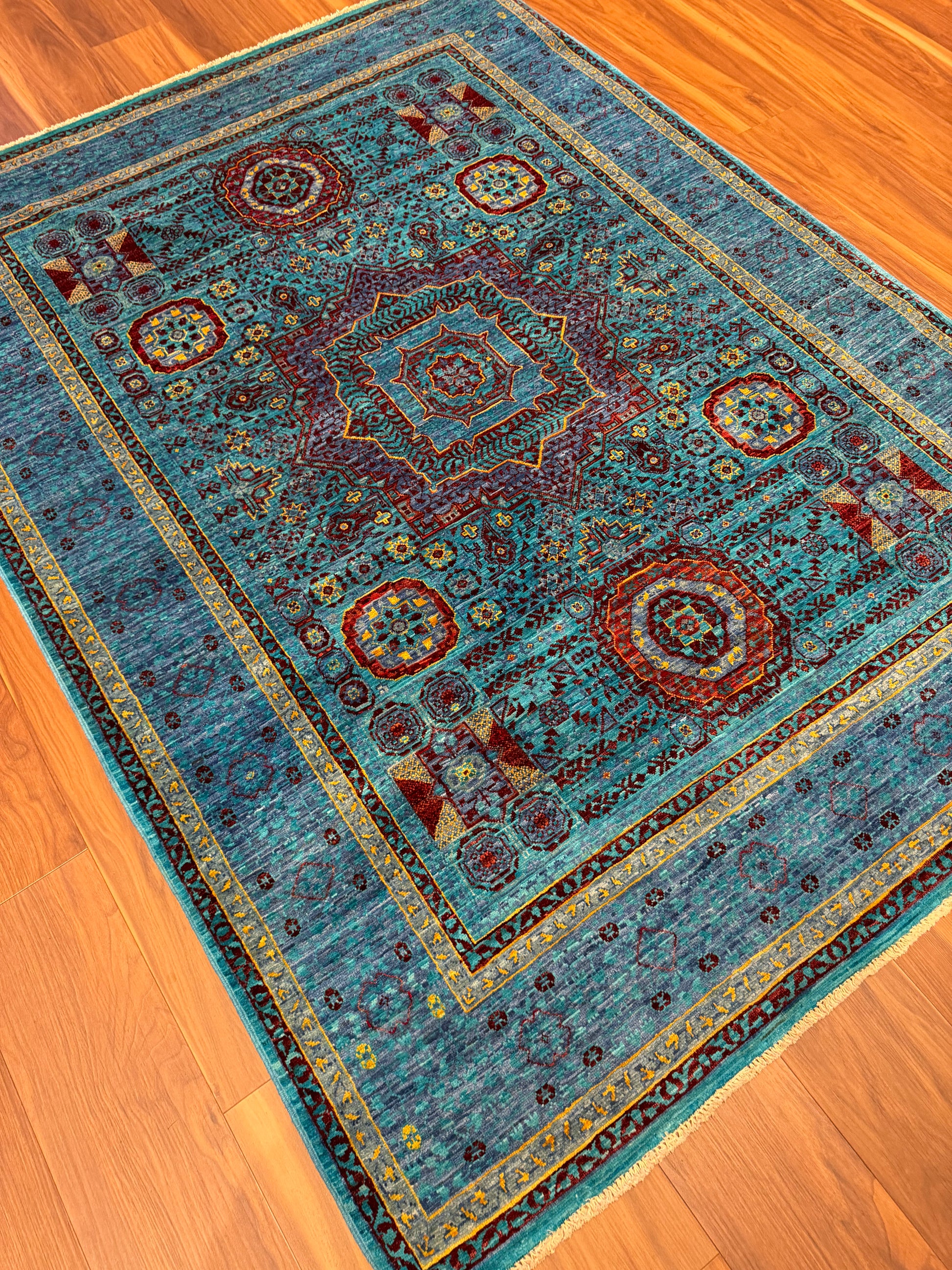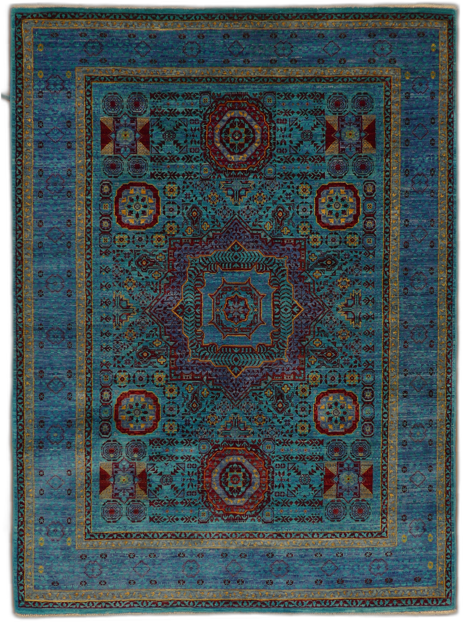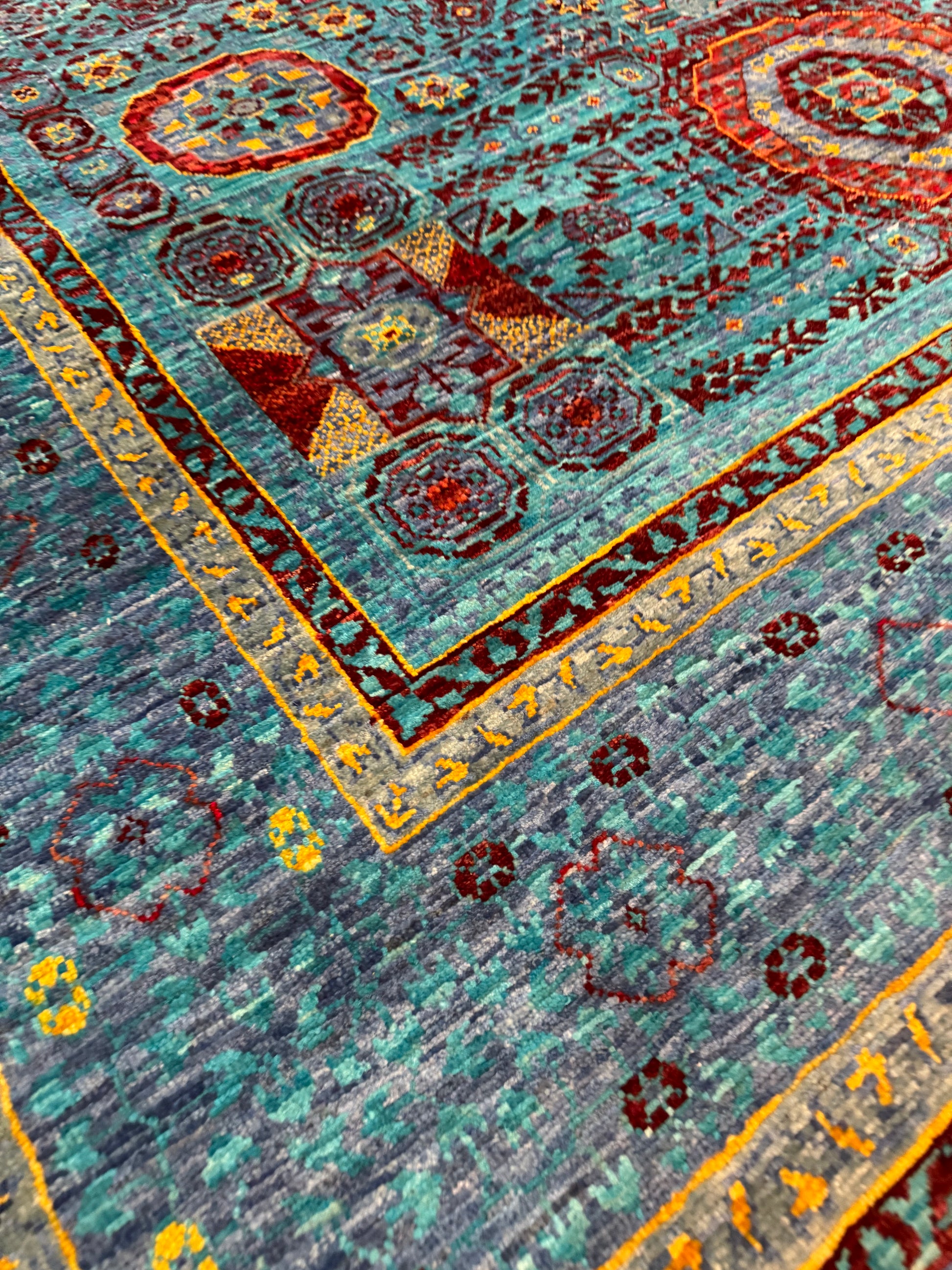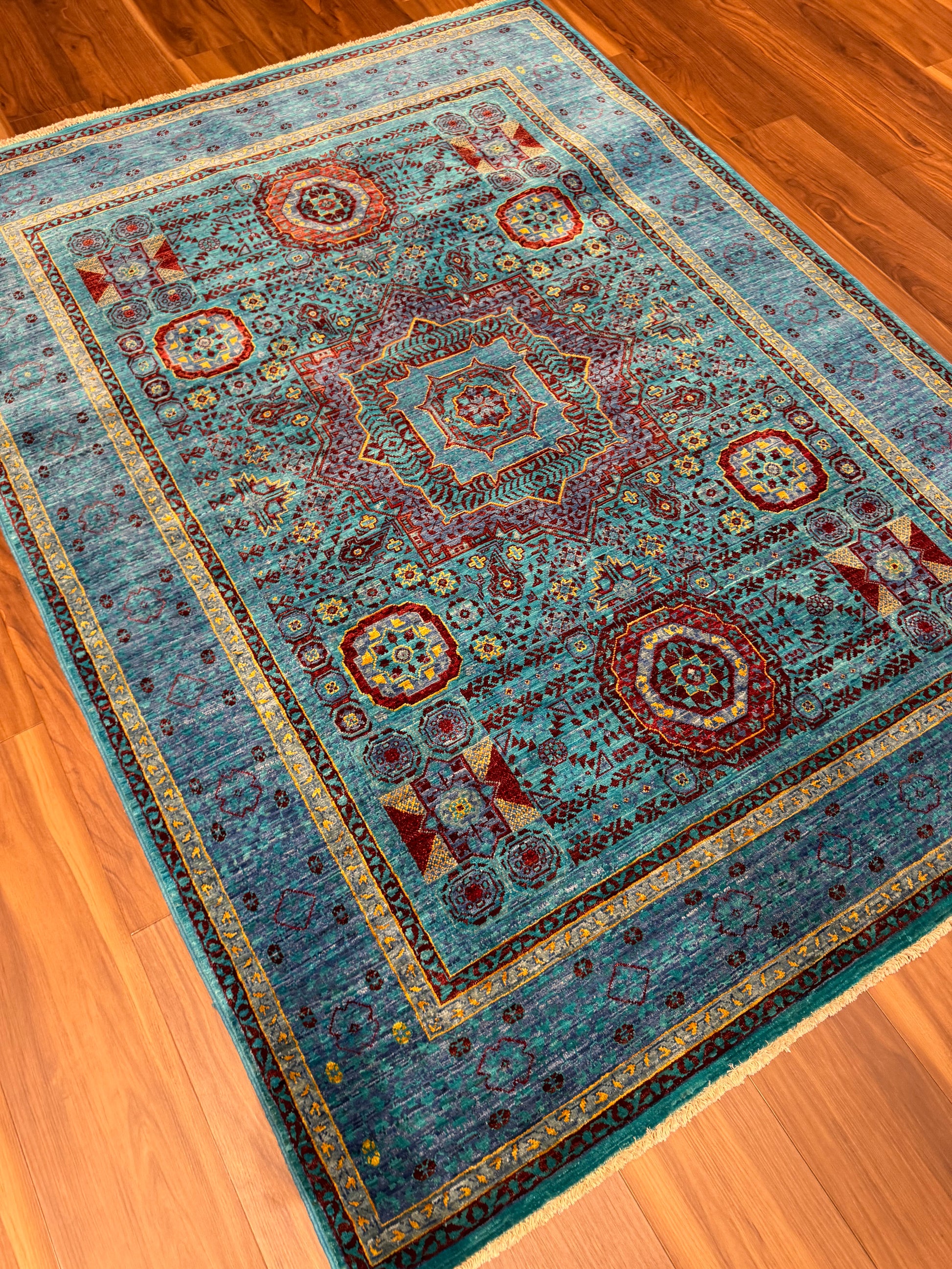 The Sultanate Mamluk rug exudes historical elegance with its intricate geometric and medallion design. This piece, made from the finest wool, showcases a rich tapestry of deep blues and reds, accented with teal, creating a mesmerizing effect that echoes the grandeur of Mamluk Sultanate artistry. With its refined symmetry and ornate border detail, it brings a regal presence to any room.