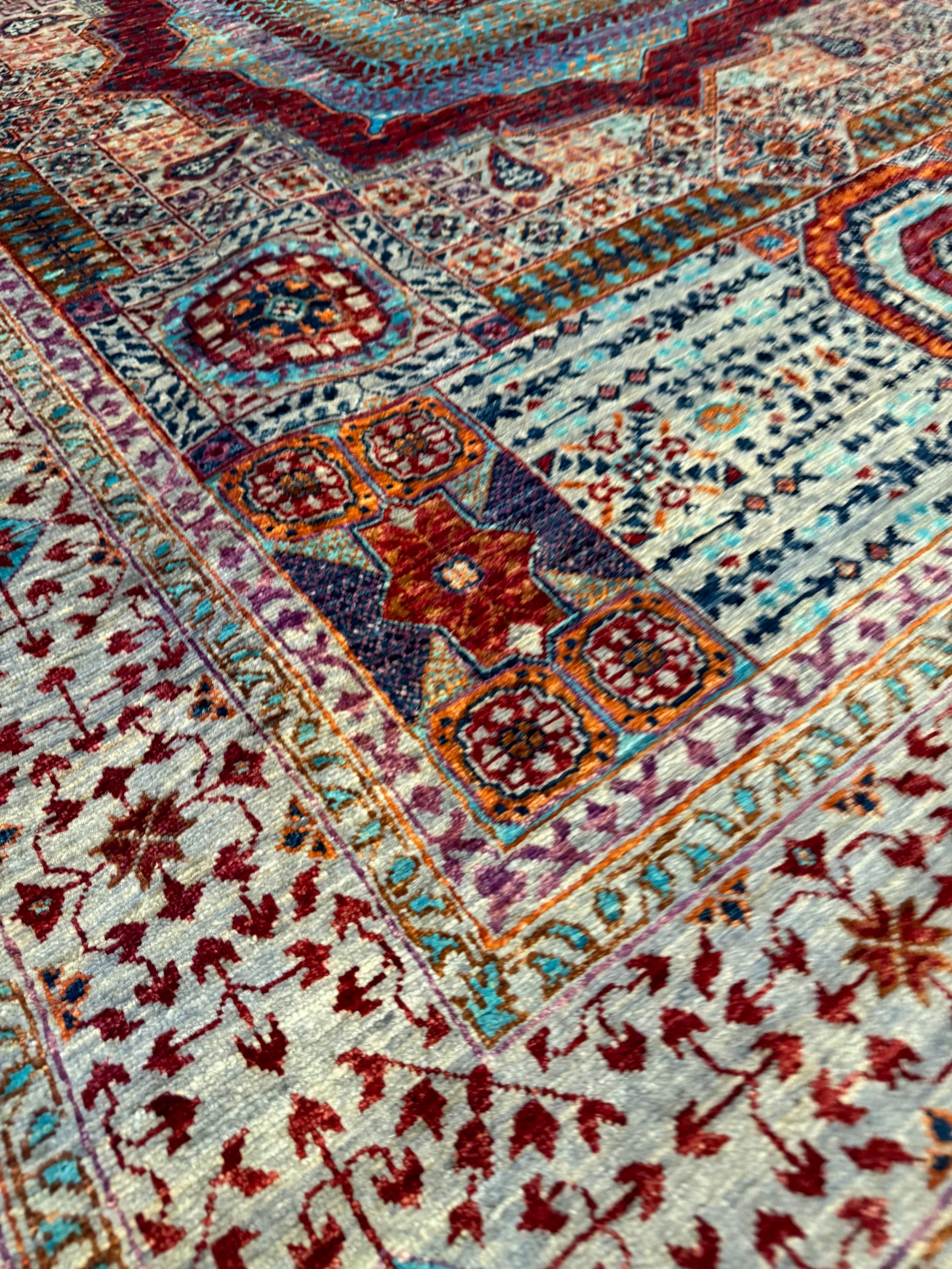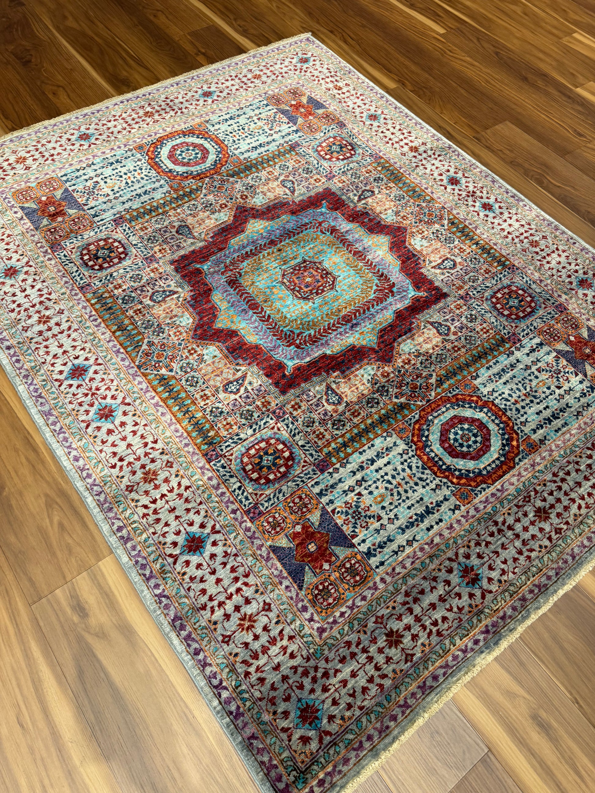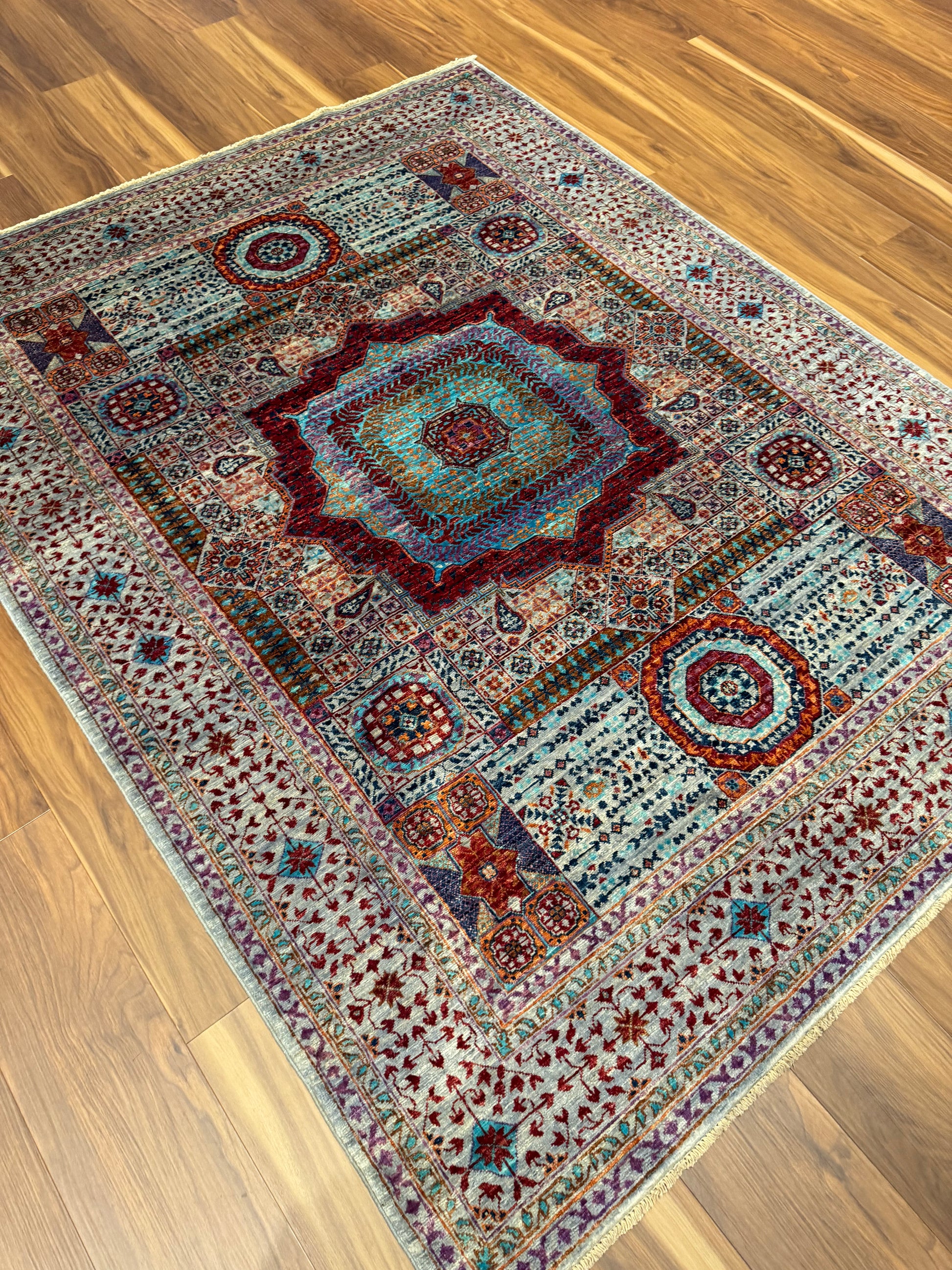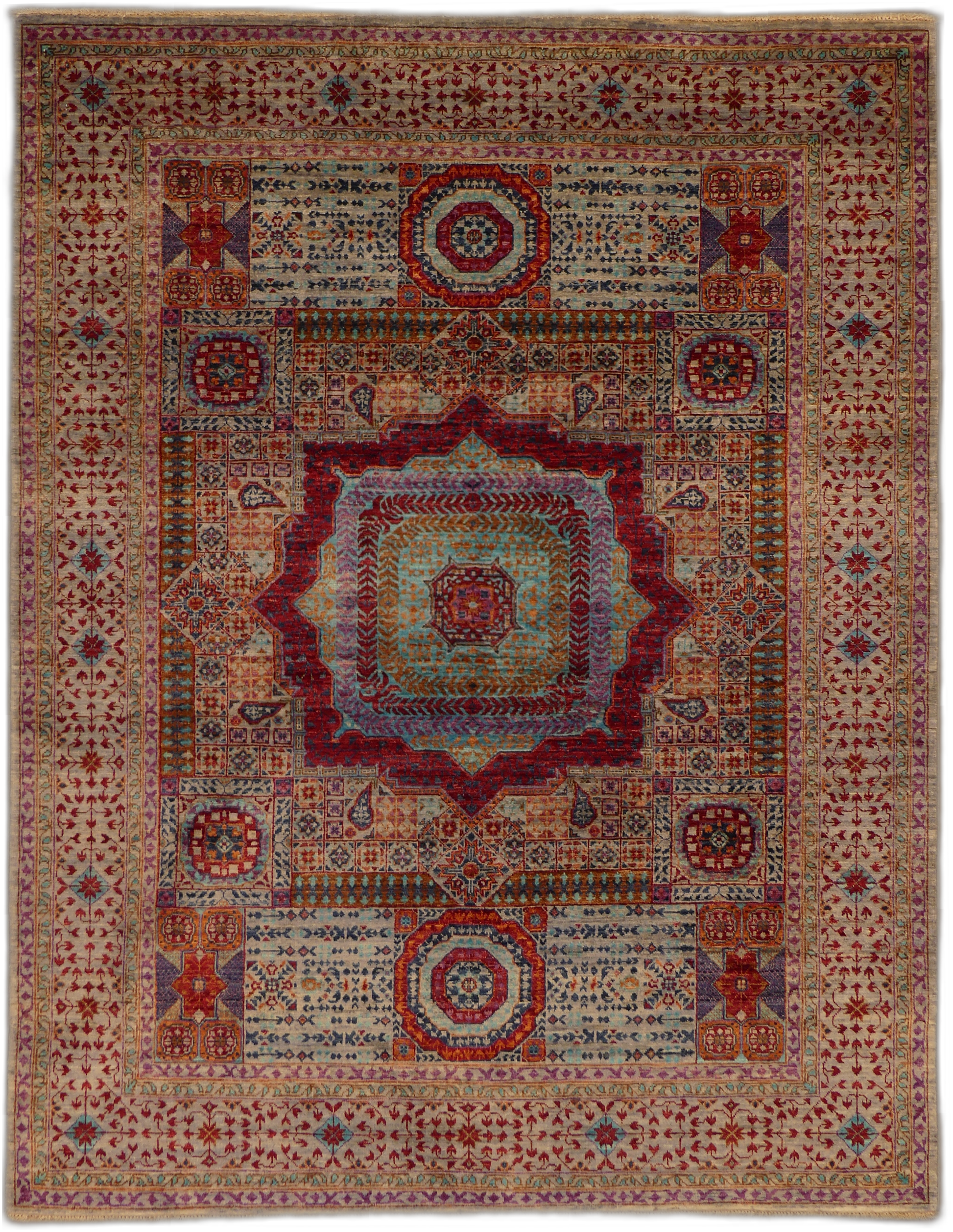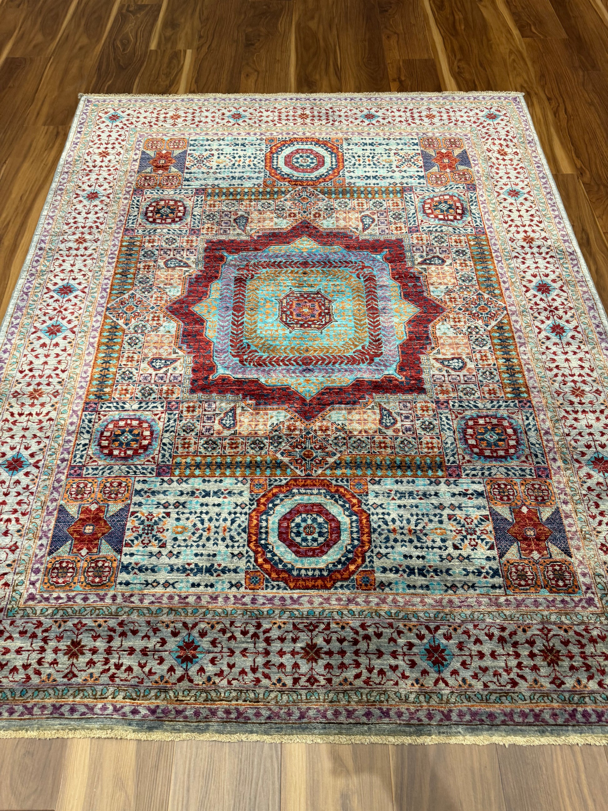 This exquisite Sultanate Mamluk rug is a masterpiece of traditional craft. Woven with high-quality wool, it features a complex array of symmetrical, geometric medallions, layered with intricate patterns and framed by a detailed border. The rich burgundy and navy blue hues are complemented by pops of ivory and teal, creating a sophisticated and timeless aesthetic. Perfect for adding a touch of elegance to any room, this rug's historical design roots and exceptional craftsmanship make it an heirloom-quality piece.