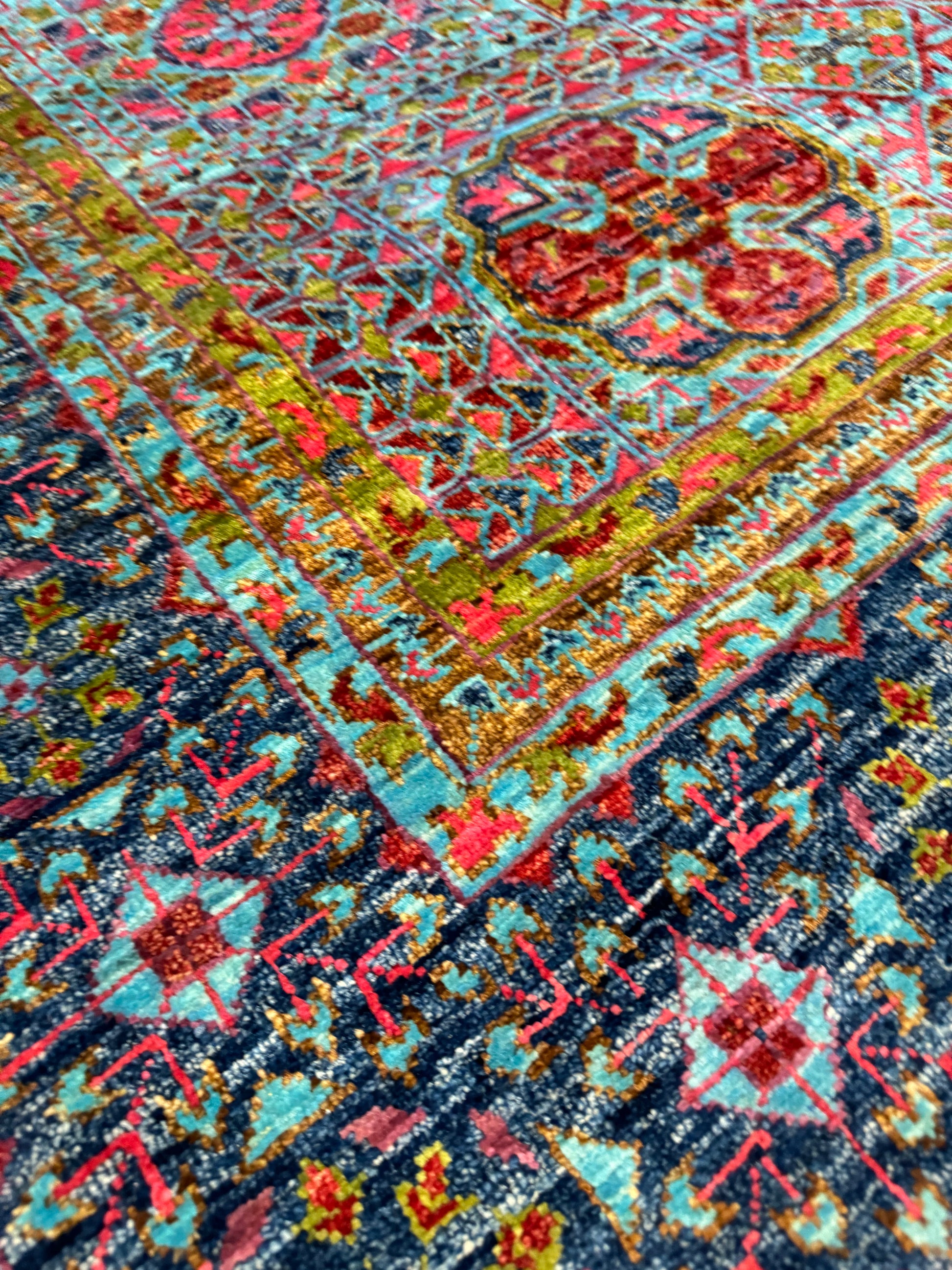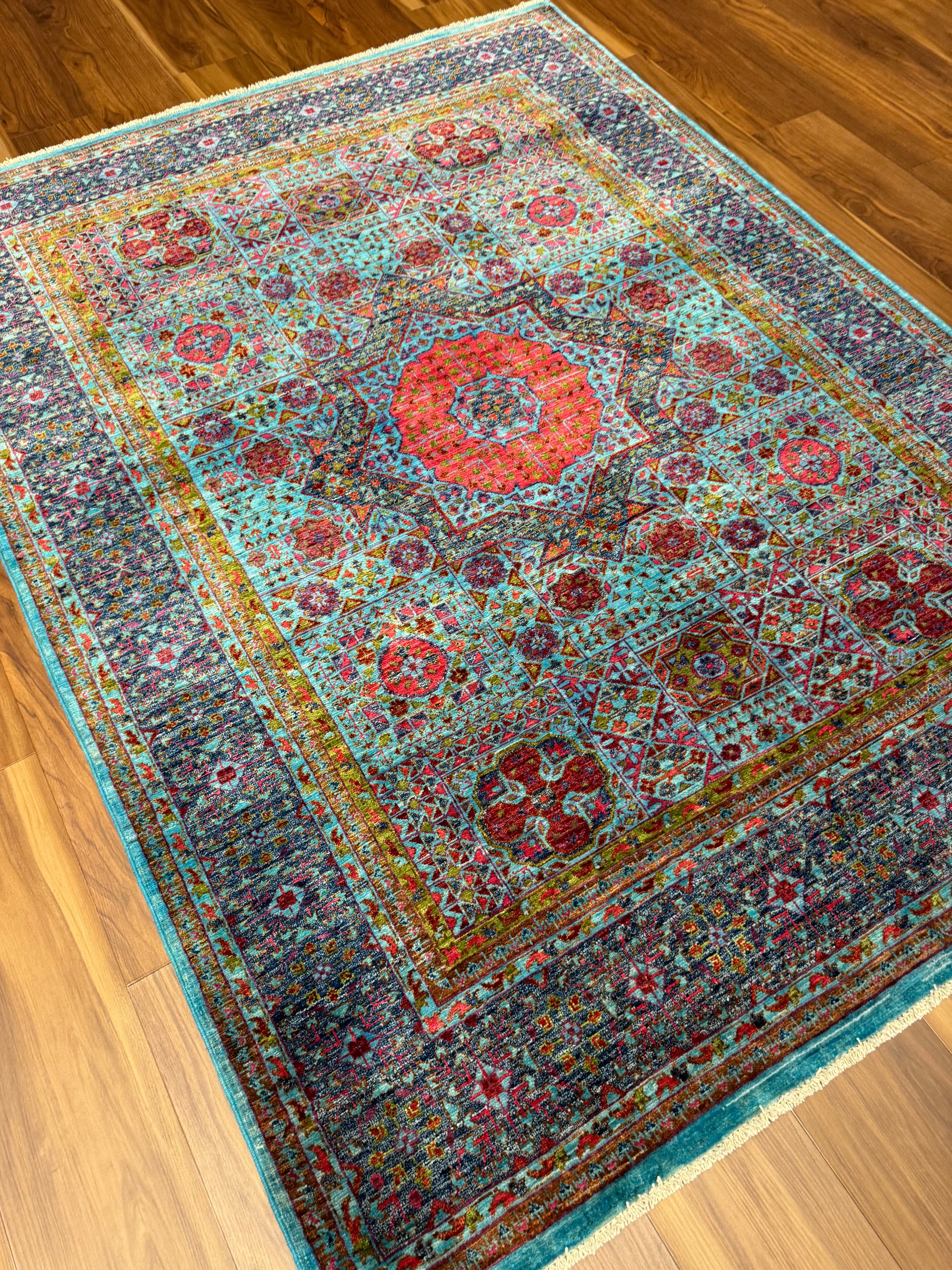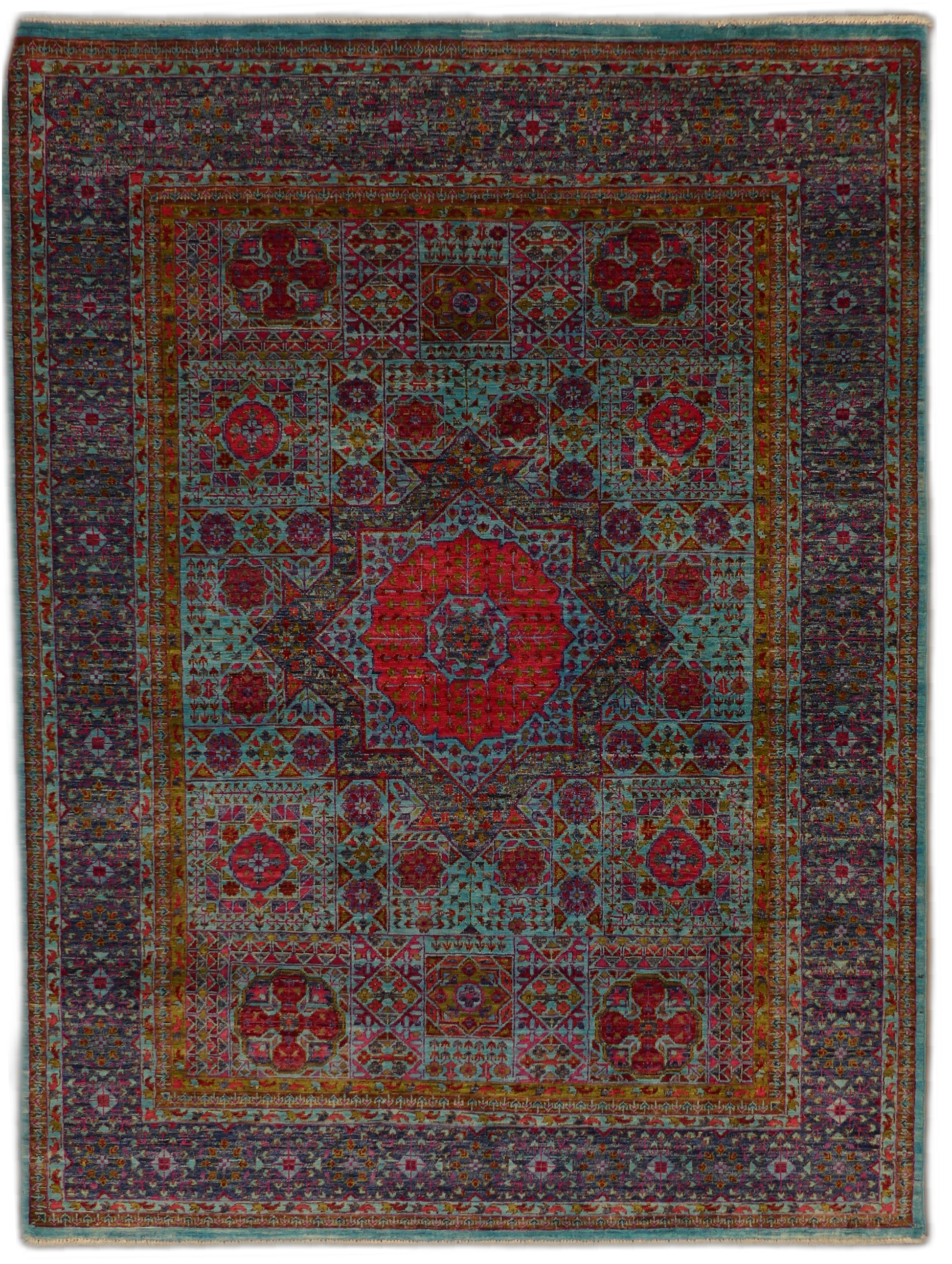 The Sultanate Mamluk rug boasts an intricate design with a stunningly symmetrical layout and a strong central medallion. Its exquisite pattern features interconnected geometric and botanical motifs, presenting a historical elegance reminiscent of Mamluk era artistry. Merged with a sophisticated color palette, the vibrancy is tempered by the subtle abrash effect (color variation) that adds antique allure. Woven with superior craftsmanship, this woolen piece promises durability and a luxurious underfoot feel.
