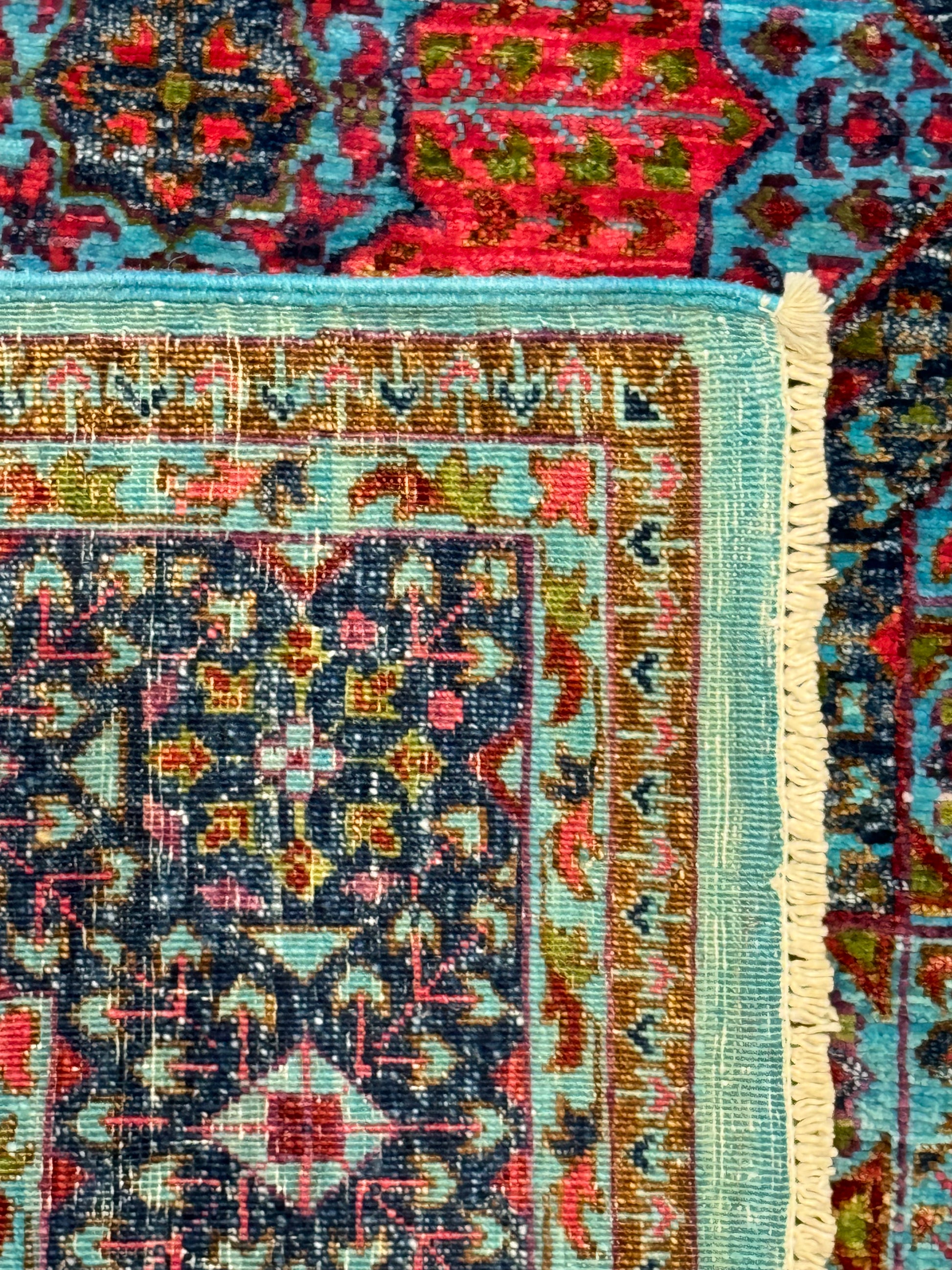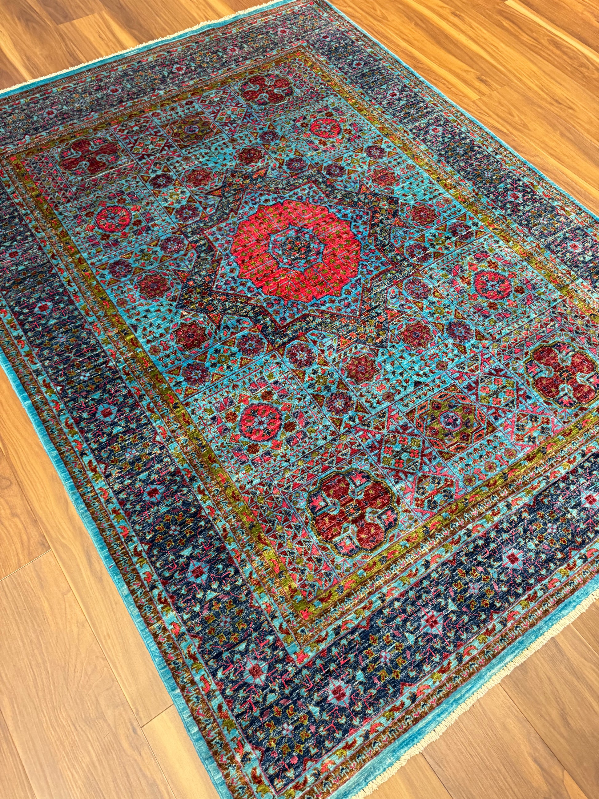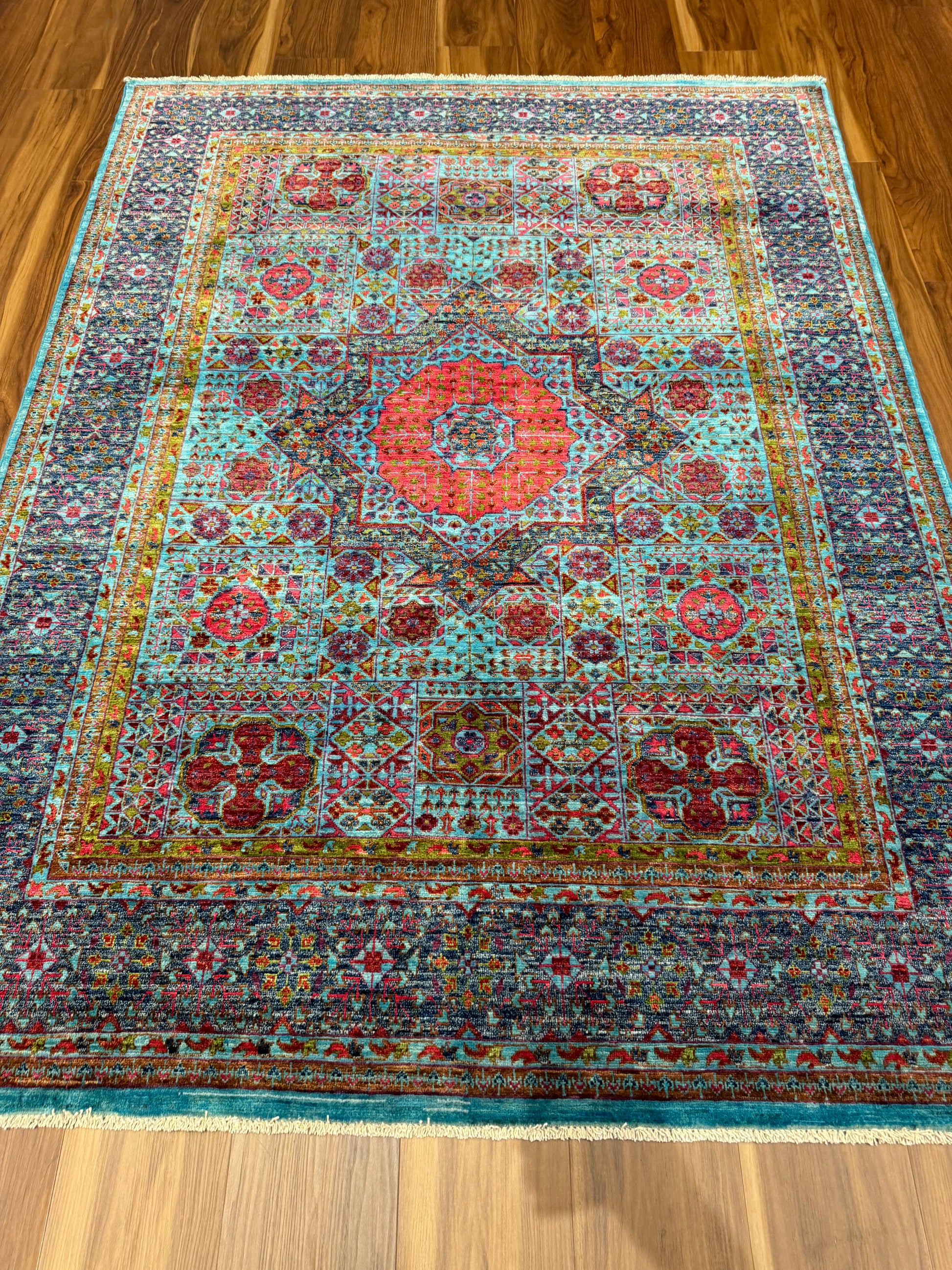 The Sultanate Mamluk rug boasts an intricate design with a stunningly symmetrical layout and a strong central medallion. Its exquisite pattern features interconnected geometric and botanical motifs, presenting a historical elegance reminiscent of Mamluk era artistry. Merged with a sophisticated color palette, the vibrancy is tempered by the subtle abrash effect (color variation) that adds antique allure. Woven with superior craftsmanship, this woolen piece promises durability and a luxurious underfoot feel.