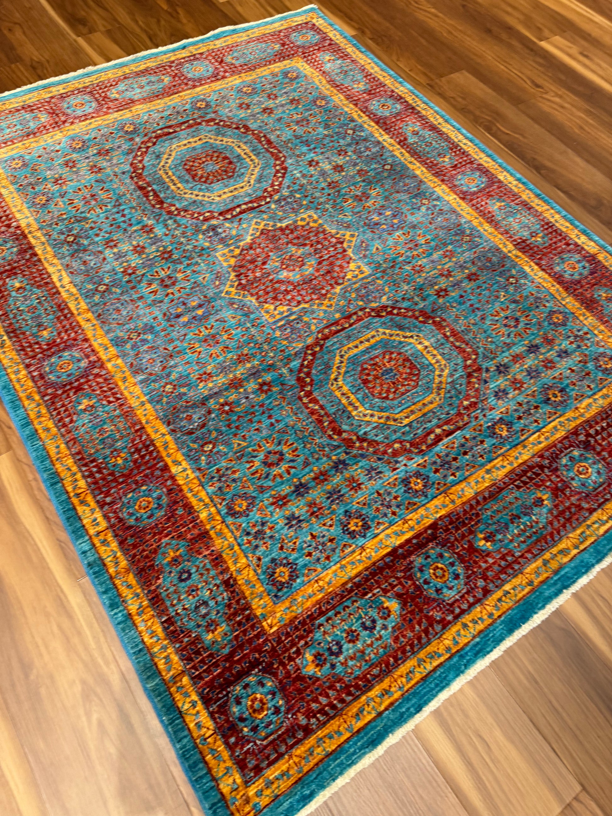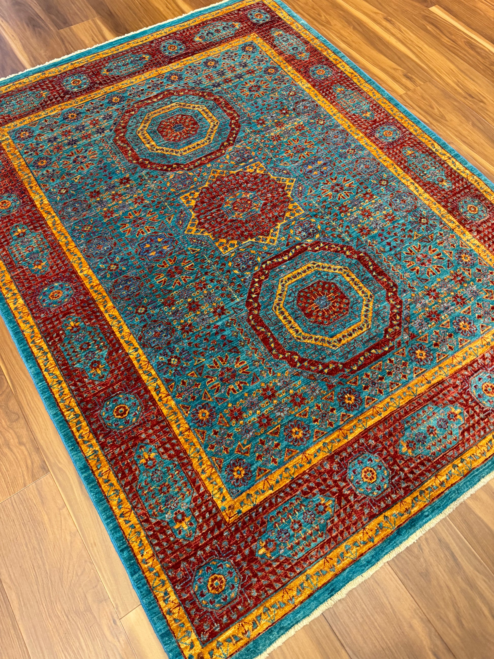 The Sultanate Mamluk wool rug showcases a captivating blend of rich, warm colors and intricate patterns that breathe life into traditional craftsmanship. The central medallion design, accented by geometric motifs and bordered with a detailed ornamental framework, hints at the historical significance and grandeur of the Mamluk era. This rug emanates timeless elegance, making it an exquisite centerpiece for any room.