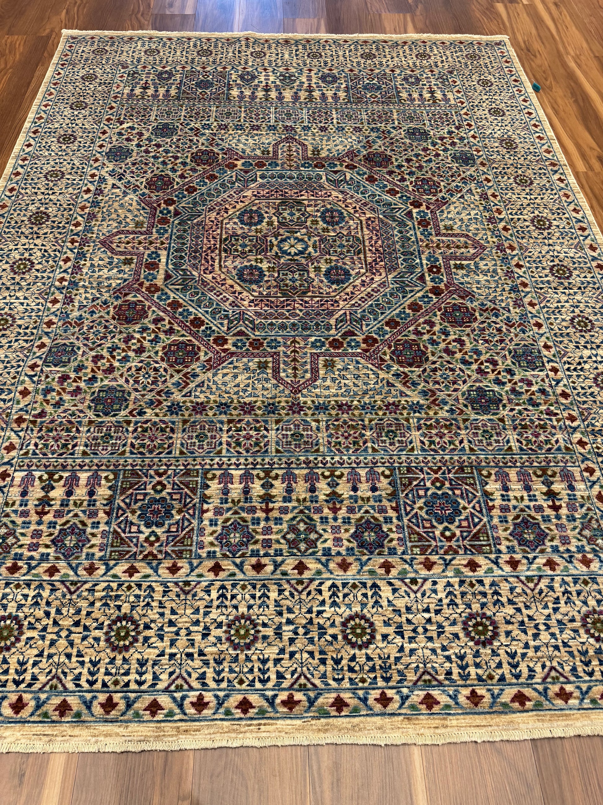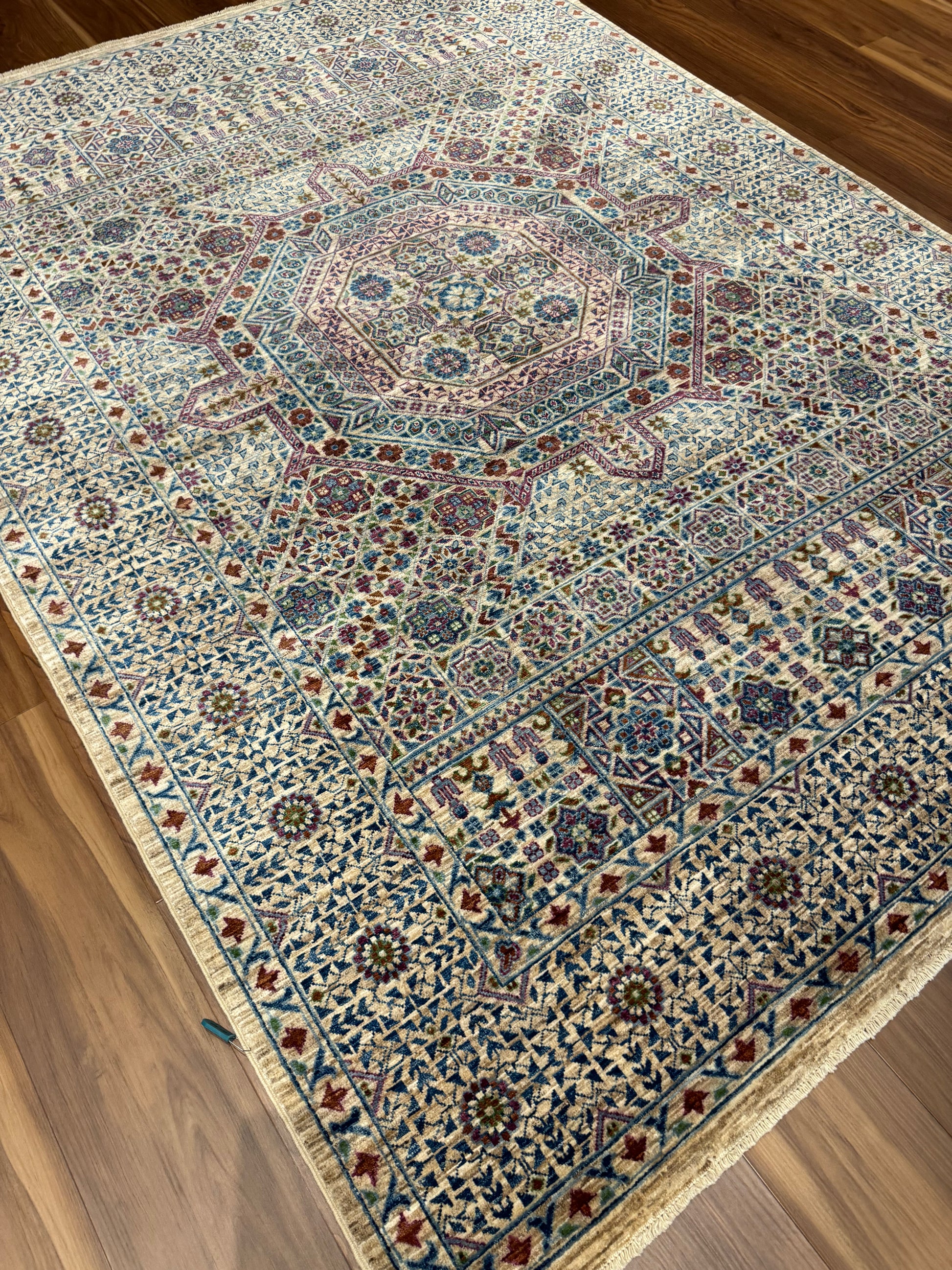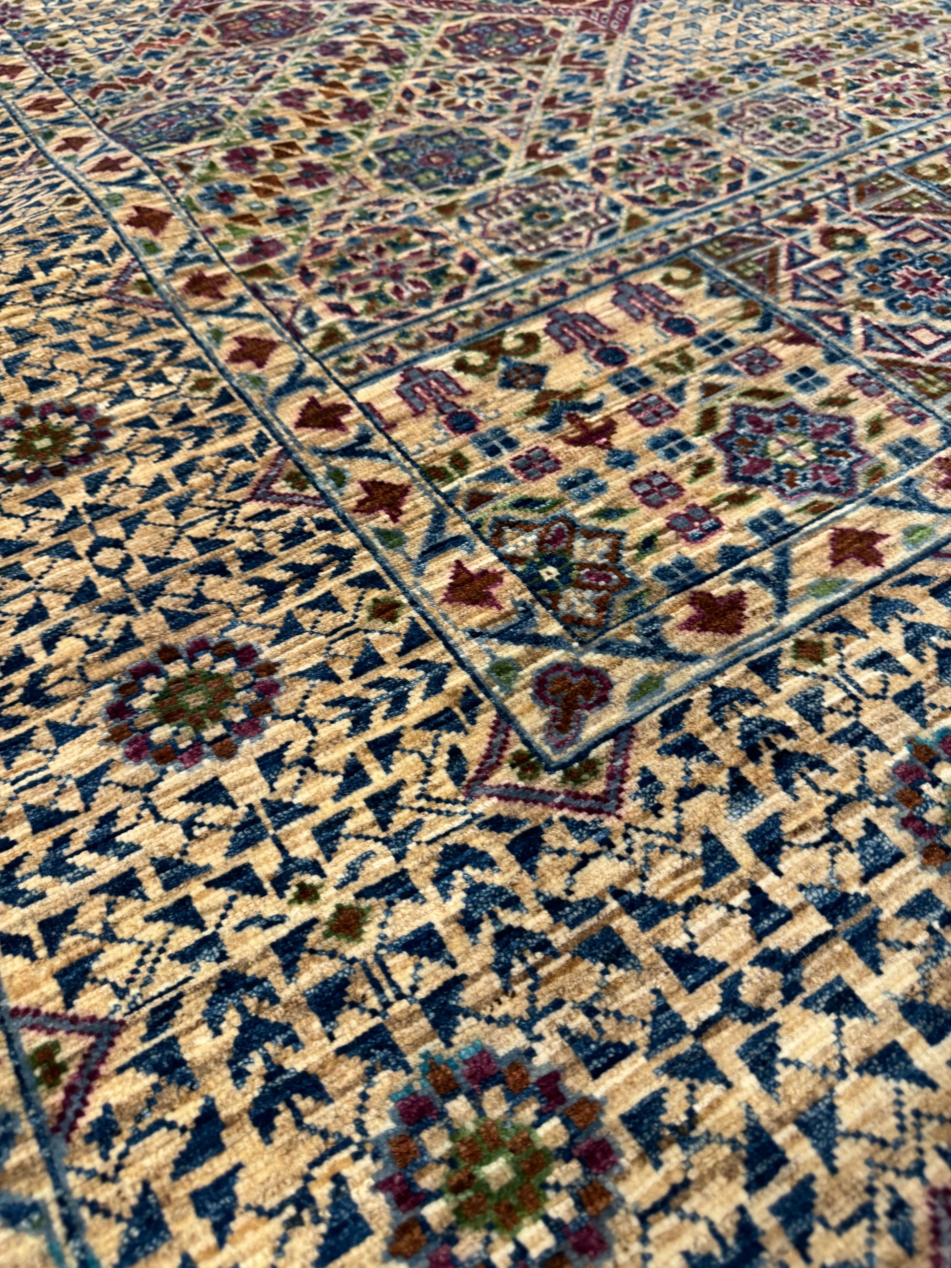 The Sultanate Mamluk rug is an exquisite piece that showcases the rich heritage and intricate craftsmanship of traditional rug-making. This woolen masterpiece features a complex interplay of geometric and medallion patterns, enveloped in an elegant array of blue, red, and beige hues. The balanced design and precise knotting technique exemplify the luxurious nature of this rug, making it a timeless addition to any sophisticated interior setting. Inspired by the historical Mamluk era, the rug's motif is a tribute to the artistic expressions of that period, offering not just a floor covering but a piece of history.