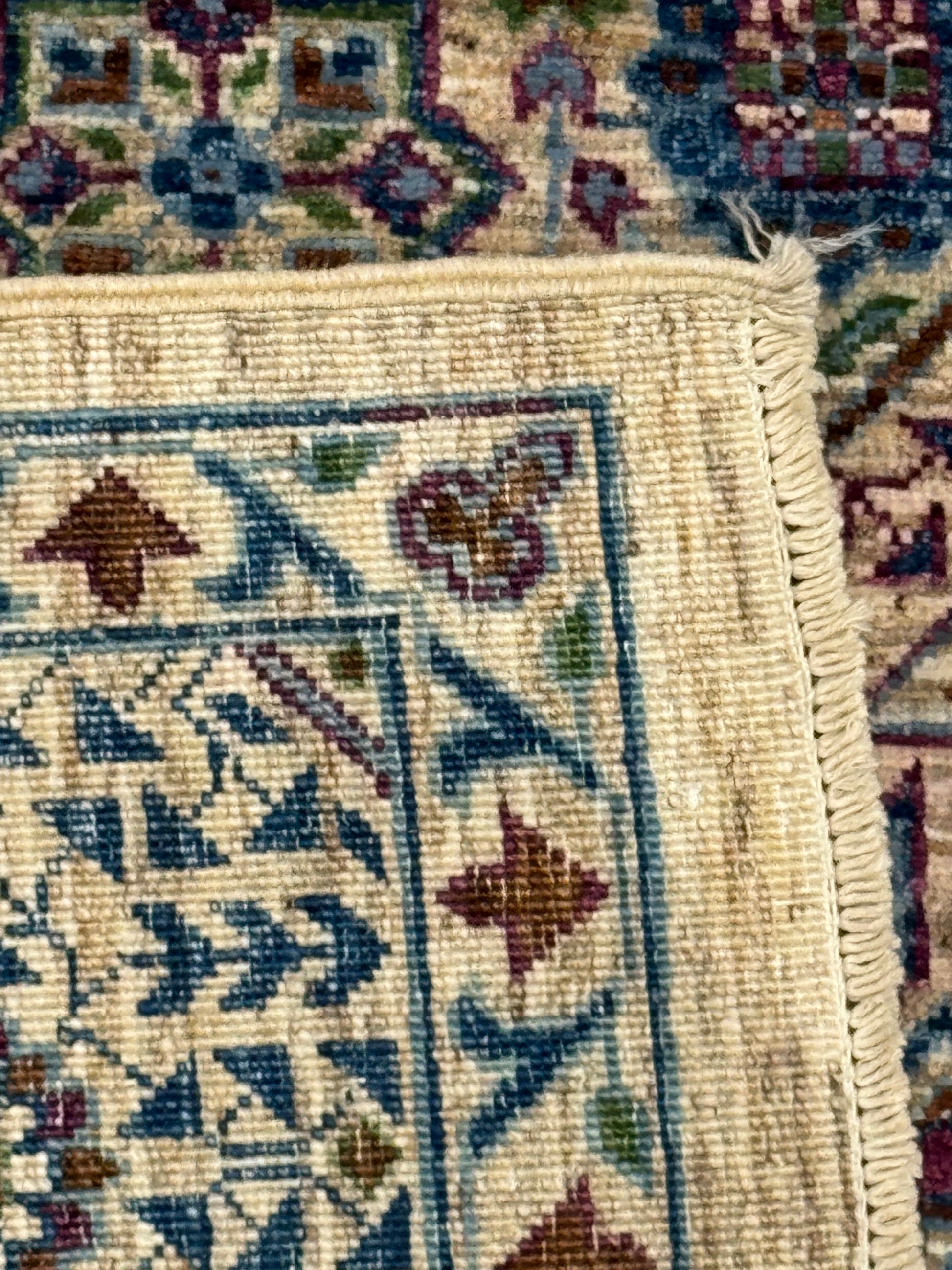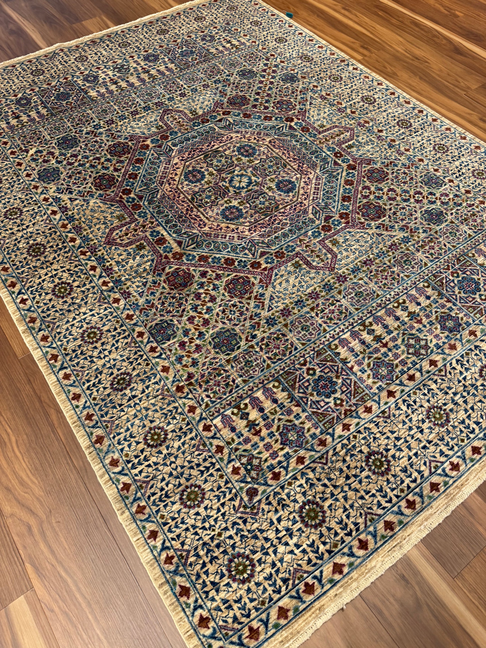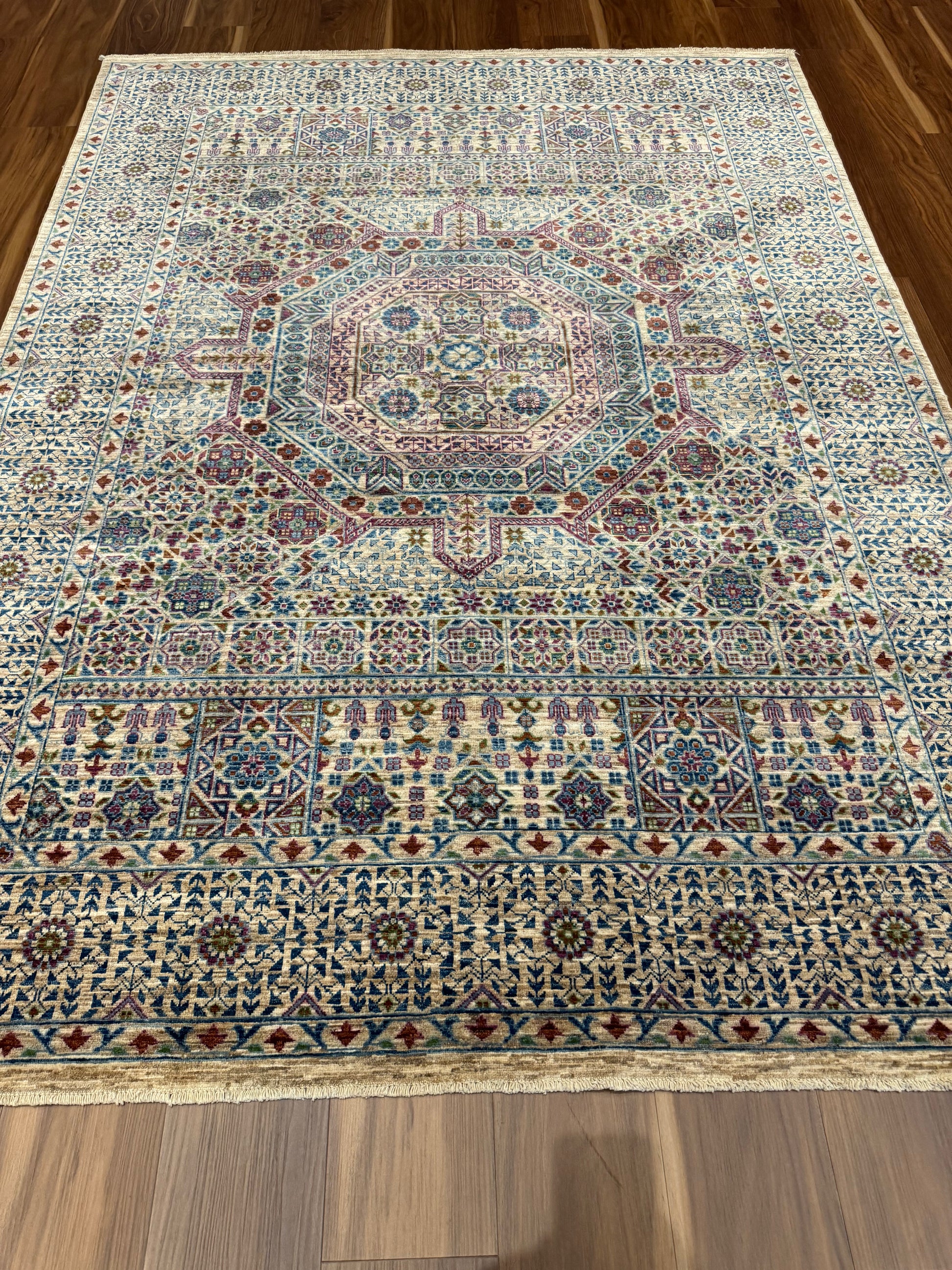 The Sultanate Mamluk rug is an exquisite piece that showcases the rich heritage and intricate craftsmanship of traditional rug-making. This woolen masterpiece features a complex interplay of geometric and medallion patterns, enveloped in an elegant array of blue, red, and beige hues. The balanced design and precise knotting technique exemplify the luxurious nature of this rug, making it a timeless addition to any sophisticated interior setting. Inspired by the historical Mamluk era, the rug's motif is a tribute to the artistic expressions of that period, offering not just a floor covering but a piece of history.