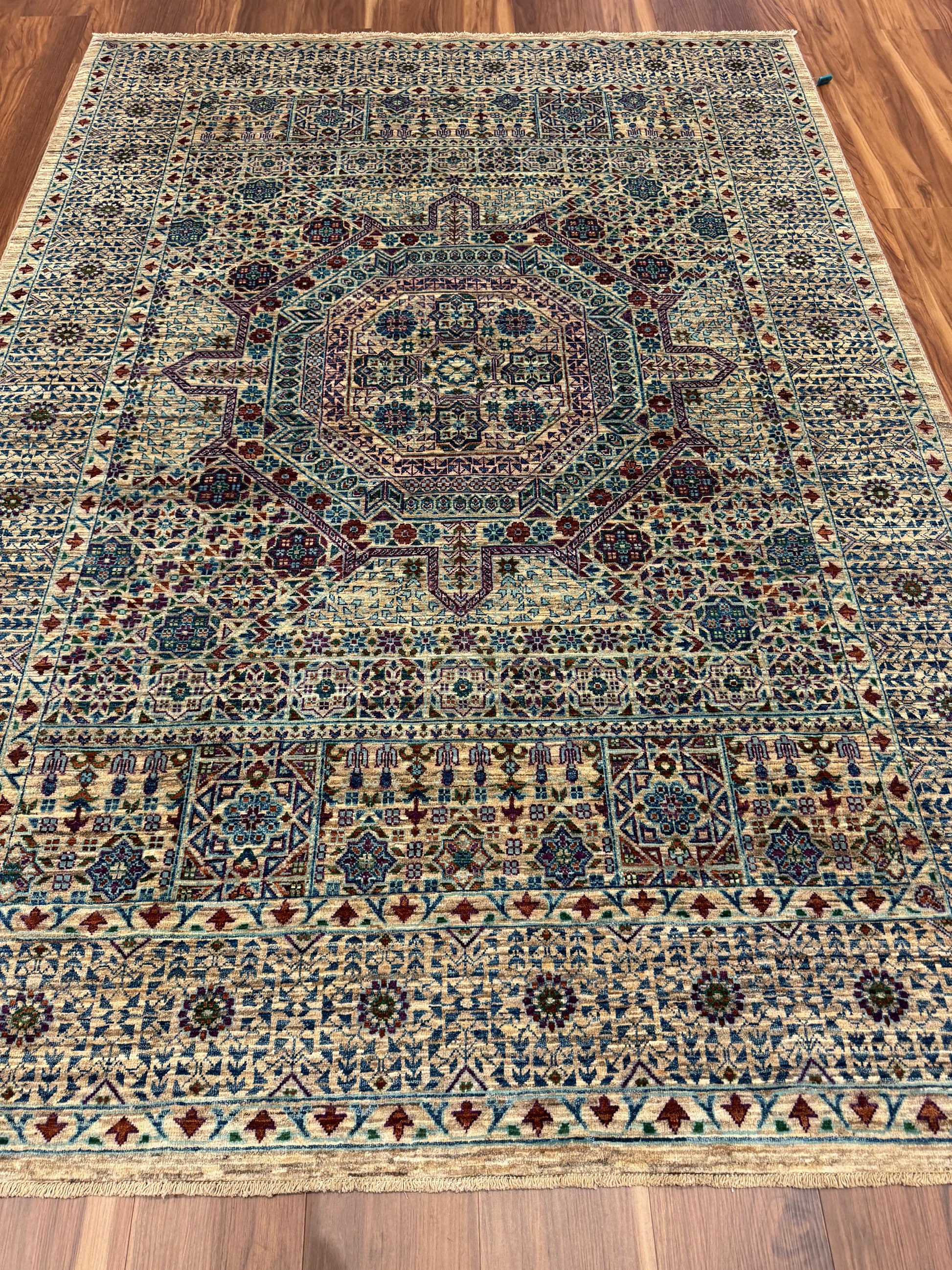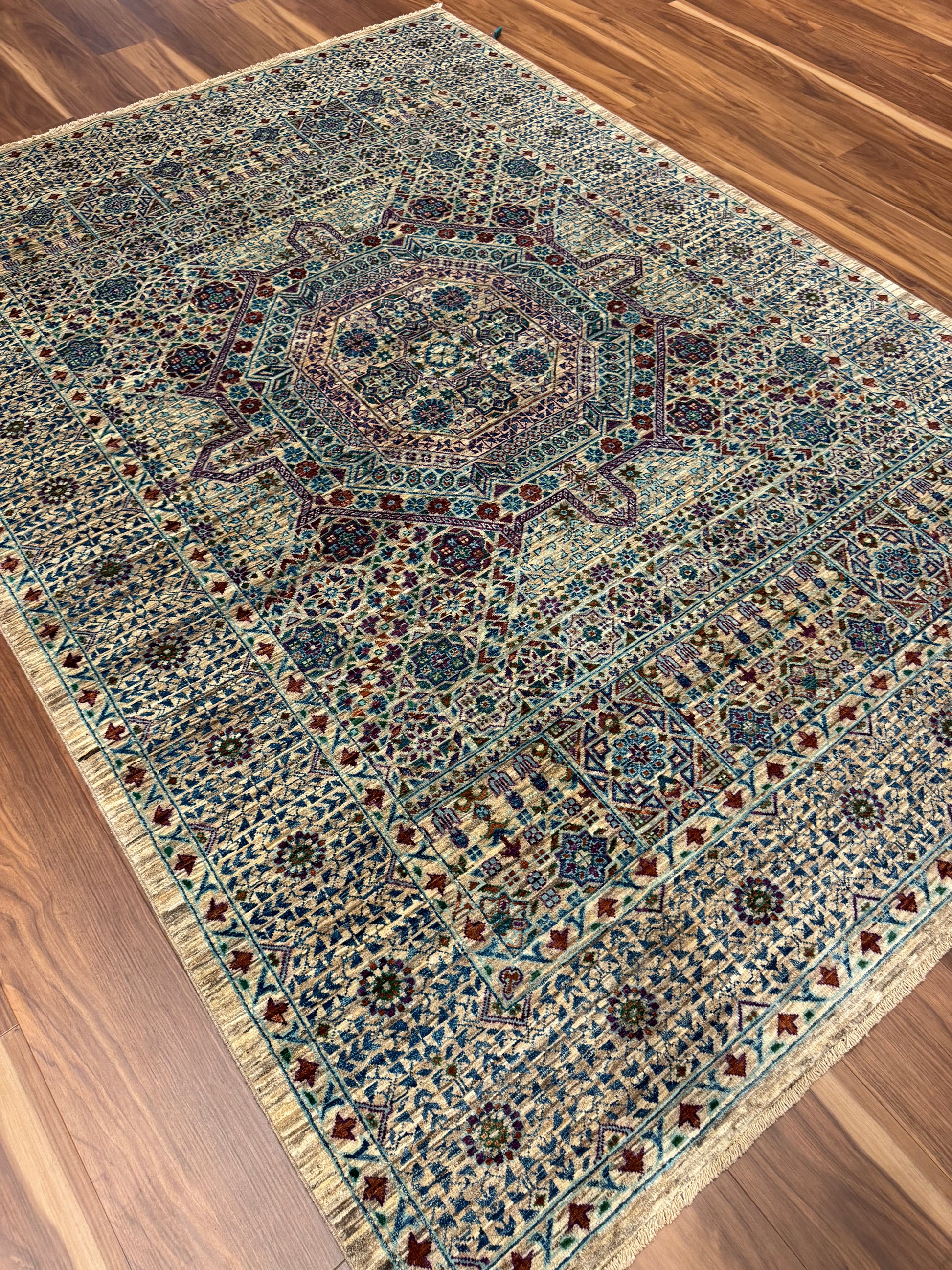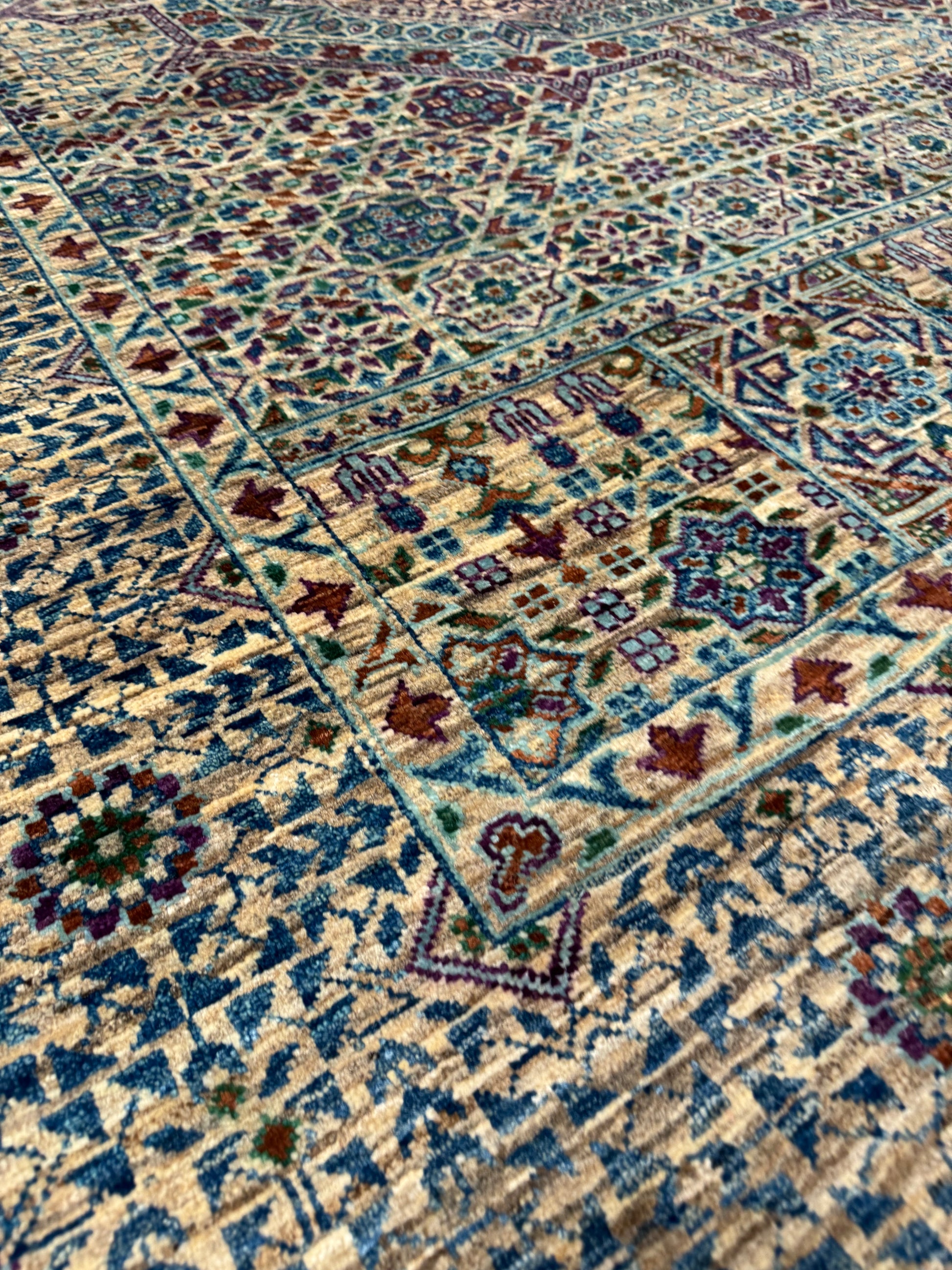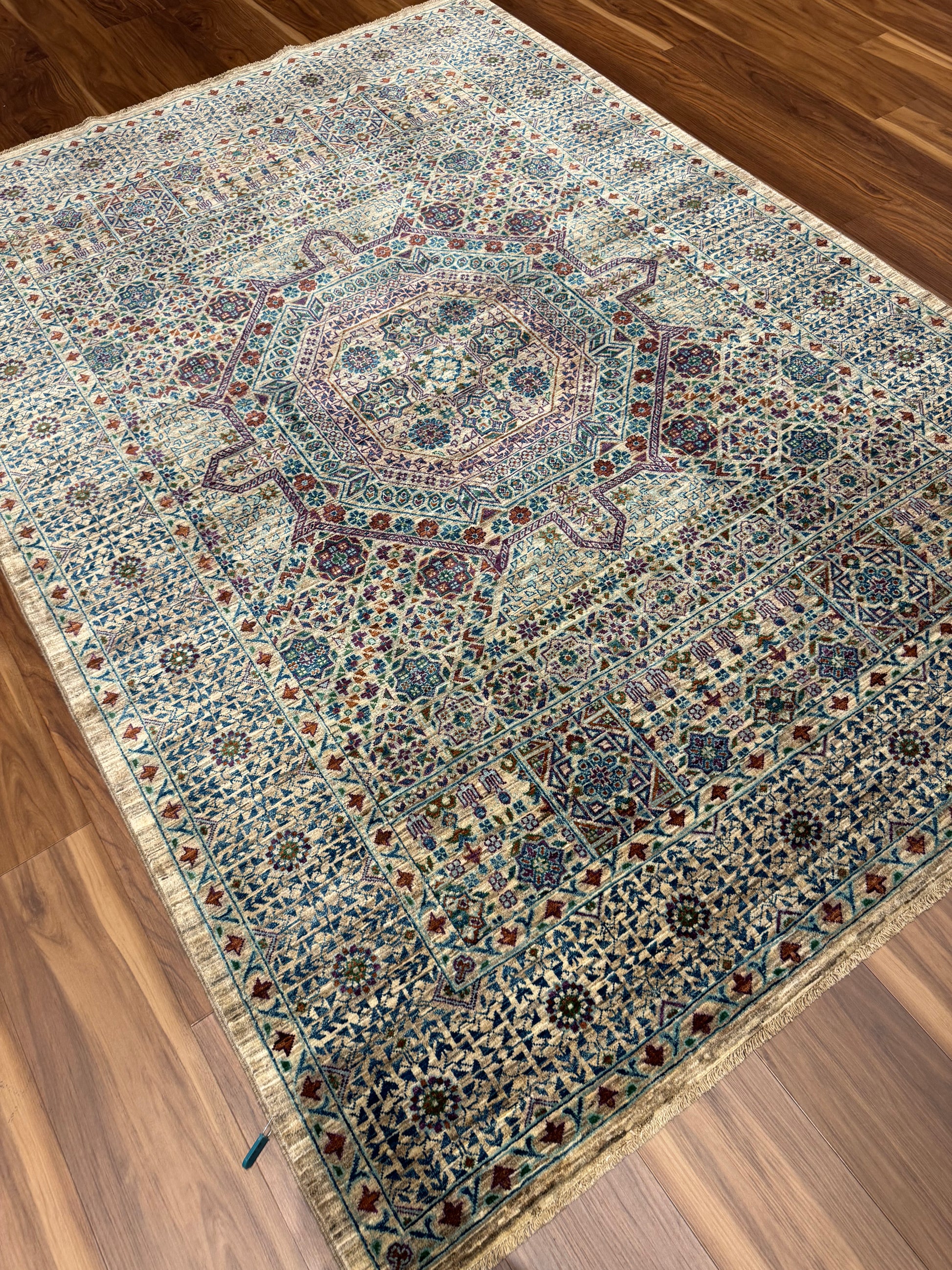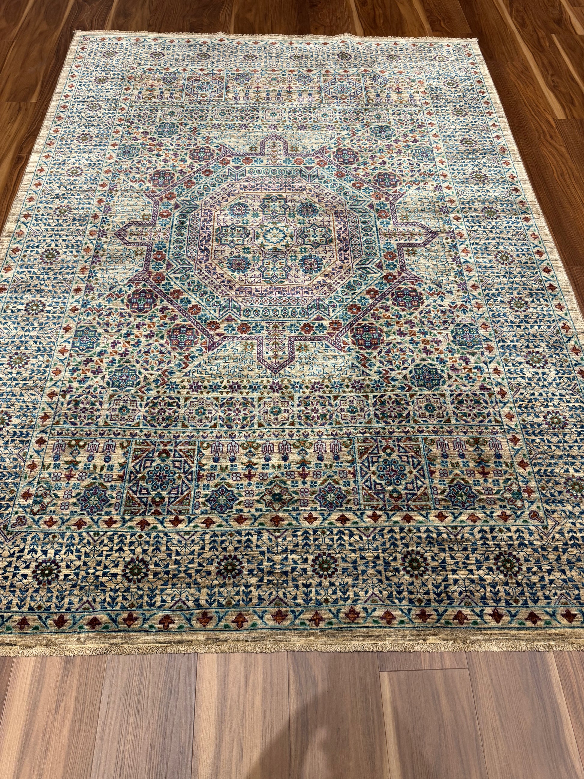 This breathtaking Sultanate Mamluk rug is handcrafted from the finest wool, evoking the grandeur of the Mamluk dynasty with its intricate patterns and cohesive design. Dominated by a central medallion and a series of ornamental borders, the geometric and botanical motifs are harmoniously arranged, creating a magnificent heirloom piece that captures both the artistry and historical significance of Middle Eastern rug-making traditions.
