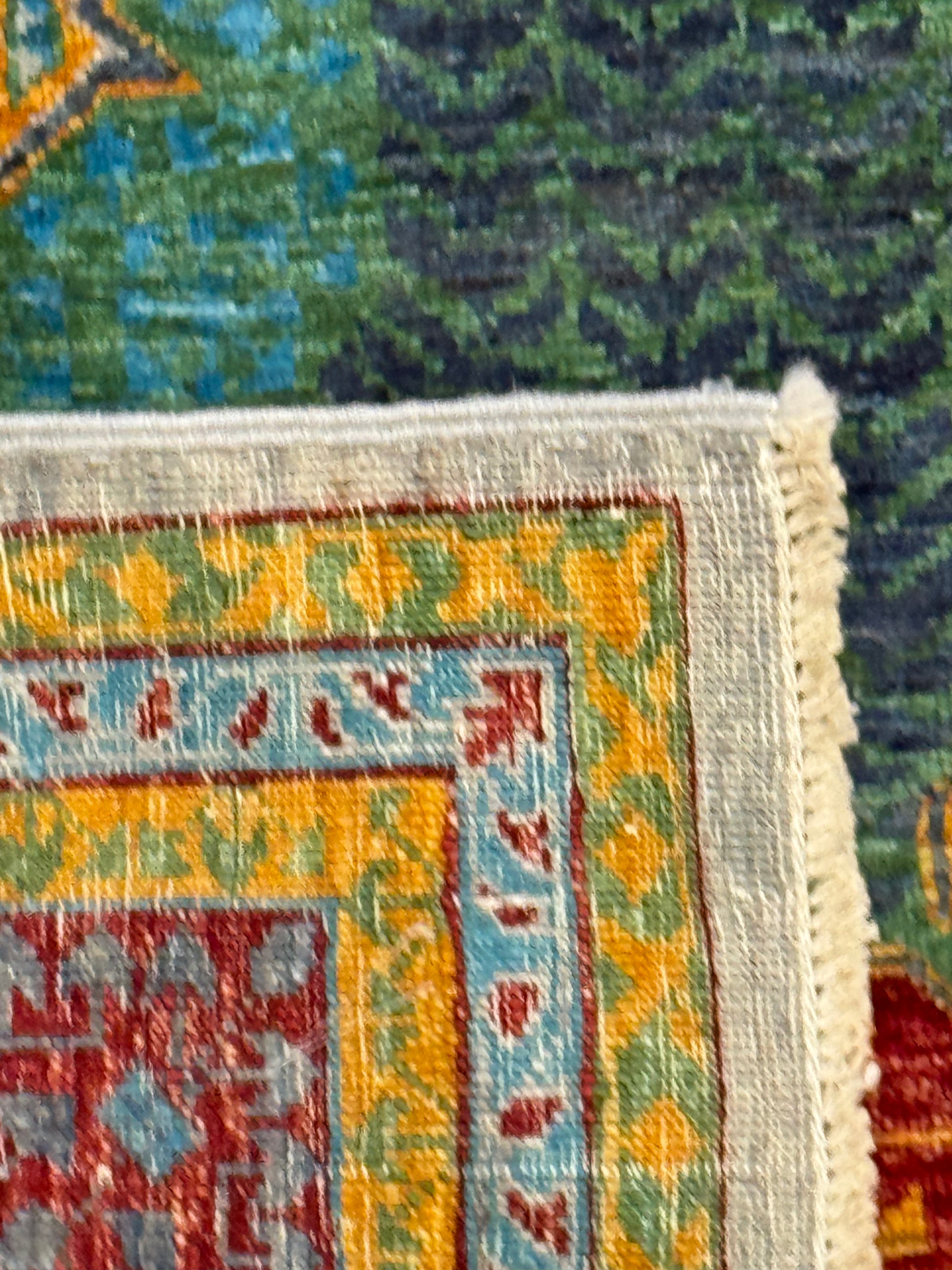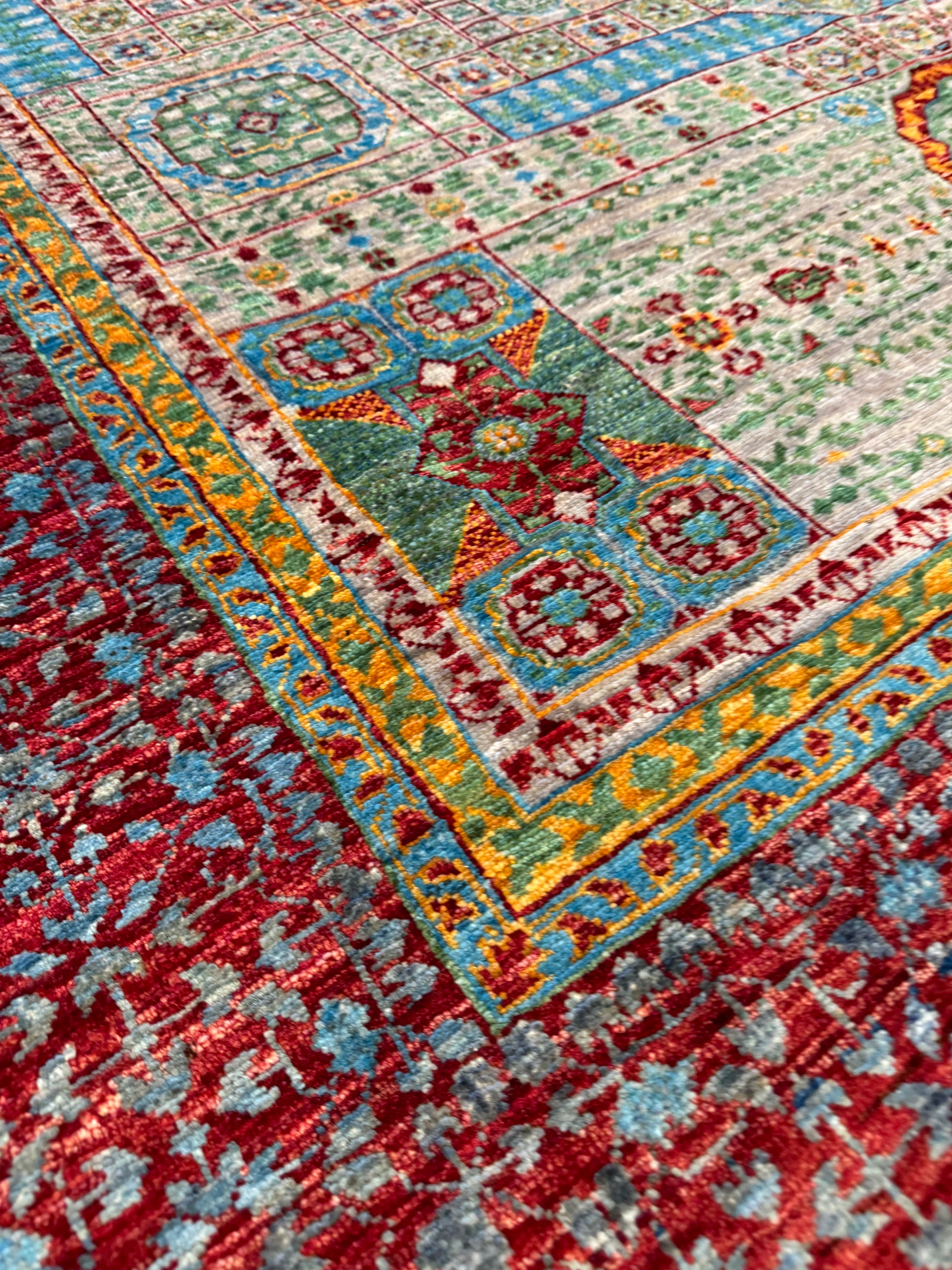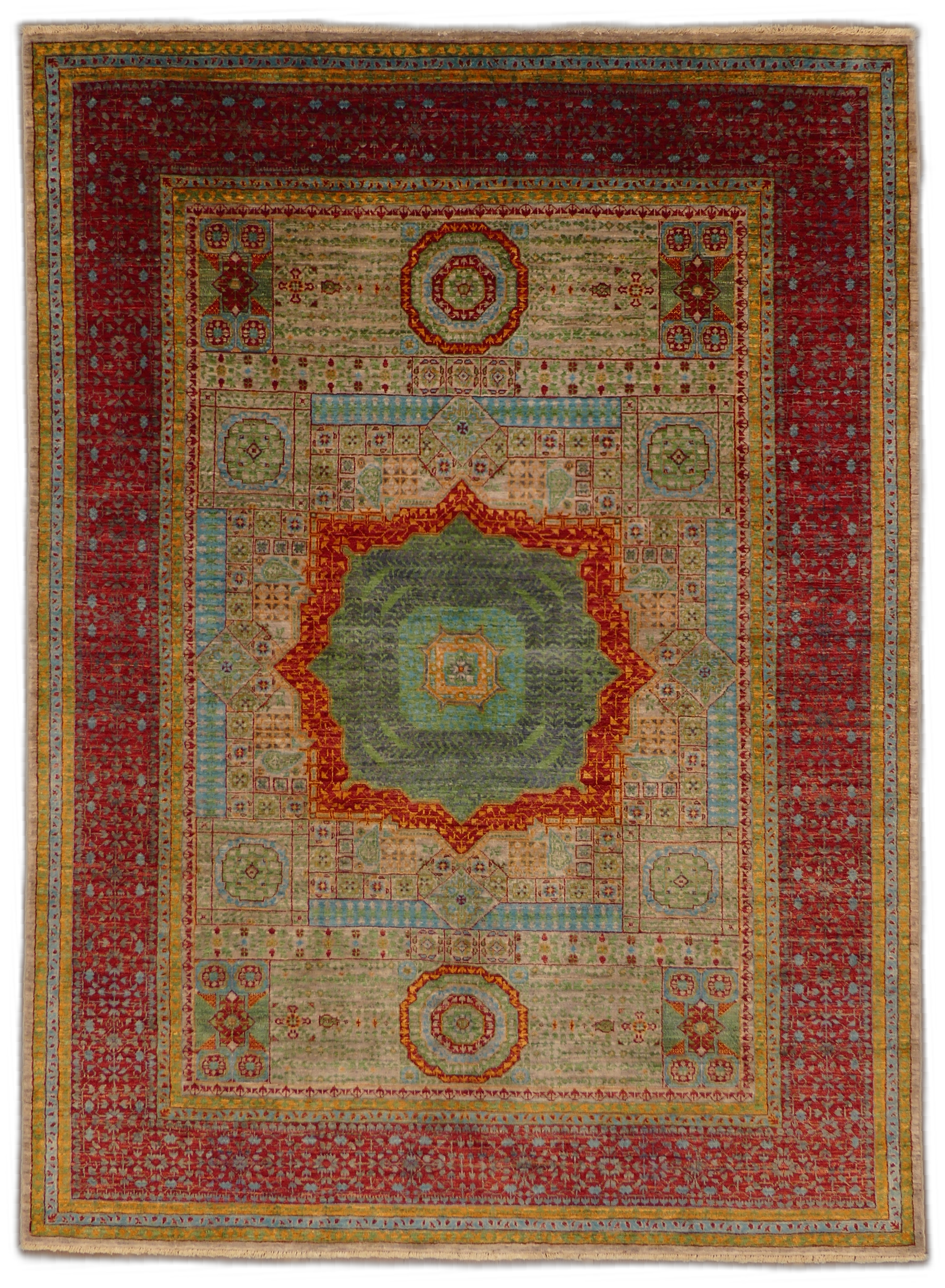 The Sultanate Mamluk wool rug is an exquisite piece, featuring a remarkable pattern that showcases the opulent artistry of the Mamluk era. Its intricate design boasts symmetrical geometric motifs and medallions, surrounded by a detailed border. The rich color palette adds depth and warmth to any space, making it a luxurious centerpiece that blends heritage and quality craftsmanship. Perfect for those seeking a touch of historical elegance in their décor.