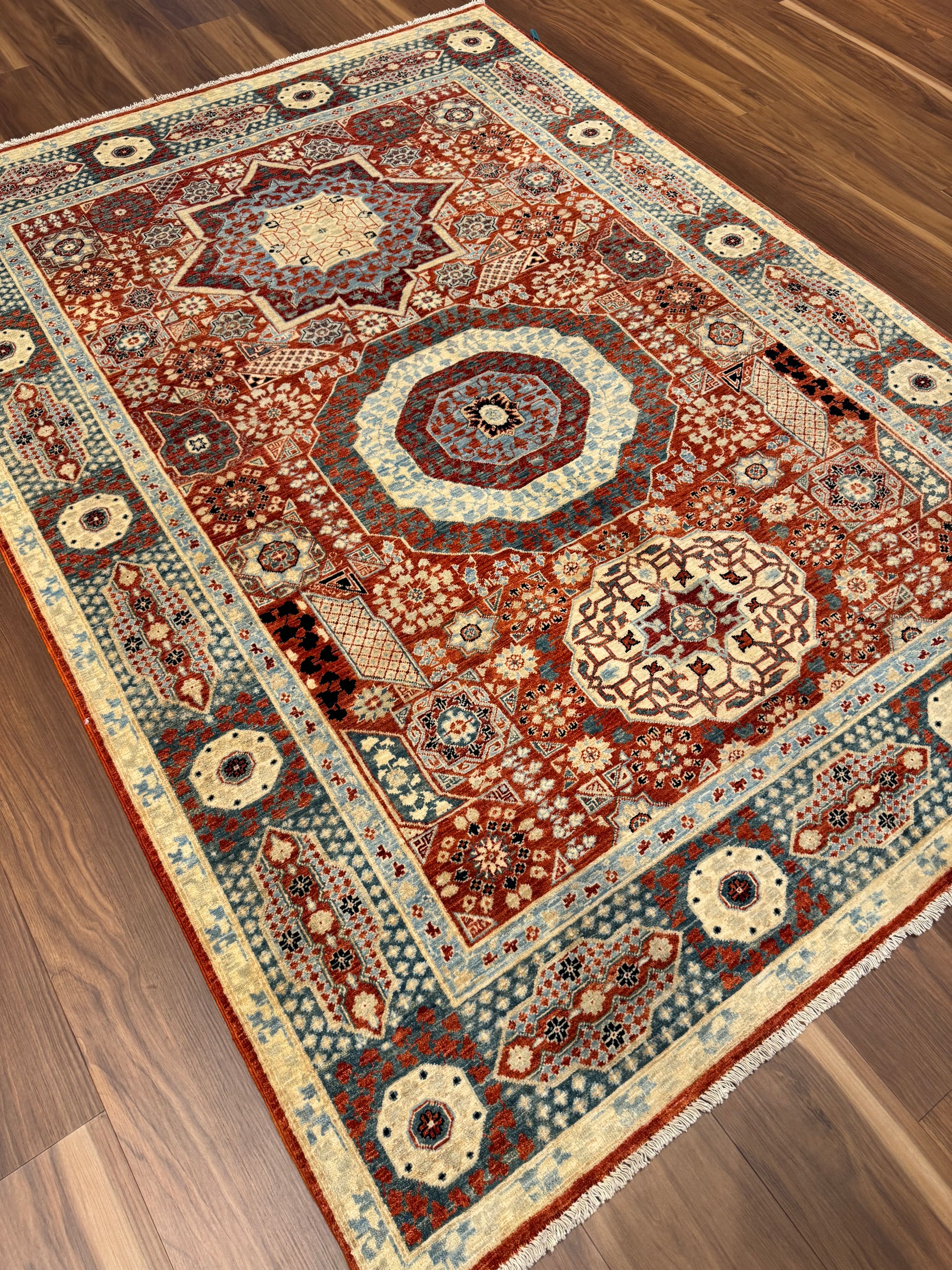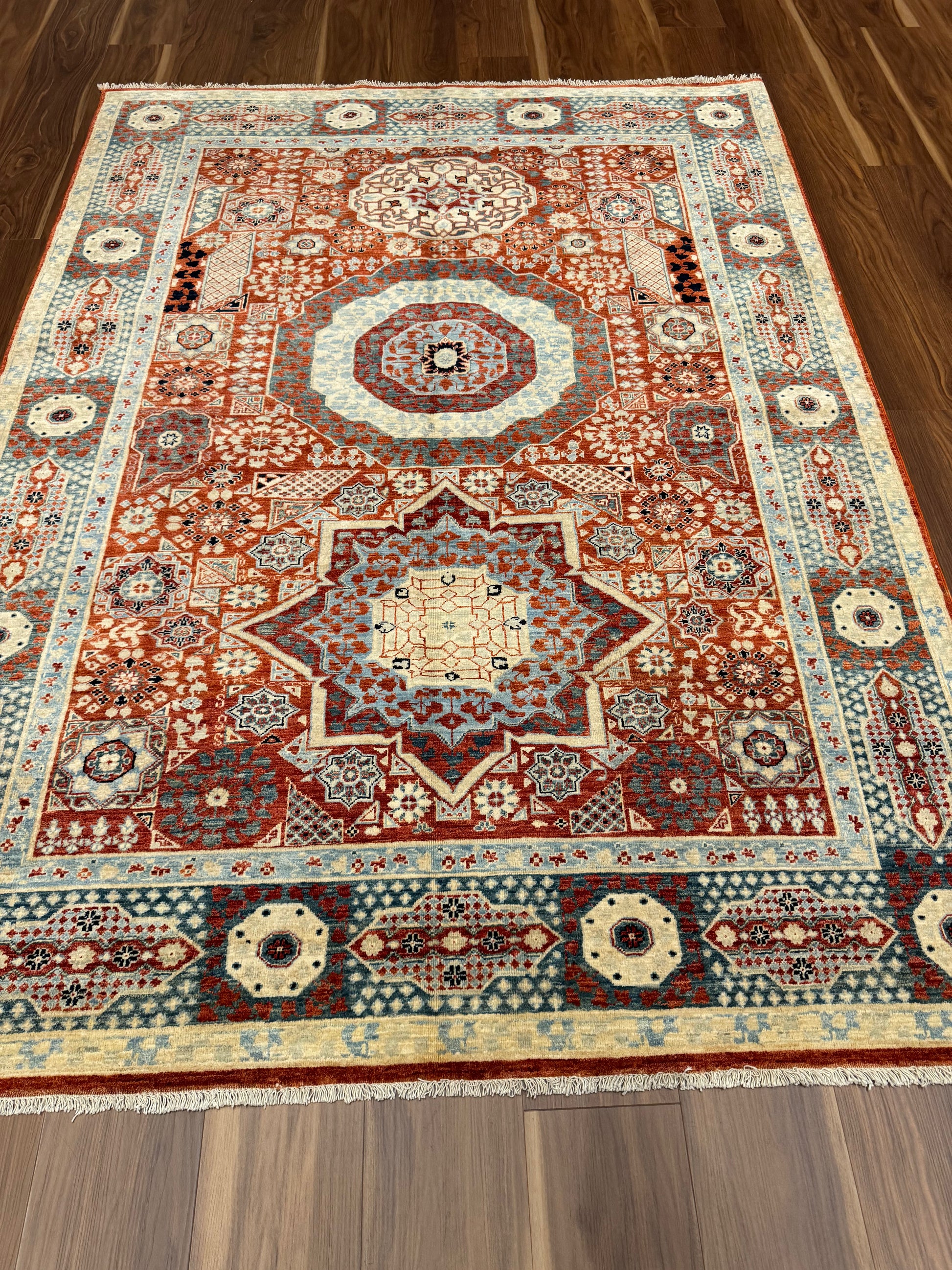 The Sultanate Mamluk Wool Rug offers a sophisticated blend of traditional craftsmanship and intricate design, featuring a stunning medley of red, blue, and beige hues. Its elaborate patterns draw inspiration from historic Mamluk designs, boasting geometrically stylized floral and star patterns. Durable and luxuriously textured, this wool rug is sure to be a timeless centerpiece that complements both classic and contemporary decors while evoking the grandeur of ancient sultanates.