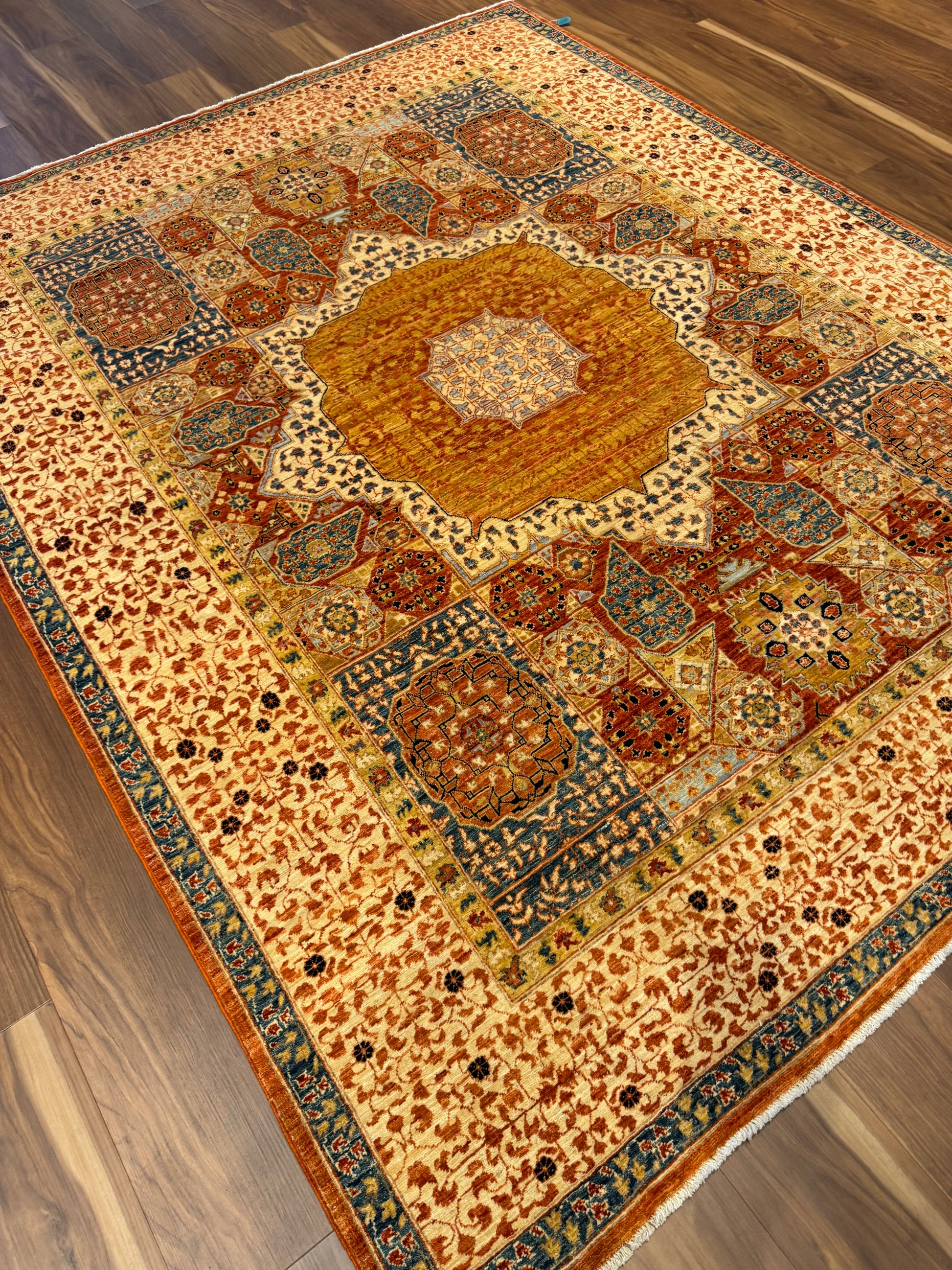 The Sultanate Mamluk woolen rug boasts a traditional design rooted in historic elegance. The centerpiece is a grand medallion, framed by intricate borders and a series of smaller decorative medallions. Its warm, earthy orange and vibrant blue hues are offset by soothing beige, making it a captivating focal point for any room. Crafted with care, the high-quality wool provides a luxurious texture, promising durability and comfort underfoot.