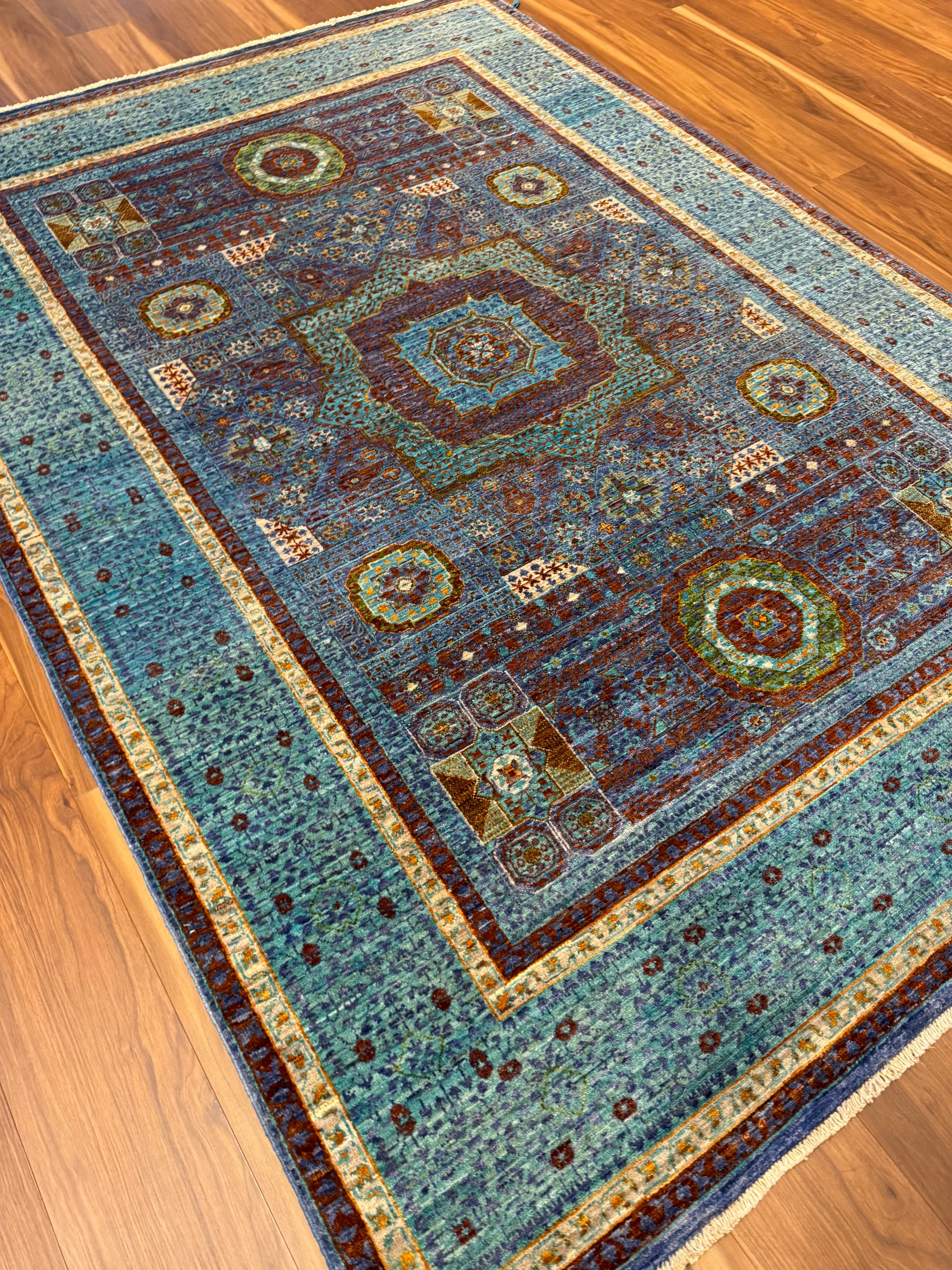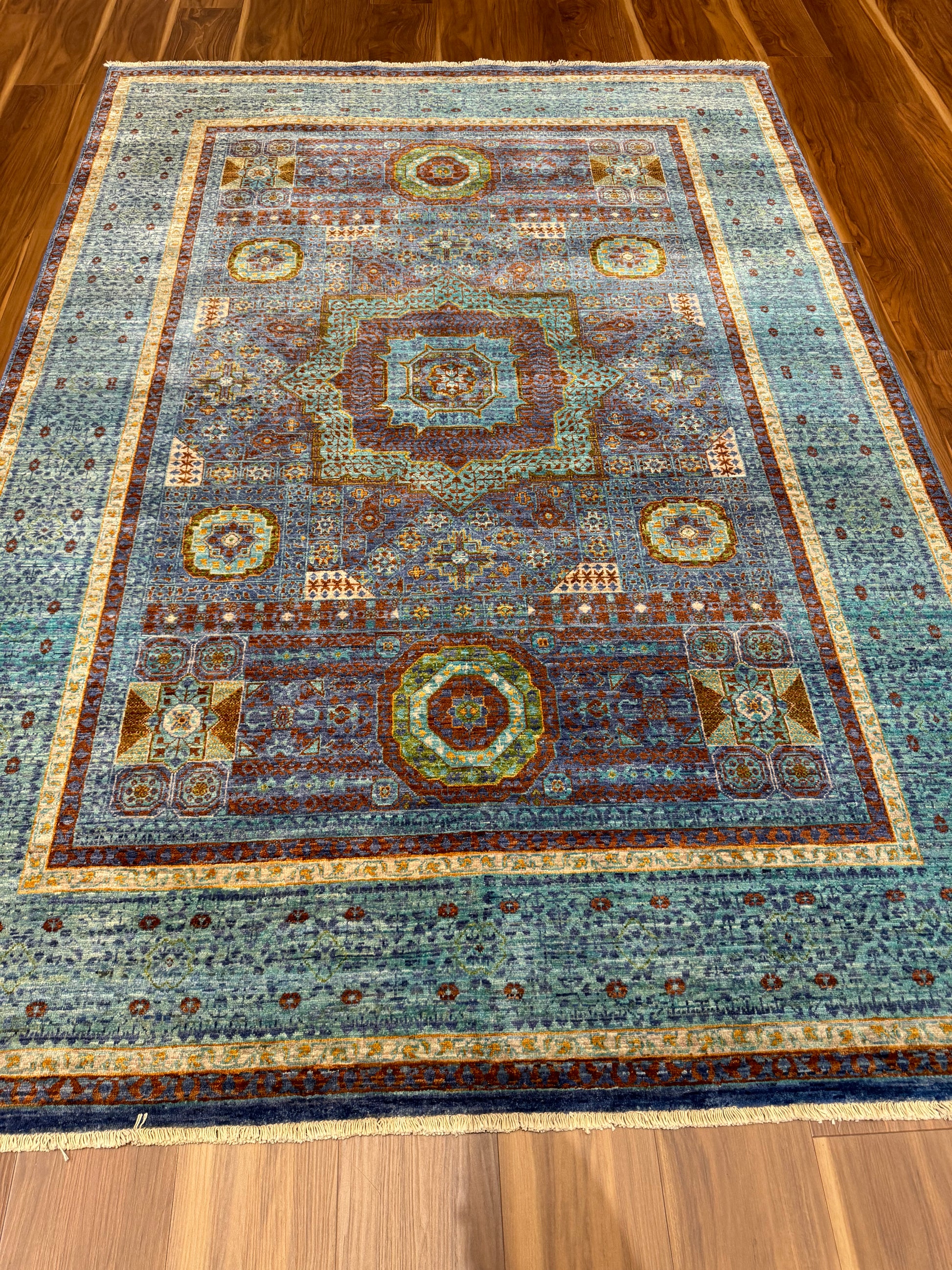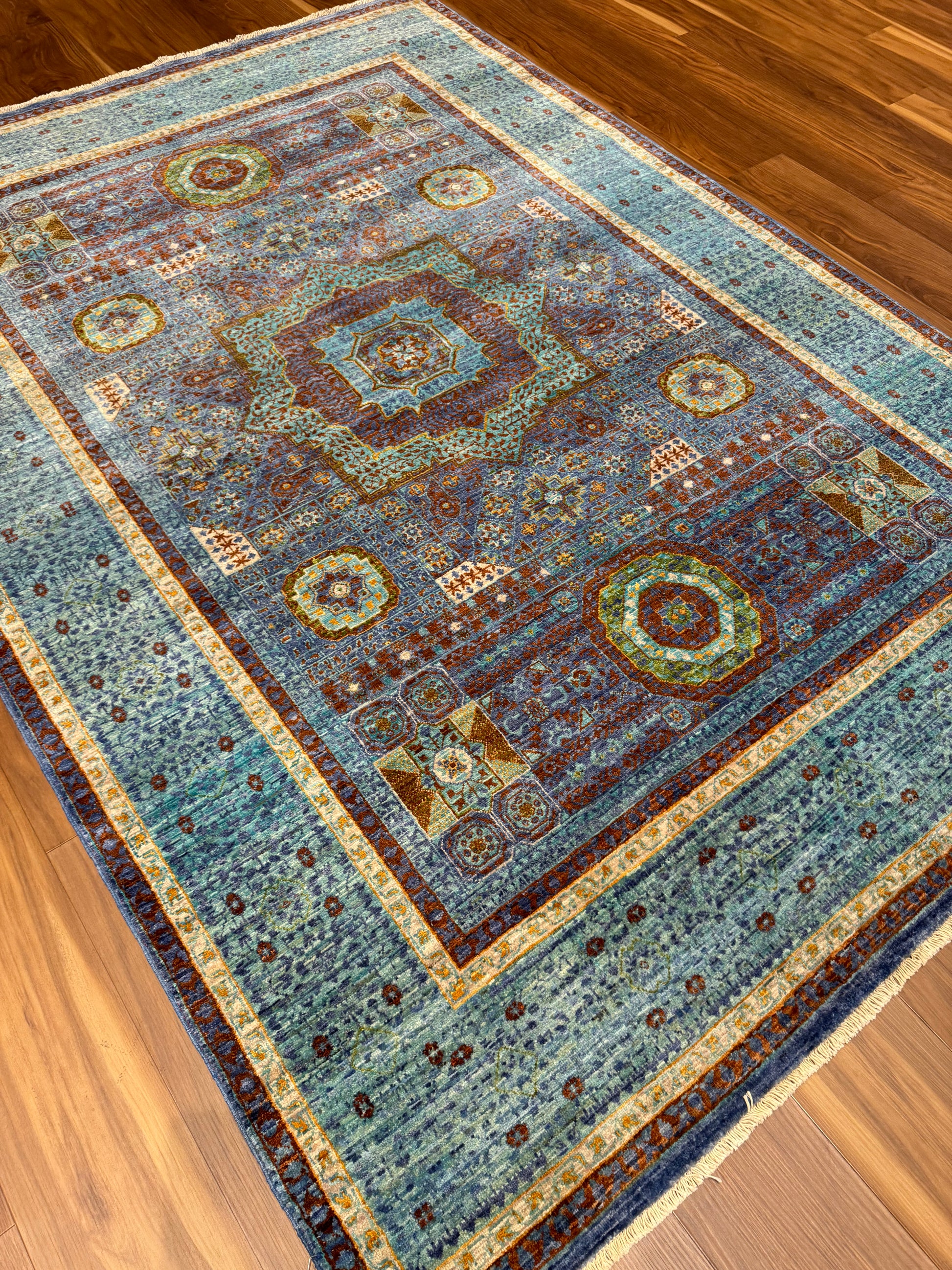 Named Sultanate Mamluk, this wool rug is a masterpiece of traditional craftsmanship. Its intricate geometric and medallion patterns are reminiscent of historic Mamluk designs. The rich palette of blue, green, rust, and amber hues is harmoniously balanced, creating a captivating visual experience. Each thread is carefully woven to celebrate the grandeur of a bygone era, making it ideal for spaces that aim to evoke a sense of heritage and luxury.