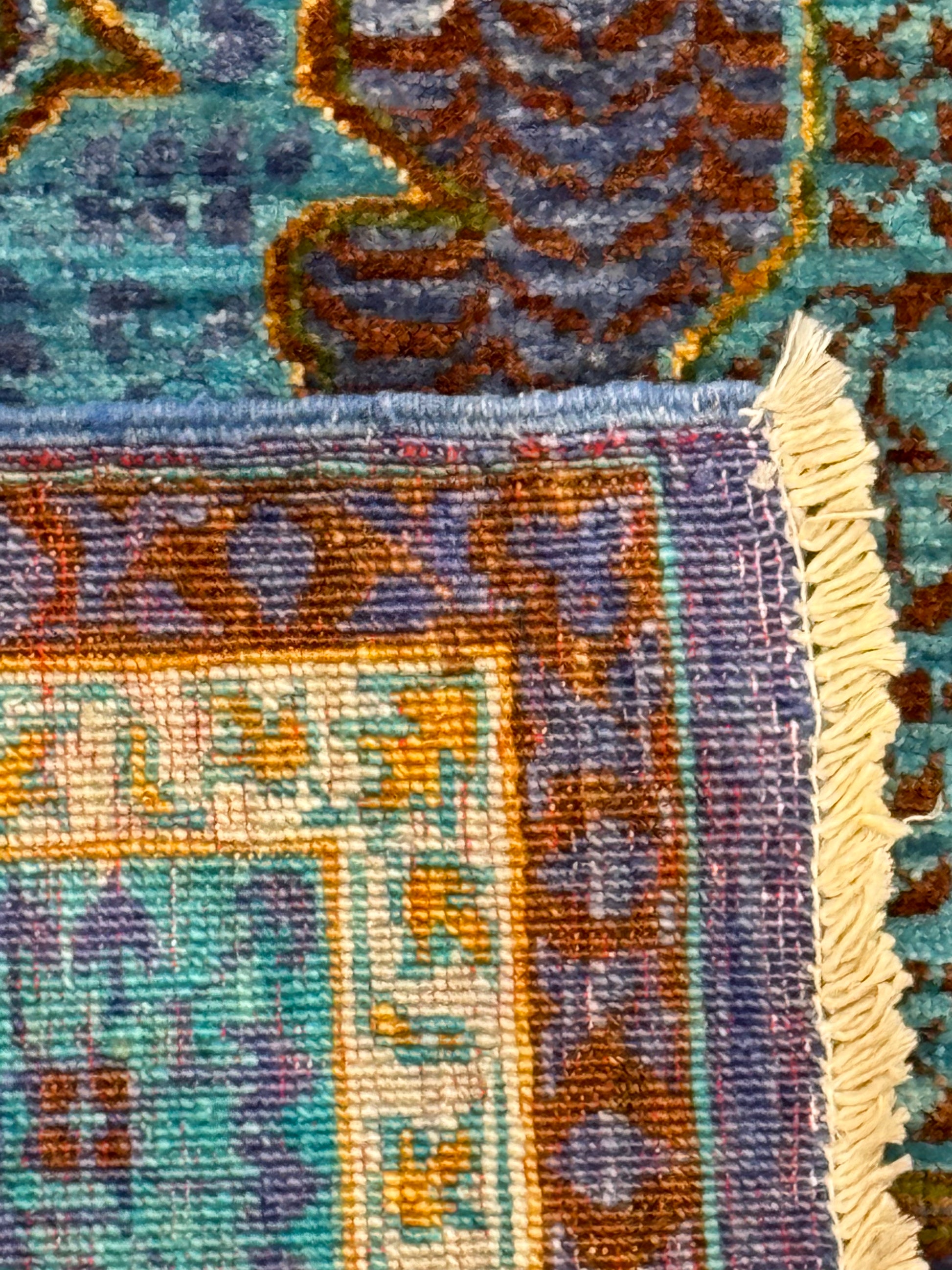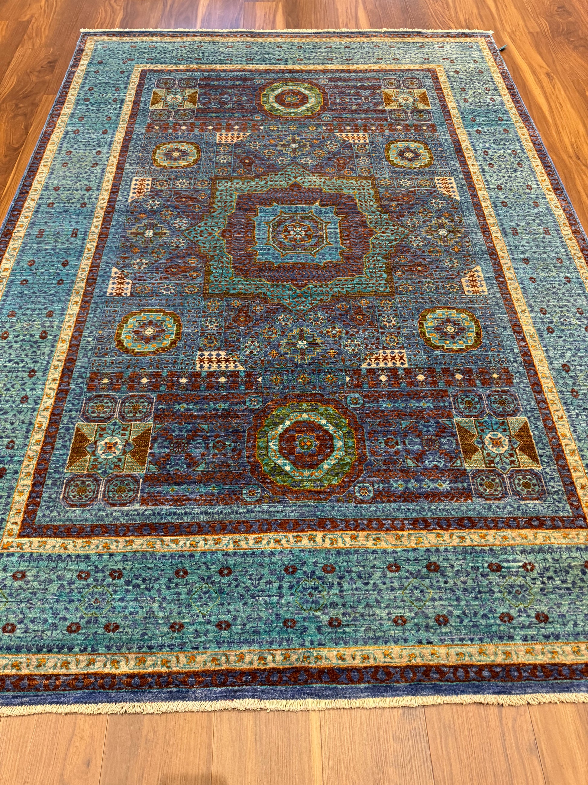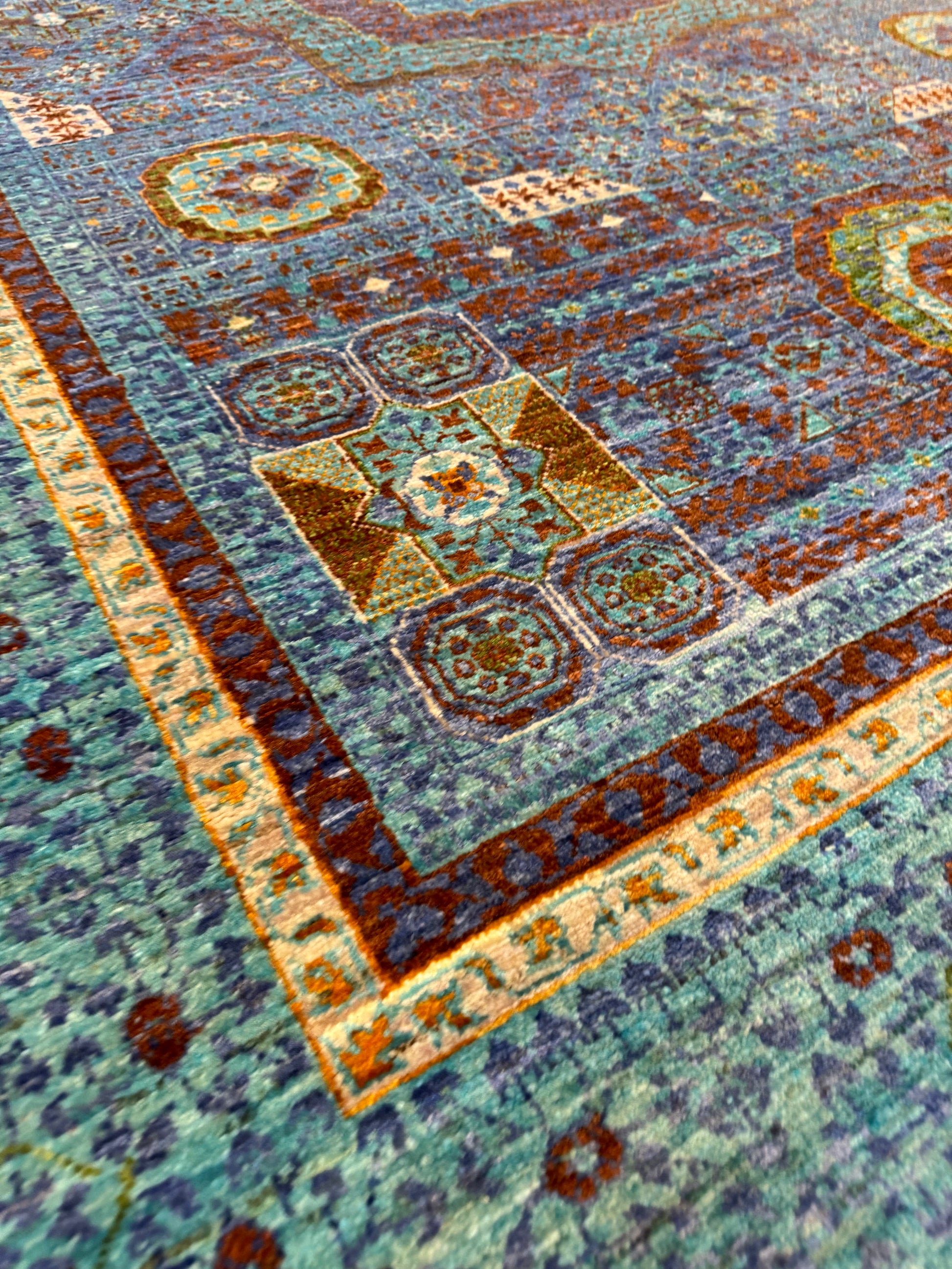 Named Sultanate Mamluk, this wool rug is a masterpiece of traditional craftsmanship. Its intricate geometric and medallion patterns are reminiscent of historic Mamluk designs. The rich palette of blue, green, rust, and amber hues is harmoniously balanced, creating a captivating visual experience. Each thread is carefully woven to celebrate the grandeur of a bygone era, making it ideal for spaces that aim to evoke a sense of heritage and luxury.