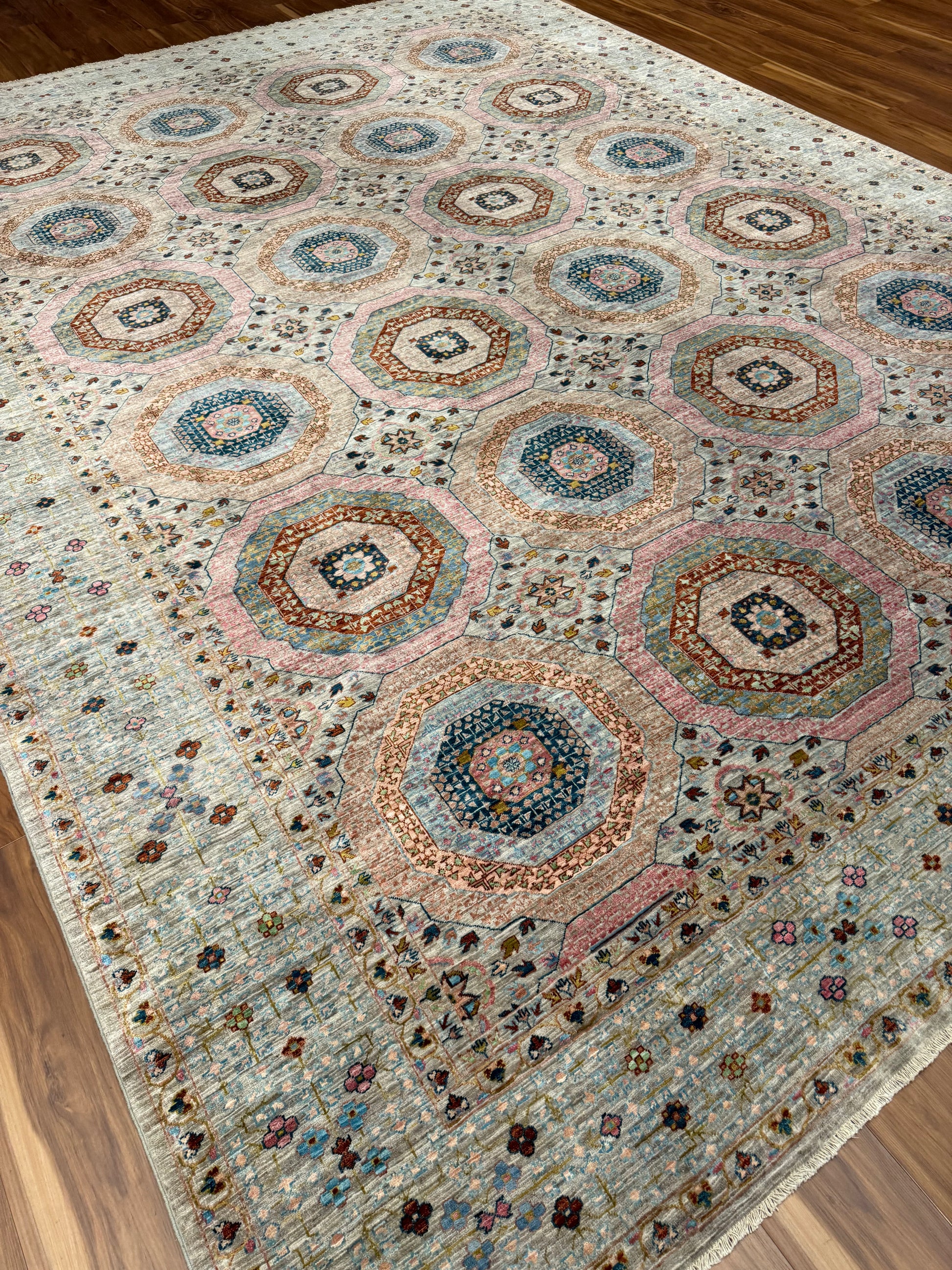 The Sultanate Mamluk rug showcases a stunning array of meticulously crafted medallions set against a soft beige backdrop. Expertly woven from the finest wool, this piece exudes a timeless elegance paralleled by its exceptional durability. The complex geometric motifs and the harmonious palette of red, blue, and taupe imbue any room with a sense of regal sophistication, reminiscent of the artistic heritage of the Mamluk era. Perfect for those looking to add a touch of historical luxury to their living space.