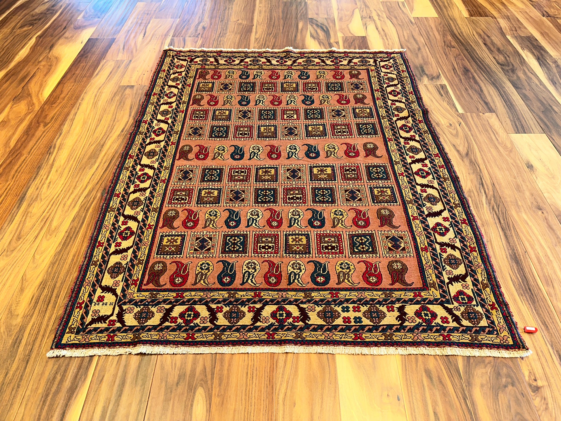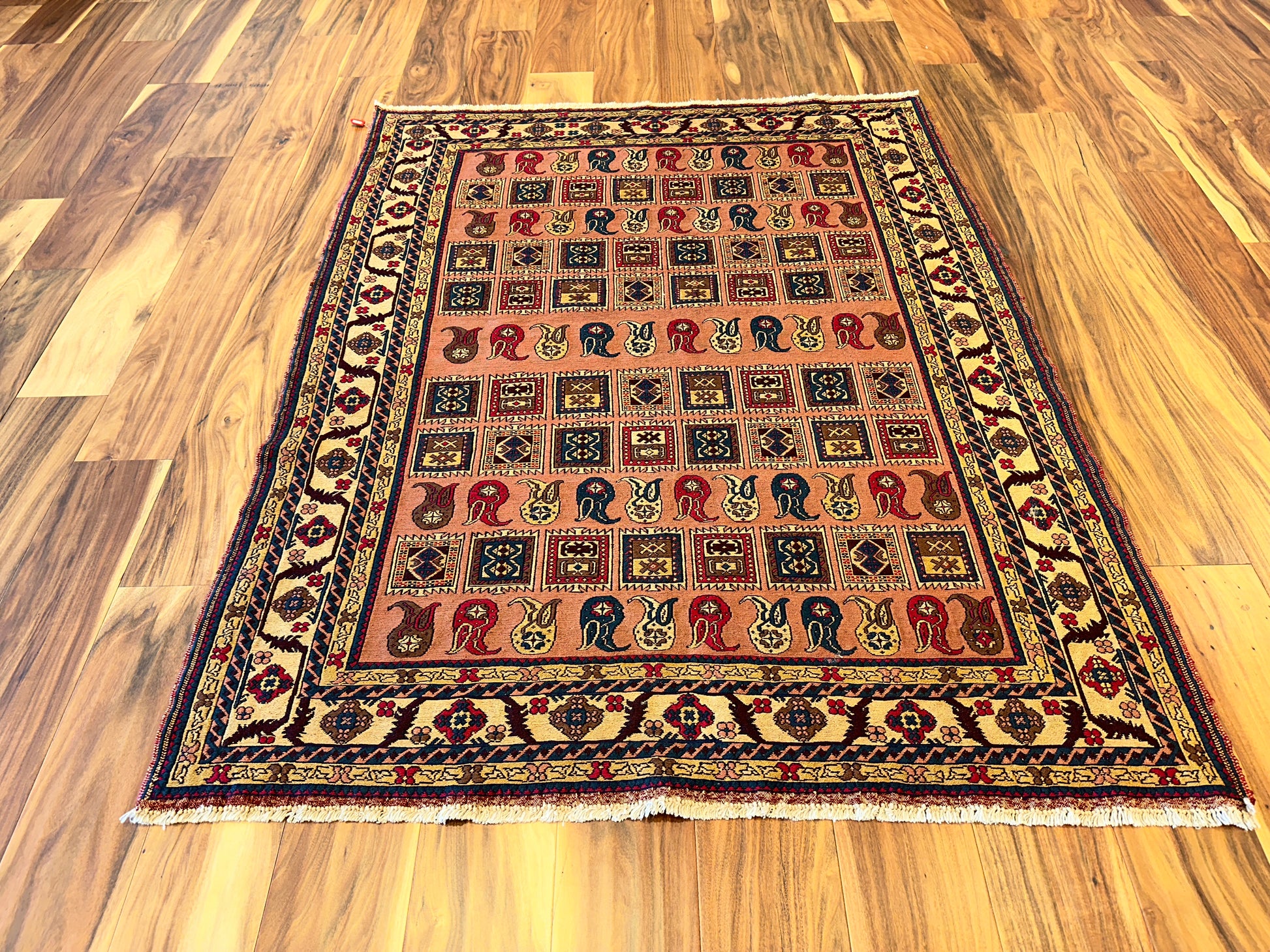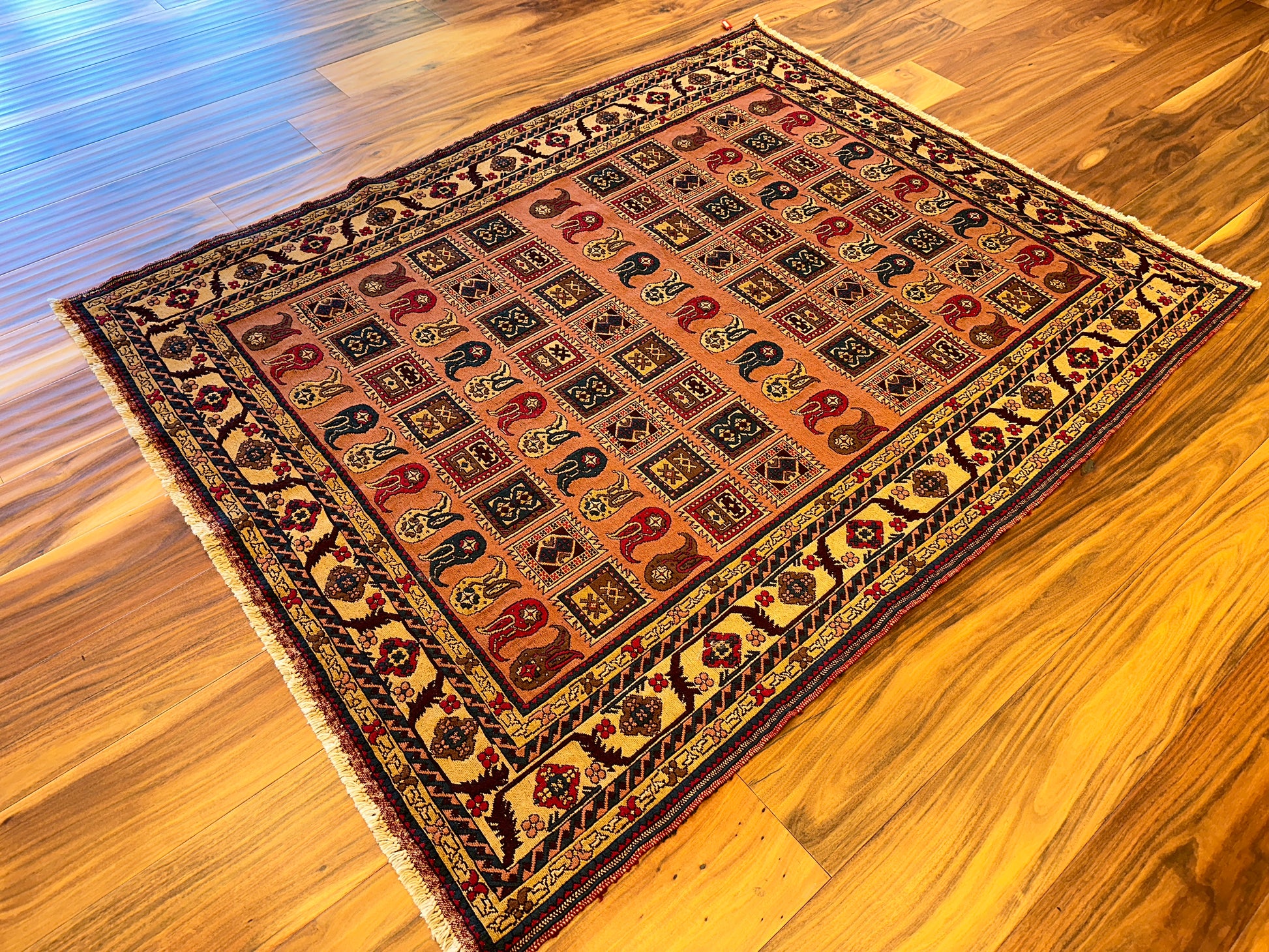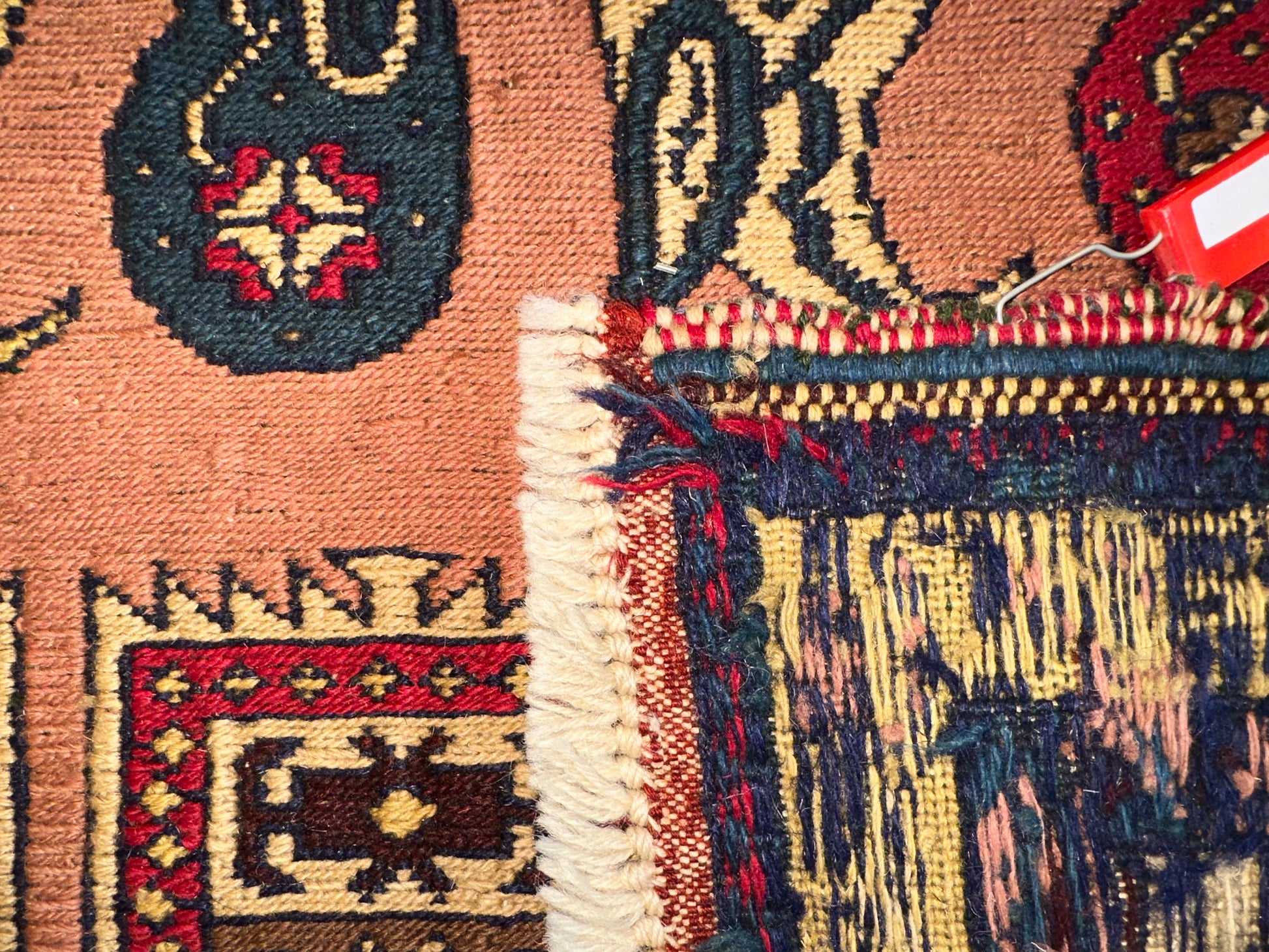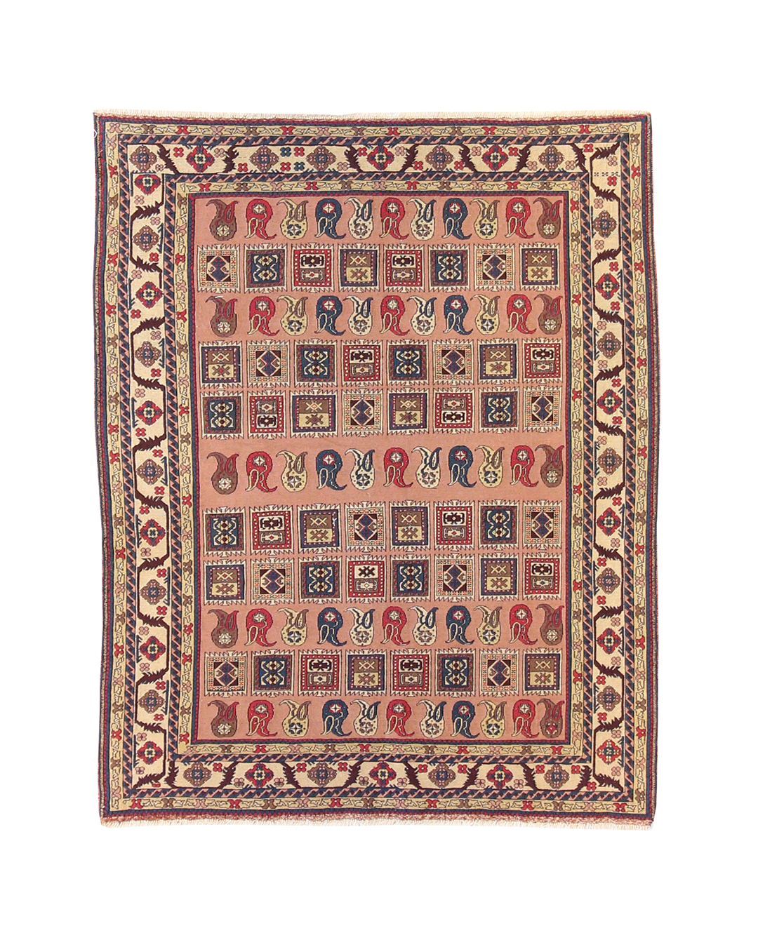 This striking hand-knotted rug features a balanced grid of alternating paisley motifs and geometric medallions, evoking the charm of antique Caucasian weavings. Warm terracotta tones form the backdrop for rich shades of navy, red, cream, and navy, creating a spirited, folk-art effect. A series of intricate borders frames the field with rhythm and structure, adding refinement to the lively design.