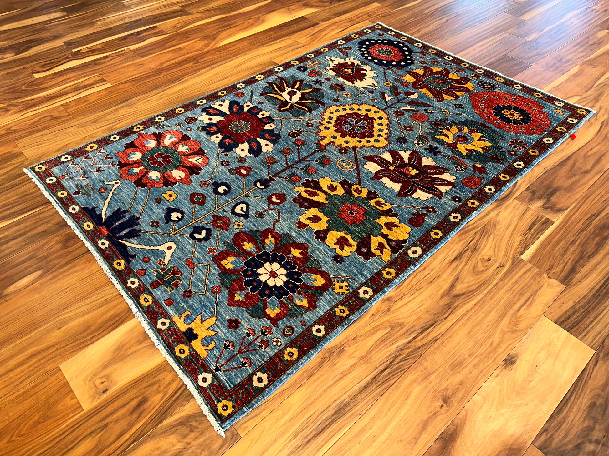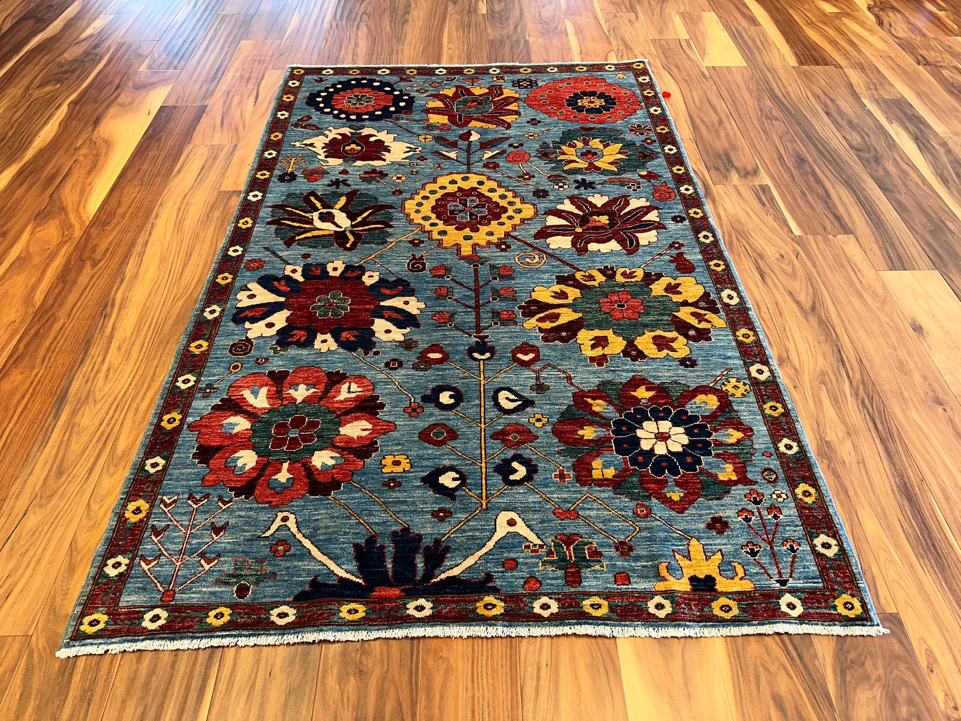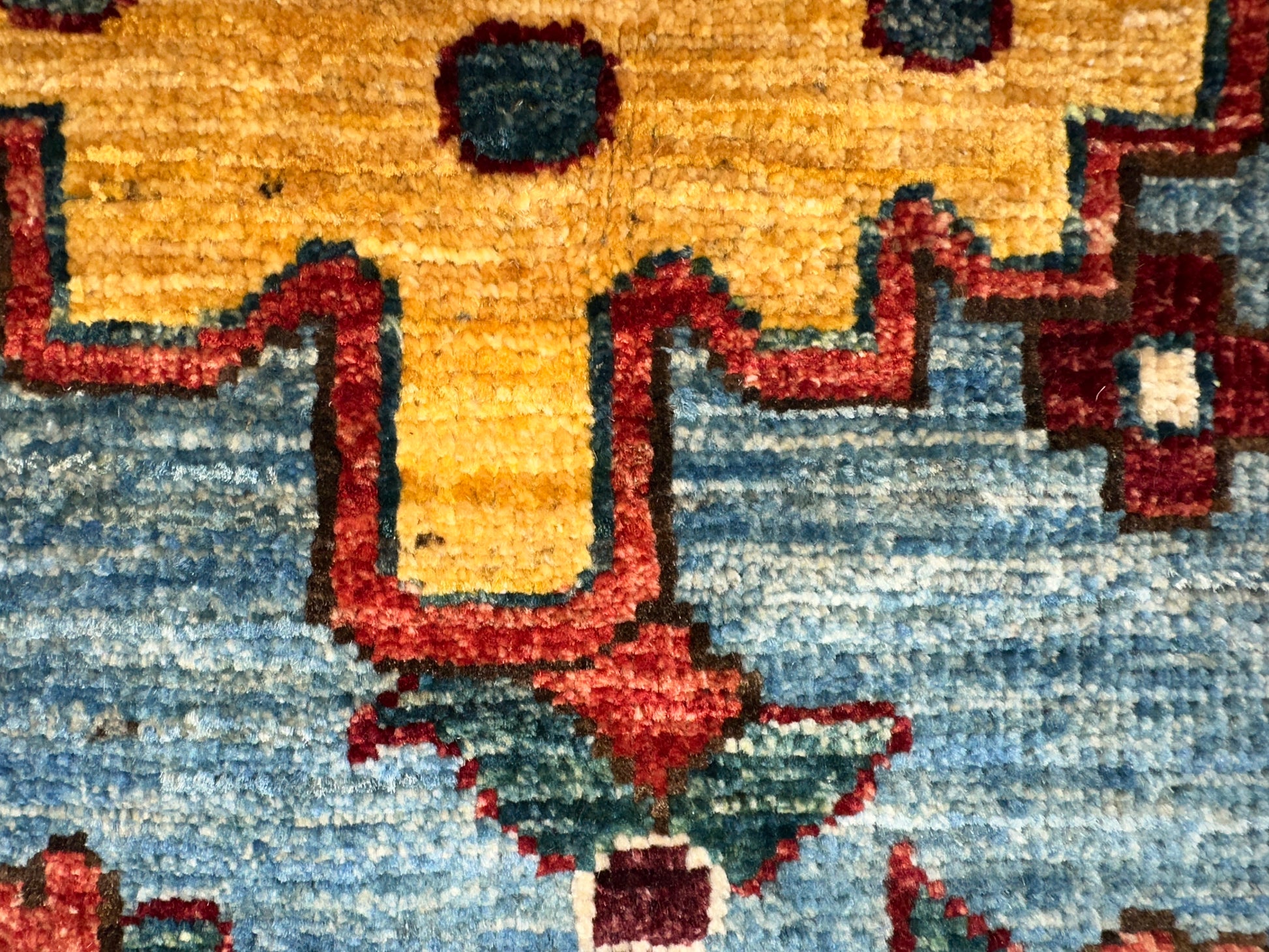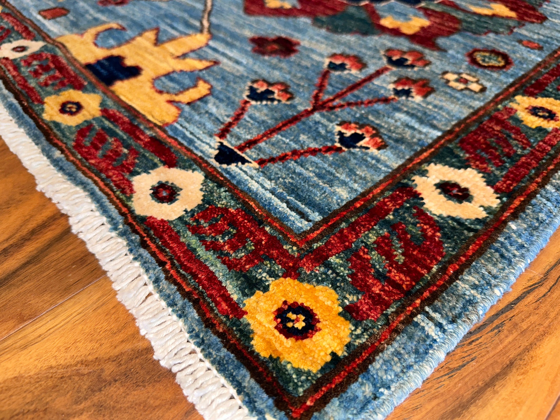 A joyous celebration of color and botanical form, this handmade rug offers a bold yet playful energy to any space. Set against a sky blue field, the vibrant floral motifs burst in shades of red, gold, ivory, navy, and coral, organized around a vertical vine-like stem that adds a sense of order and organic symmetry. The border complements the interior with a rhythmic floral guard in contrasting tones, offering both structure and movement. Its cheerful palette and expressive shapes make it a standout accent, ideal for spaces that embrace color and creativity.