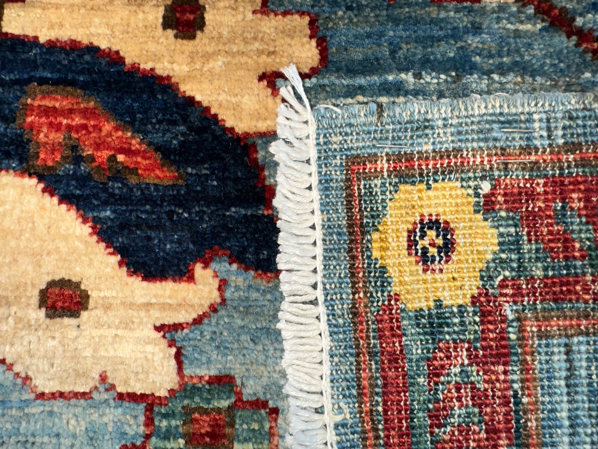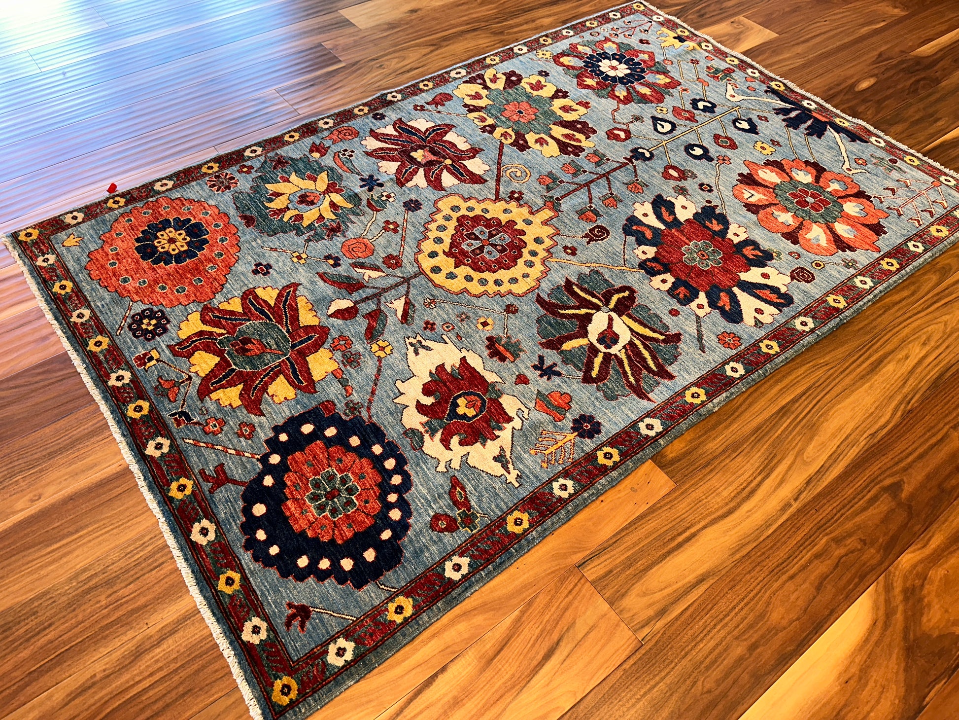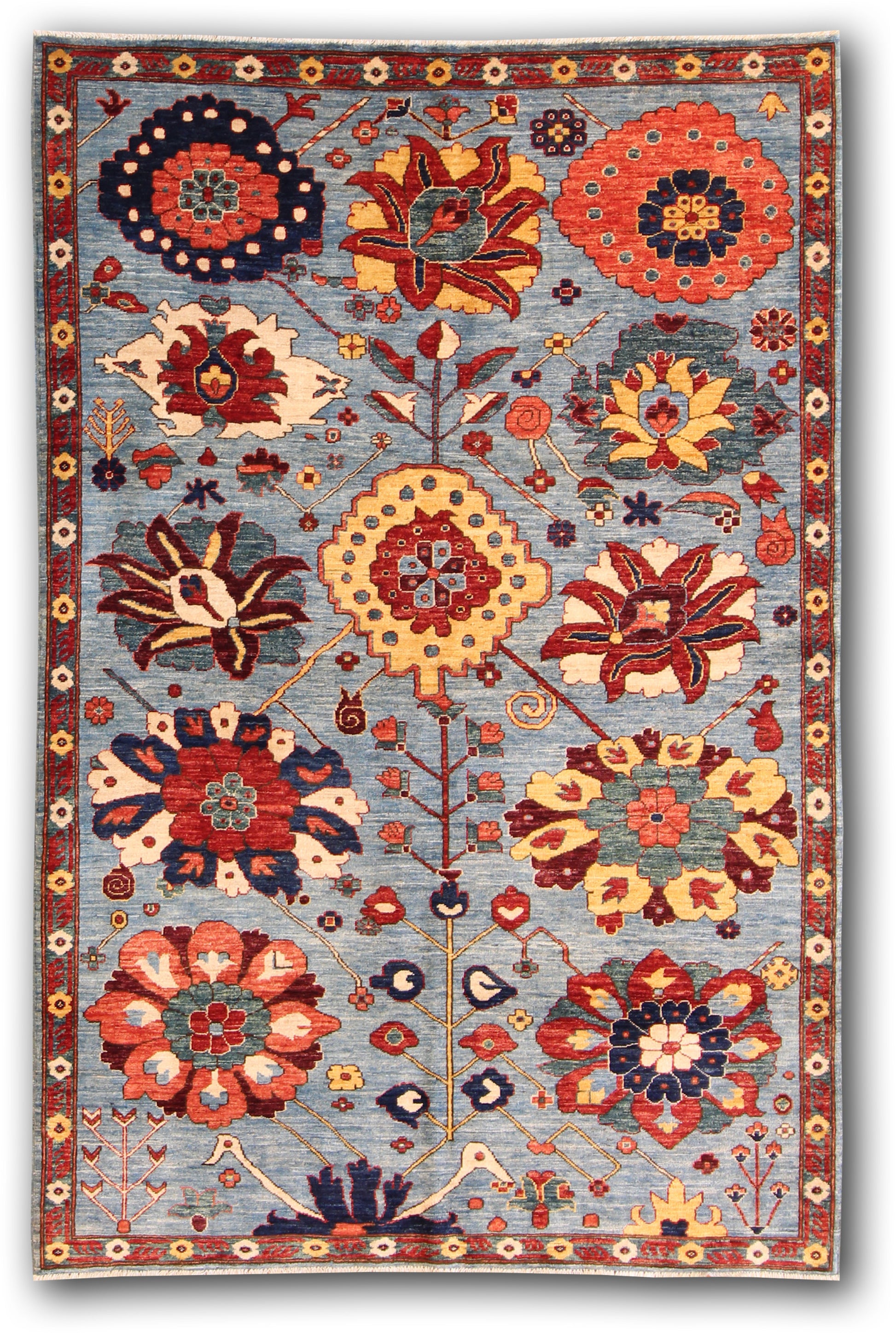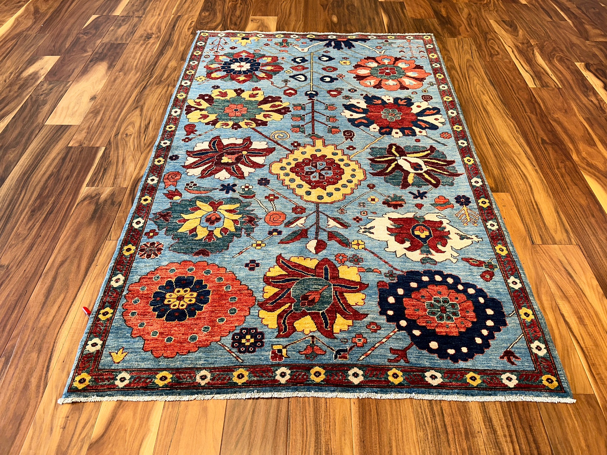 A joyous celebration of color and botanical form, this handmade rug offers a bold yet playful energy to any space. Set against a sky blue field, the vibrant floral motifs burst in shades of red, gold, ivory, navy, and coral, organized around a vertical vine-like stem that adds a sense of order and organic symmetry. The border complements the interior with a rhythmic floral guard in contrasting tones, offering both structure and movement. Its cheerful palette and expressive shapes make it a standout accent, ideal for spaces that embrace color and creativity.