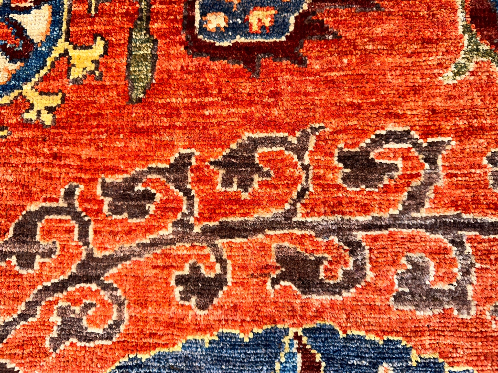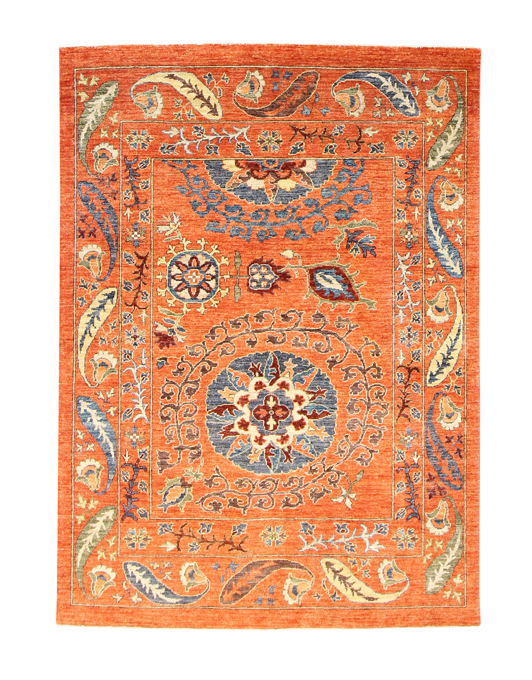 A striking composition of bold color and ornate botanical detail, this hand-knotted rug commands attention with its rich orange field and large-scale medallion design. Flowing vines, stylized palmettes, and rhythmic paisleys are rendered in shades of blue, olive, and soft gold, creating an energetic yet cohesive visual impact. Its dynamic palette and unique layout lend a sense of artistry and movement to any room.