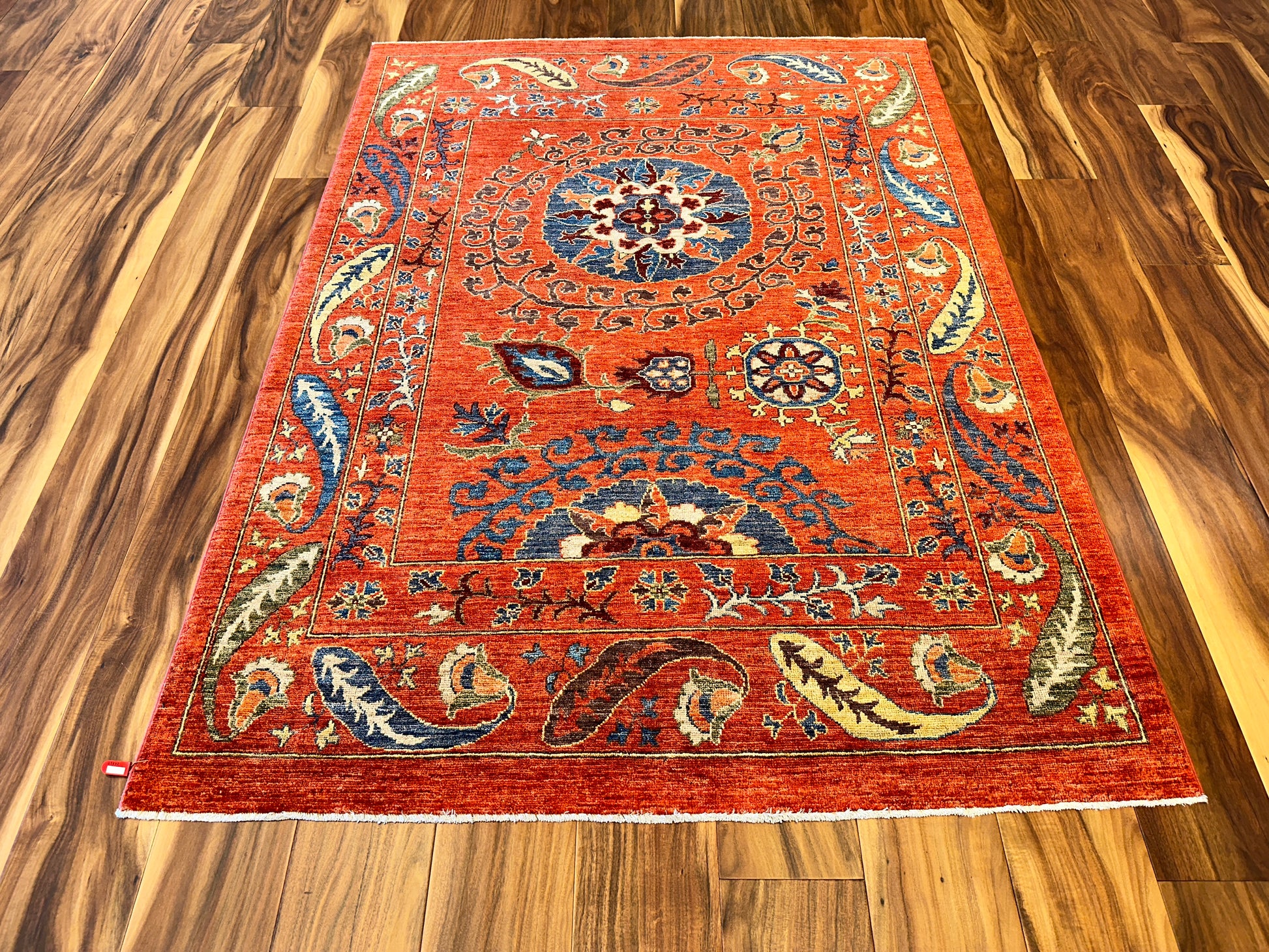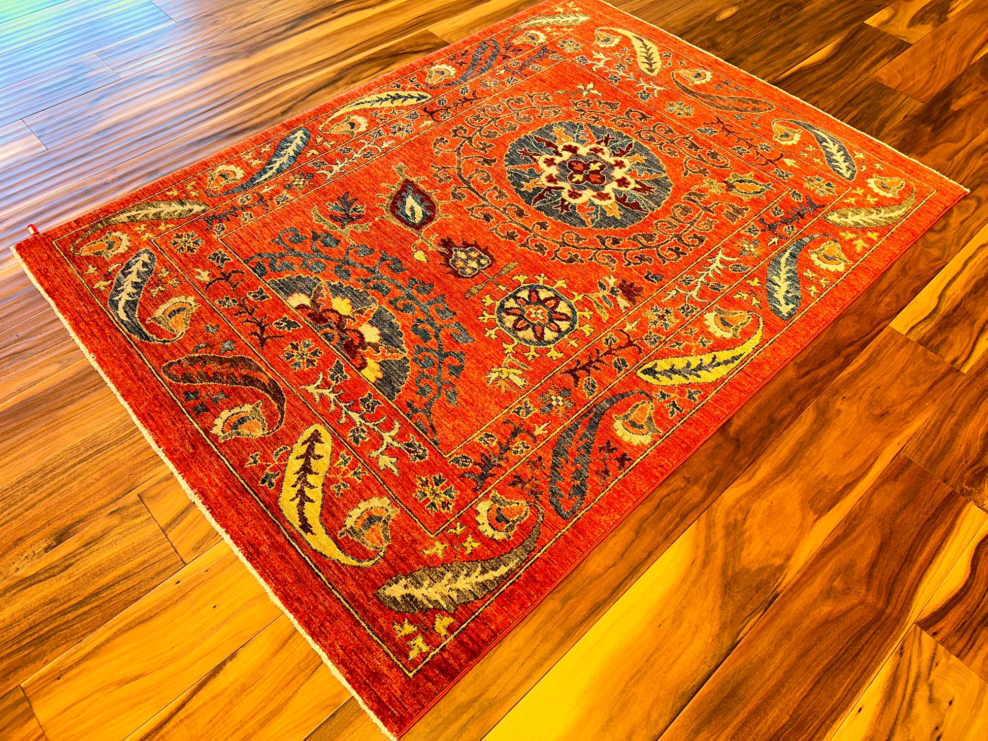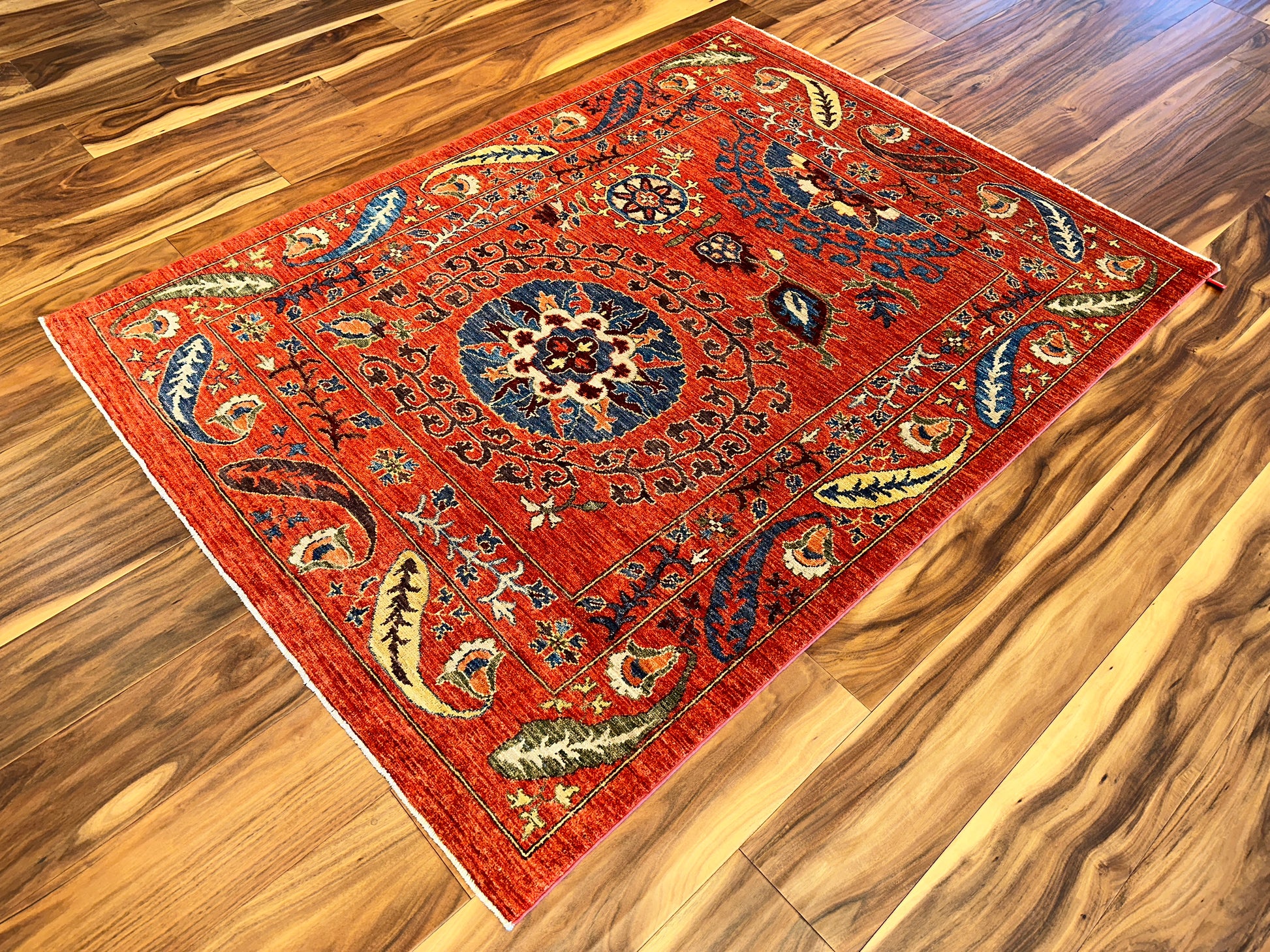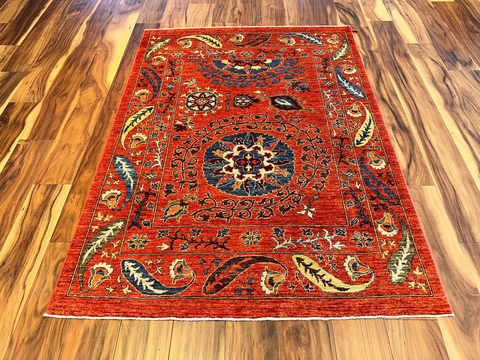 - Design: Central floral medallion with flowing vines and paisleys